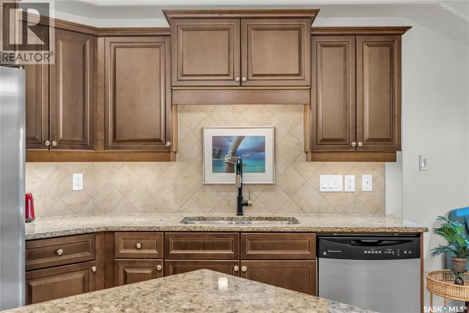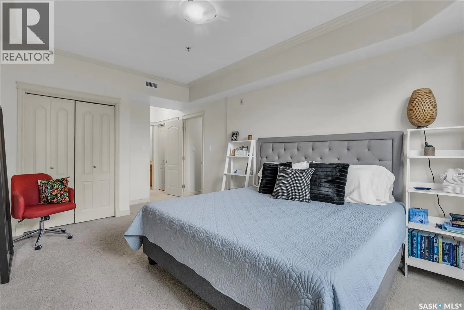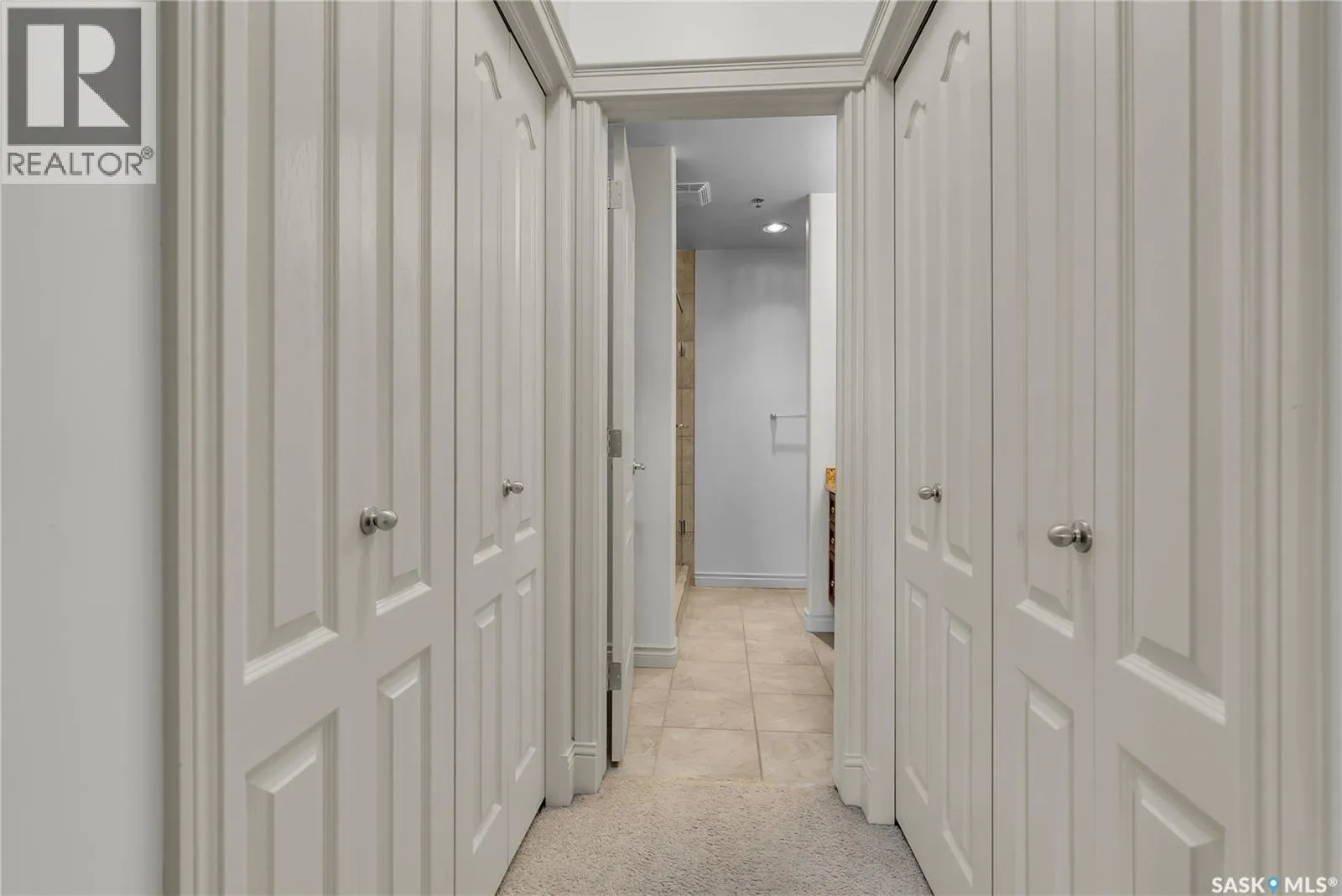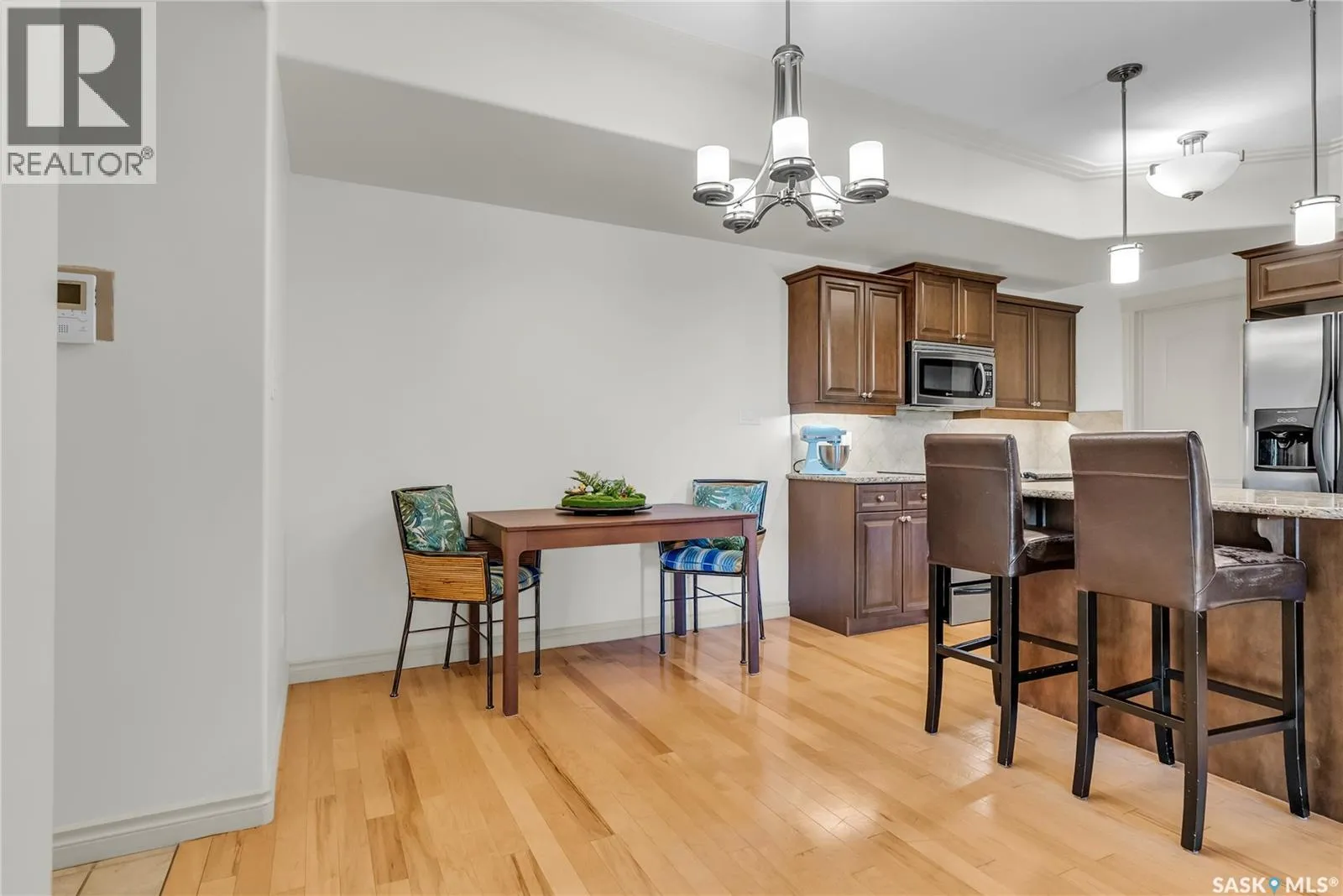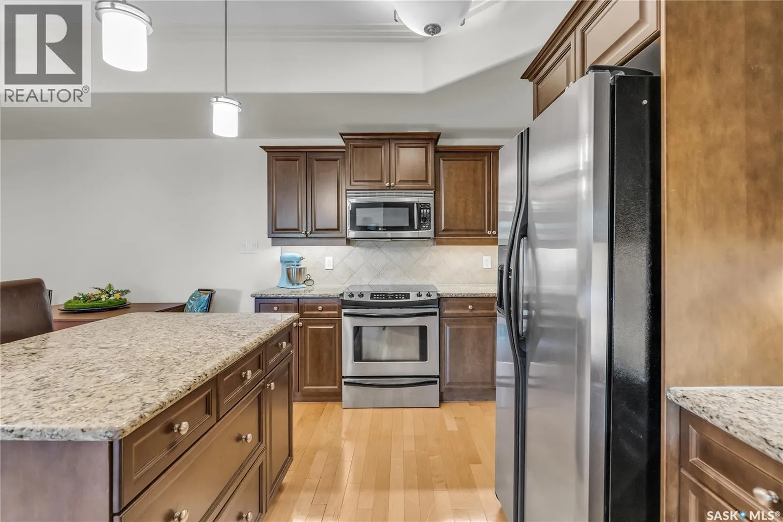 Experience the perfect blend of luxury, comfort, and convenience in this beautifully appointed condo at Waters Edge I, nestled along Saskatchewan Crescent West. Perfectly situated along the river, this home welcomes you with an open-concept design featuring a spacious kitchen with island, a dining area that flows seamlessly into the living room, and access to a southwest-facing balcony. Hardwood floors extend through the kitchen, dining, and living area, creating warmth and elegance throughout. The thoughtfully designed layout includes two bedrooms, a four-piece main bathroom, and a private three-piece ensuite off the primary bedroom with 2 large closets. Just off the kitchen, youâll find in-suite laundry with plenty of extra storage. There is an underground parking space with a storage unit directly in front of the stall. Residents enjoy the convenience of underground parking, elevator access, and a host of impressive building amenities including an exercise room, meeting room with kitchenette, pool table, foosball and guest suite. Steps from the Meewasin Valley Trail and within walking distance to Gabriel Dumont and Fred Mitchell Parks, this location offers the best of both worldsâeasy access to nature and the downtown core. Please note, pets are not permitted. (id:27476)