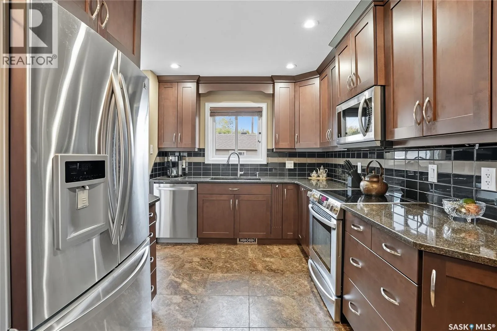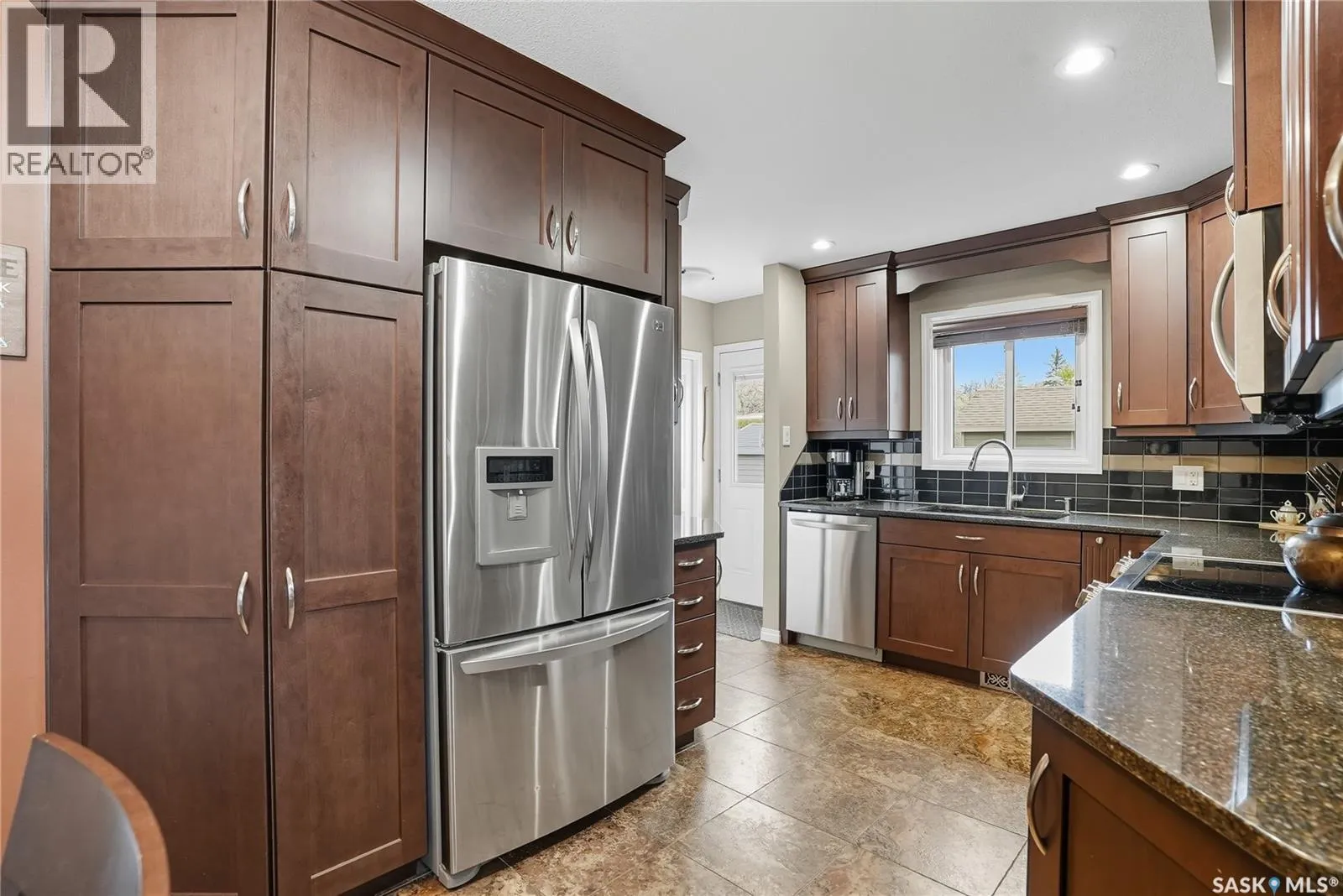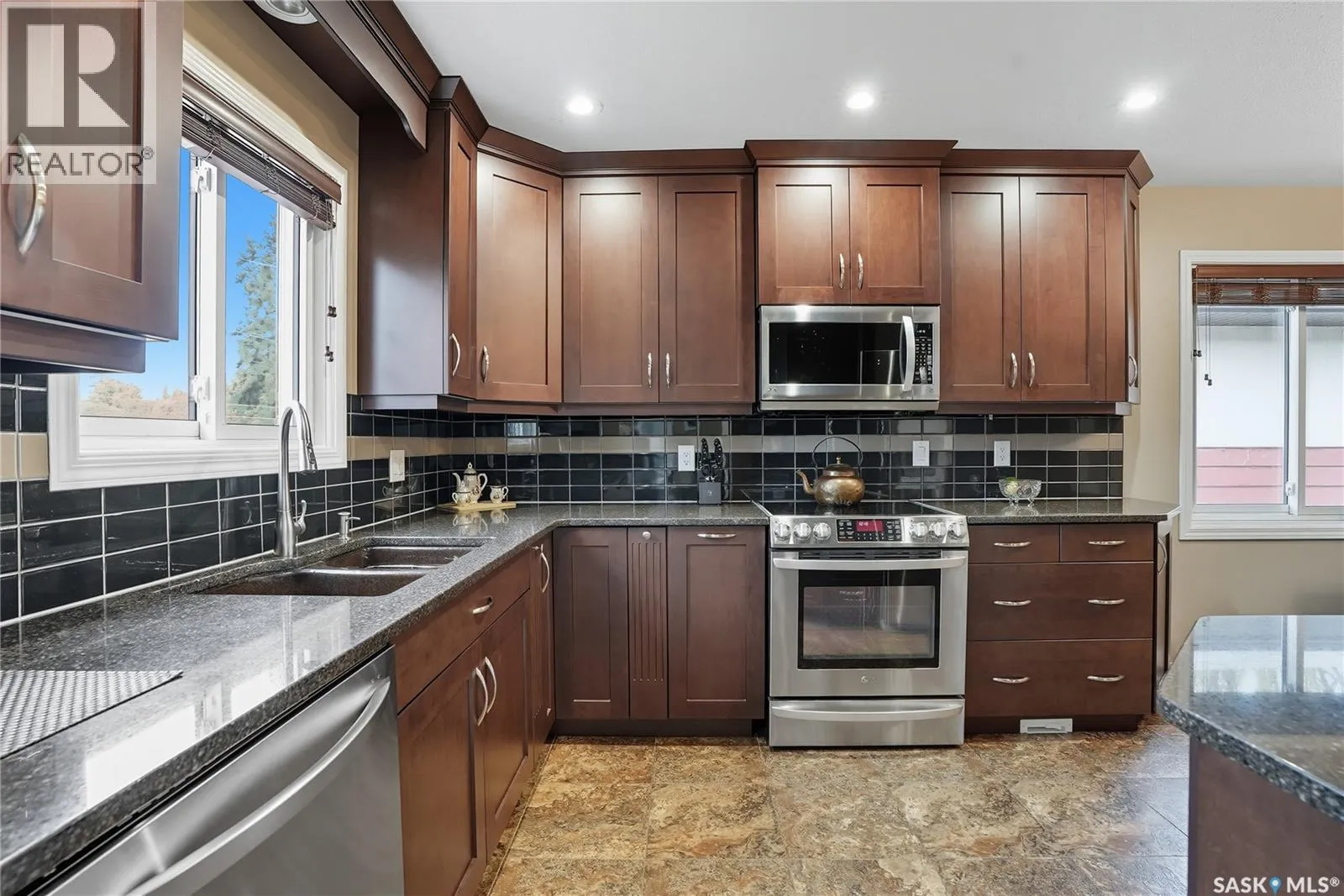 Welcome to this beautifully maintained bungalow in the heart of Hudson Bay Park, offering a perfect blend of modern updates and classic charm. The showstopper of this home is the stunning kitchen, fully renovated in 2011 with rich maple cabinetry, granite countertops, a stylish tiled backsplash, high-end stainless steel appliances, and a convenient central vac kick plate for effortless clean-up. The main floor features a spacious and bright living room with hardwood floors, an updated four-piece bathroom, and three comfortable bedrooms. Downstairs, the fully developed basement offers even more living space with a generous family room and rec area, two additional bedrooms, a second four-piece bathroom, a dedicated workspace, and a laundry room. This home has seen numerous thoughtful upgrades including newer windows, custom blinds, trim and doors (2011), air conditioner (2011), furnace (2015), tankless water heater (2013), and shingles & eaves (2016). Outside, youâll find a single detached garage and two additional off-street parking spaces. This is a fantastic opportunity to own a move-in-ready home in a desirable neighborhood with all the major updates already done! (id:27476)