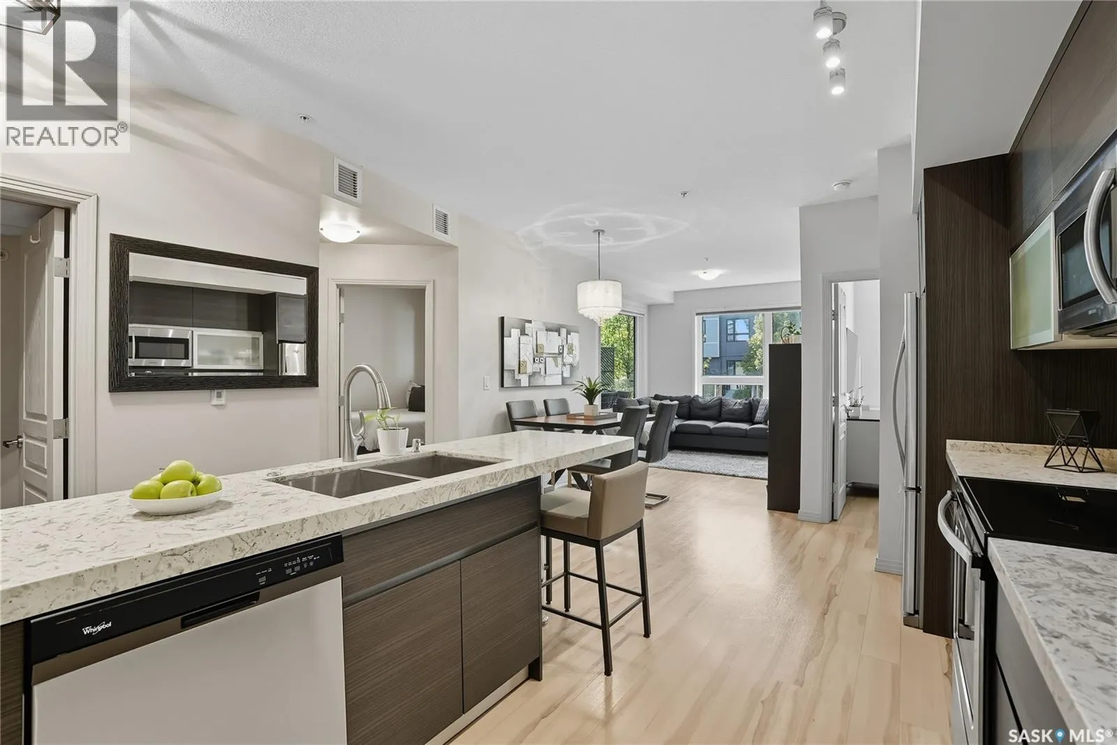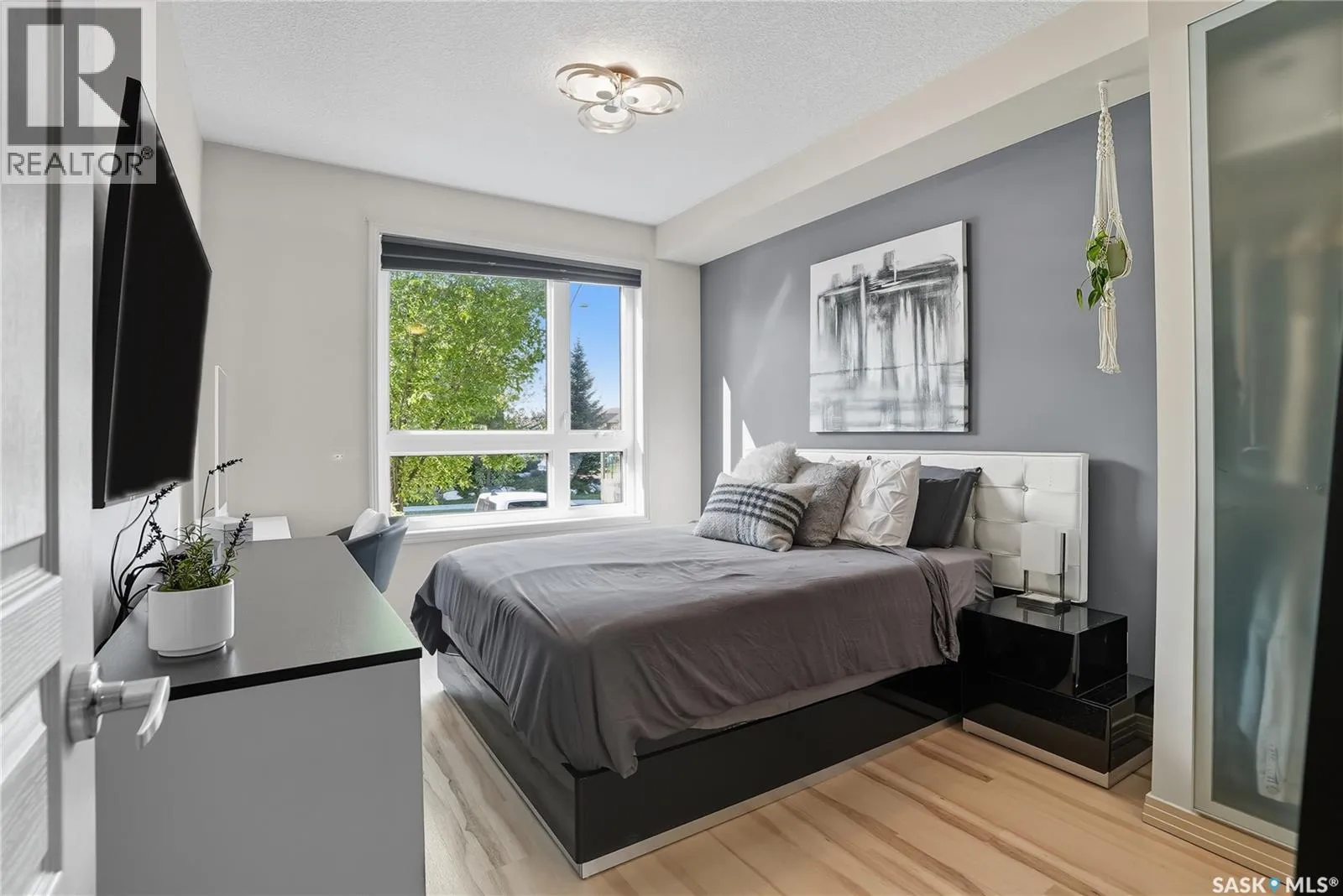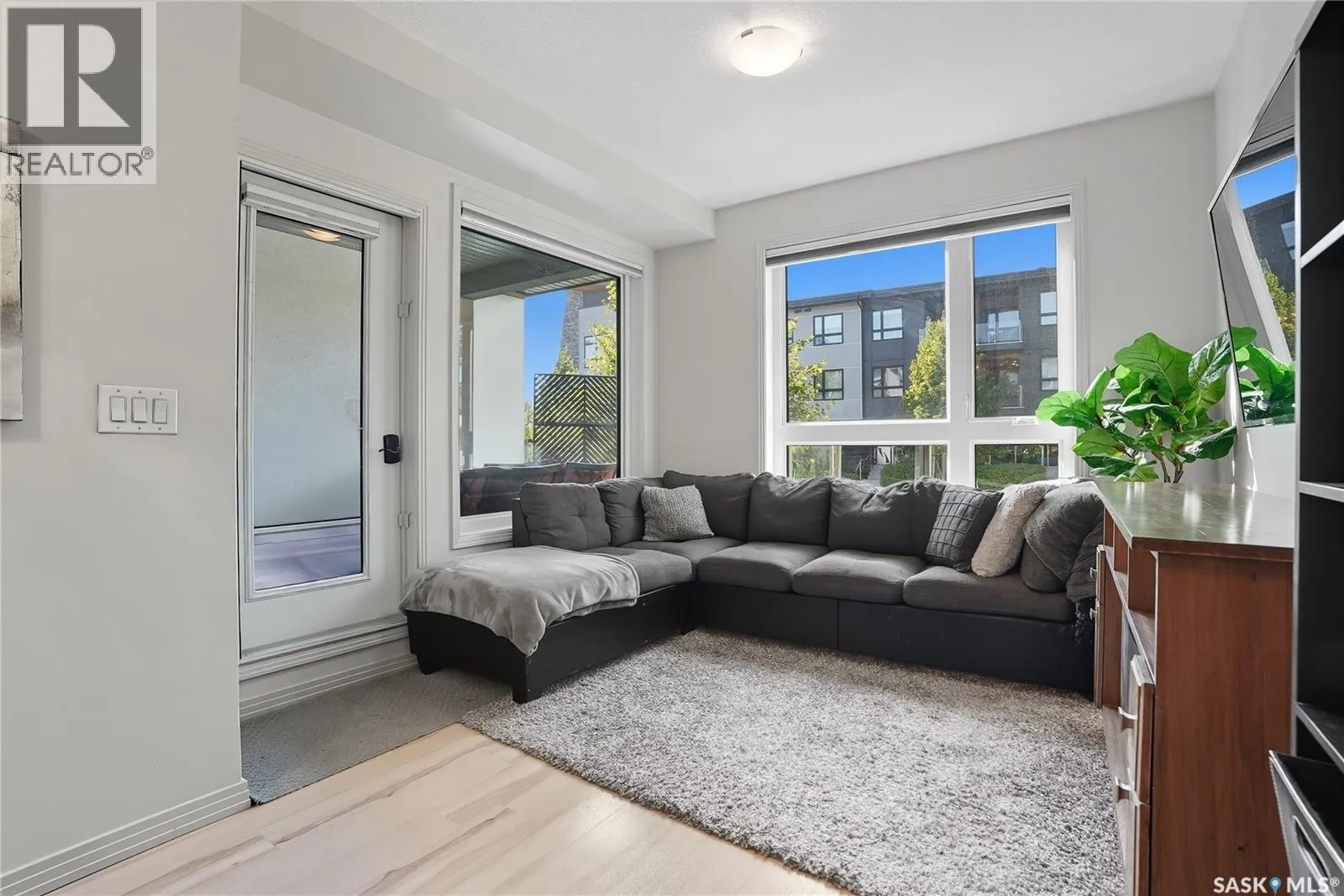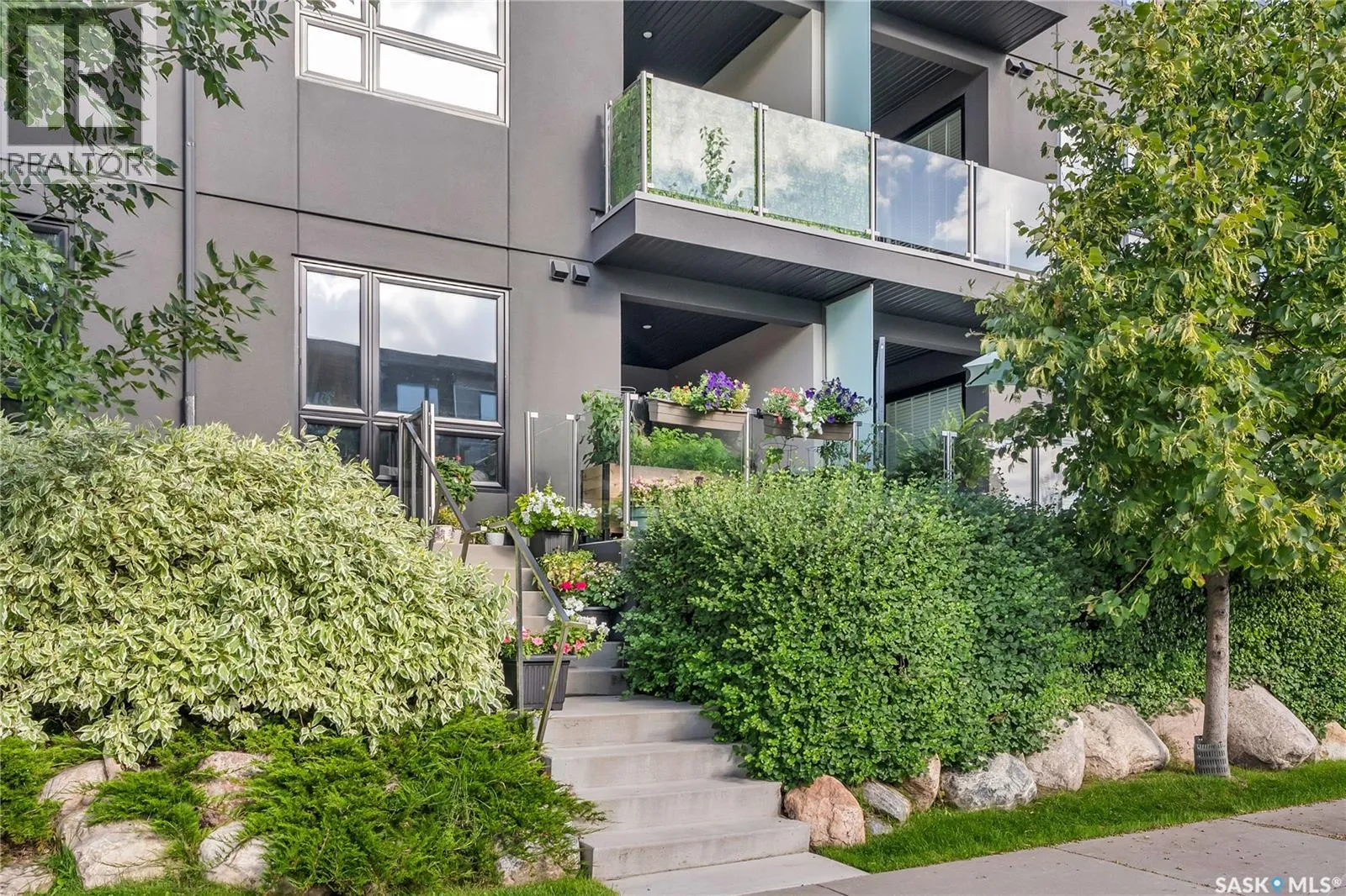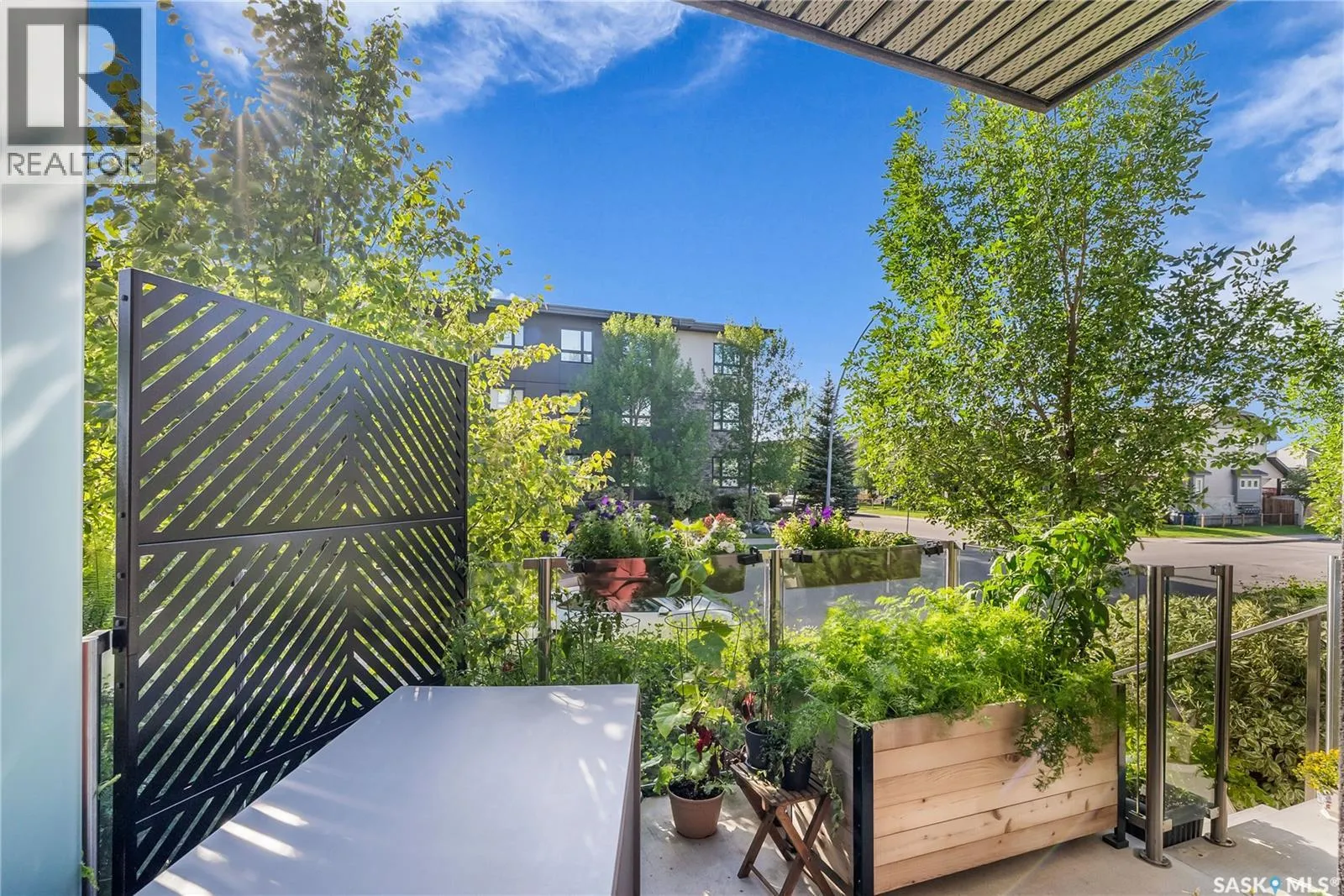Welcome to 223 Evergreen Square #120 â a beautifully maintained 900 sq. ft. ground-level condo located in the heart of Evergreen, Saskatoon. This immaculate 2-bedroom, 2-bathroom unit stands out with its rare private entrance from the street, offering added convenience, privacy, and a townhouse-like feel that most units in the building donât have. Inside, you'll find a bright and modern living space featuring in-floor heating, central air conditioning, and elegant quartz countertops throughout. The primary bedroom includes a tiled ensuite with a dual vanity, adding a touch of luxury to your daily routine. Enjoy the outdoors from your oversized terrace, complete with glass railings and durable, foot-friendly vinyl deckingâperfect for entertaining or relaxing with views of Amphitheatre Park right across the street. This home also comes with an underground parking stall and a private storage unit located just beside it for added convenience. Residents of the building enjoy access to a yoga room, games room, and a pet-friendly âDoggy Spaâ wash station, making it ideal for both active lifestyles and pet owners. Located close to public transit, walking paths, and local amenities, this unit offers a perfect balance of comfort, style, and accessibility. (id:27476)