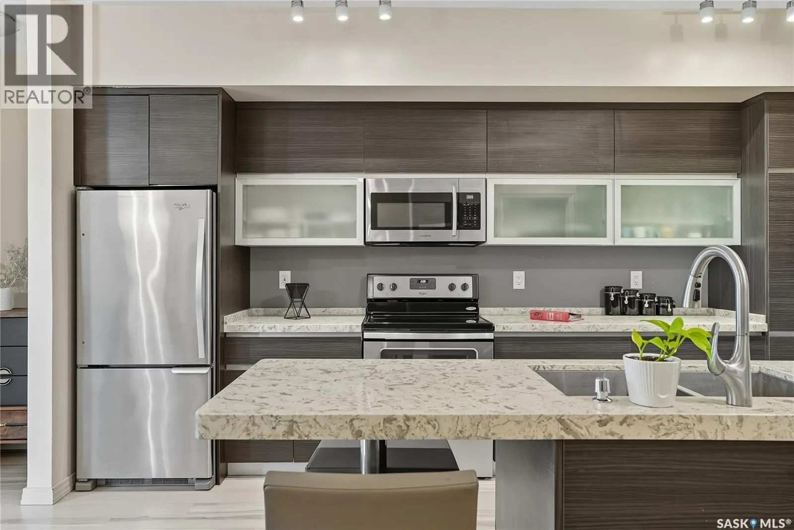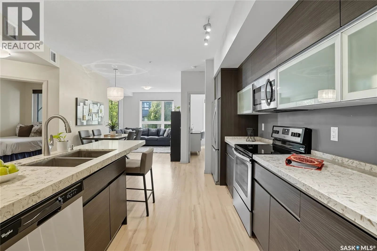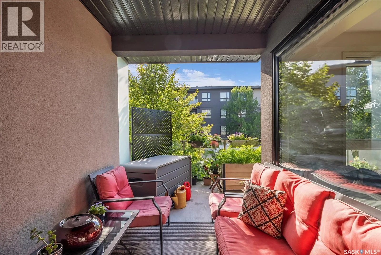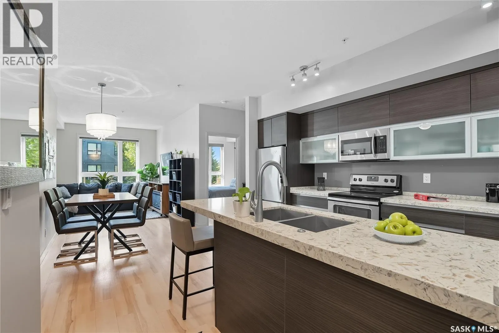 Welcome to 223 Evergreen Square #120 â a beautifully maintained 900 sq. ft. ground-level condo located in the heart of Evergreen, Saskatoon. This immaculate 2-bedroom, 2-bathroom unit stands out with its rare private entrance from the street, offering added convenience, privacy, and a townhouse-like feel that most units in the building donât have. Inside, you'll find a bright and modern living space featuring in-floor heating, central air conditioning, and elegant quartz countertops throughout. The primary bedroom includes a tiled ensuite with a dual vanity, adding a touch of luxury to your daily routine. Enjoy the outdoors from your oversized terrace, complete with glass railings and durable, foot-friendly vinyl deckingâperfect for entertaining or relaxing with views of Amphitheatre Park right across the street. This home also comes with an underground parking stall and a private storage unit located just beside it for added convenience. Residents of the building enjoy access to a yoga room, games room, and a pet-friendly âDoggy Spaâ wash station, making it ideal for both active lifestyles and pet owners. Located close to public transit, walking paths, and local amenities, this unit offers a perfect balance of comfort, style, and accessibility. (id:27476)
