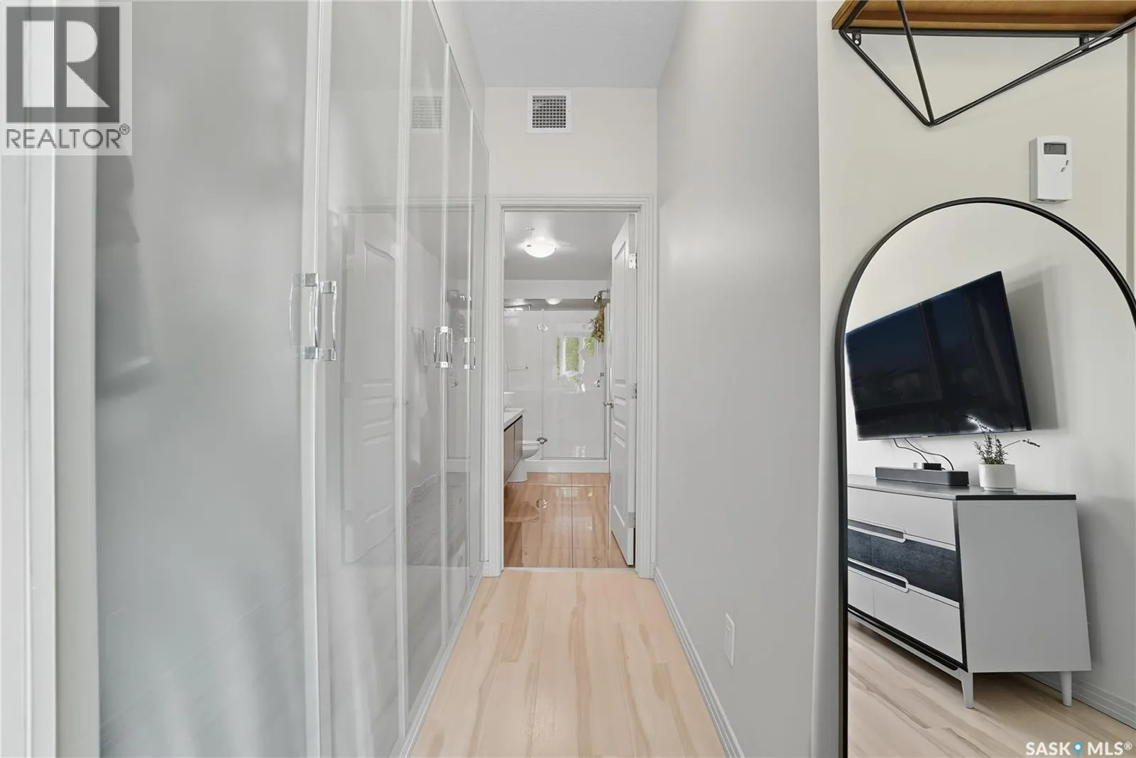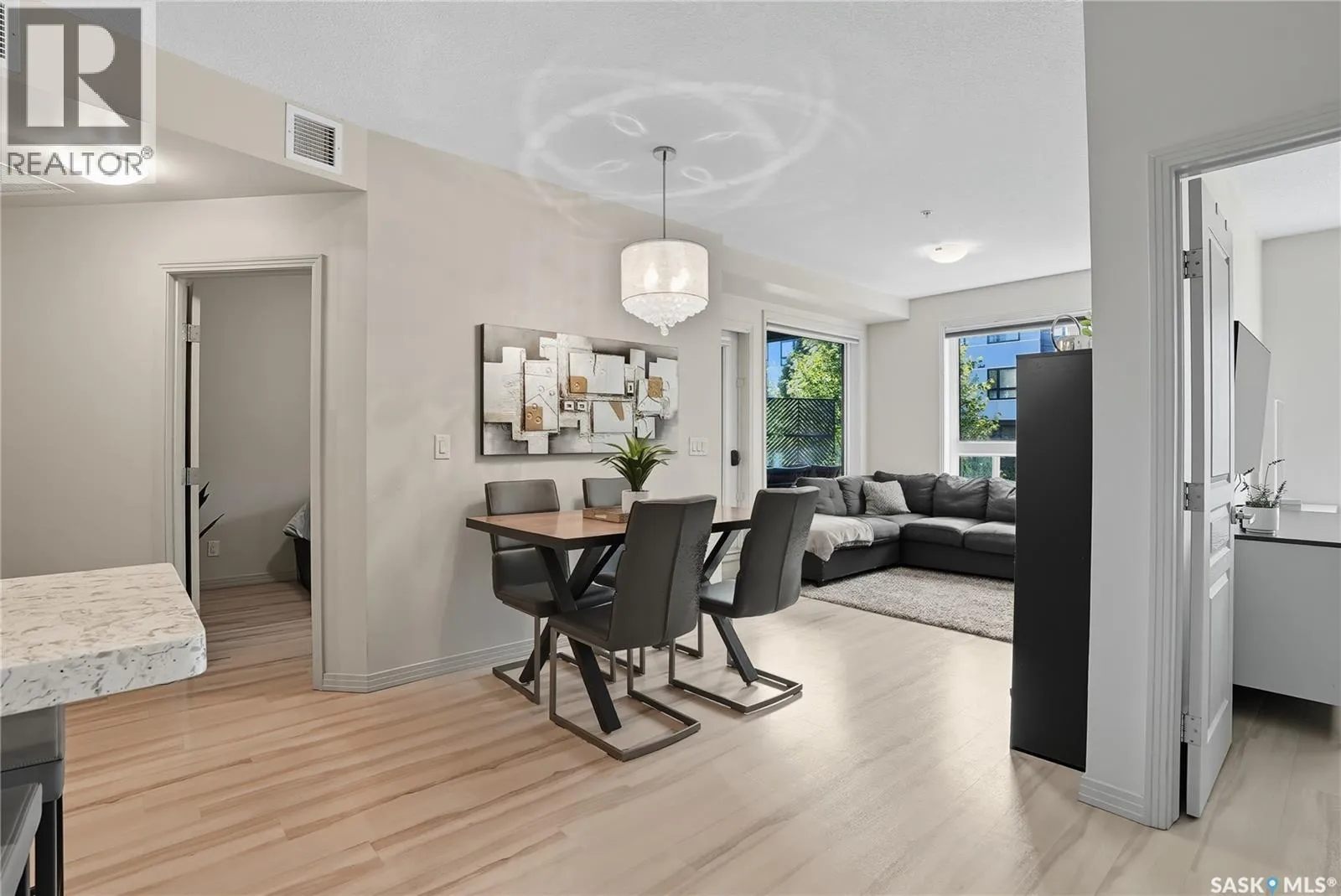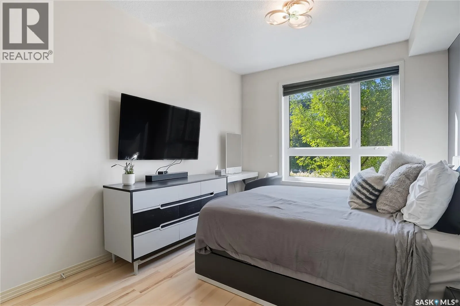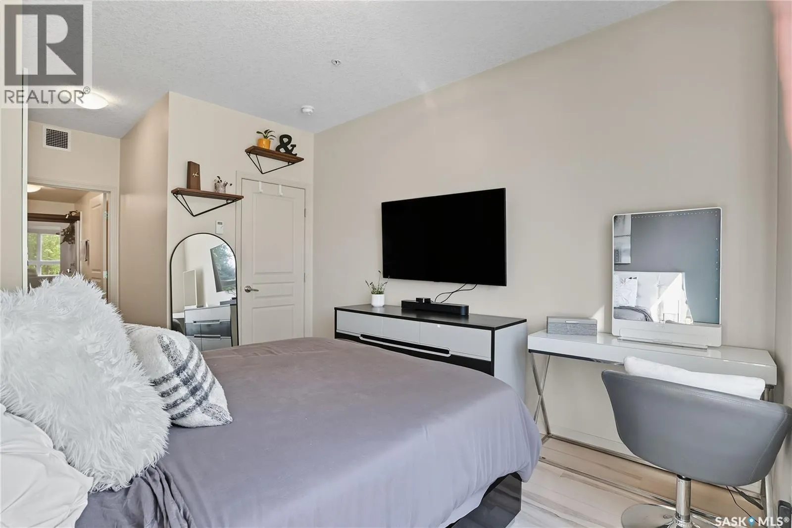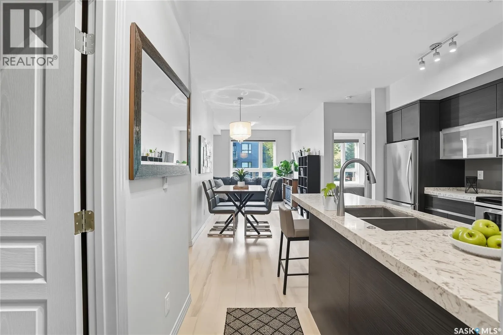 Welcome to 223 Evergreen Square #120 â a beautifully maintained 900 sq. ft. ground-level condo located in the heart of Evergreen, Saskatoon. This immaculate 2-bedroom, 2-bathroom unit stands out with its rare private entrance from the street, offering added convenience, privacy, and a townhouse-like feel that most units in the building donât have. Inside, you'll find a bright and modern living space featuring in-floor heating, central air conditioning, and elegant quartz countertops throughout. The primary bedroom includes a tiled ensuite with a dual vanity, adding a touch of luxury to your daily routine. Enjoy the outdoors from your oversized terrace, complete with glass railings and durable, foot-friendly vinyl deckingâperfect for entertaining or relaxing with views of Amphitheatre Park right across the street. This home also comes with an underground parking stall and a private storage unit located just beside it for added convenience. Residents of the building enjoy access to a yoga room, games room, and a pet-friendly âDoggy Spaâ wash station, making it ideal for both active lifestyles and pet owners. Located close to public transit, walking paths, and local amenities, this unit offers a perfect balance of comfort, style, and accessibility. (id:27476)