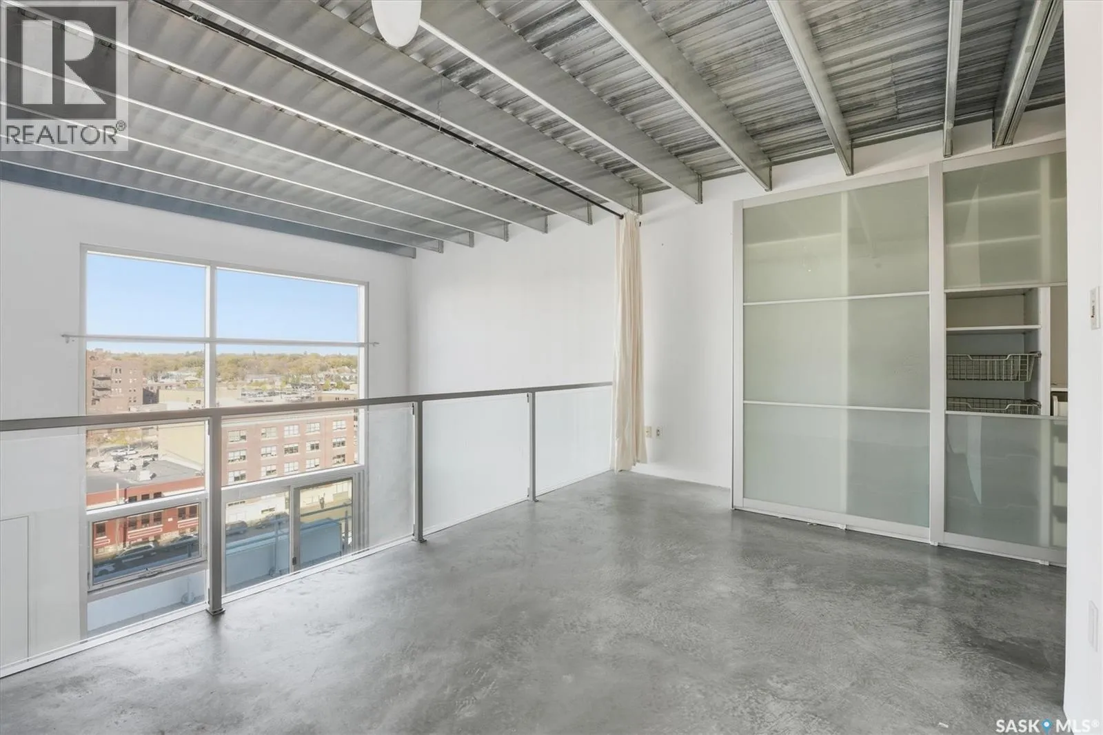 Top floor CORNER unit with massive wrap around balcony overlooking the city sky line! Welcome to the 2nd Avenue LOFTS where modern downtown living meets comfort and architectural character. This spacious 1,075 sq. ft. loft-style condo offers an open-concept layout with soaring ceilings, large windows, and a wraparound balcony that provides sweeping views of downtown Saskatoon. The highlight of this home is the large wraparound balcony overlooking Saskatoonâs new central library and the proposed new rink and event venue â the perfect spot to enjoy your morning coffee while taking in the energy and excitement of Saskatoonâs downtown revitalization. Located on the exclusive fifth floorâthe only level equipped with central air conditioningâthis unit ensures year-round comfort. The interior features polished concrete floors, a bright and functional kitchen, and a generous bedroom suite with a four-piece bath. This units updated kitchen includes brand new stainless steel kitchen appliances. A tandem underground parking for two vehicles is included for convenience and security. The installing of a vehicle lift is permitted as well (with board approval). The 2nd Avenue Lofts building offers residents access to excellent amenities, including a fully equipped gym, a recreation area with ping pong tables, a modern meeting room, and one of the best roof top patio areas (located on 3rd level) in the city. Situated in the heart of the Central Business District, youâll be steps away from restaurants, shopping, and the river valley trails. A unique opportunity to own one of the most desirable units in this sought-after building. (id:27476)
