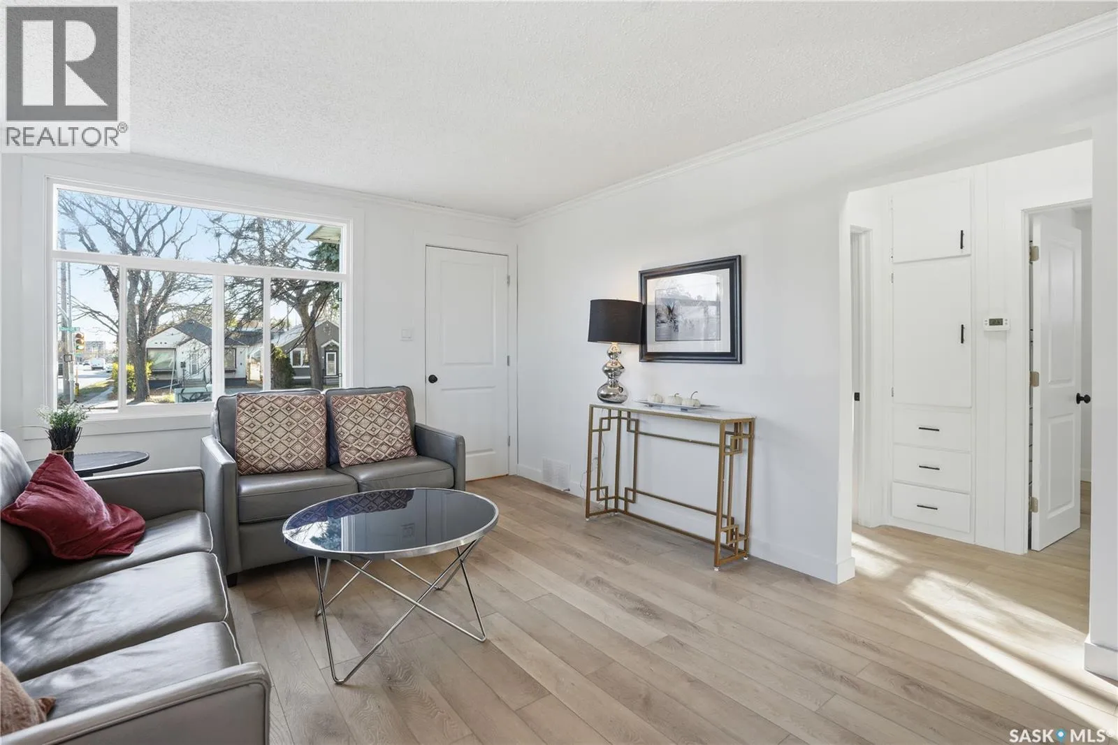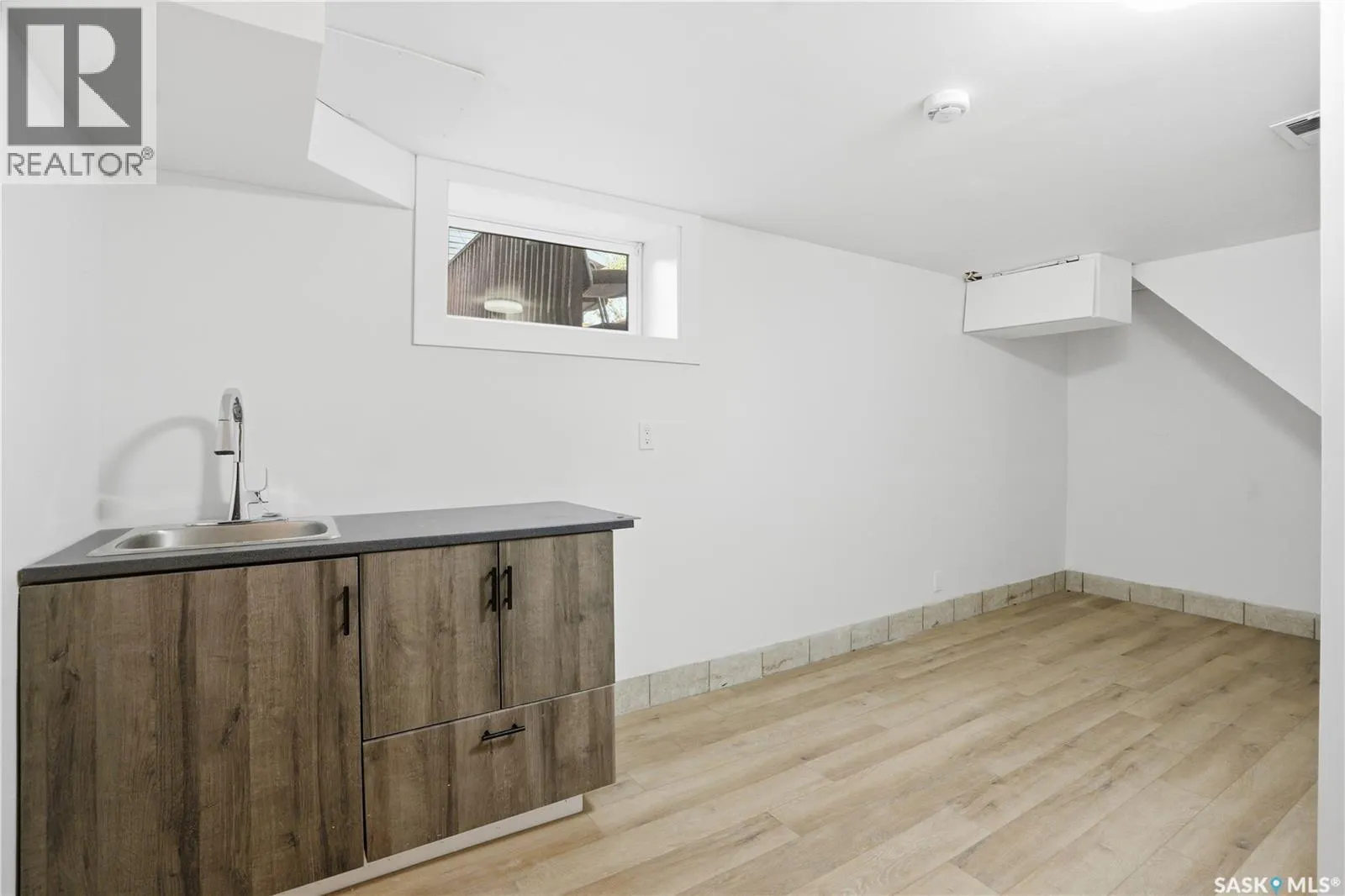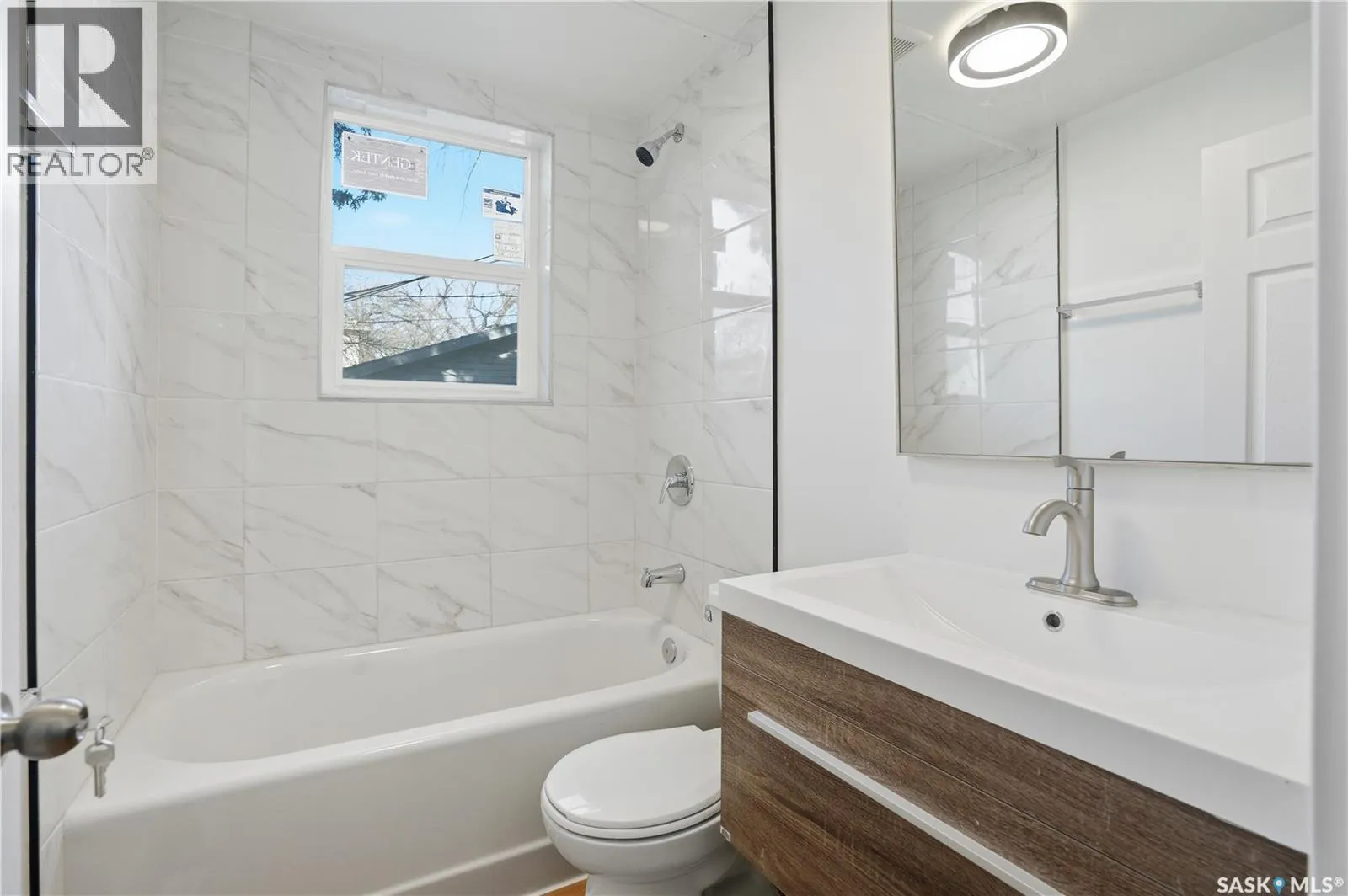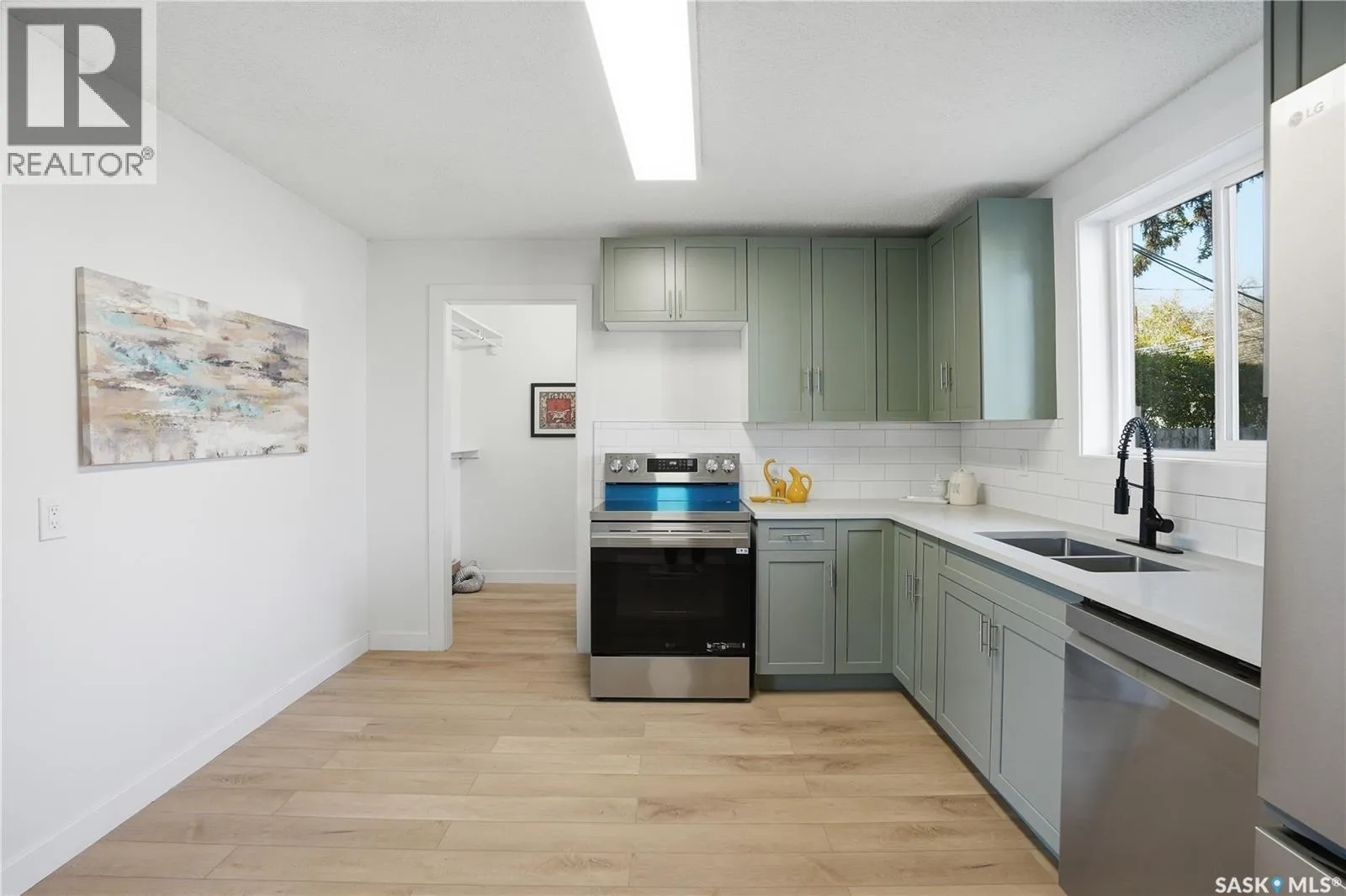 Newly renovated 914 sq ft bungalow in Caswell Hill! Featuring brand-new kitchen cabinets, appliances, flooring, windows, furnace, and hot water tank. The main floor offers two bedrooms, a full modern bathroom, and a spacious living and dining area. The basement has a separate entrance and includes two self-contained units: Unit A with one bedroom, a living room, a kitchen, and a 3-piece bathroom; and Unit B with a living space, a full bathroom, and a counter with sink â perfect as a studio or guest suite. Located directly across the street from Saskatchewan Polytechnic, this property is ideal for families with students or for generating rental income to help with your mortgage! Double detached garage is insulated and boarded ,its ready for the coming winter. Seprate electrical panel in the garage. (id:27476)