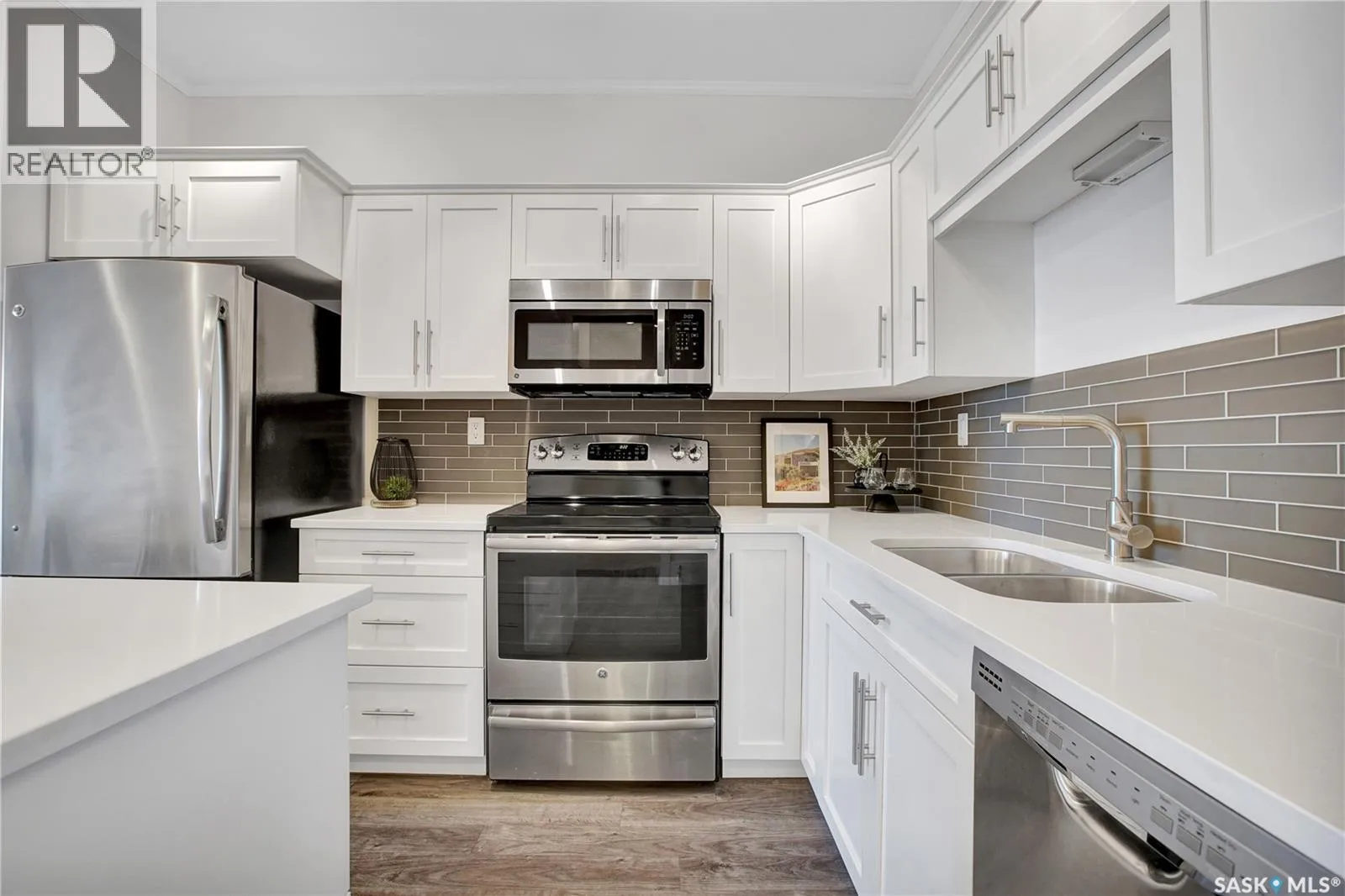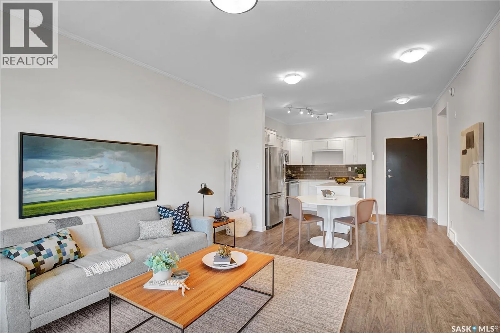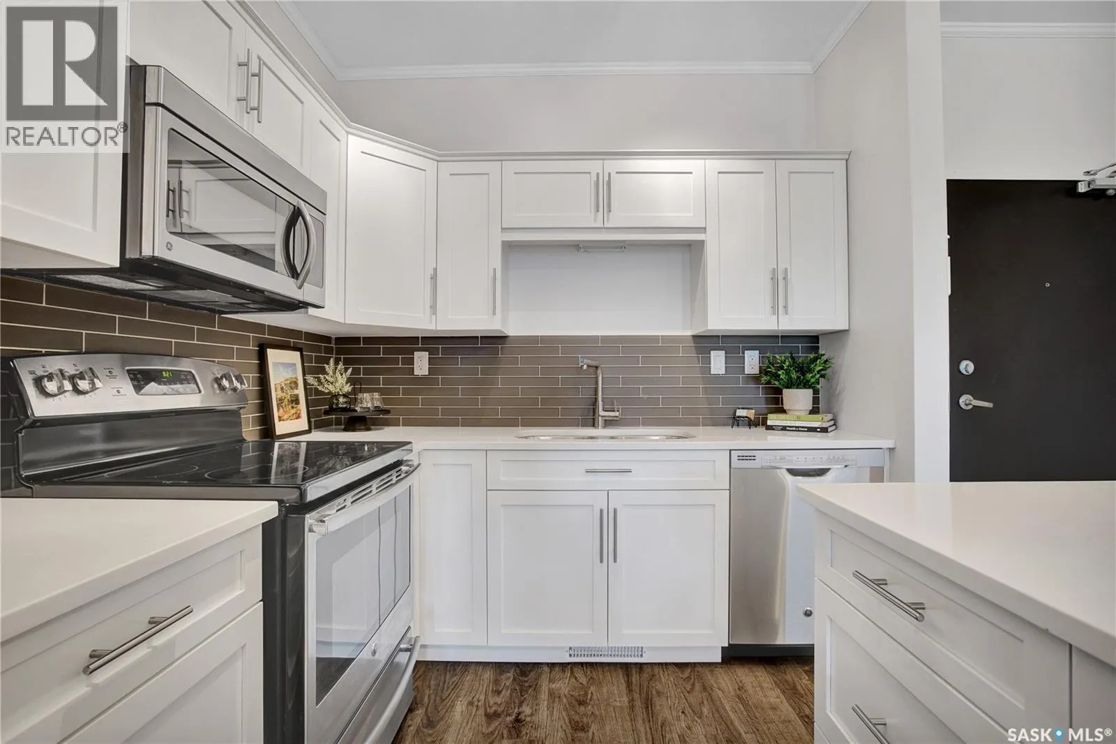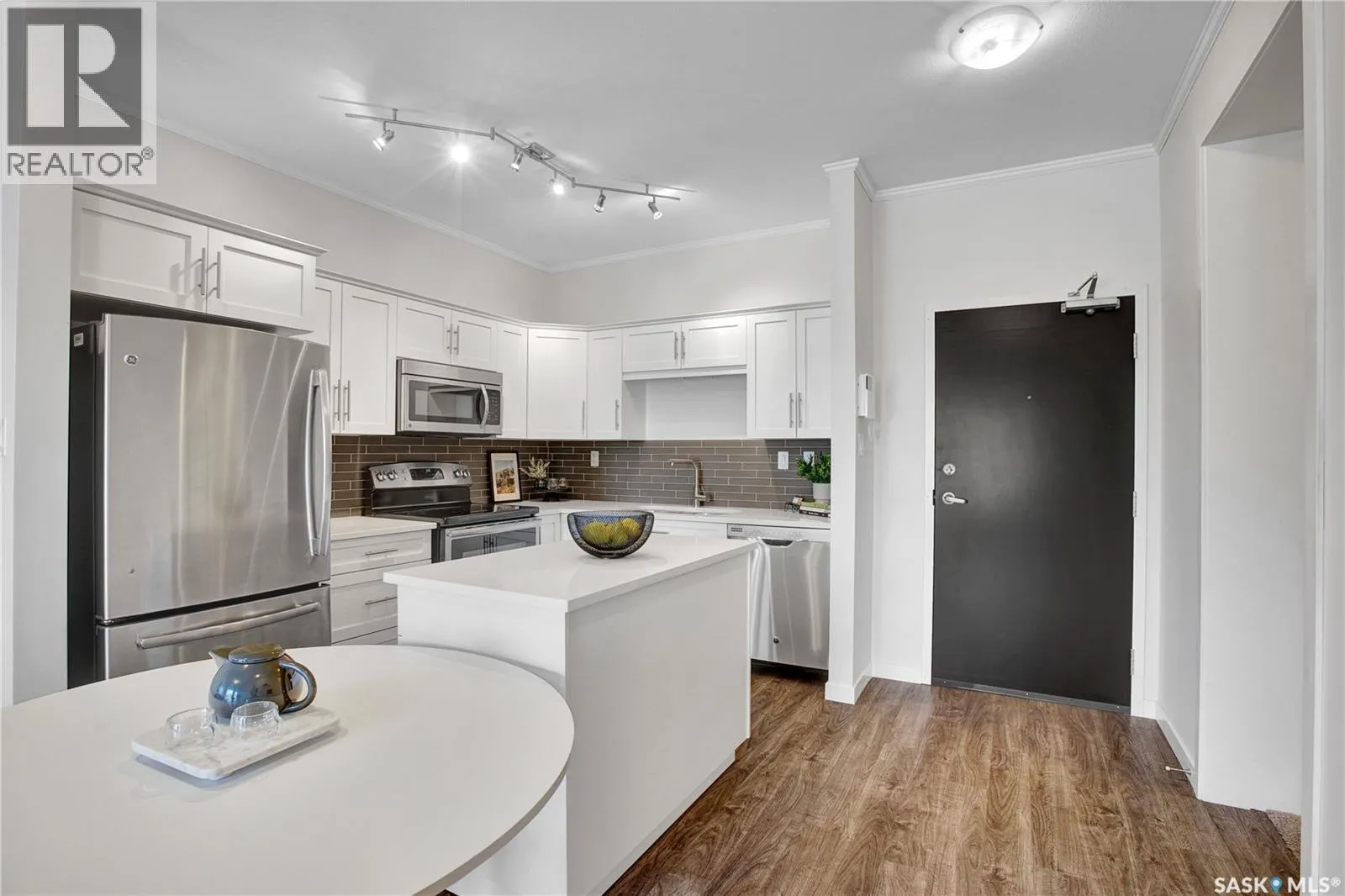This stylish 2-bedroom, 1.5-bath condo sits on the main floor and includes two parking stallsâone underground and one surface. Enjoy an open layout with 9â ceilings, a bright living space, and a modern kitchen featuring quartz counters, glass tile backsplash, stainless steel appliances, soft-close cabinets, and a moveable island. The private balcony is perfect for morning coffee or evening unwinding, while the bedrooms are set apart for added privacy. In-suite laundry and central A/C add convenience. Located in the heart of Kensington, just steps from shops, cafes, and groceriesâthis is low-maintenance living with contemporary appeal. Move in and enjoy! (id:27476)