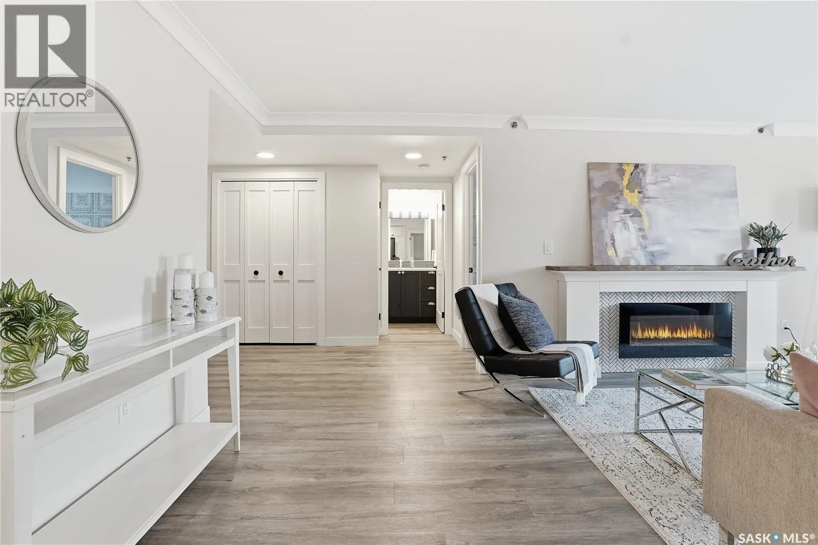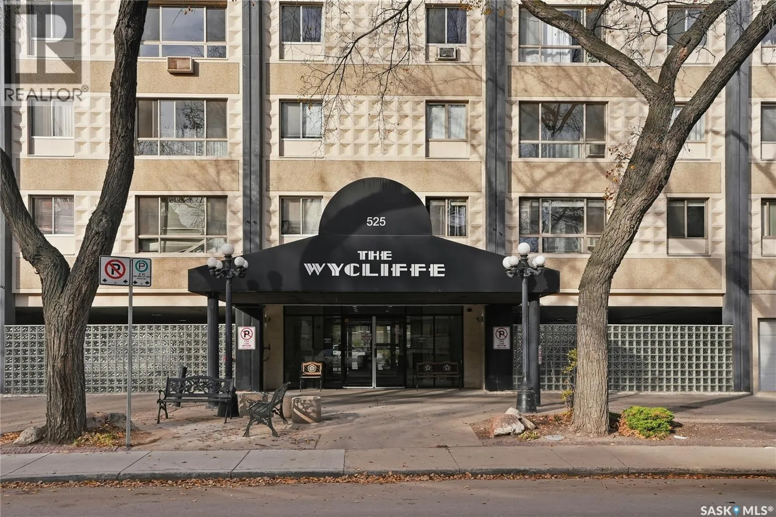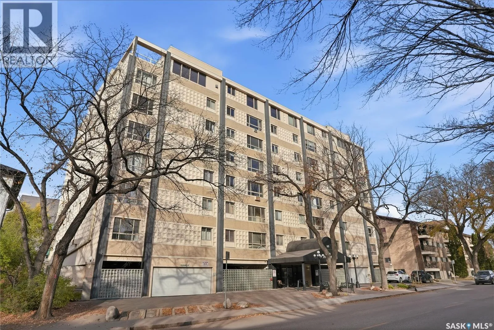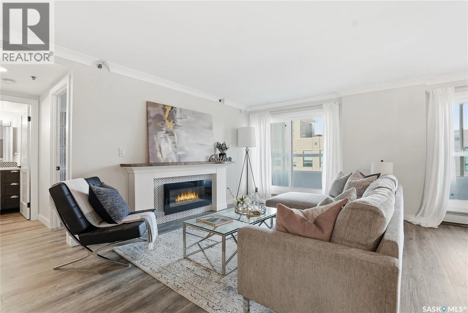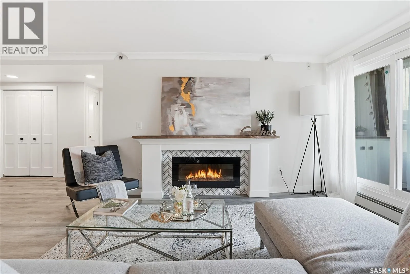 Welcome to The Wycliffe â A Rare City Park Gem! Experience modern elegance and timeless charm in this immaculate, 2-bedroom, 2-bathroom+den executive condo located in a prime location on 3rd Avenue in City Park. With over 1,475 sq.ft. of beautifully renovated living space, this third-floor suite offers the perfect blend of sophistication, comfort, and convenience at an unbeatable price! Step inside to discover a custom-designed kitchen featuring quartz countertops, a sleek tile backsplash, stainless steel appliances, and a massive island with seating â ideal for entertaining or everyday living. The kitchen opens seamlessly into a spacious living area, where a cozy fireplace with a classic live-edge mantle sets the tone for relaxed evenings at home. The primary suite is a true retreat, complete with a large walk-in closet and a stunning ensuite boasting a tiled glass shower. A second generous bedroom and a fully renovated 4-piece bath provide the perfect guest wing. Working from home? The private den with French doors offers the perfect quiet workspace. Highlights include: Covered breezeway deck â a unique feature of this unit, ideal for morning coffee or evening relaxation, crown molding throughout with newer paint, flooring, and trim, newer fridge and washer and dryer, newer windows and doors, wide hallways, and two elevators for convenience, covered parking stall included, beautifully maintained building with rooftop patio and welcoming common area. Perfectly positioned in Saskatoonâs highly sought-after City Park neighborhood, just a short walk to the river, downtown core, Earls restaurant, shopping, and City Hospital. All buyers/buyer's agents to verify measurements. This condo must be seen to be appreciated â opportunities like this are rare! Book your private showing today. (id:27476)