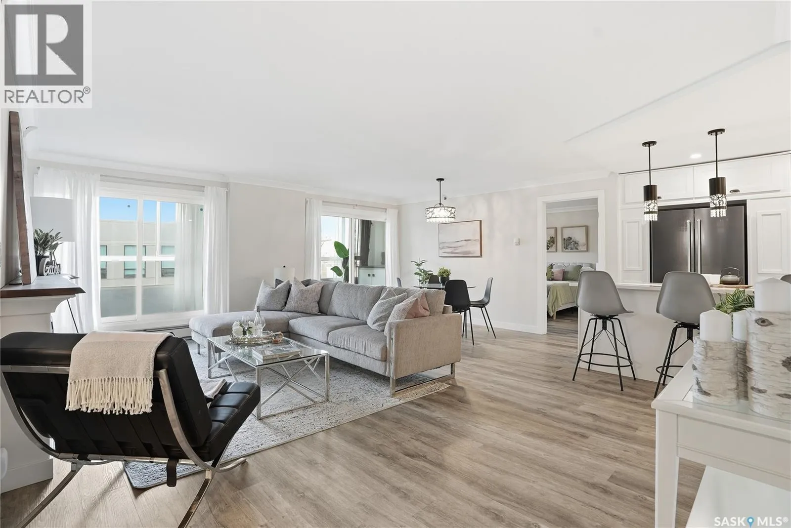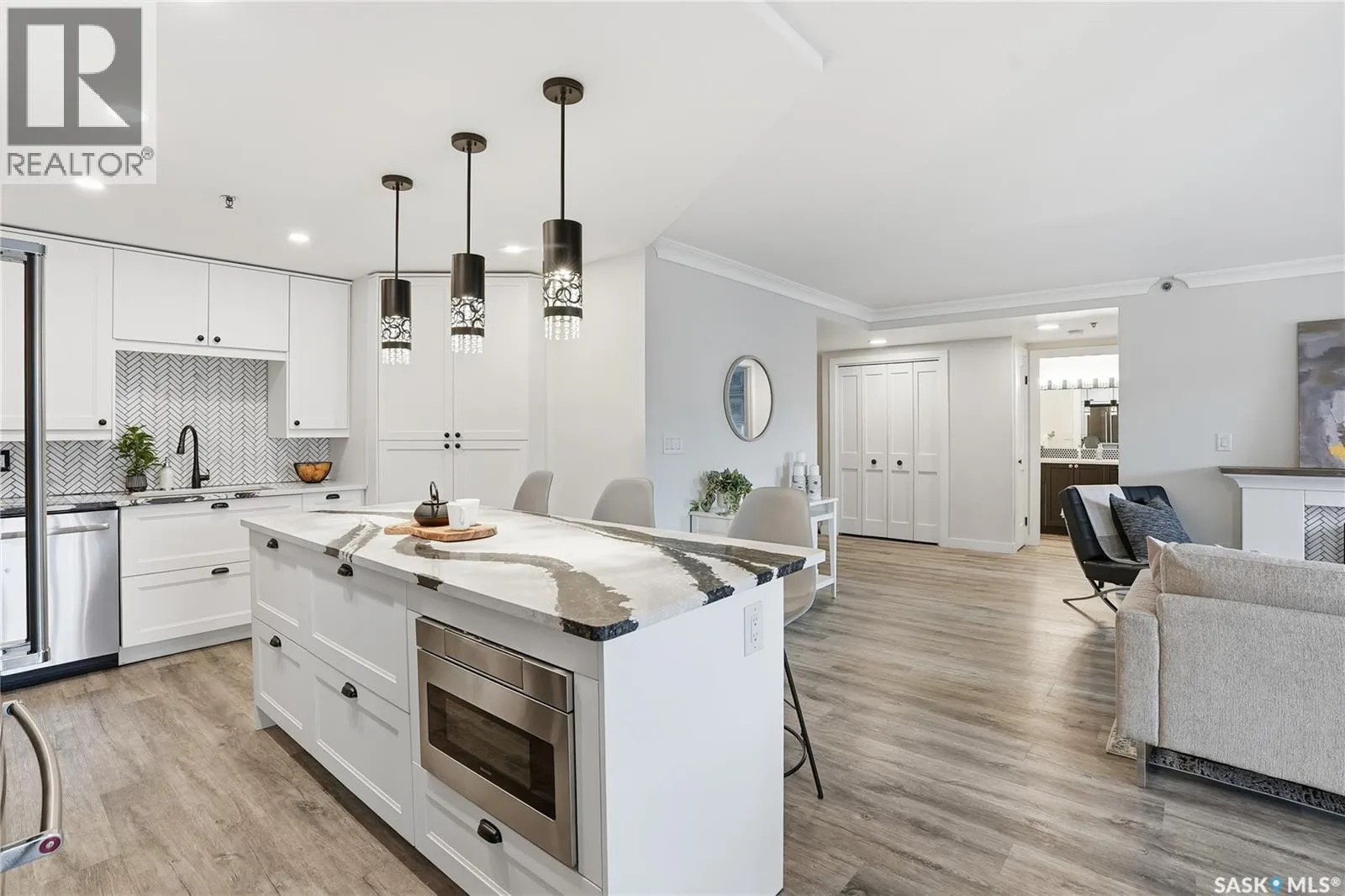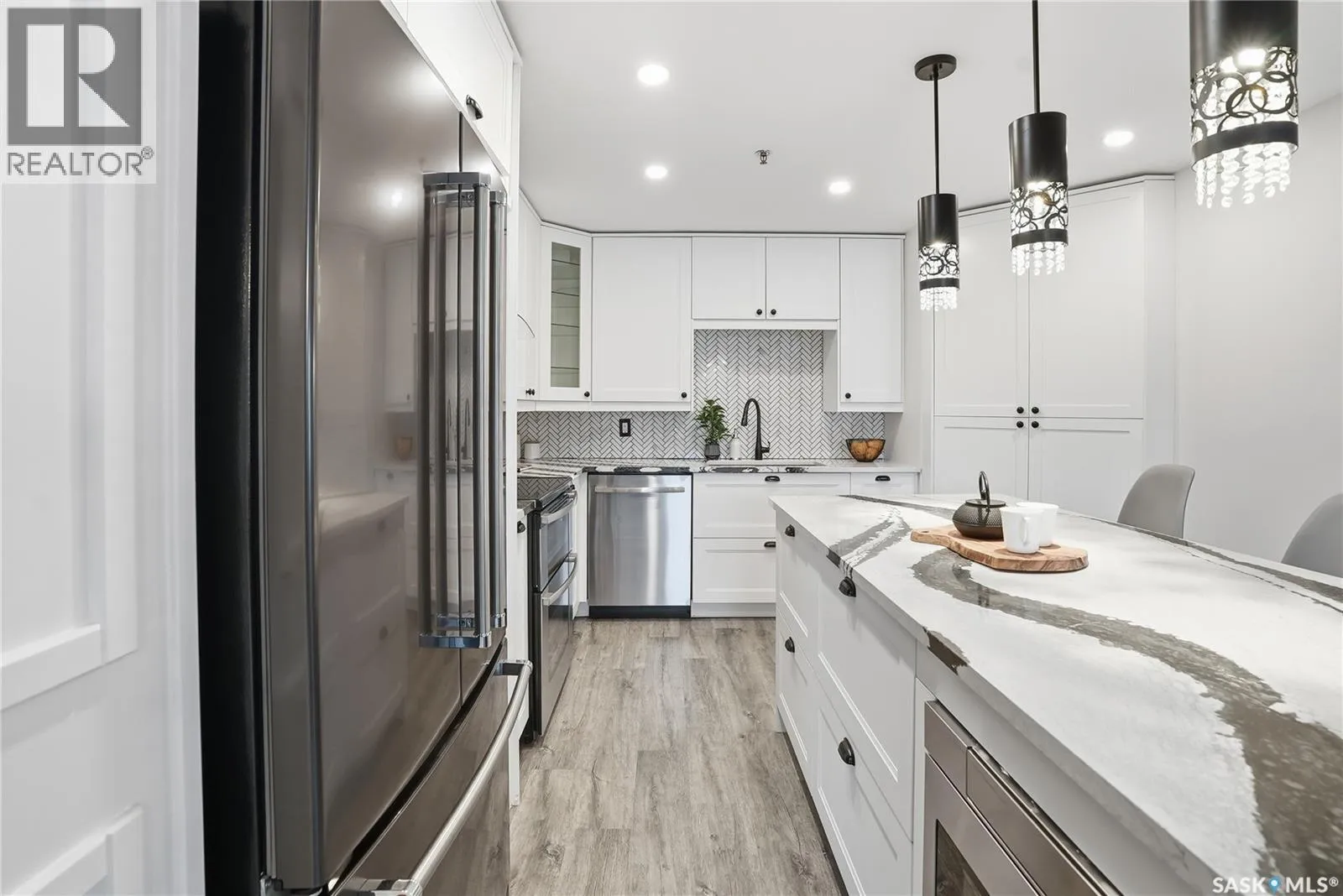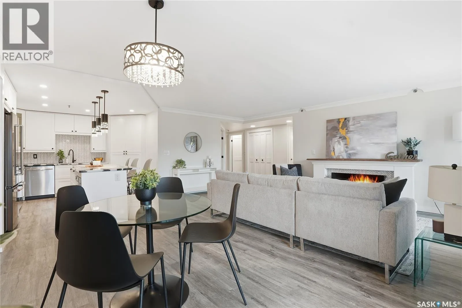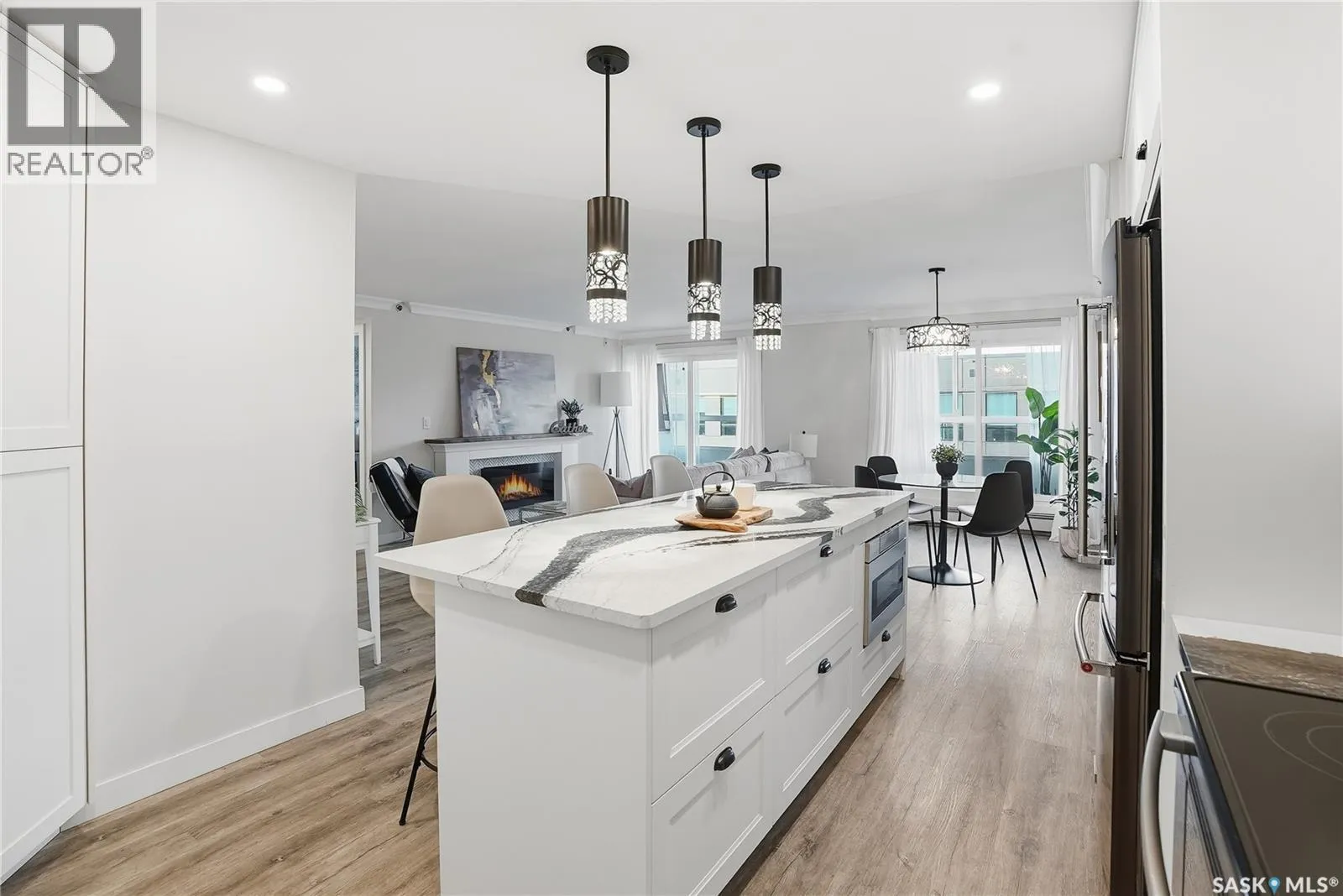 Welcome to The Wycliffe â A Rare City Park Gem! Experience modern elegance and timeless charm in this immaculate, 2-bedroom, 2-bathroom+den executive condo located in a prime location on 3rd Avenue in City Park. With over 1,475 sq.ft. of beautifully renovated living space, this third-floor suite offers the perfect blend of sophistication, comfort, and convenience at an unbeatable price! Step inside to discover a custom-designed kitchen featuring quartz countertops, a sleek tile backsplash, stainless steel appliances, and a massive island with seating â ideal for entertaining or everyday living. The kitchen opens seamlessly into a spacious living area, where a cozy fireplace with a classic live-edge mantle sets the tone for relaxed evenings at home. The primary suite is a true retreat, complete with a large walk-in closet and a stunning ensuite boasting a tiled glass shower. A second generous bedroom and a fully renovated 4-piece bath provide the perfect guest wing. Working from home? The private den with French doors offers the perfect quiet workspace. Highlights include: Covered breezeway deck â a unique feature of this unit, ideal for morning coffee or evening relaxation, crown molding throughout with newer paint, flooring, and trim, newer fridge and washer and dryer, newer windows and doors, wide hallways, and two elevators for convenience, covered parking stall included, beautifully maintained building with rooftop patio and welcoming common area. Perfectly positioned in Saskatoonâs highly sought-after City Park neighborhood, just a short walk to the river, downtown core, Earls restaurant, shopping, and City Hospital. All buyers/buyer's agents to verify measurements. This condo must be seen to be appreciated â opportunities like this are rare! Book your private showing today. (id:27476)