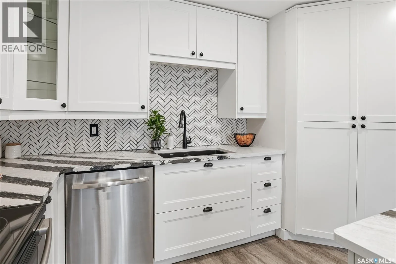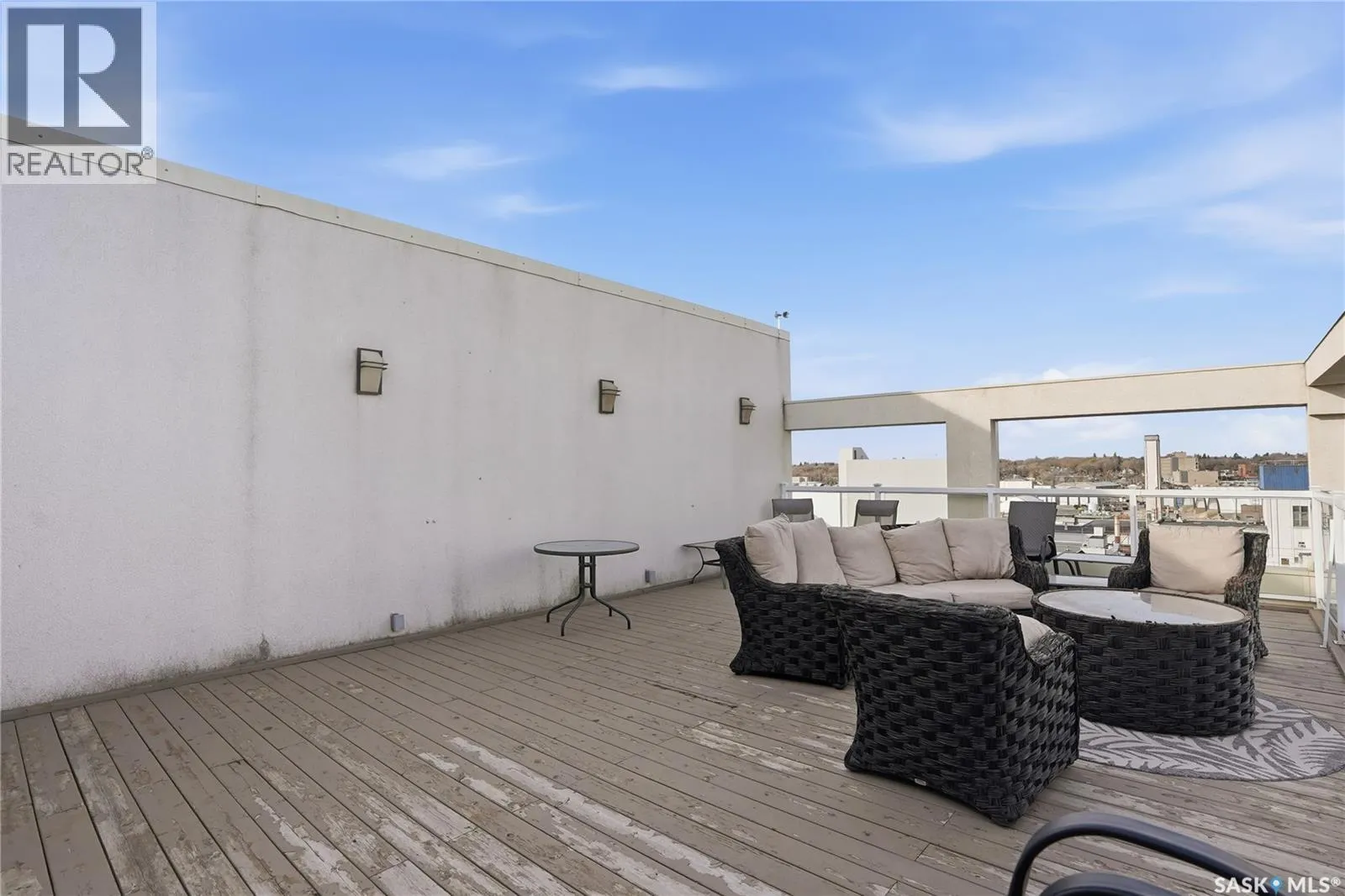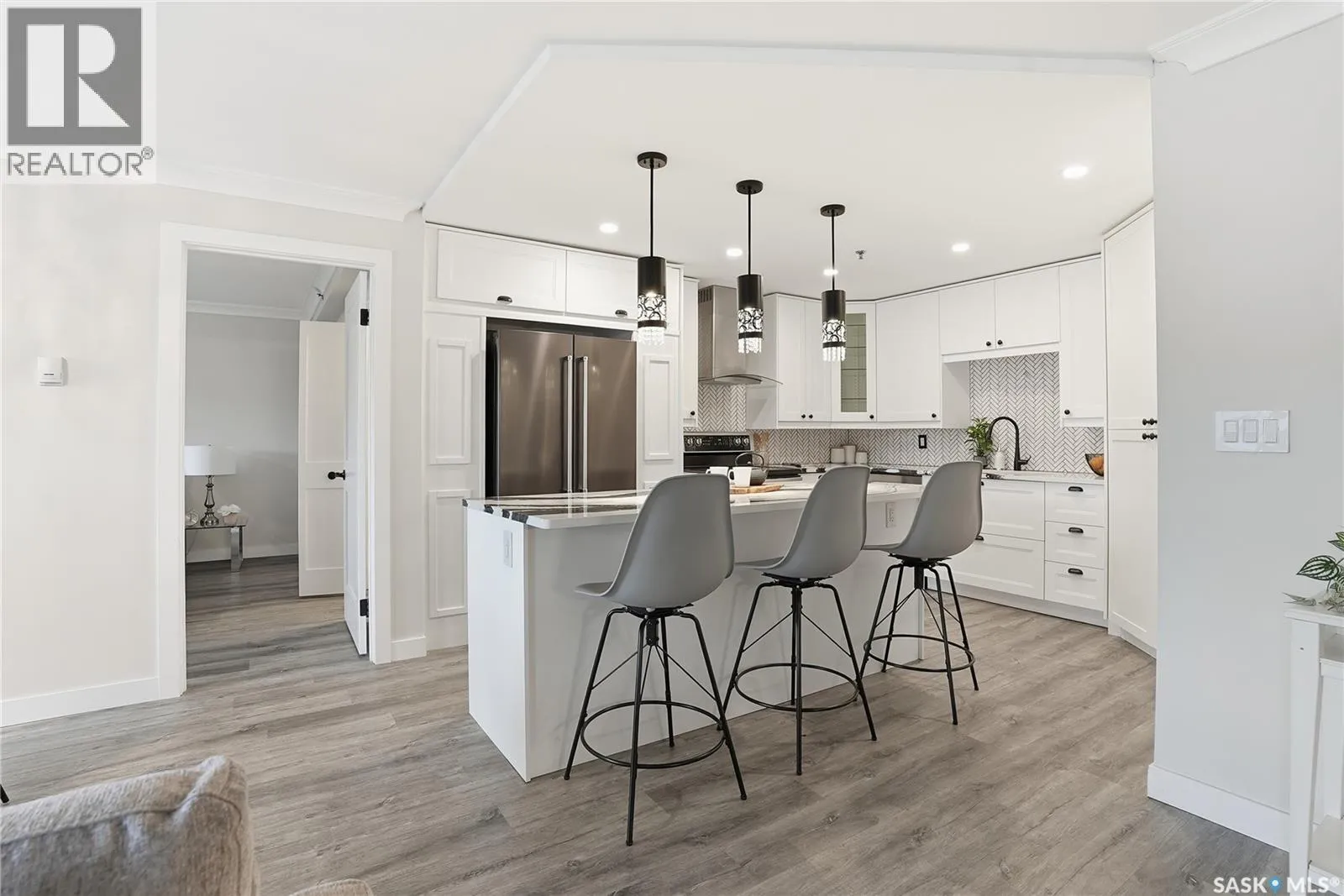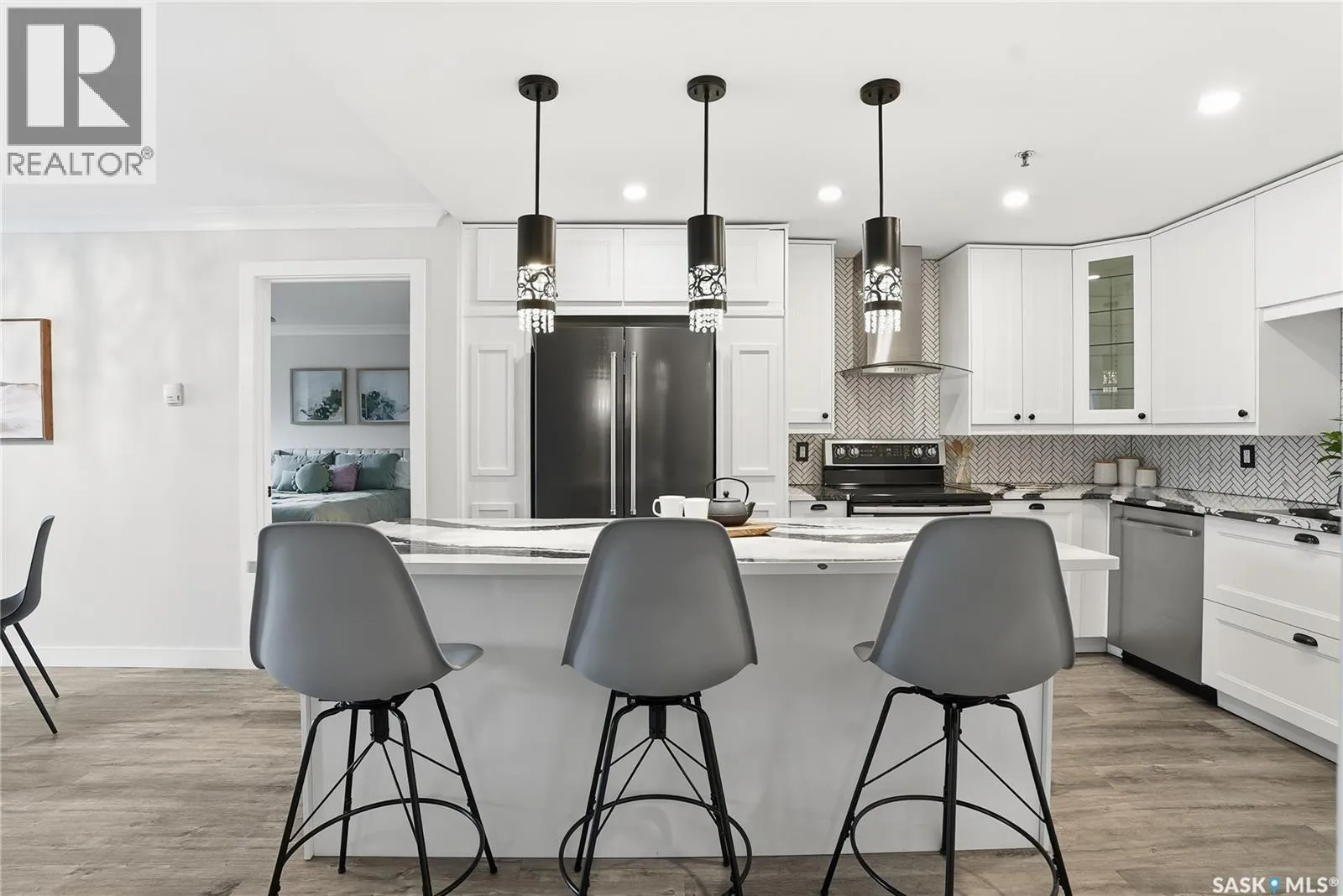 Welcome to The Wycliffe â A Rare City Park Gem! Experience modern elegance and timeless charm in this immaculate, 2-bedroom, 2-bathroom+den executive condo located in a prime location on 3rd Avenue in City Park. With over 1,475 sq.ft. of beautifully renovated living space, this third-floor suite offers the perfect blend of sophistication, comfort, and convenience at an unbeatable price! Step inside to discover a custom-designed kitchen featuring quartz countertops, a sleek tile backsplash, stainless steel appliances, and a massive island with seating â ideal for entertaining or everyday living. The kitchen opens seamlessly into a spacious living area, where a cozy fireplace with a classic live-edge mantle sets the tone for relaxed evenings at home. The primary suite is a true retreat, complete with a large walk-in closet and a stunning ensuite boasting a tiled glass shower. A second generous bedroom and a fully renovated 4-piece bath provide the perfect guest wing. Working from home? The private den with French doors offers the perfect quiet workspace. Highlights include: Covered breezeway deck â a unique feature of this unit, ideal for morning coffee or evening relaxation, crown molding throughout with newer paint, flooring, and trim, newer fridge and washer and dryer, newer windows and doors, wide hallways, and two elevators for convenience, covered parking stall included, beautifully maintained building with rooftop patio and welcoming common area. Perfectly positioned in Saskatoonâs highly sought-after City Park neighborhood, just a short walk to the river, downtown core, Earls restaurant, shopping, and City Hospital. All buyers/buyer's agents to verify measurements. This condo must be seen to be appreciated â opportunities like this are rare! Book your private showing today. (id:27476)