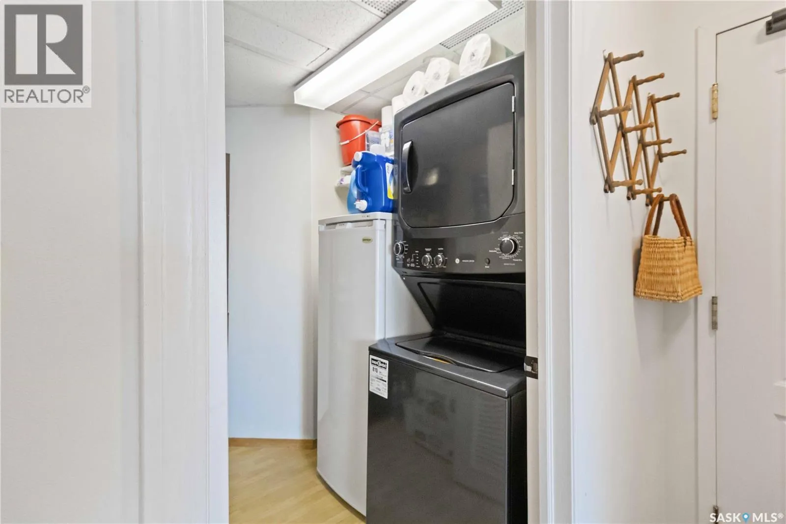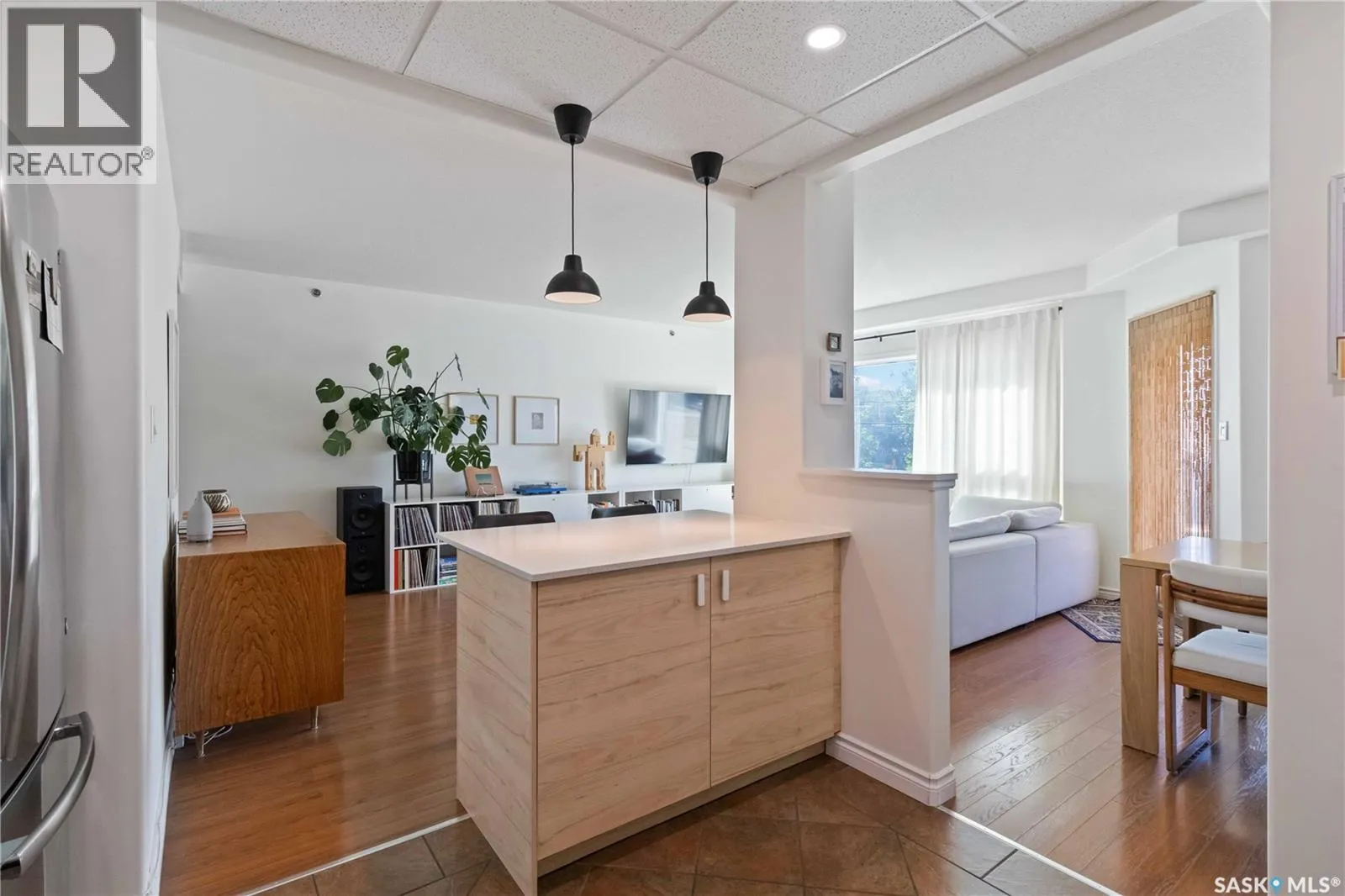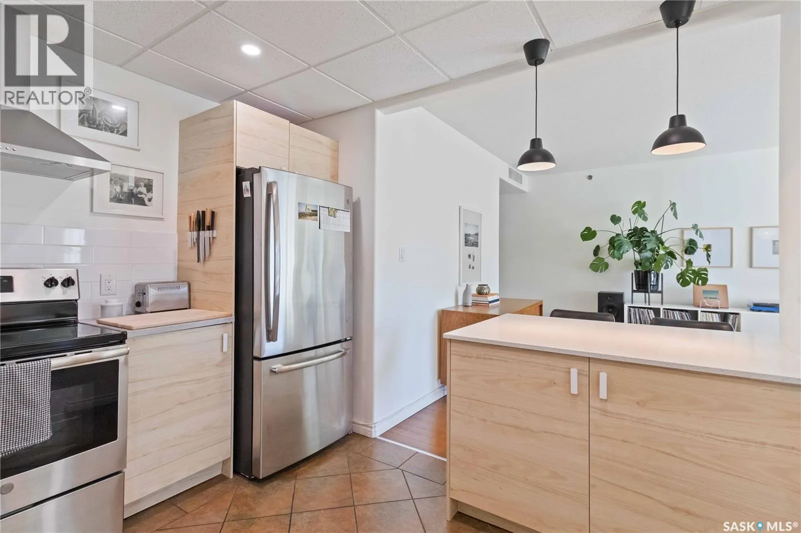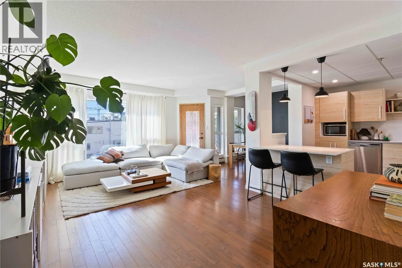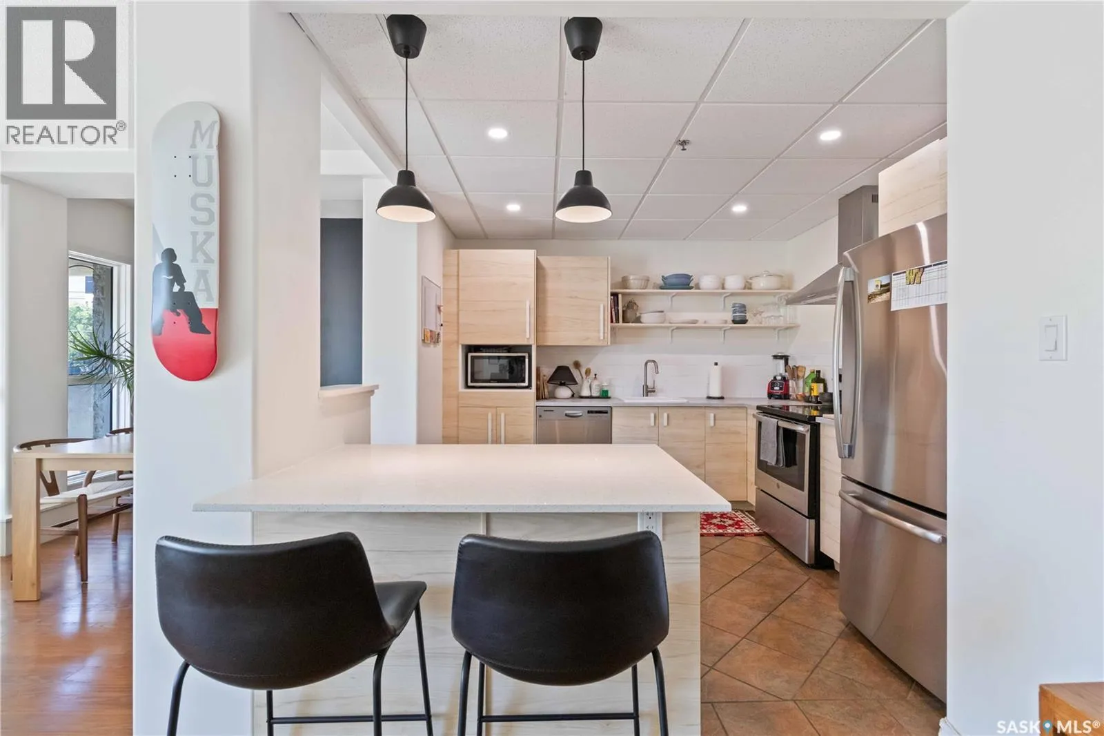 This condo is located on the first floor, with easy elevator access. Inside, youâre greeted by a bright and spacious entryway. The unit offers an open-concept living and kitchen area. The kitchen stands out with its quartz-topped island, modern Scandinavian-inspired cabinetry, tiled backsplash, sleek pot lighting, stainless steel appliances. Just off the dining space, youâll find a private west-facing balcony with a BBQ hookupâperfect for enjoying sunny afternoons and glowing evening sunsets. The living room is generously sized, featuring large windows that fill the space with natural light. The primary bedroom includes a full ensuite with a walk-in shower, while the second bedroom (currently used as an office) sits adjacent to the main bath with tub/shower combo. Additional highlights include in-suite laundry, central air conditioning, and the convenience of having the laundry room tucked away near the entry. (id:27476)