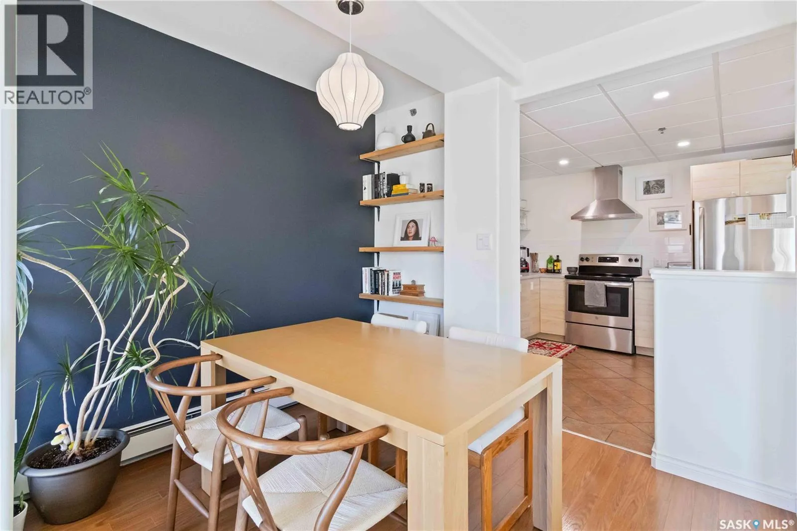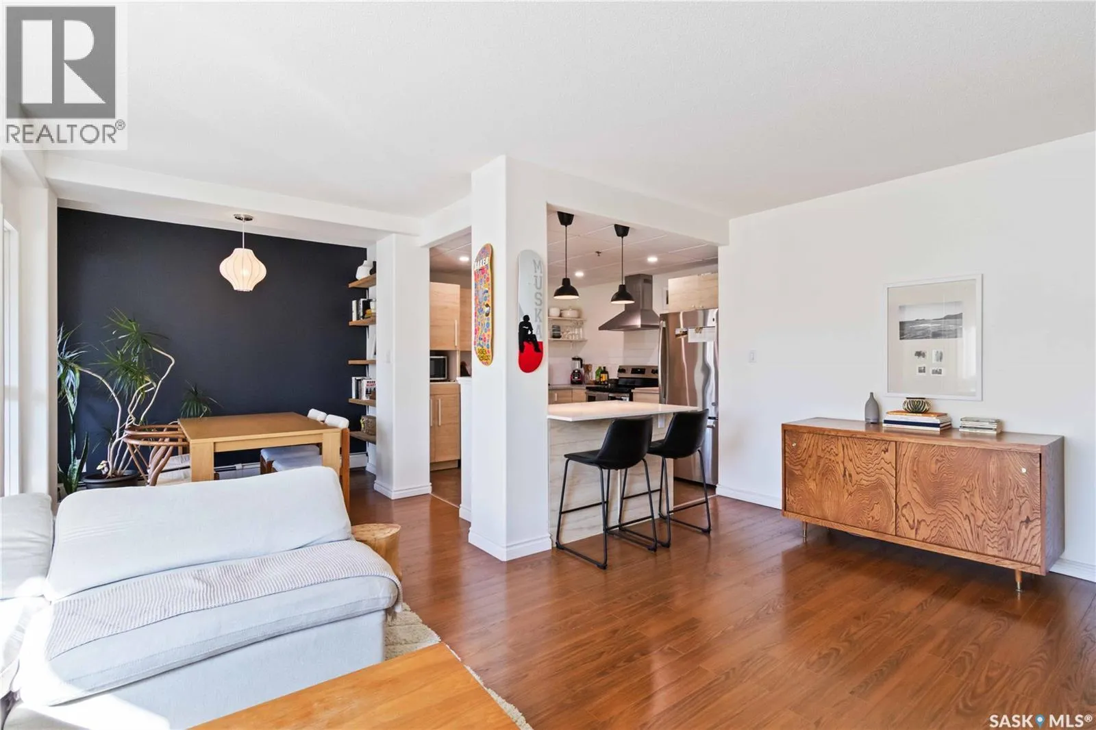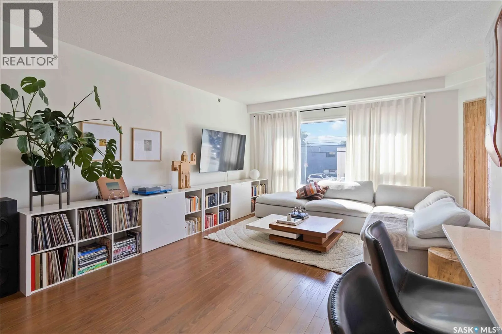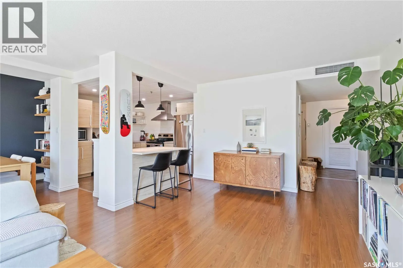 This condo is located on the first floor, with easy elevator access. Inside, youâre greeted by a bright and spacious entryway. The unit offers an open-concept living and kitchen area. The kitchen stands out with its quartz-topped island, modern Scandinavian-inspired cabinetry, tiled backsplash, sleek pot lighting, stainless steel appliances. Just off the dining space, youâll find a private west-facing balcony with a BBQ hookupâperfect for enjoying sunny afternoons and glowing evening sunsets. The living room is generously sized, featuring large windows that fill the space with natural light. The primary bedroom includes a full ensuite with a walk-in shower, while the second bedroom (currently used as an office) sits adjacent to the main bath with tub/shower combo. Additional highlights include in-suite laundry, central air conditioning, and the convenience of having the laundry room tucked away near the entry. (id:27476)
