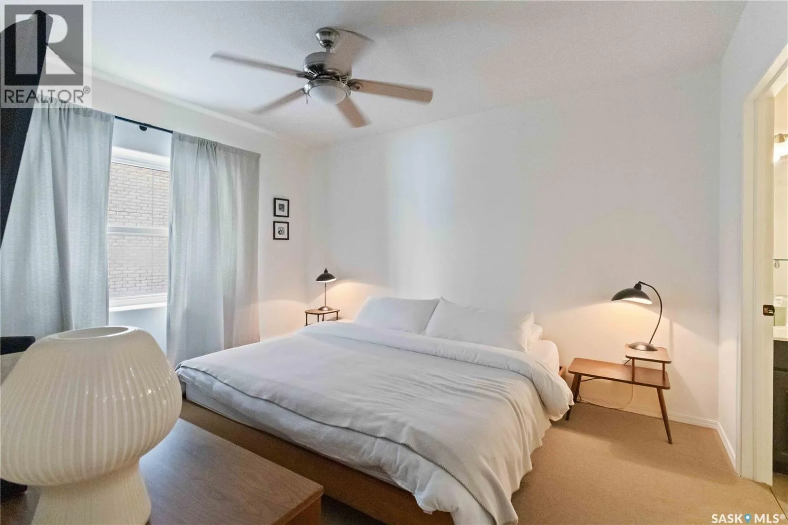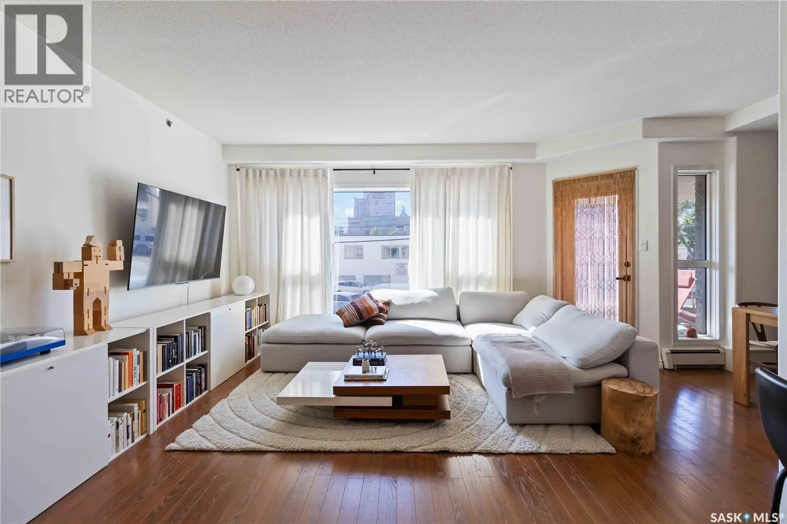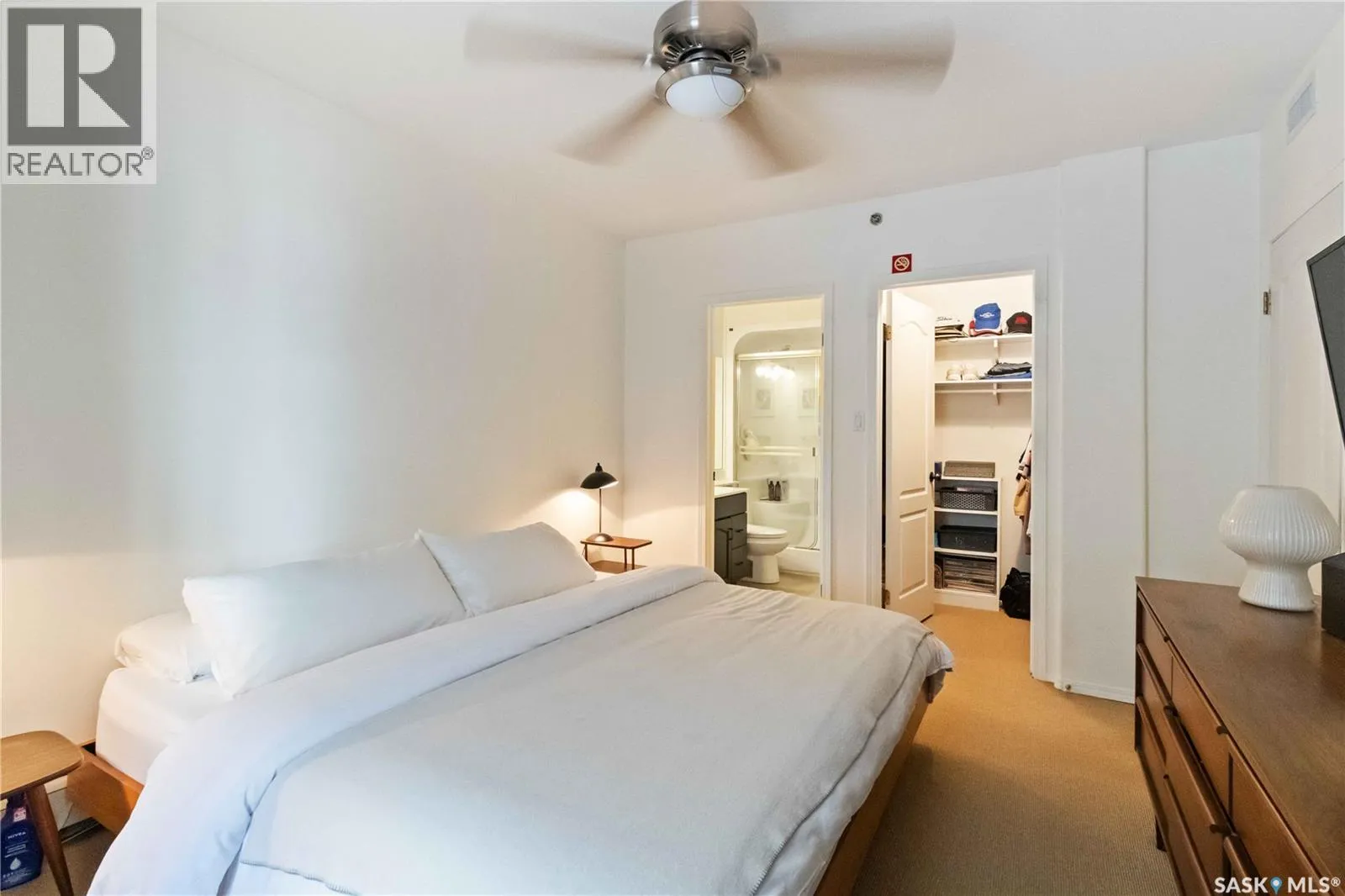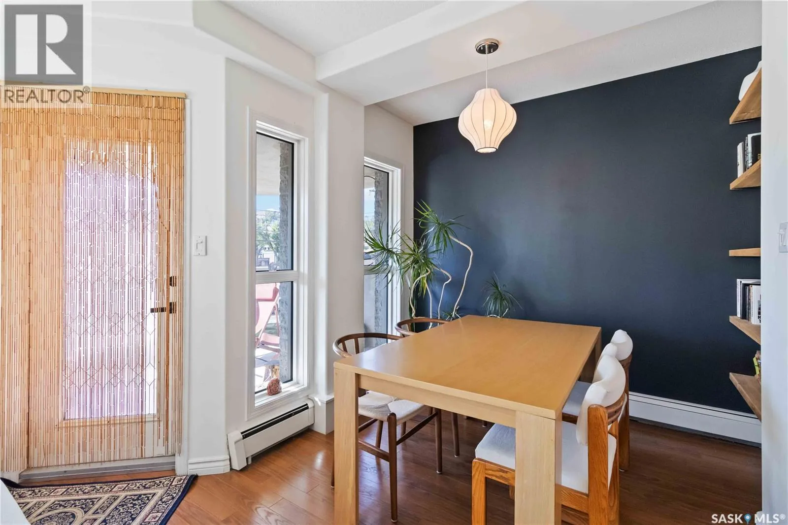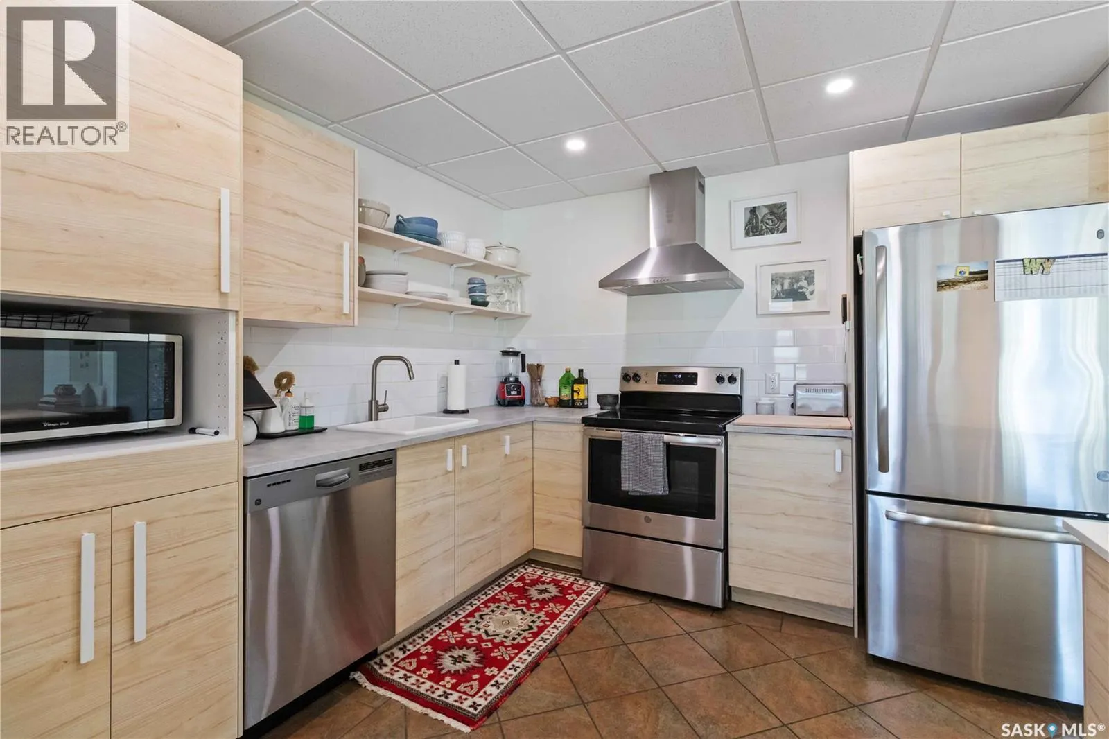 This condo is located on the first floor, with easy elevator access. Inside, youâre greeted by a bright and spacious entryway. The unit offers an open-concept living and kitchen area. The kitchen stands out with its quartz-topped island, modern Scandinavian-inspired cabinetry, tiled backsplash, sleek pot lighting, stainless steel appliances. Just off the dining space, youâll find a private west-facing balcony with a BBQ hookupâperfect for enjoying sunny afternoons and glowing evening sunsets. The living room is generously sized, featuring large windows that fill the space with natural light. The primary bedroom includes a full ensuite with a walk-in shower, while the second bedroom (currently used as an office) sits adjacent to the main bath with tub/shower combo. Additional highlights include in-suite laundry, central air conditioning, and the convenience of having the laundry room tucked away near the entry. (id:27476)