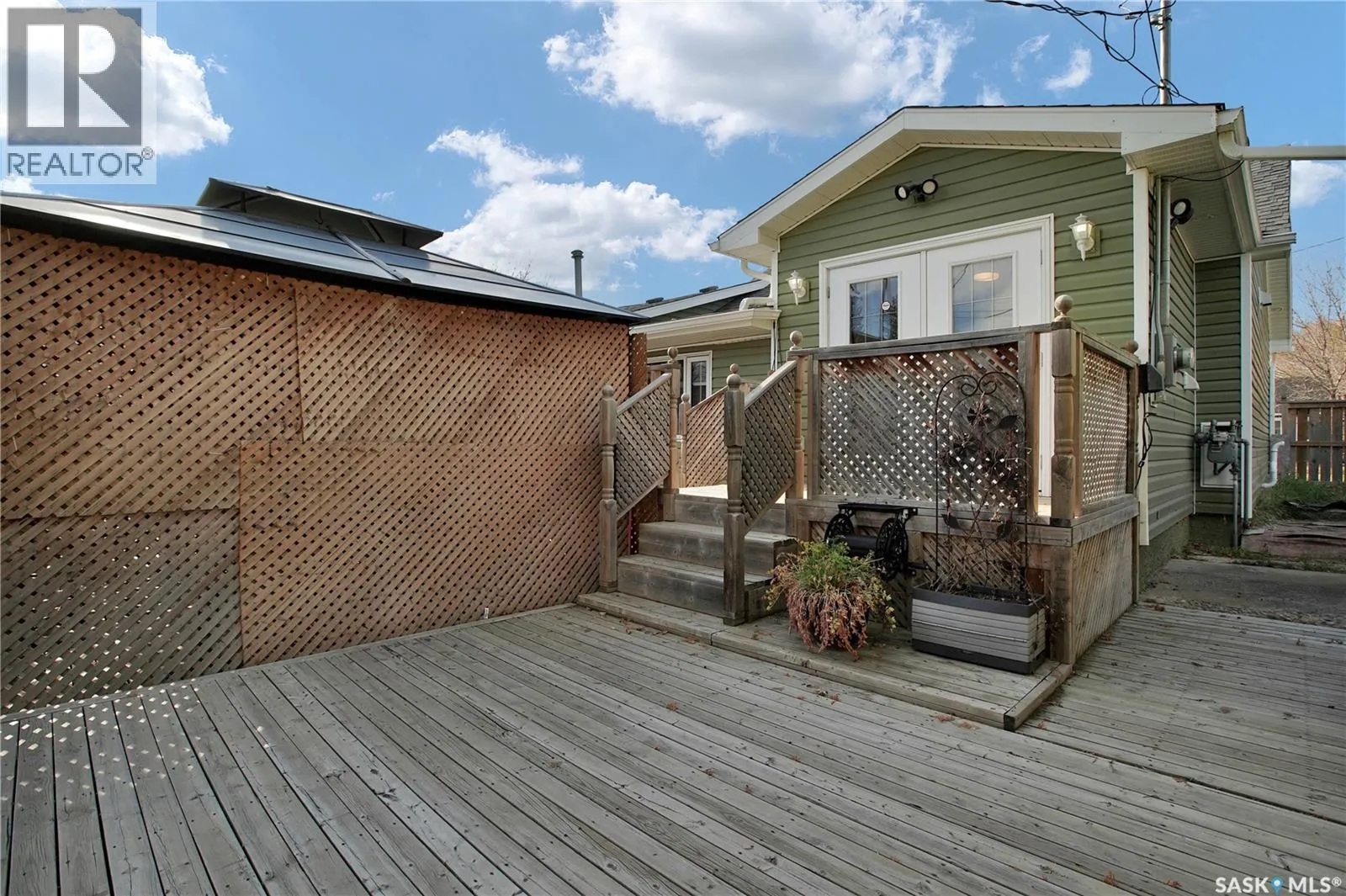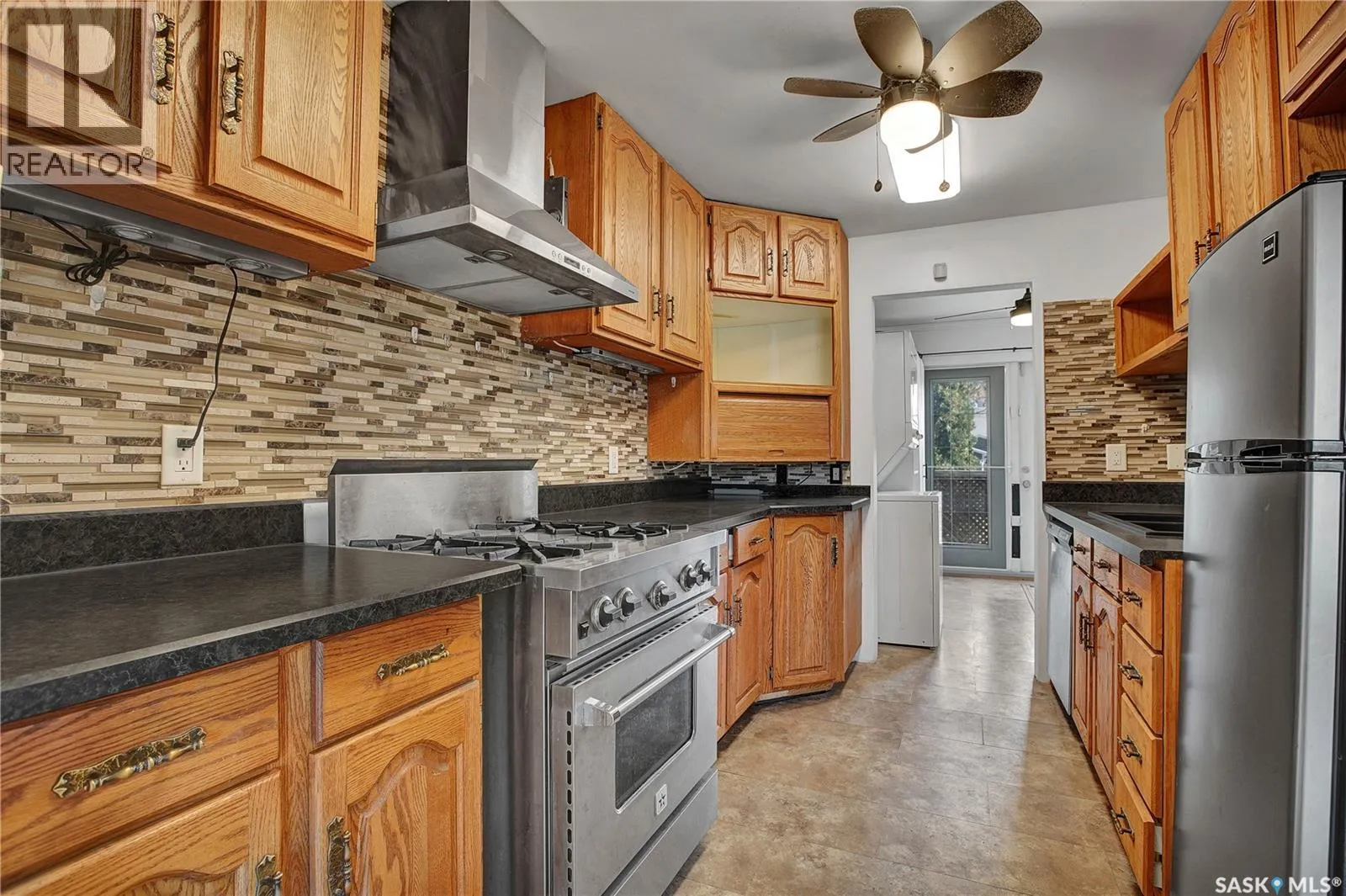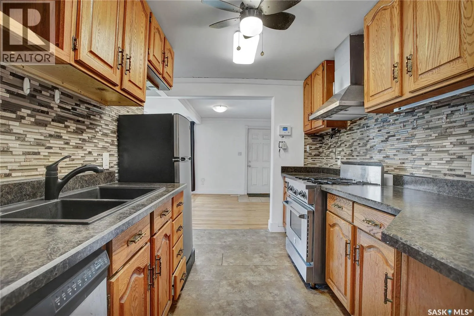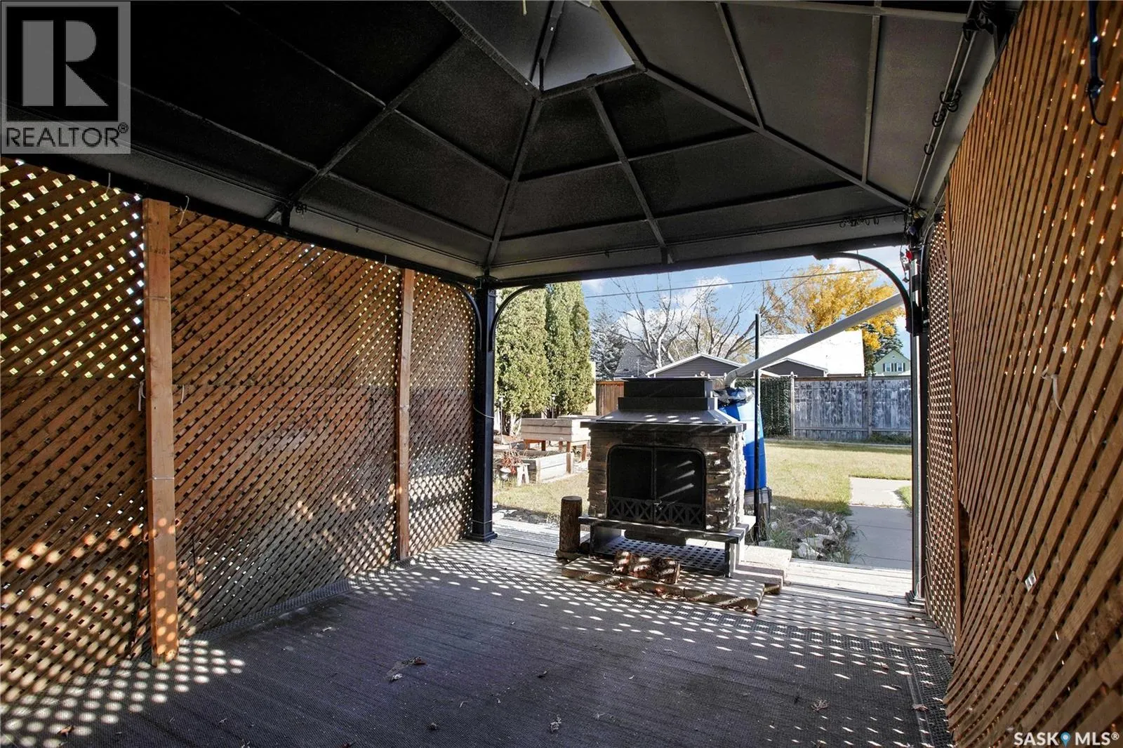 Welcome to the ultimate bachelor pad located on a quiet street in the mature King George! Enter a spacious living room with a view of the upgraded kitchen, and direct access to the oversized bedroom that could easily accommodate two. The bedroom leads to a sunken porch with direct access to the attached garage. From there you can enter the laundry/mudroom, which is loaded with countertop workspace, open shelving, and more upper/lower cabinetry. From there you can exit into the backyard or circle back to the kitchen. The kitchen has tall custom cabinetry, tile backsplash, a gas range, a black finish sink, and all stainless-steel appliances including a new fridge. The backyard is massive due to the large lot size. It boasts an antique commercial-style meat smoker, oversized deck, patio, shed, gazebo, flower beds, cement walking paths, and mature trees - perfect for BBQâs! The garage is fully finished, extra deep, and heated with a brand-new garage door. The bathroom was also fully upgraded in the last five years. The house is located with quick access to 11th Street for a Circle Drive exit. Other recent upgrades include paint, flooring, and doors. Book your showing to own your own domain! (id:27476)