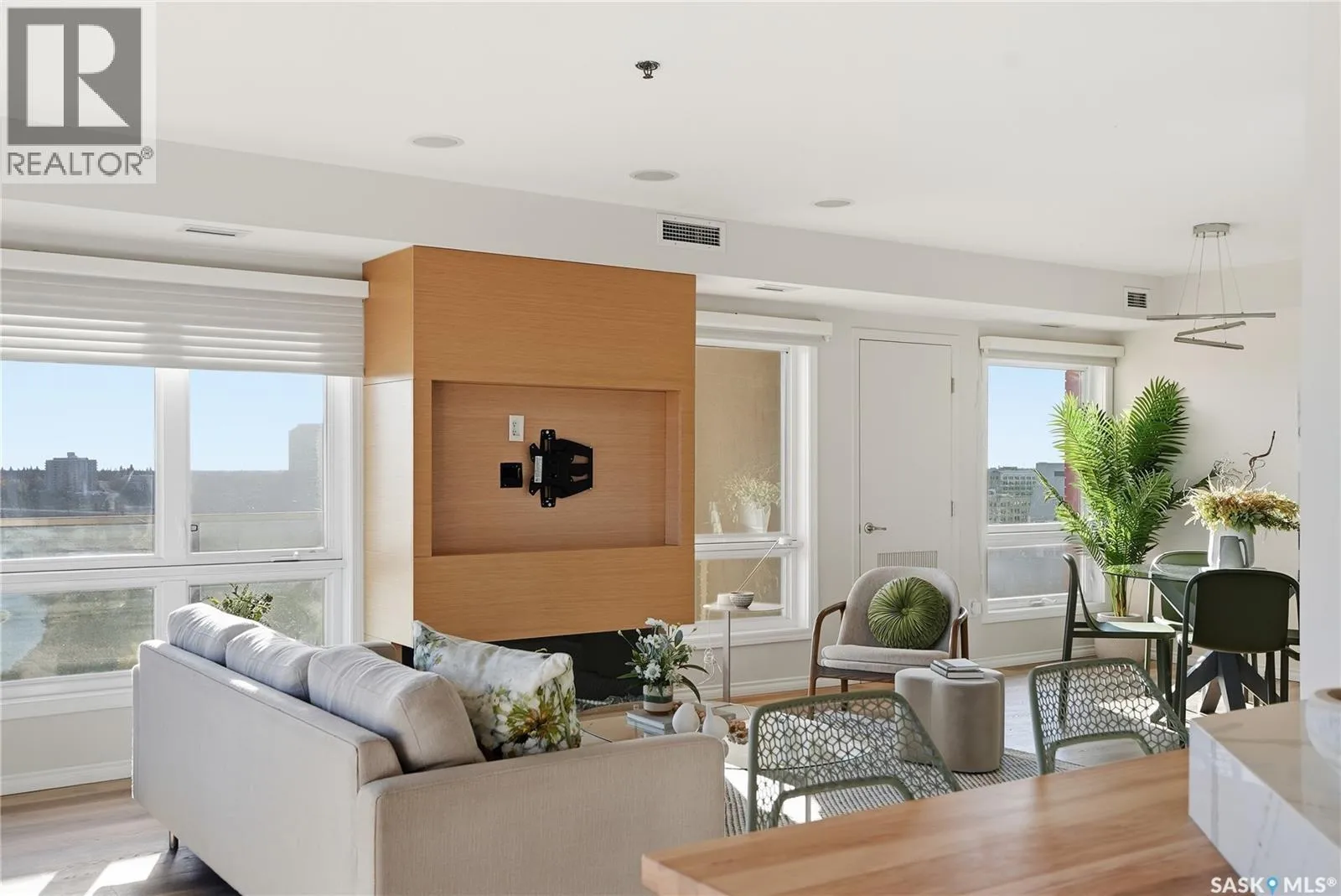 Wow! Truly a rare find! This beautiful luxury condo has it all: a million dollar view, premium upgrades, and impressive size. Since its purchase in 2018 over $140,000 in renovations have been invested. Updates include a custom kitchen, a redesigned living room with fireplace feature wall, and modern bathroom cabinetry, lighting, blinds, built in shelving in the closets, luxury vinyl floors. Enjoy unmatched south and east-facing panoramic views from the wraparound deck, complete with upgraded tile flooring and a natural gas BBQ hookup. The gorgeous living room showcases sweeping views of the South Saskatchewan River from every angle, creating a bright and peaceful atmosphere. The modern kitchen features contemporary cabinetry, stylish countertops, a functional island, and stainless steel appliances,perfectly designed for both cooking and entertaining. Every room offers breathtaking views: use the sunny corner as your home office or a relaxing sitting area.The master bedroom includes a spacious walk-in closet and a stunning three-piece ensuite with a steam shower and heated tile floors for ultimate comfort. The second bedroom features a smart built-in desk within the closet, ideal for a work-from-home setup.Additional highlights include a built-in sound system throughout the unit and balcony, one underground parking stall, and a storage unit. The fireplace, originally gas, is now electric but can easily be reconnected to gas. This well-managed, quiet concrete building is pet-friendly (with Board approval) and offers top-tier amenities: a gym, amenities/meeting room, guest suites, on-site maintenance, and garbage chutes on every floor. Located in the heart of Downtown Saskatoon, youâll enjoy front-row views of the city skyline, with walking access to the University of Saskatchewan, restaurants, hospitals, and river trails.Large windows throughout create a scenic, light-filled living experience the perfect blend of luxury, comfort, and location. (id:27476)