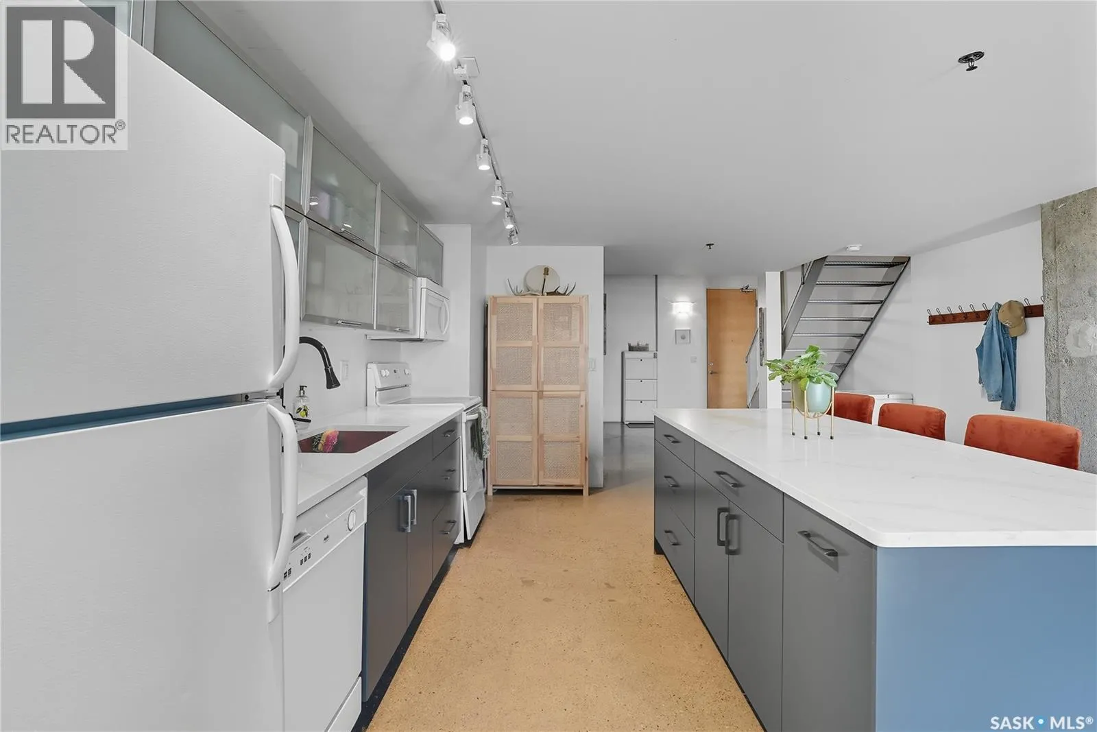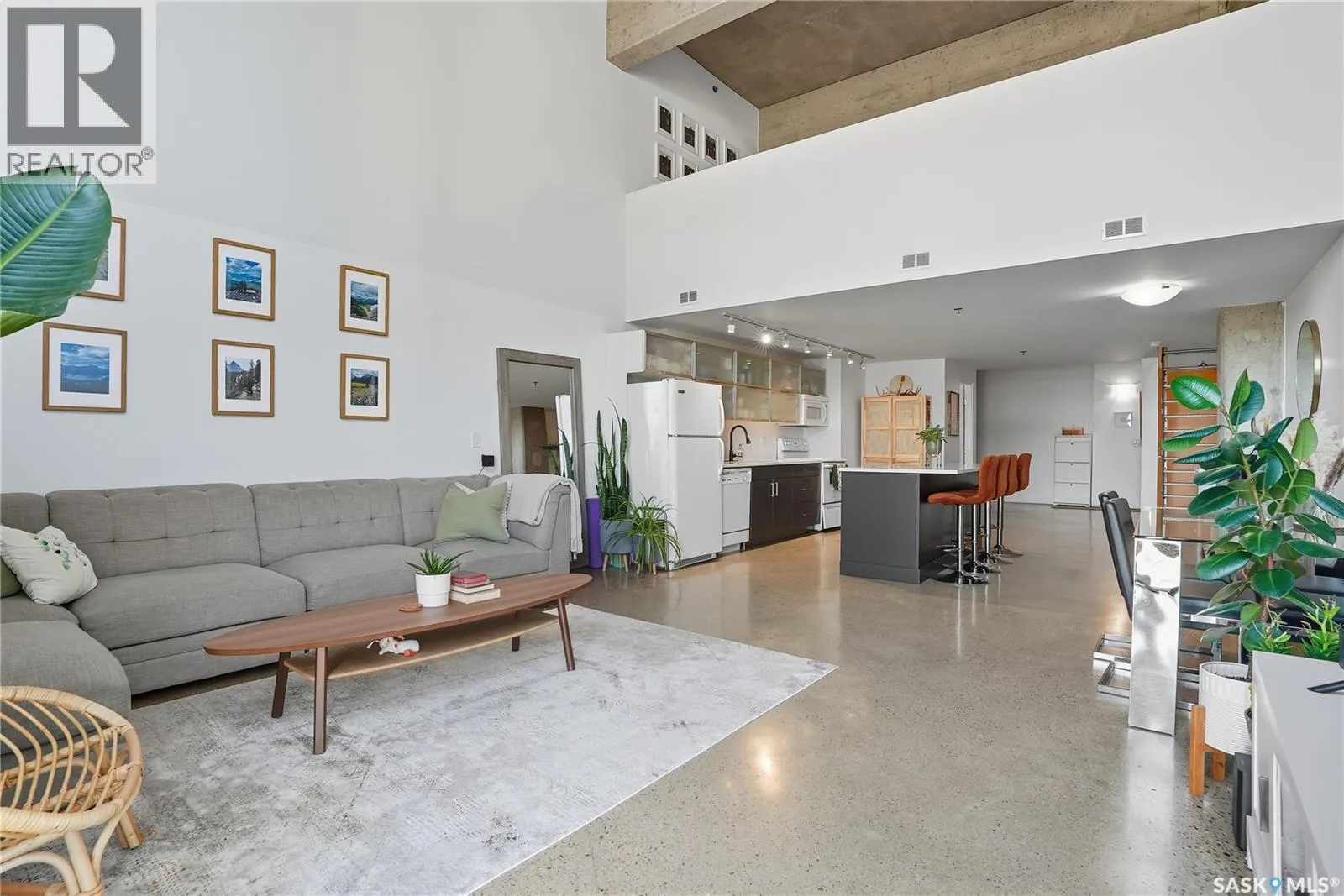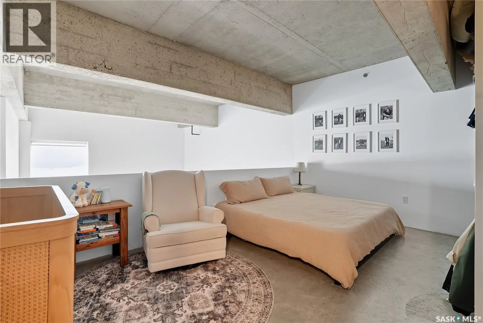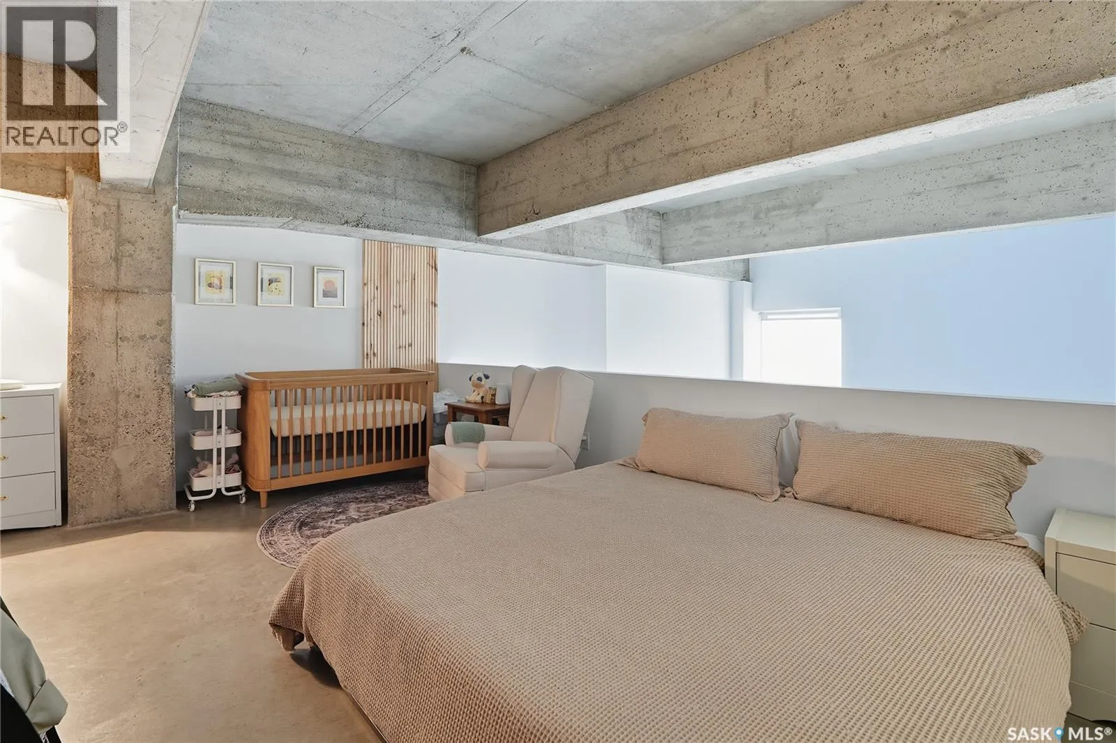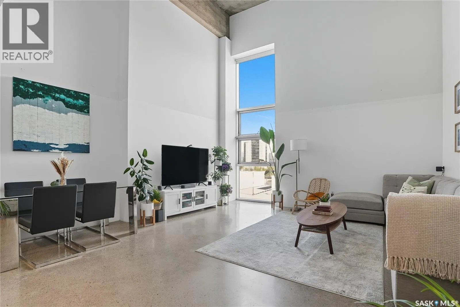 Welcome to this stunning East-facing loft located in the heart of Saskatoon's Central Business District. With 1,100 square feet of free-flowing living space, this 1-bedroom, 1.5-bath unit combines industrial charm with modern finishes, offering the perfect balance of comfort, style, and urban convenience. Soaring ceilings and a large window floods the space with natural light, enhancing the airy, open-concept layout. The kitchen has been beautifully upgraded with new quartz countertops and an oversized islandâideal for both entertaining and everyday living. The spacious living and dining areas flow effortlessly, creating a versatile space for relaxing or hosting. The large bedroom features a 4-piece ensuite, while a separate half-bath adds convenience for guests. Located directly across from the buildings fitness centre and rooftop terrace access, this unit offers unmatched access to some of the buildingâs best amenities. The building itself is a standout in downtown living, with a modern lobby, rooftop terrace complete with a pergola-covered BBQ area, fitness centre, elevator, and heated underground parking. Live just steps from some of Saskatoon's best restaurants, coffee shops, shopping, nightlife, and the riverbank. Whether you're a professional looking for a stylish downtown home or an investor seeking a high-demand location, this loft offers exceptional value and a lifestyle thatâs hard to beat. (id:27476)