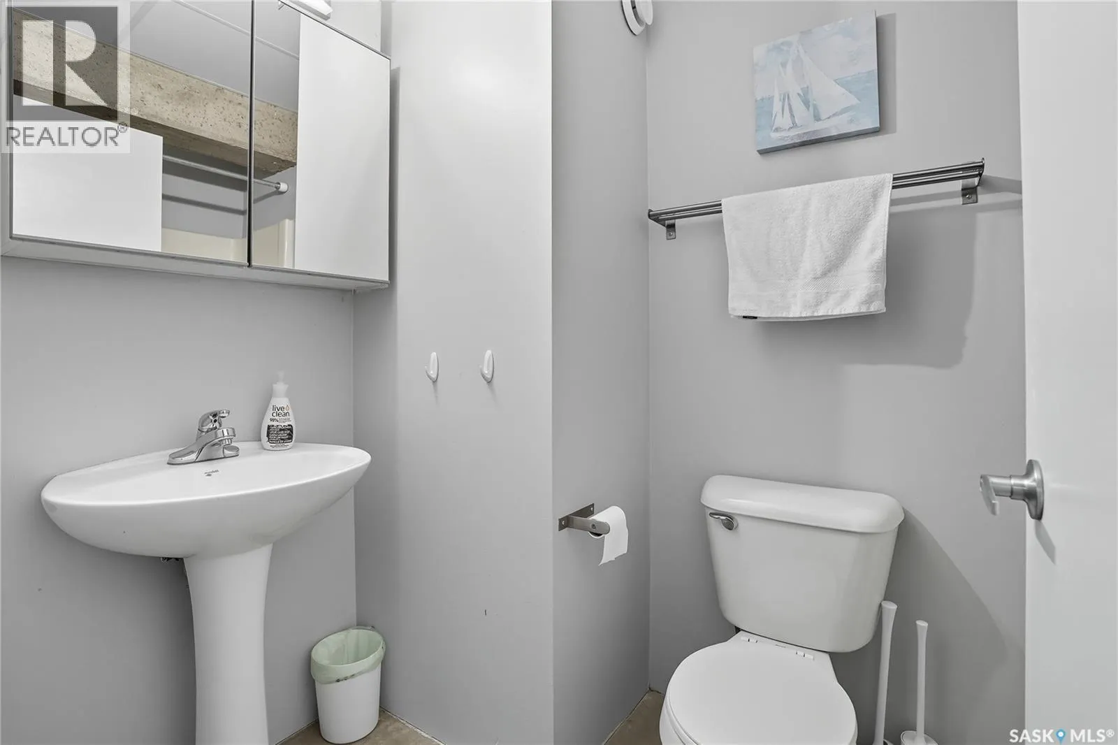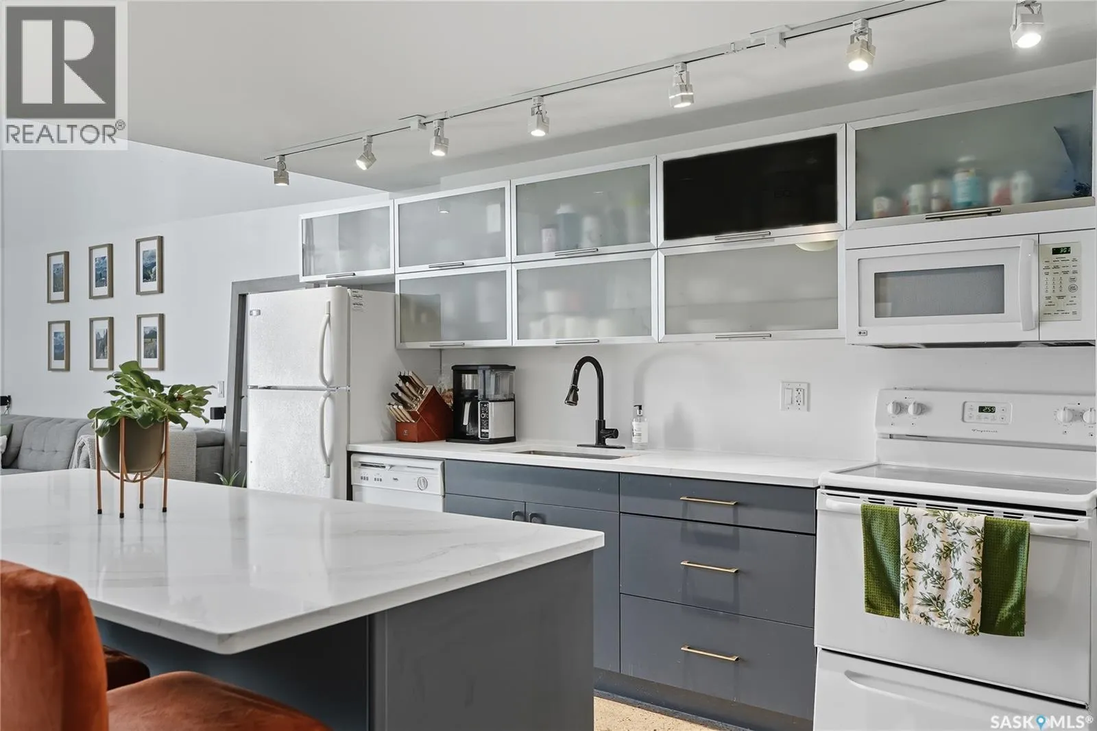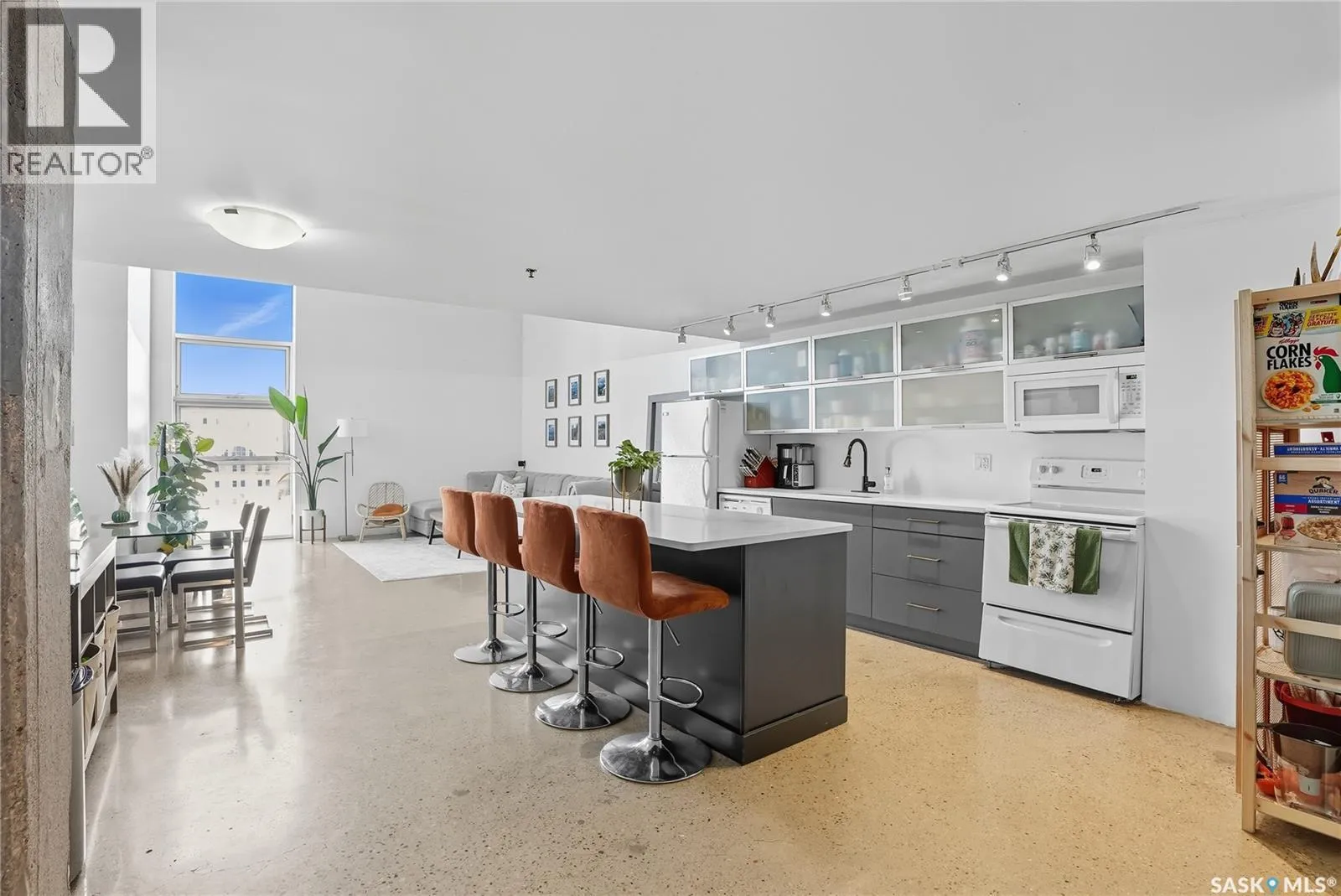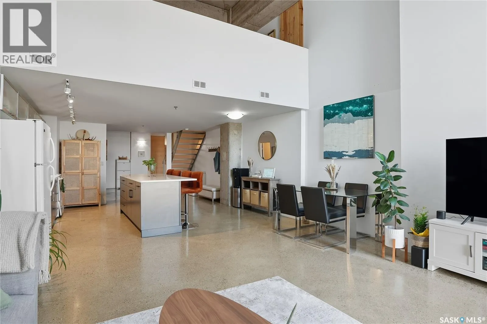 Welcome to this stunning East-facing loft located in the heart of Saskatoon's Central Business District. With 1,100 square feet of free-flowing living space, this 1-bedroom, 1.5-bath unit combines industrial charm with modern finishes, offering the perfect balance of comfort, style, and urban convenience. Soaring ceilings and a large window floods the space with natural light, enhancing the airy, open-concept layout. The kitchen has been beautifully upgraded with new quartz countertops and an oversized islandâideal for both entertaining and everyday living. The spacious living and dining areas flow effortlessly, creating a versatile space for relaxing or hosting. The large bedroom features a 4-piece ensuite, while a separate half-bath adds convenience for guests. Located directly across from the buildings fitness centre and rooftop terrace access, this unit offers unmatched access to some of the buildingâs best amenities. The building itself is a standout in downtown living, with a modern lobby, rooftop terrace complete with a pergola-covered BBQ area, fitness centre, elevator, and heated underground parking. Live just steps from some of Saskatoon's best restaurants, coffee shops, shopping, nightlife, and the riverbank. Whether you're a professional looking for a stylish downtown home or an investor seeking a high-demand location, this loft offers exceptional value and a lifestyle thatâs hard to beat. (id:27476)