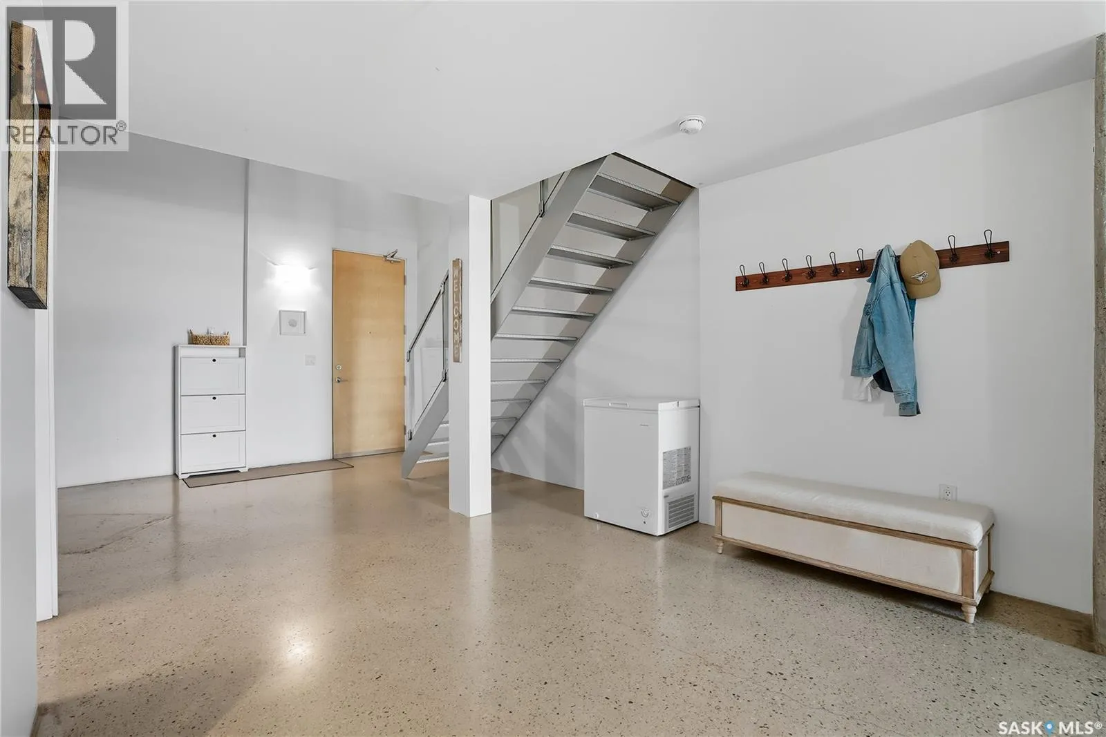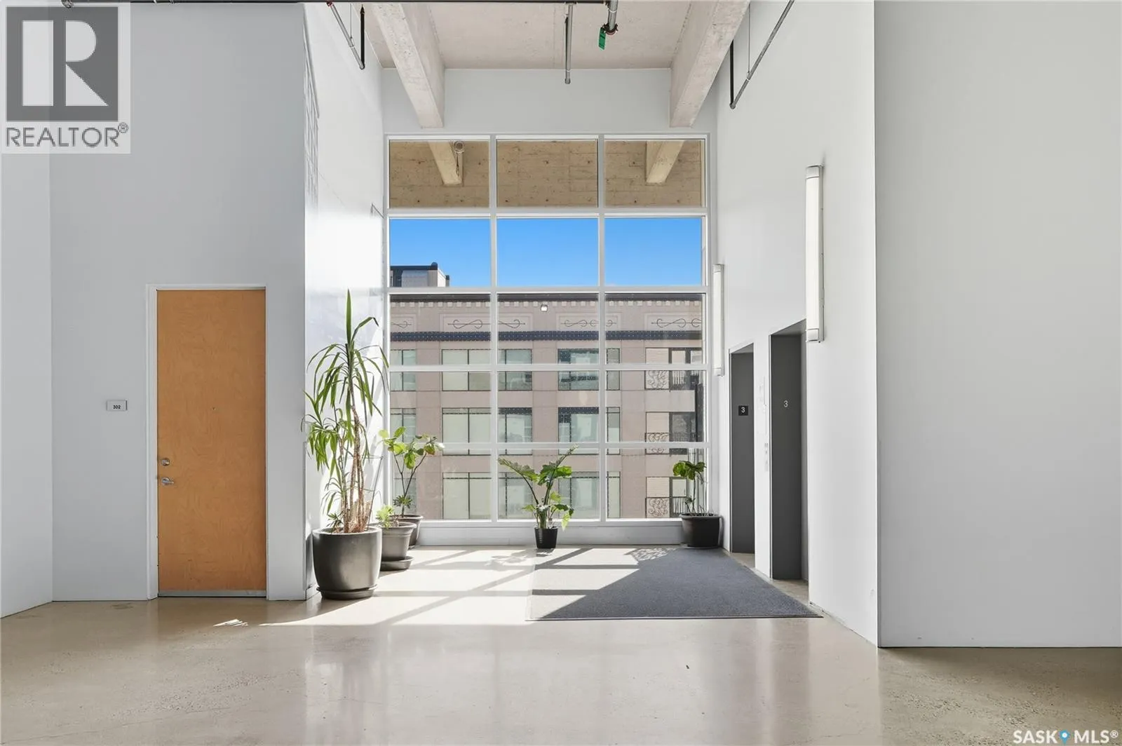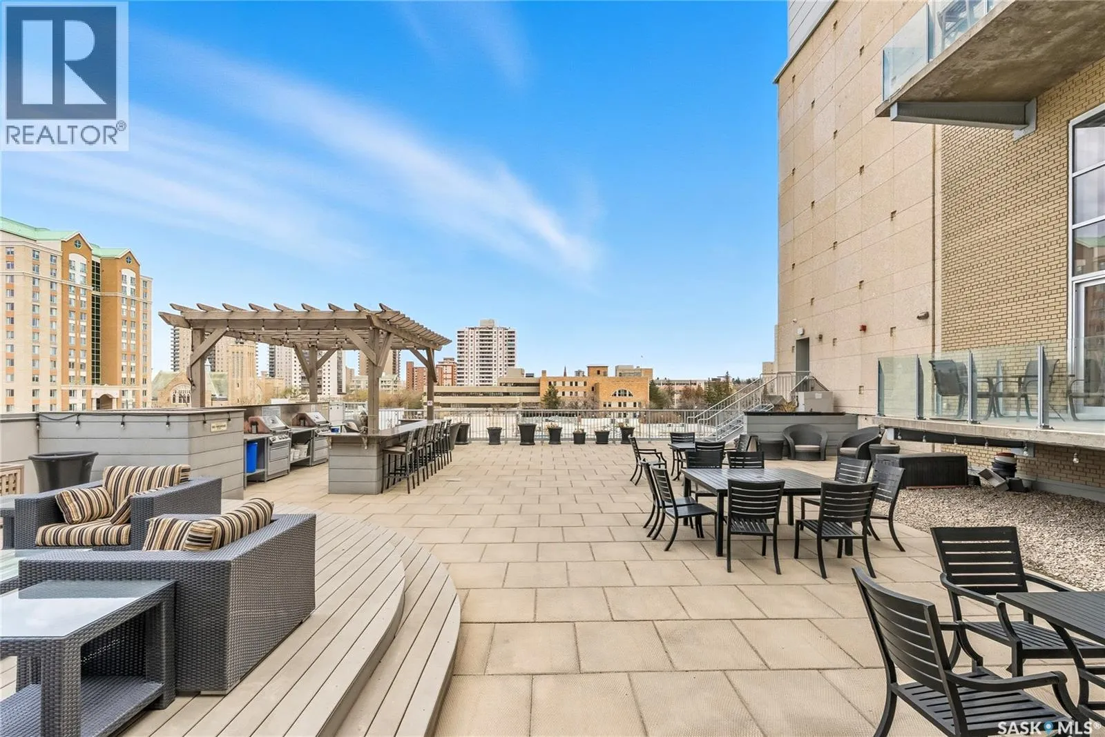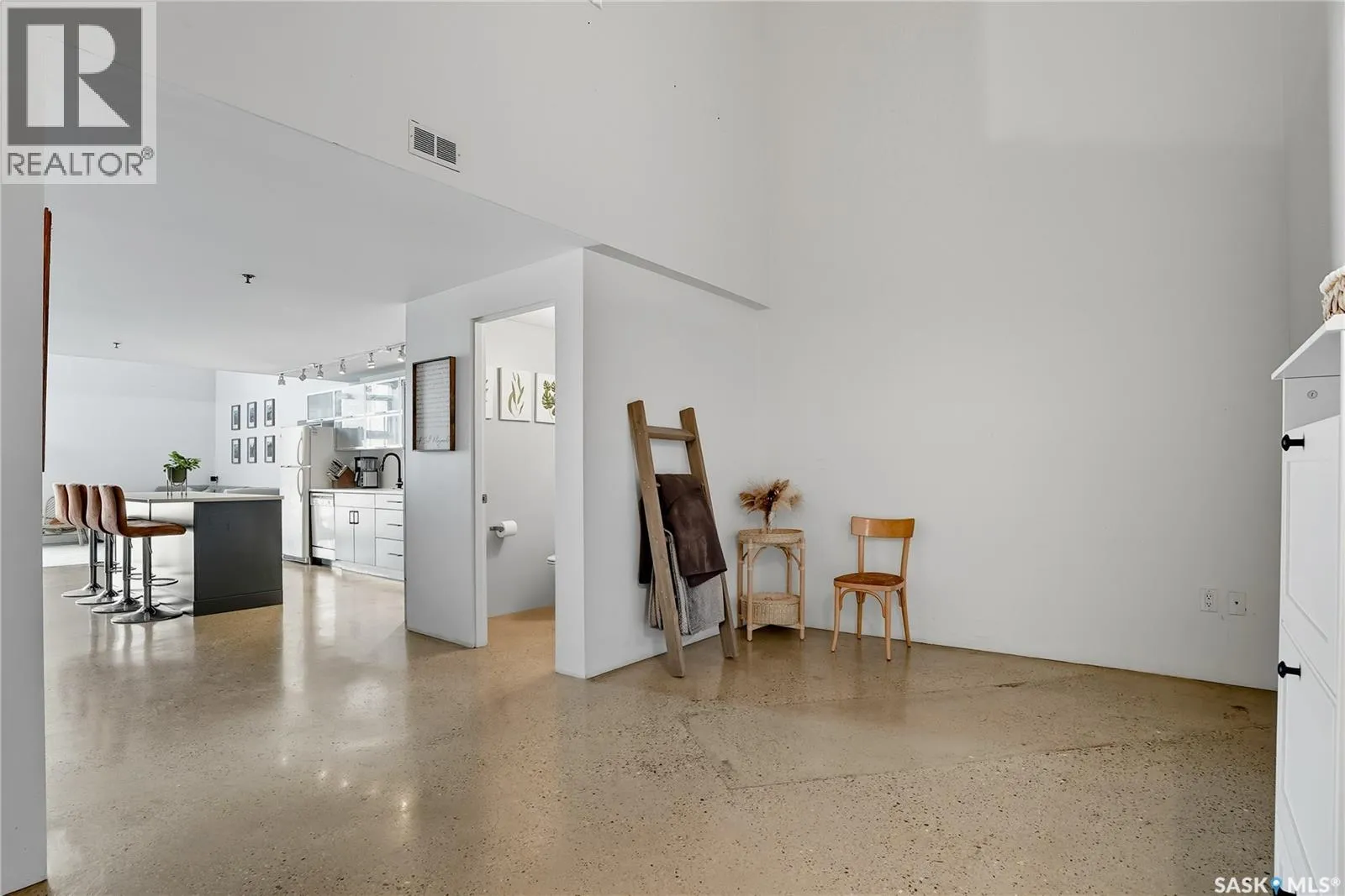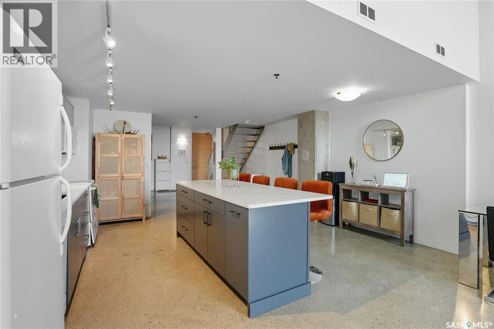 Welcome to this stunning East-facing loft located in the heart of Saskatoon's Central Business District. With 1,100 square feet of free-flowing living space, this 1-bedroom, 1.5-bath unit combines industrial charm with modern finishes, offering the perfect balance of comfort, style, and urban convenience. Soaring ceilings and a large window floods the space with natural light, enhancing the airy, open-concept layout. The kitchen has been beautifully upgraded with new quartz countertops and an oversized islandâideal for both entertaining and everyday living. The spacious living and dining areas flow effortlessly, creating a versatile space for relaxing or hosting. The large bedroom features a 4-piece ensuite, while a separate half-bath adds convenience for guests. Located directly across from the buildings fitness centre and rooftop terrace access, this unit offers unmatched access to some of the buildingâs best amenities. The building itself is a standout in downtown living, with a modern lobby, rooftop terrace complete with a pergola-covered BBQ area, fitness centre, elevator, and heated underground parking. Live just steps from some of Saskatoon's best restaurants, coffee shops, shopping, nightlife, and the riverbank. Whether you're a professional looking for a stylish downtown home or an investor seeking a high-demand location, this loft offers exceptional value and a lifestyle thatâs hard to beat. (id:27476)