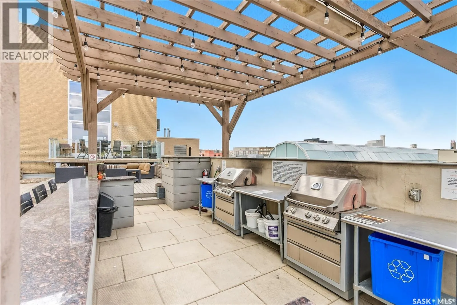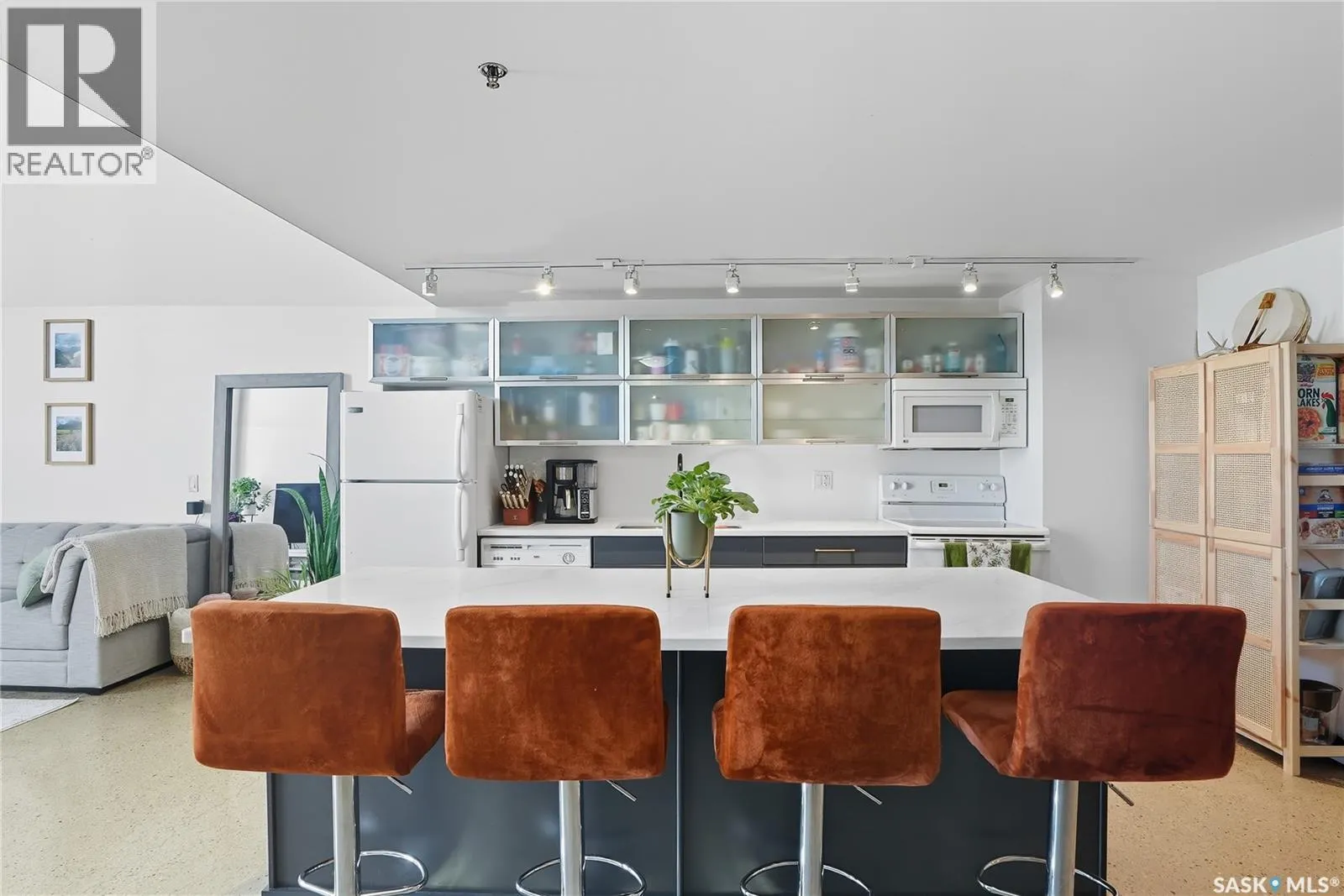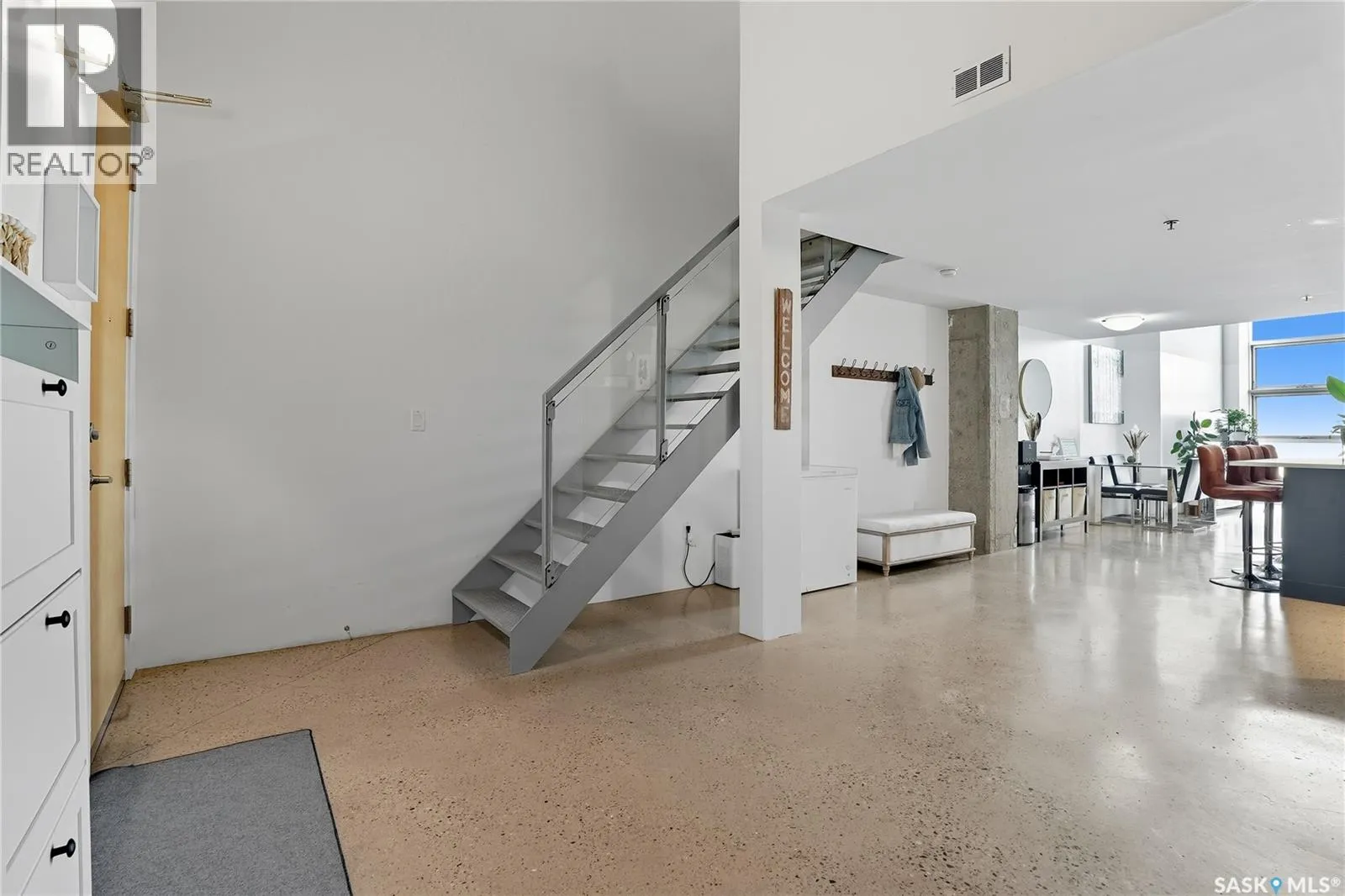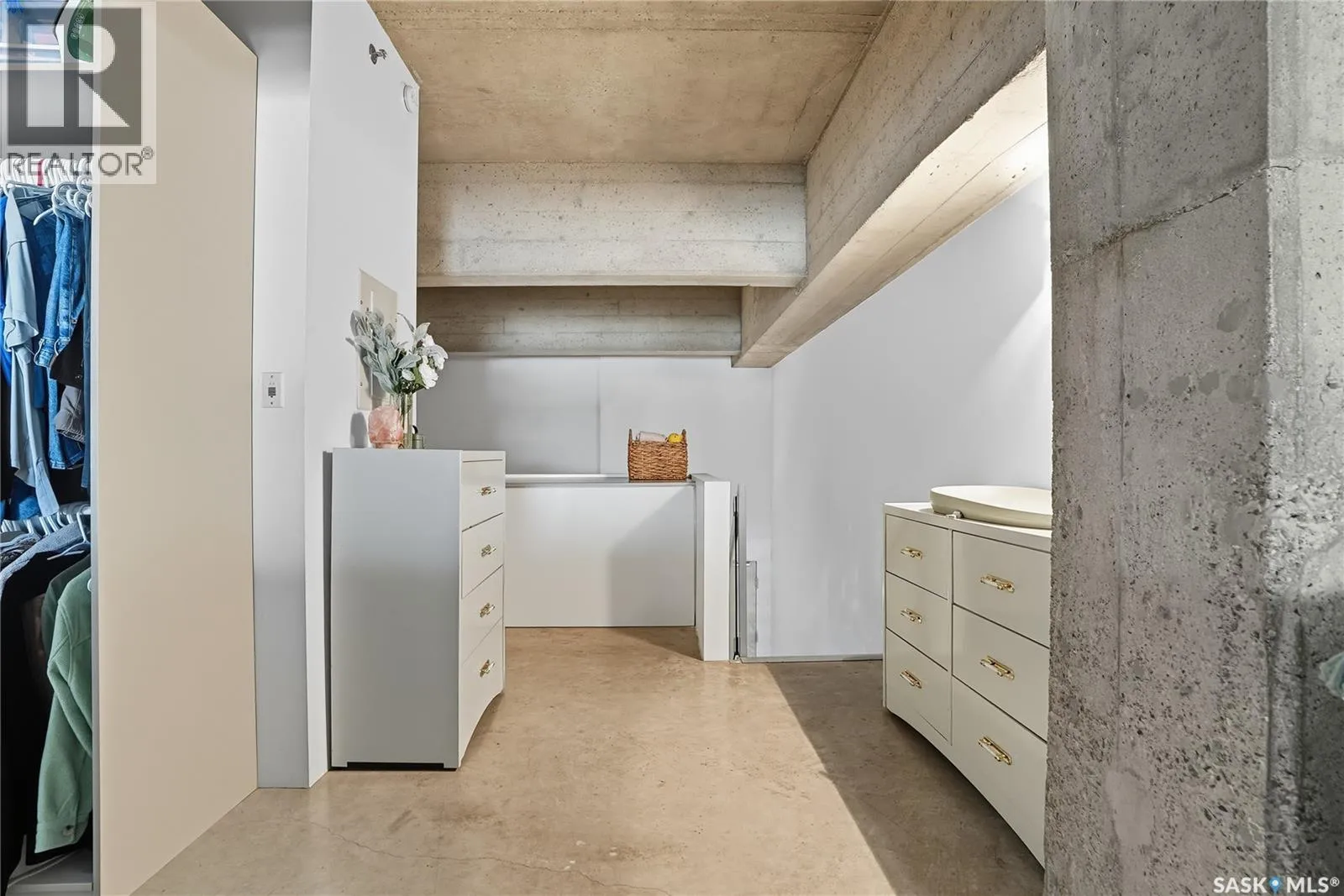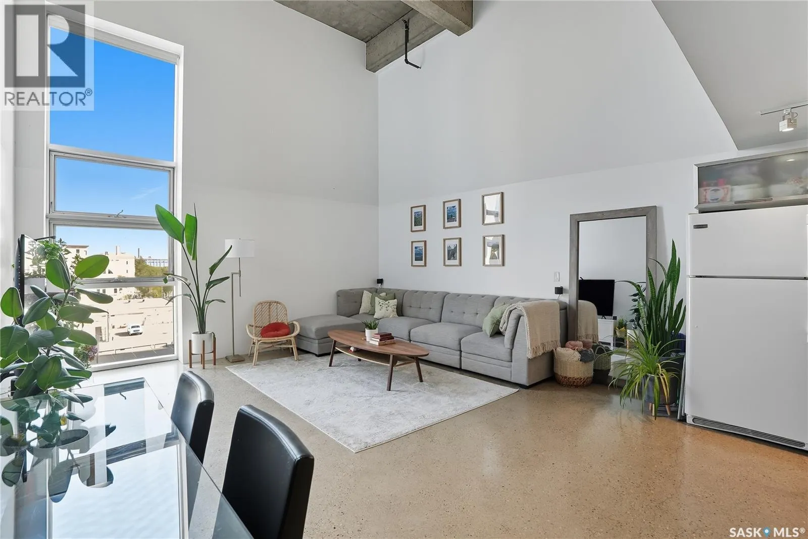 Welcome to this stunning East-facing loft located in the heart of Saskatoon's Central Business District. With 1,100 square feet of free-flowing living space, this 1-bedroom, 1.5-bath unit combines industrial charm with modern finishes, offering the perfect balance of comfort, style, and urban convenience. Soaring ceilings and a large window floods the space with natural light, enhancing the airy, open-concept layout. The kitchen has been beautifully upgraded with new quartz countertops and an oversized islandâideal for both entertaining and everyday living. The spacious living and dining areas flow effortlessly, creating a versatile space for relaxing or hosting. The large bedroom features a 4-piece ensuite, while a separate half-bath adds convenience for guests. Located directly across from the buildings fitness centre and rooftop terrace access, this unit offers unmatched access to some of the buildingâs best amenities. The building itself is a standout in downtown living, with a modern lobby, rooftop terrace complete with a pergola-covered BBQ area, fitness centre, elevator, and heated underground parking. Live just steps from some of Saskatoon's best restaurants, coffee shops, shopping, nightlife, and the riverbank. Whether you're a professional looking for a stylish downtown home or an investor seeking a high-demand location, this loft offers exceptional value and a lifestyle thatâs hard to beat. (id:27476)