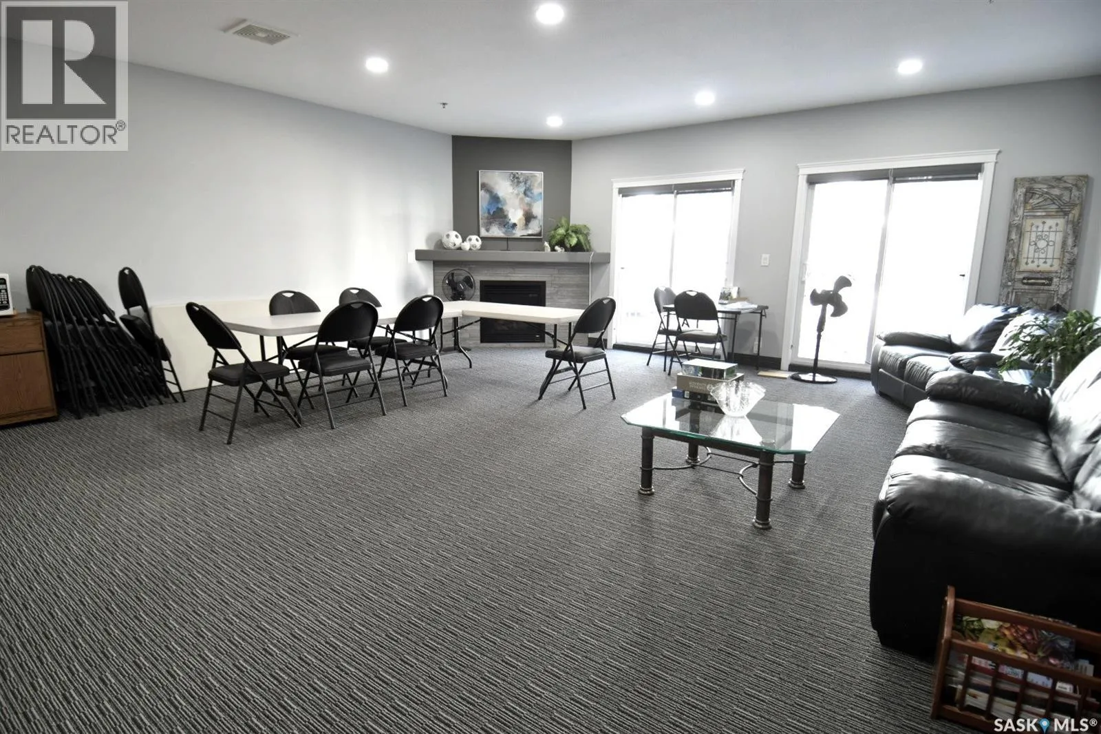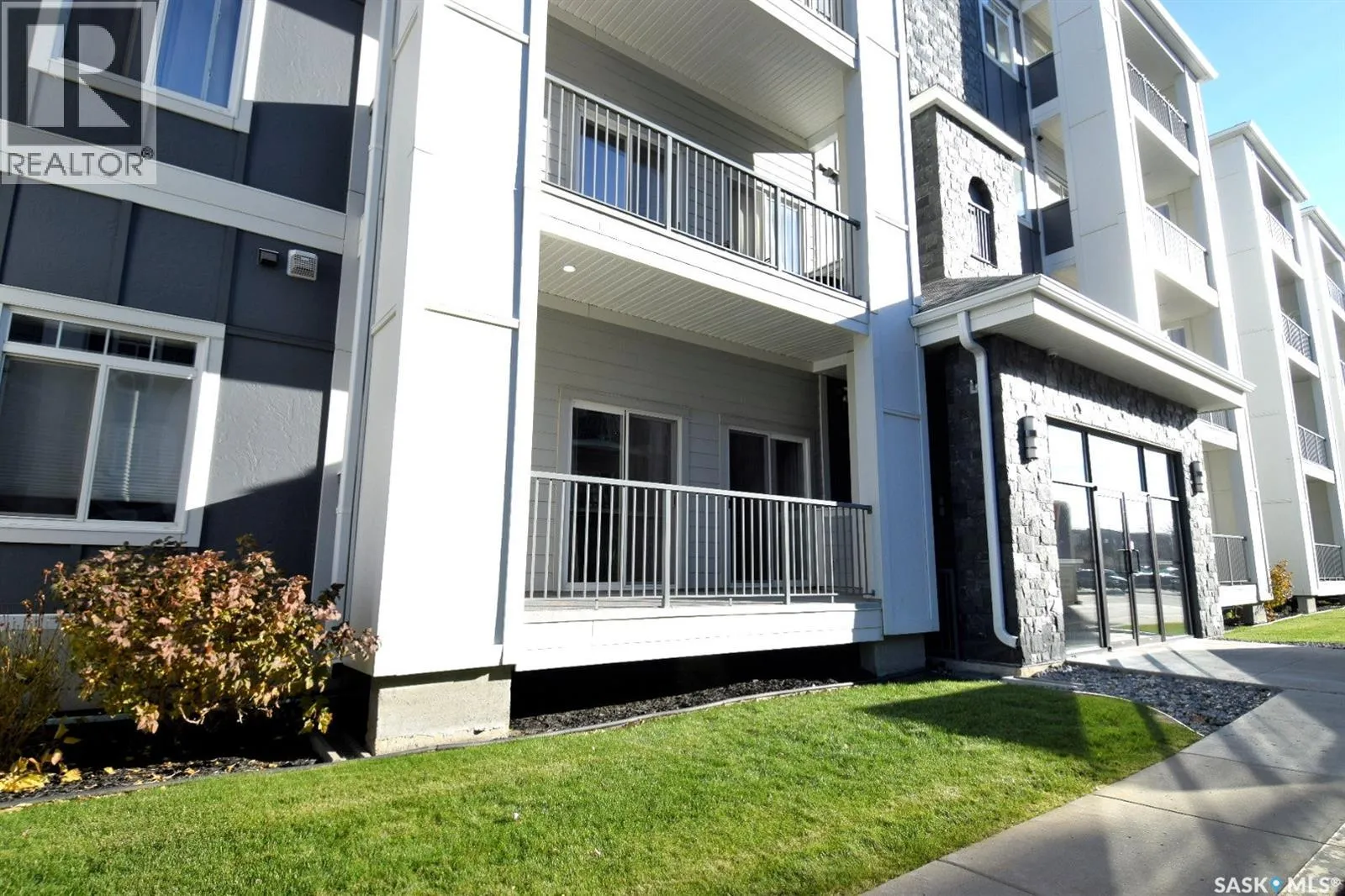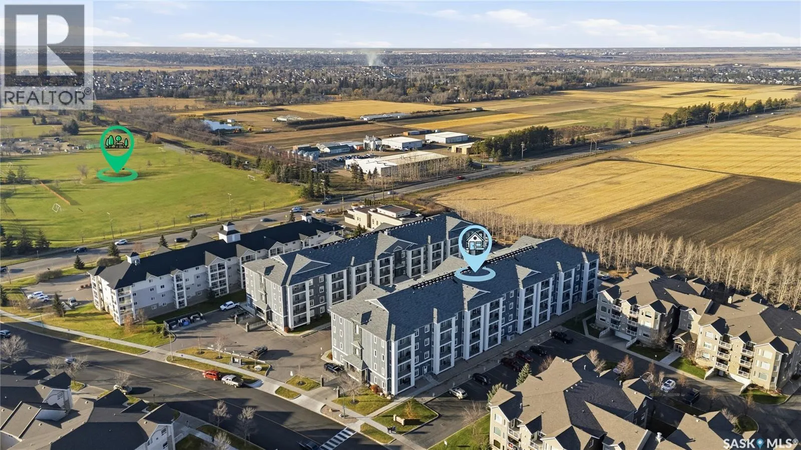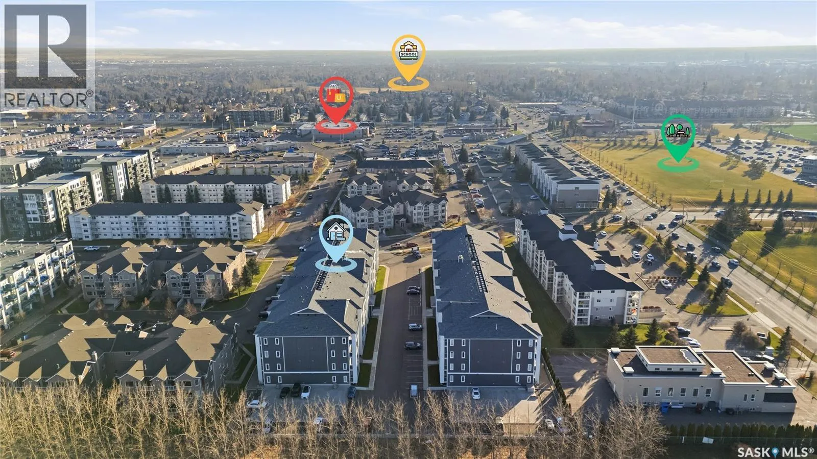 Welcome to convenience and comfort in Saskatoon's coveted University Heights subdivision! Boasting an exceptional Walk Score of 77, this location is truly designed for a friendly, walkable lifestyle, placing every amenity right at your doorstep. Groceries, dining, medical services, banks, parks, walking paths, the public library, and public transit are all just steps away. This super-clean, main-floor condo offers an economical home without sacrificing prized features. Located near the front entrance, access is effortless via a short flight of stairs or the building's elevator. Inside, you'll discover a bright, open-concept floor plan linking the kitchen, dining, and living areas seamlessly. The feeling of space is amplified by 9-foot ceilings, fresh designer paint, and a few new and contemporary light fixtures. In-floor radiant heat and central air-conditioning provide comfort. Step through the patio doors onto your large covered balcony, featuring a convenient natural gas hookup for easy barbecuing. The full bathroom is easily accessible and sits adjacent to the spacious bedroom, which also provides direct access to the deck. A generous laundry room provides ample space for extra storage or can be easily used as a dedicated private home office area. This project offers truly amazing value-added features, including a community meeting room and a well-equipped exercise room. Best of all? Enjoy the dedicated car wash bay on-site, after which you can move to your exclusive heated underground parking spot to let your vehicle dry, protected from the elements. Your private storage locker is conveniently located in front of your parking space, perfect for bikes and seasonal gear. Visitor parking is abundant, and street parking is available for a second vehicle. For anyone seeking a modern, low-maintenance home with an abundance of prized features and an unbeatable location, this suite checks every box. Call today for your private showing! (id:27476)
