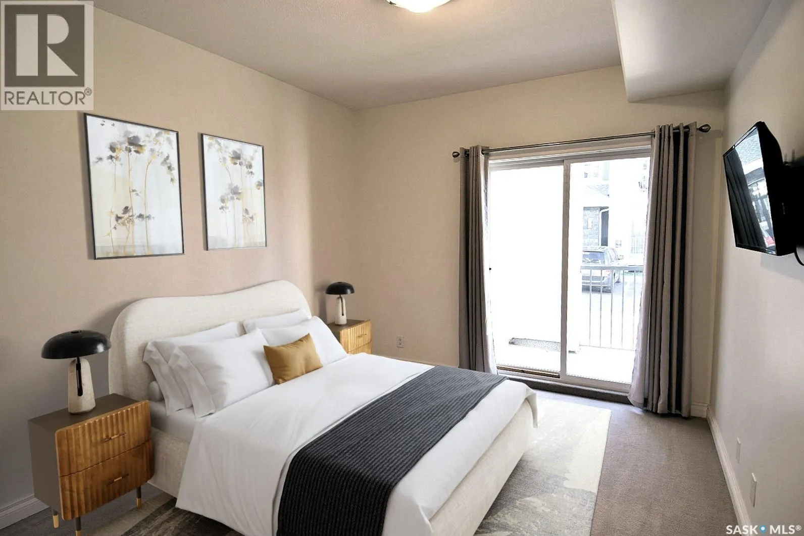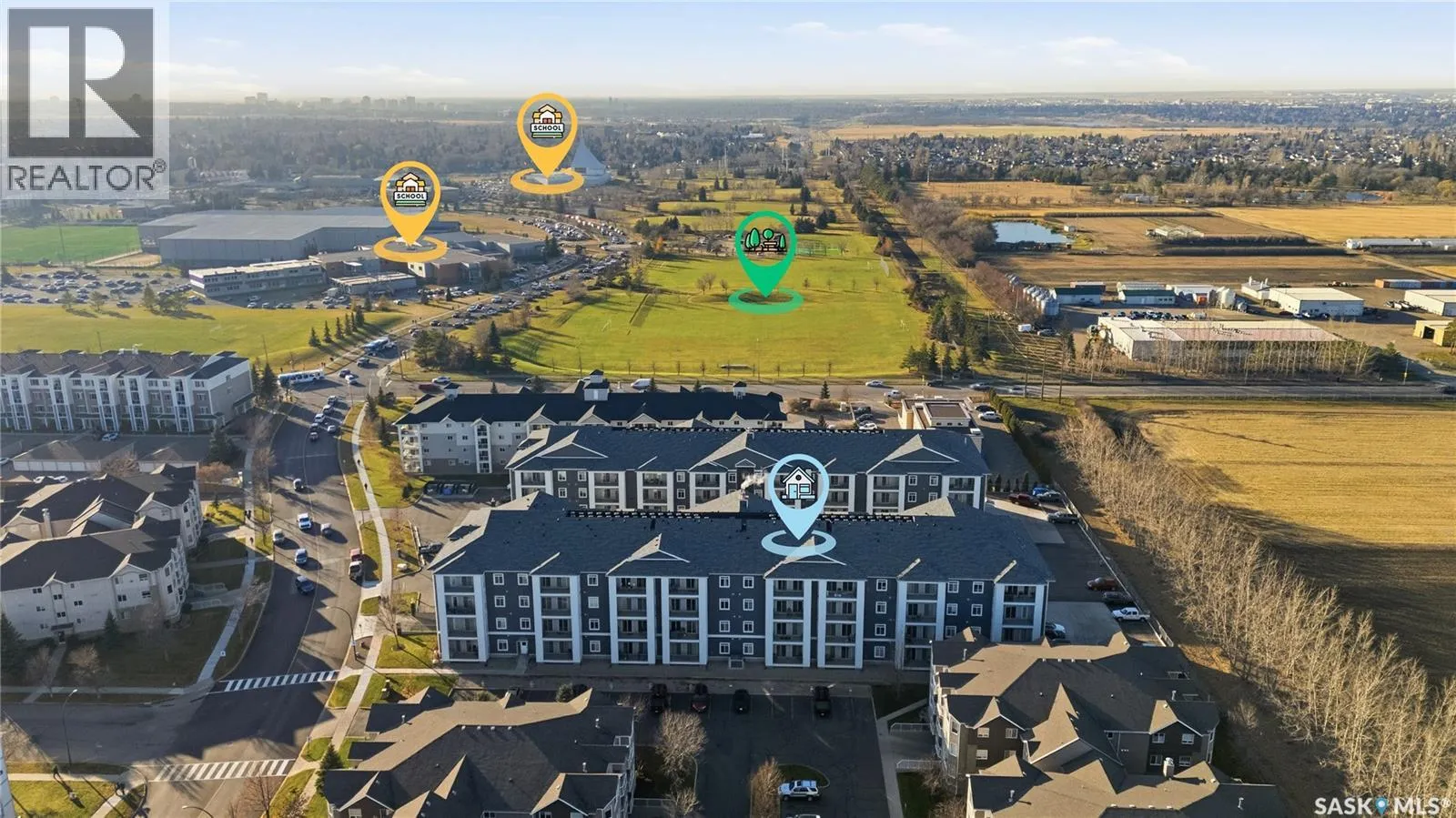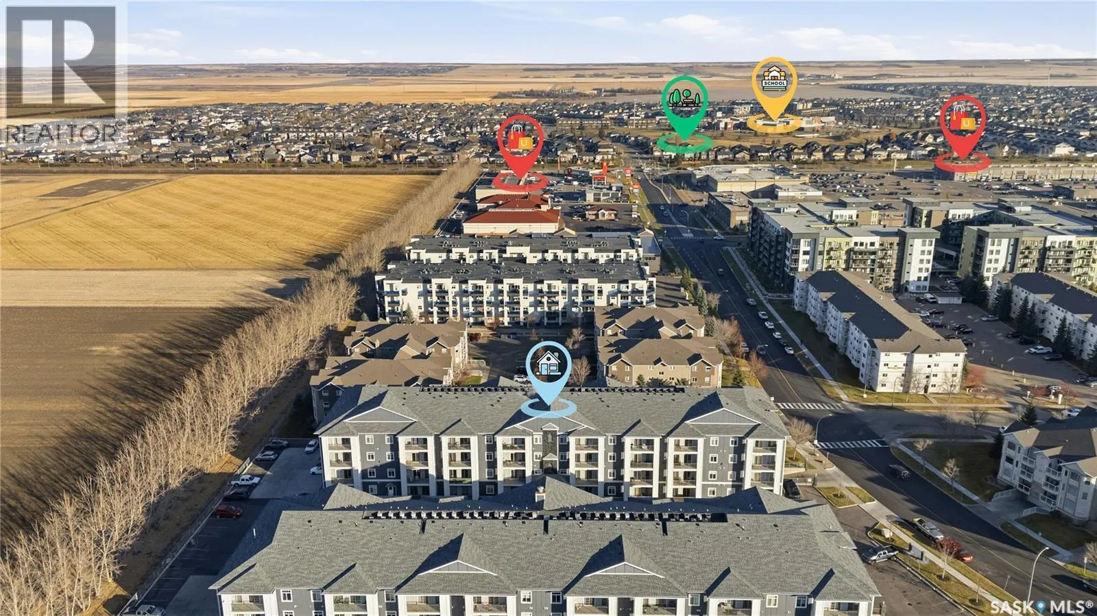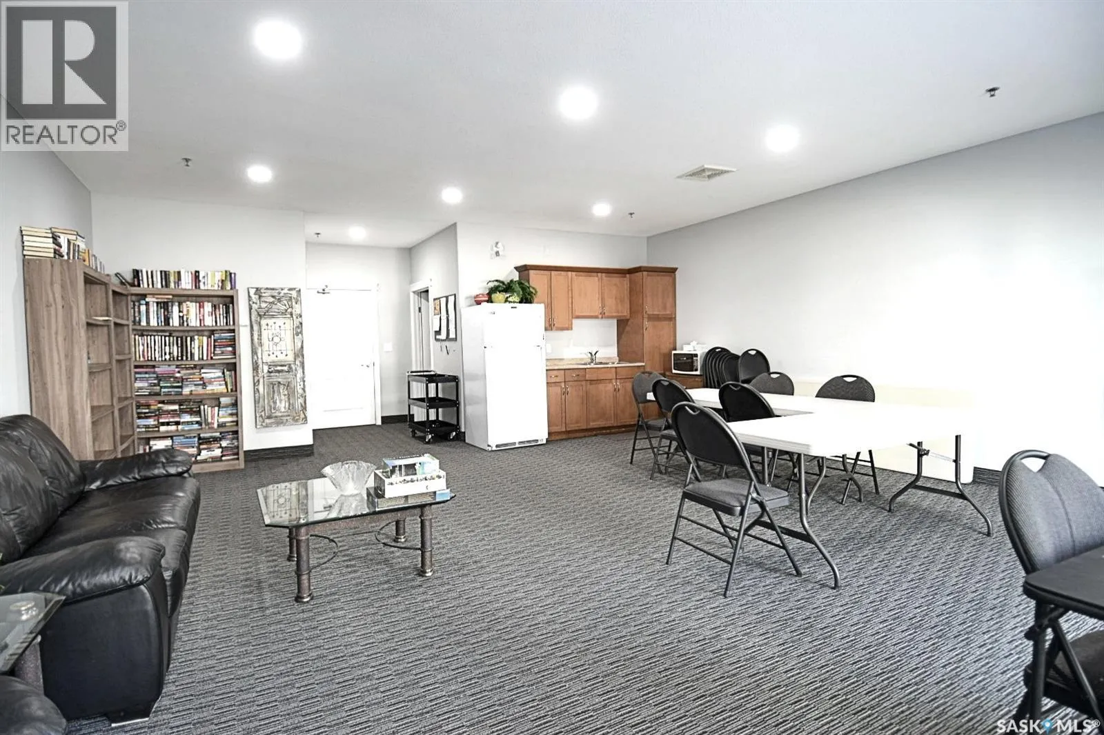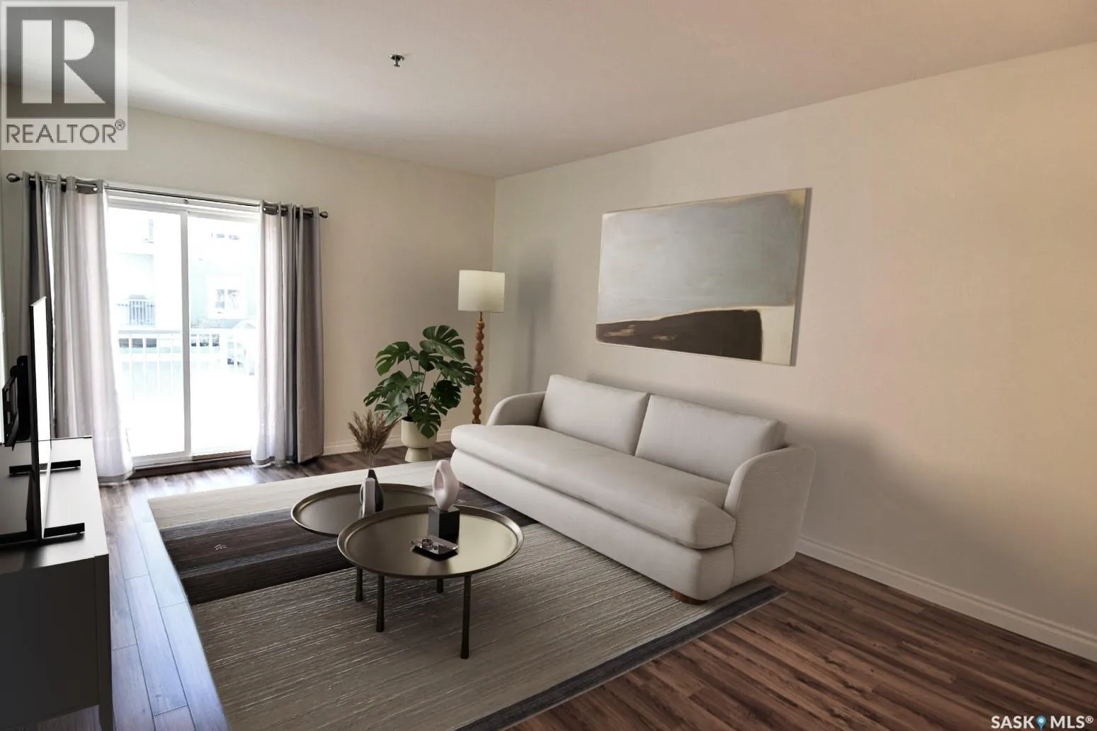 Welcome to convenience and comfort in Saskatoon's coveted University Heights subdivision! Boasting an exceptional Walk Score of 77, this location is truly designed for a friendly, walkable lifestyle, placing every amenity right at your doorstep. Groceries, dining, medical services, banks, parks, walking paths, the public library, and public transit are all just steps away. This super-clean, main-floor condo offers an economical home without sacrificing prized features. Located near the front entrance, access is effortless via a short flight of stairs or the building's elevator. Inside, you'll discover a bright, open-concept floor plan linking the kitchen, dining, and living areas seamlessly. The feeling of space is amplified by 9-foot ceilings, fresh designer paint, and a few new and contemporary light fixtures. In-floor radiant heat and central air-conditioning provide comfort. Step through the patio doors onto your large covered balcony, featuring a convenient natural gas hookup for easy barbecuing. The full bathroom is easily accessible and sits adjacent to the spacious bedroom, which also provides direct access to the deck. A generous laundry room provides ample space for extra storage or can be easily used as a dedicated private home office area. This project offers truly amazing value-added features, including a community meeting room and a well-equipped exercise room. Best of all? Enjoy the dedicated car wash bay on-site, after which you can move to your exclusive heated underground parking spot to let your vehicle dry, protected from the elements. Your private storage locker is conveniently located in front of your parking space, perfect for bikes and seasonal gear. Visitor parking is abundant, and street parking is available for a second vehicle. For anyone seeking a modern, low-maintenance home with an abundance of prized features and an unbeatable location, this suite checks every box. Call today for your private showing! (id:27476)