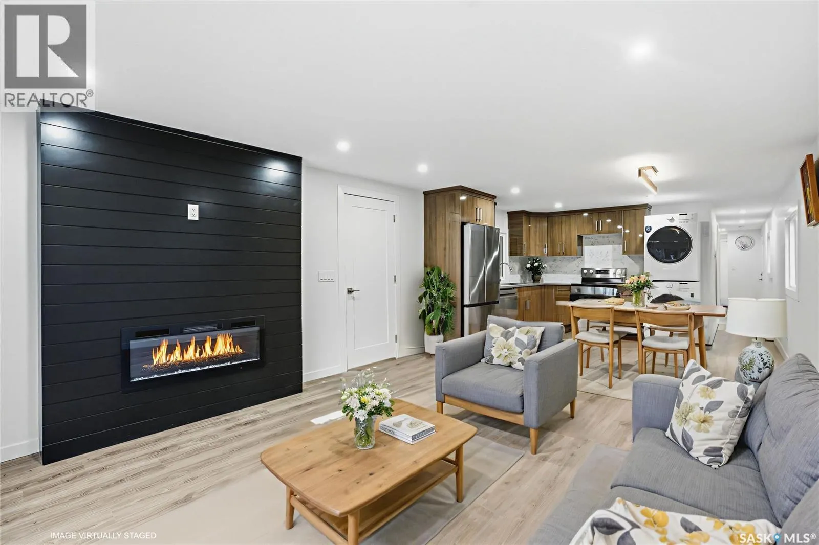 A backyard that feels like your own private park! This beautifully renovated mobile home sits on one of the best lots in the entire community, backing directly onto green space, ball diamonds, and a gorgeous park setting. Itâs rare to find this much space and privacy on Saskatoonâs east side, especially at this price point. Inside, youâll find over 1,200 sq. ft. of bright, modern living space thatâs been updated from top to bottom. Everythingâs been done â from the newer furnace, air conditioner, and windows to the sleek kitchen with quartz counters, tile backsplash, soft-close cabinets, and stainless steel appliances. The open layout feels warm and welcoming with luxury vinyl plank flooring, pot lighting, and a cozy electric fireplace that ties it all together. Thereâs also an oversized family room, perfect for an office, playroom, or extra lounge space. The main bathroom features dual sinks and the primary bedroom has a stylish feature wall that adds character. Outside, enjoy two new decks â one for morning coffee, one for evening BBQs â and a yard so big it honestly feels like your own park. Lot fees cover water, sewer, snow removal, garbage pick-up, and park maintenance, so you can just move in and enjoy. If youâre looking for something move-in ready with unbeatable space, style, and location, this is a must-see. Homes like this â especially with a yard like that â donât come around often! (id:27476)