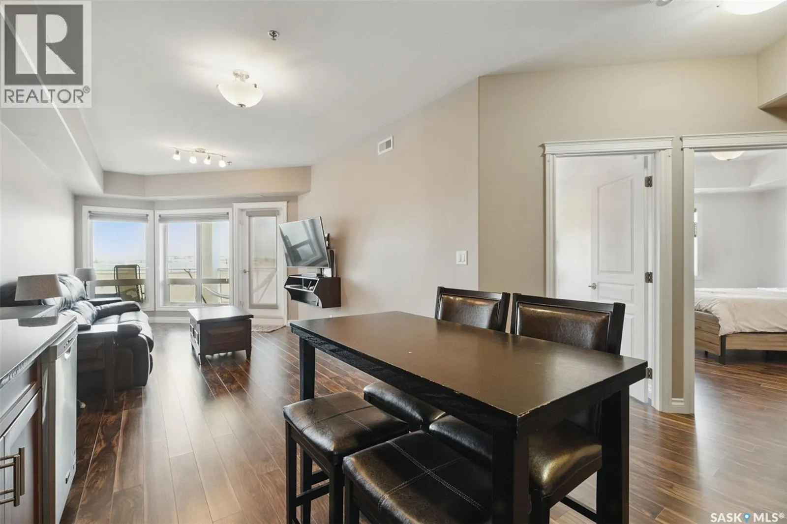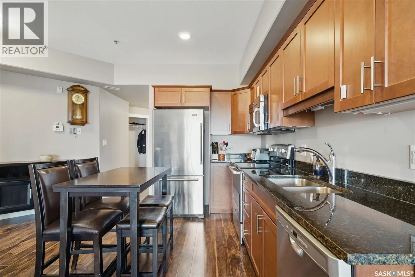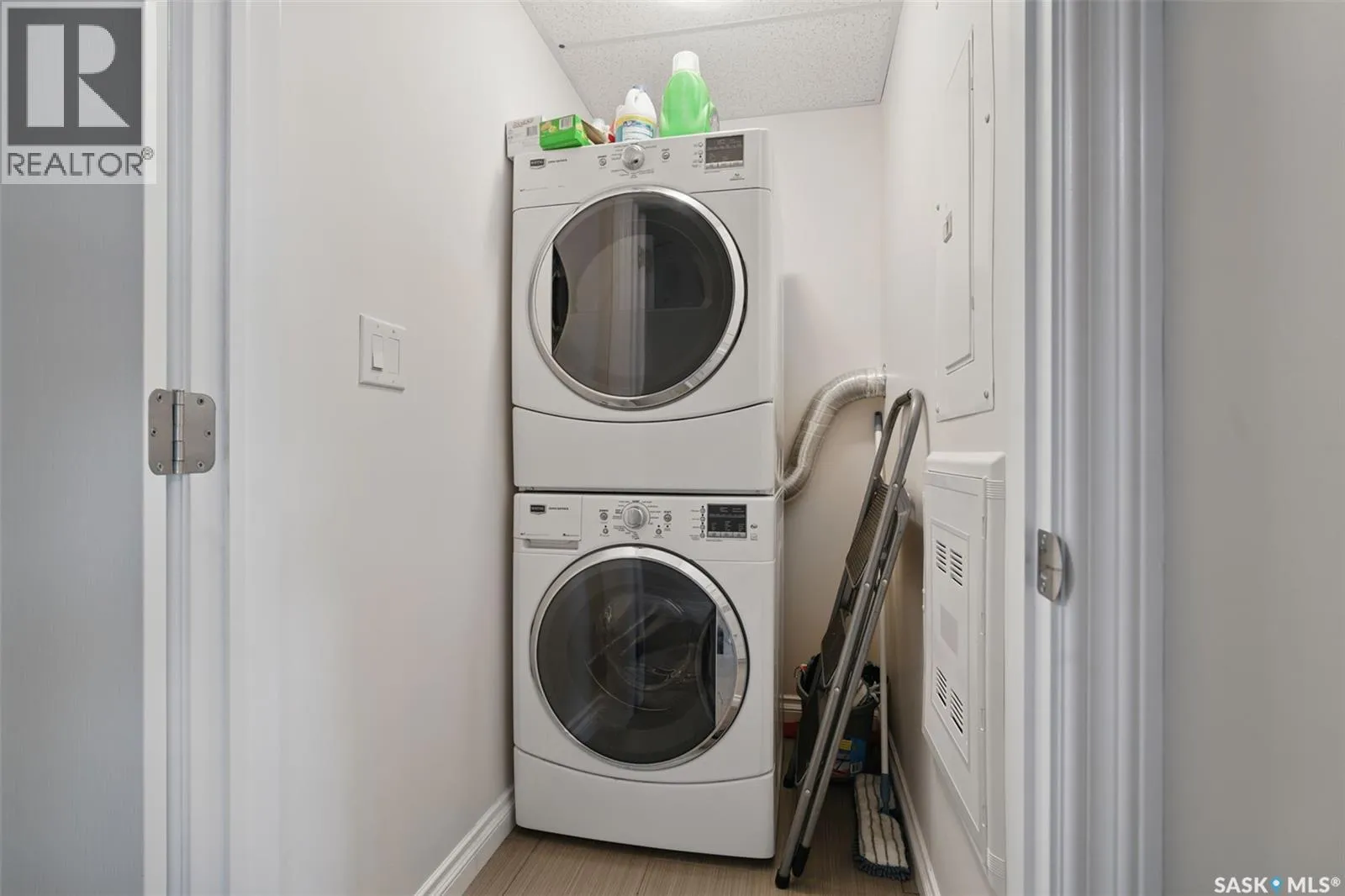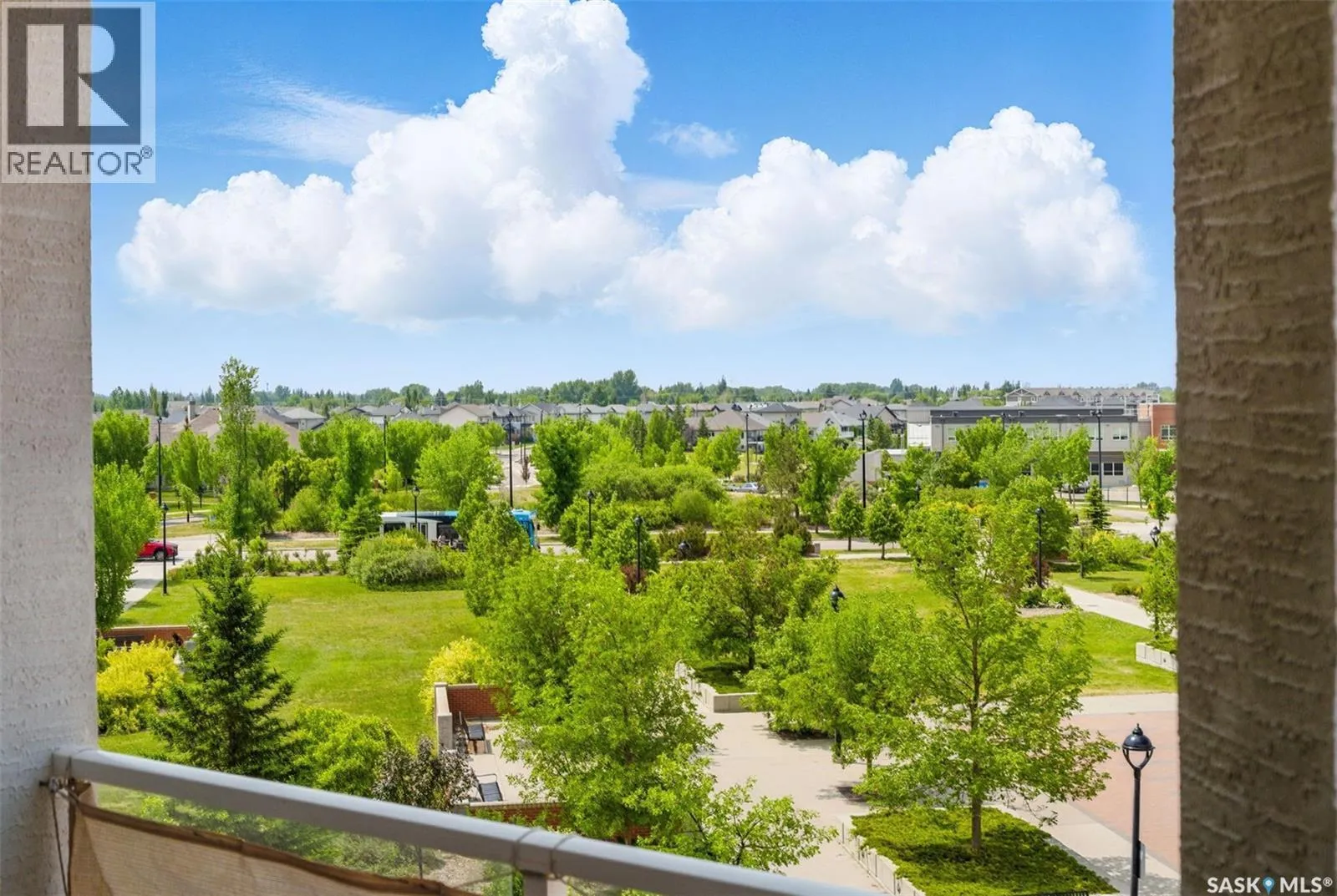 Experience top-floor living in this exceptional, west-facing, 2-bedroom, 2-bathroom condo, perfectly situated in the highly desirable neighbourhood of Willowgrove. This unitâs features include a spacious and modern open concept with 9-foot ceilings that create an airy and expansive feel, granite countertops, stainless steel appliances, easy-to-care-for tile and laminate flooring, and Hunter Douglas blinds throughout. Enjoy the convenience and security of one underground parking stall, ensuring your vehicle is safe from the elements and ready to roll, saving you time and effort during the coldest of winters. The underground storage locker is perfect for storing your bikes and other gear. An abundance of visitor parking spots ensures your guests always have a place to park. For those who appreciate privacy, step outside and enjoy a 120-square-foot balcony that is afternoon and evening sunned. Relax and unwind on the largest balcony that the building offers with a tranquil view of the clock-square green space below and an unobstructed panorama of the skyline aboveâa perfect spot for your morning coffee or evening relaxation. The location is a true highlight. You'll find yourself within easy walking distance of a variety of grocery stores, banks, restaurants, and medical offices. With a bus stop right outside the building and a new daycare nearing completion across the street, this condo is a fantastic fit for both U of S students and small families seeking convenience and accessibility. Pets allowed with board approval. This condo truly has it all. Book your private showing today and discover your new home. (id:27476)