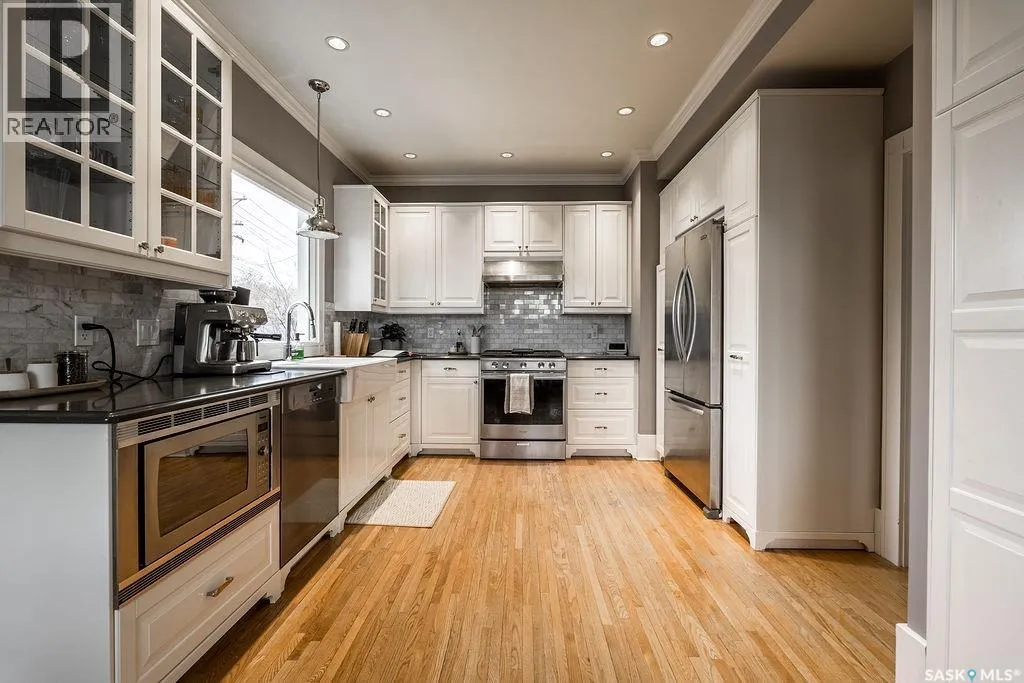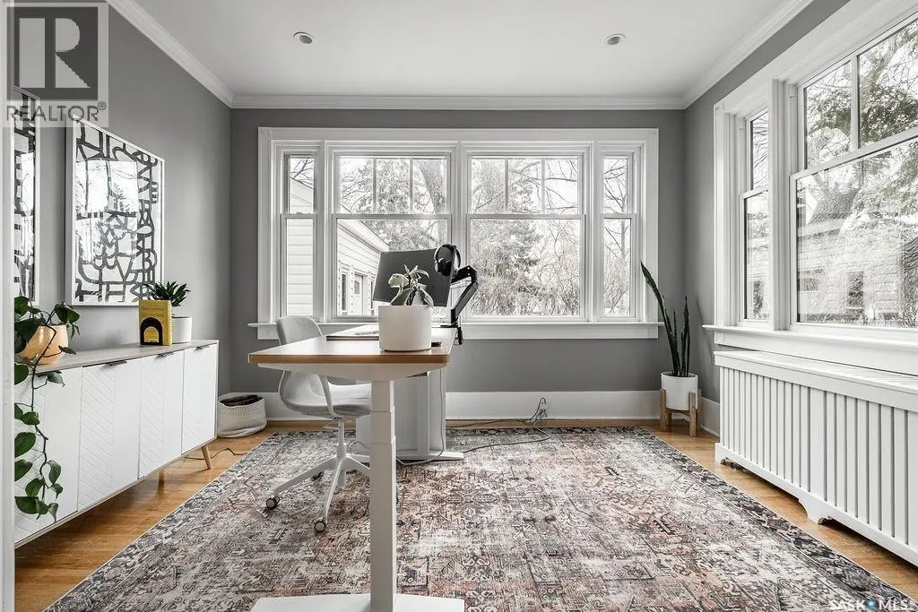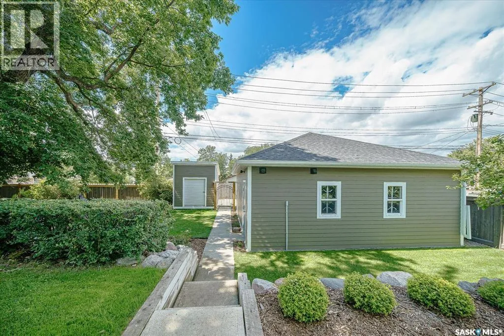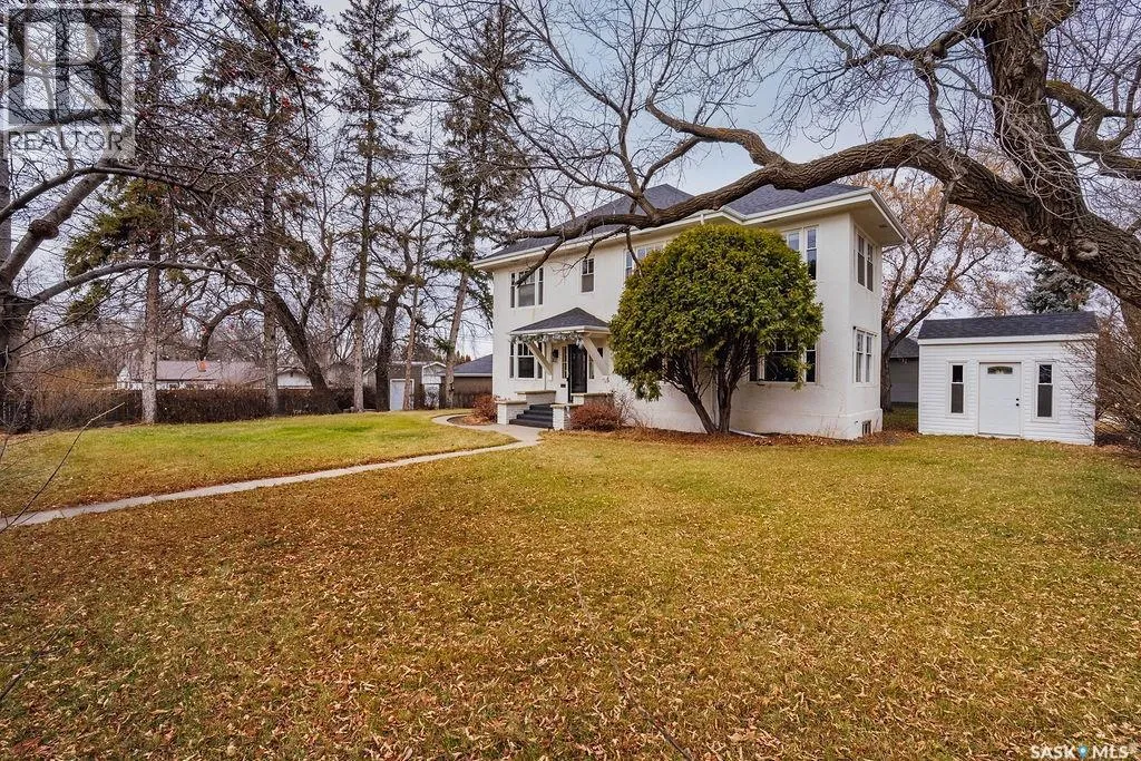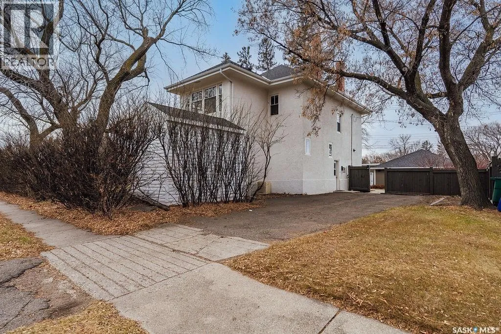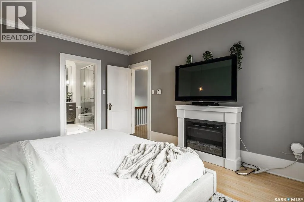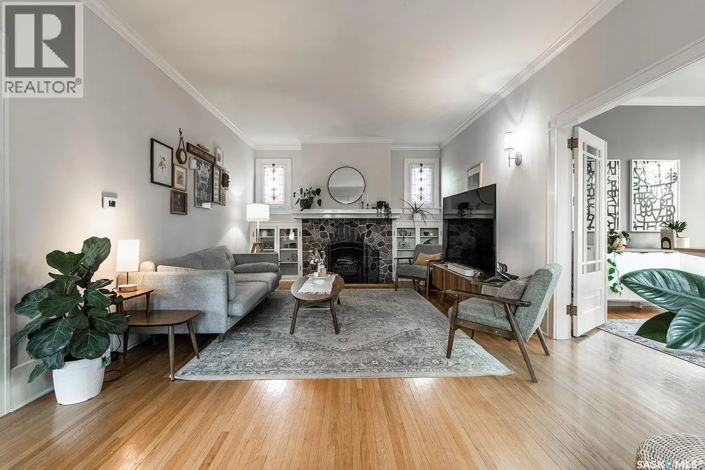 Like a private estate in the heart of the city, this beautifully updated 1,958 sqft two-storey captures your breathe from the moment you arrive. This huge lot has great street appeal with a 10ft hedge that surrounds the property. Step inside to a beautiful foyer that showcases the charming staircase. To the left of the foyer is a formal dining space and an updated modern kitchen with stainless steel appliances, gas range, built-in microwave and plenty of cabinetry. On the other side of the foyer there is a large living room with a wood burning fireplace, built-in cabinetry and two stained glass windows. A pair of french doors leads you into the bright sun-filled office. Upstairs, the primary bedroom features an electric fireplace and leads to a modern 3-pc ensuite with a walk-in tiled shower, and large walk-in closet. There are two more bedrooms and another 3-pc bathroom with a standalone soaker tub. Through one of the bedrooms is a bonus room with 2 walls of windows and tons of natural light, perfect for an office, another bedroom, sunroom or gym.. Downstairs, the fully finished basement has a spacious family room with an electric fireplace, another bedroom, a 3-pc bathroom, extra storage and a laundry room with a sink. The entire home has the perfect balance of original character details and modern updates. The yard leaves you wanting for nothing except more time outside with a firepit area, garden area, two large sheds, and tons of privacy. An oversized double detached garage with heated floors makes for easy convenience in the winters. There is also a long paved driveway perfect for RV parking. This private estate-style home is unique and impressive. Schedule your showing today! (id:27476)