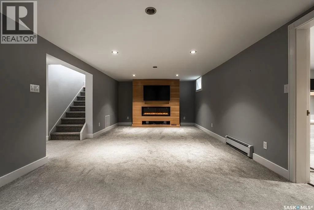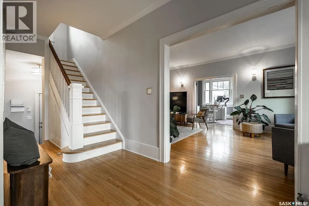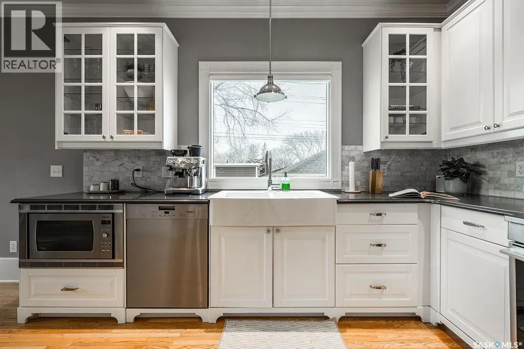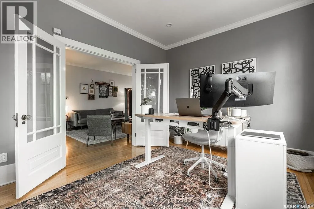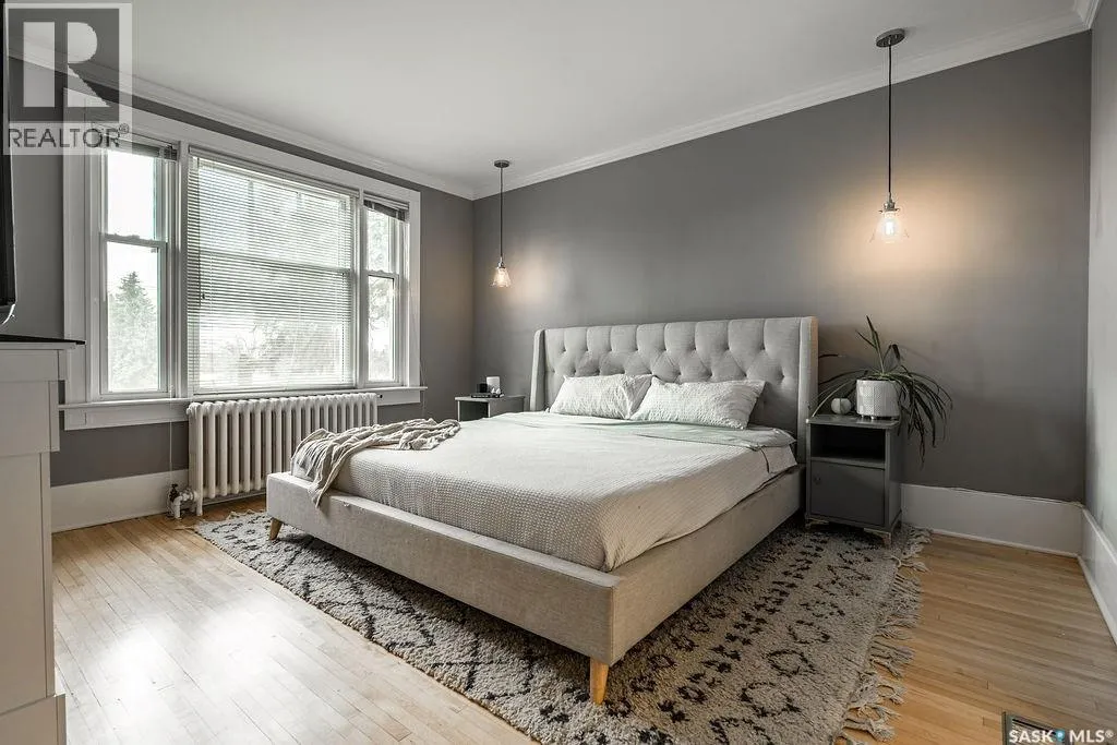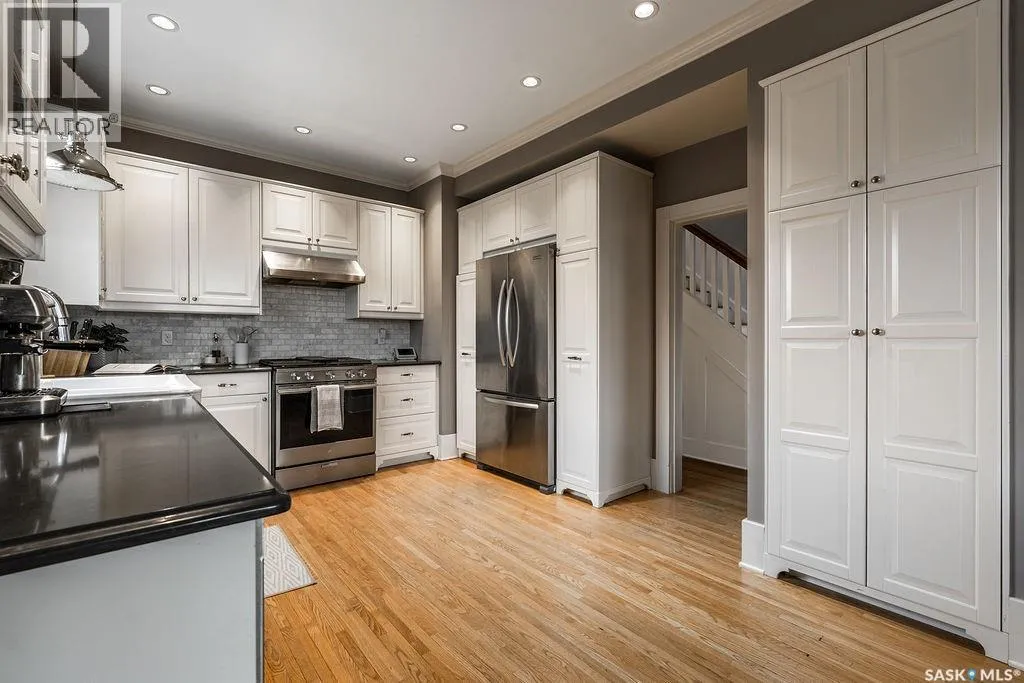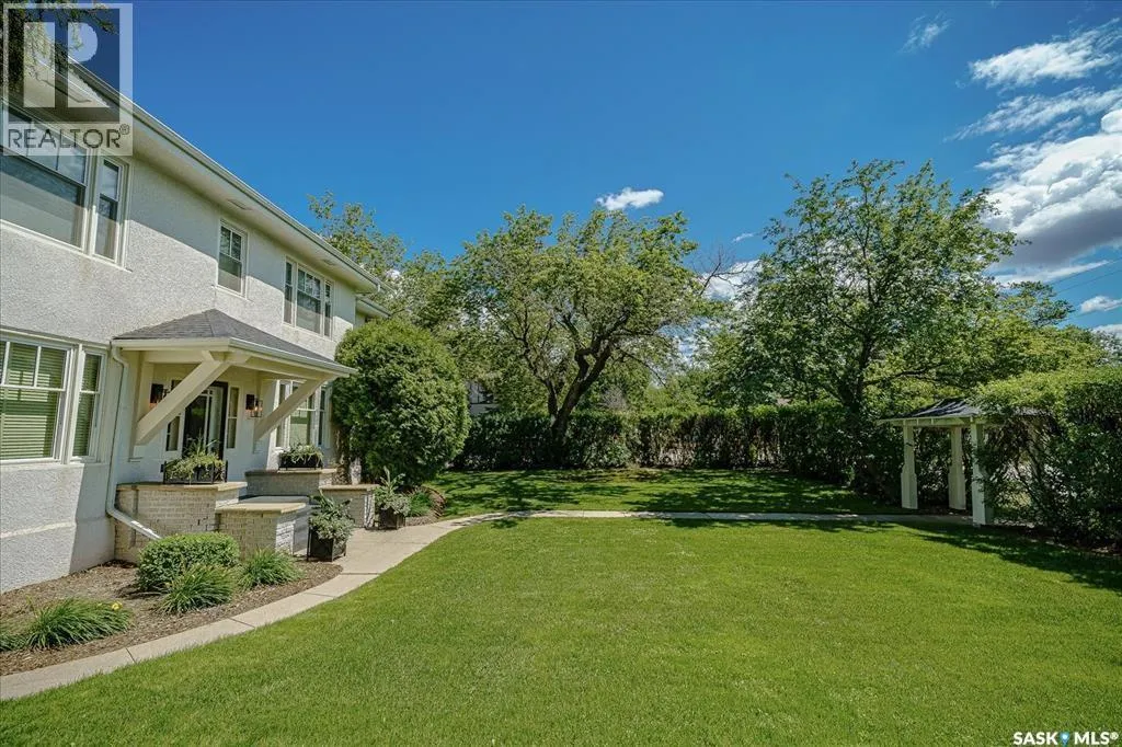 Like a private estate in the heart of the city, this beautifully updated 1,958 sqft two-storey captures your breathe from the moment you arrive. This huge lot has great street appeal with a 10ft hedge that surrounds the property. Step inside to a beautiful foyer that showcases the charming staircase. To the left of the foyer is a formal dining space and an updated modern kitchen with stainless steel appliances, gas range, built-in microwave and plenty of cabinetry. On the other side of the foyer there is a large living room with a wood burning fireplace, built-in cabinetry and two stained glass windows. A pair of french doors leads you into the bright sun-filled office. Upstairs, the primary bedroom features an electric fireplace and leads to a modern 3-pc ensuite with a walk-in tiled shower, and large walk-in closet. There are two more bedrooms and another 3-pc bathroom with a standalone soaker tub. Through one of the bedrooms is a bonus room with 2 walls of windows and tons of natural light, perfect for an office, another bedroom, sunroom or gym.. Downstairs, the fully finished basement has a spacious family room with an electric fireplace, another bedroom, a 3-pc bathroom, extra storage and a laundry room with a sink. The entire home has the perfect balance of original character details and modern updates. The yard leaves you wanting for nothing except more time outside with a firepit area, garden area, two large sheds, and tons of privacy. An oversized double detached garage with heated floors makes for easy convenience in the winters. There is also a long paved driveway perfect for RV parking. This private estate-style home is unique and impressive. Schedule your showing today! (id:27476)