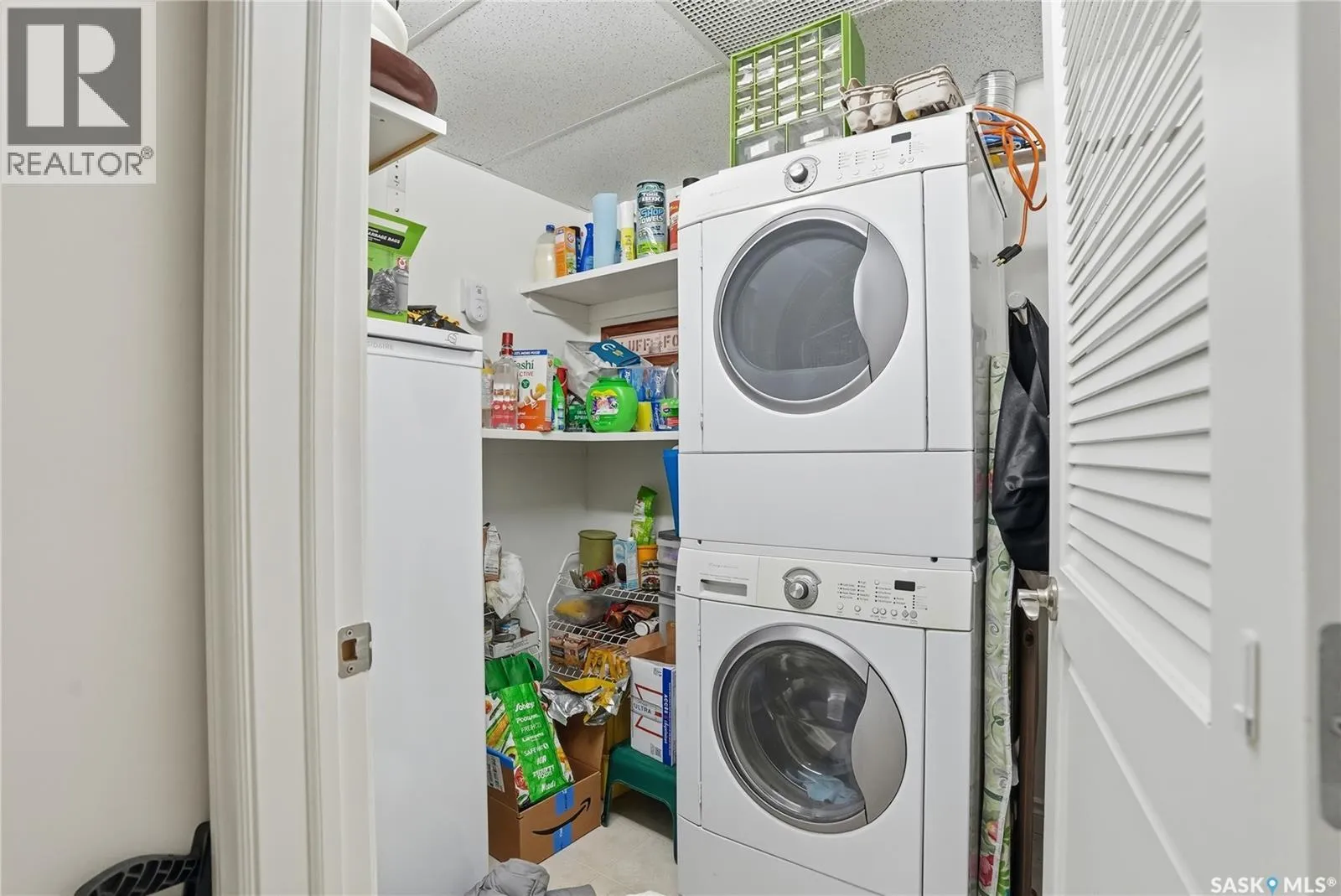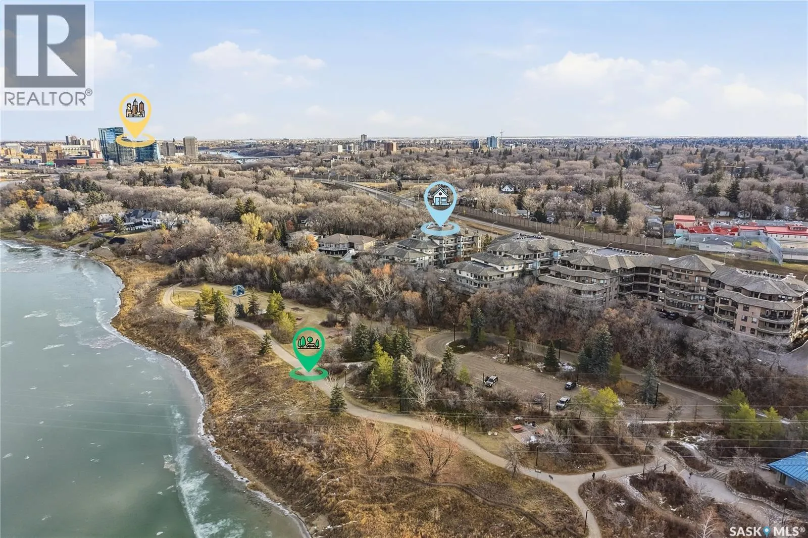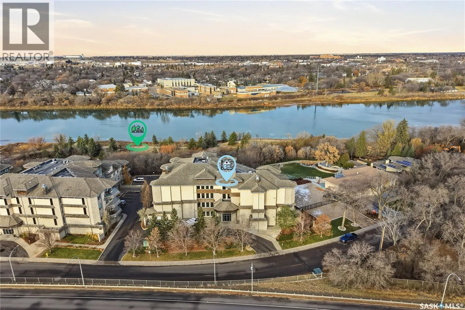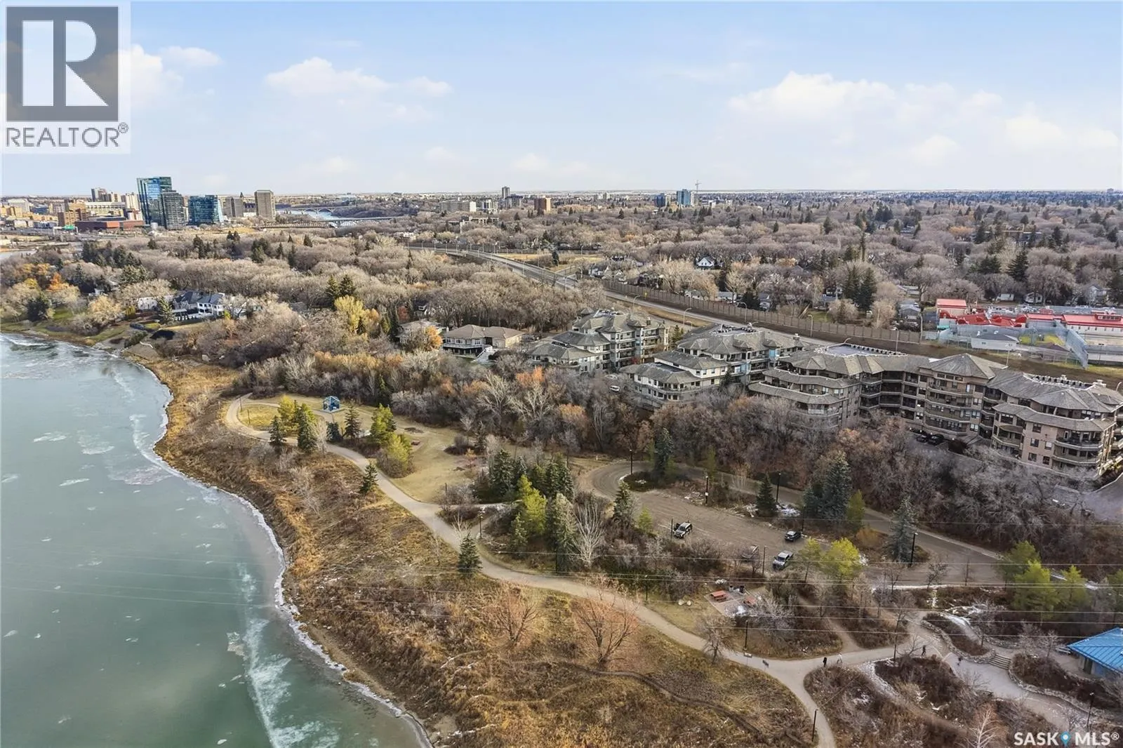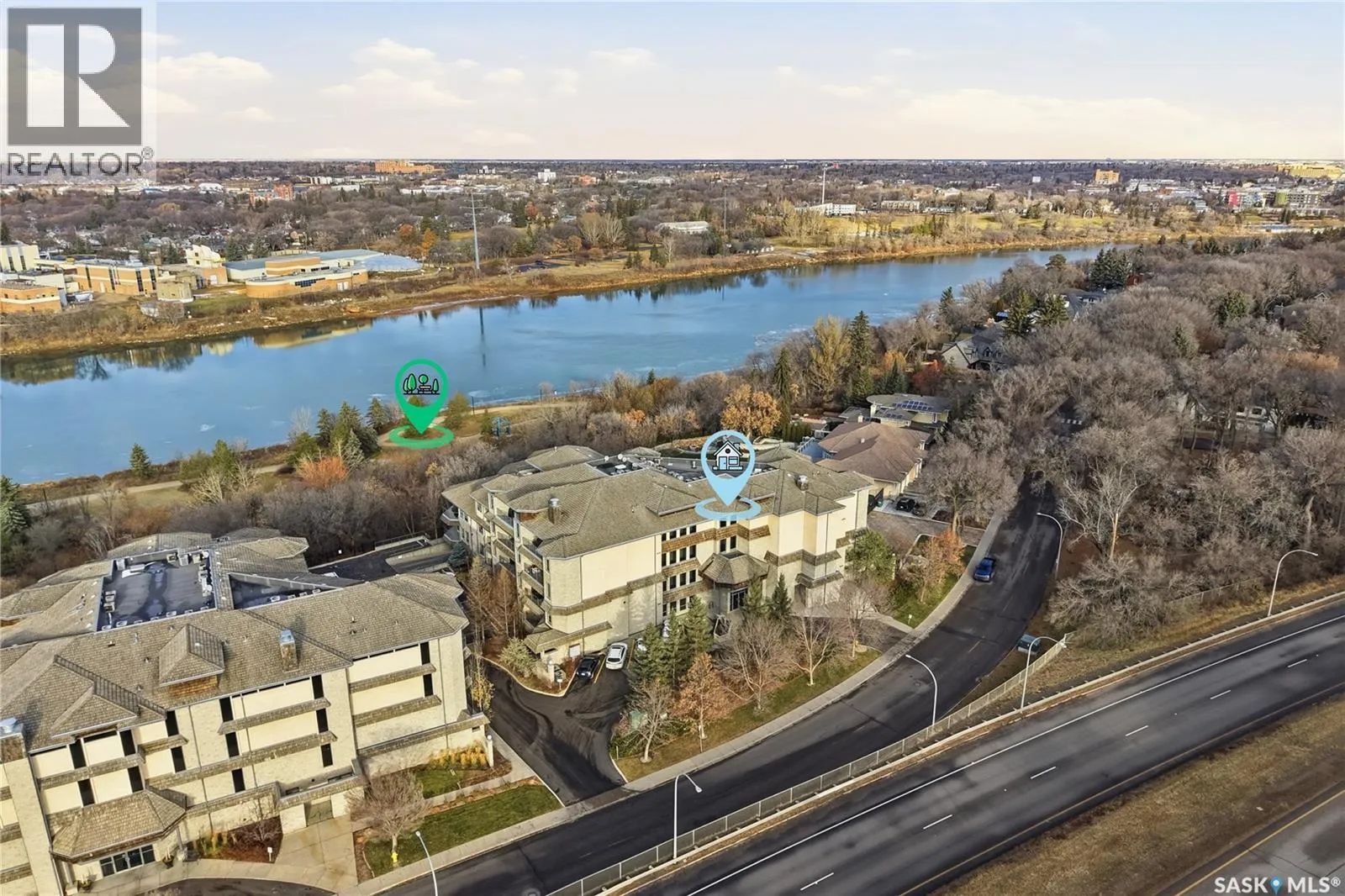 Welcome to The Landing and this well cared for, professionally managed condo, located on the river bank with a great river view, location for both quiet living and easy access to down town, shopping and freeways out of the city. The moment you walk in you are greeted by the clean and bright kitchen with white quartz countertops, light maple wood cabinets, stainless steel appliances including fridge, stove, dishwasher and microwave hood fan with direct vent to outside. It also has undercabinet accent lighting, pendant lights over the island with breakfast bar, a couple cabinet display doors and built in wine rack. Behind the kitchen is the dining area with rich hardwood floors that run into the living room and fill the condo with warmth. The off white walls in this living area add brightness and a lovely contrast to the flooring, there is plenty of space for your furniture and huge windows that fill the space with natural and healthy sunlight while giving you a fabulous view of the South Saskatchewan river side below. You can also access the back deck from here where you can relax and enjoy the suns warmth with your favorite bevy and prepare a meal on your barbeque that is connected to the natural gas outlet, and listen to the geese as they float by on the river. Down the hall you will find the spare bedroom with plush carpet across from the 4 piece bathroom. The master bedroom found at the end of the hall is huge, has cozy carpet flooring, a walkin closet and a 3 piece ensuite for your convenience. Across from the kitchen is a double wide coat closet and the laundry/storage room with stacked washer/dryer included. New to this unit is the stove, microwave, garburator, quartz countertops, sink and kitchen faucet. Enjoy the convenience of the heated underground parking and your own storage room, there is new clearcoat surface underground and new pavement outside. Close to the Meewasin Valley trail, Fred Mitchell and Gabriel dumont parks. Call today! (id:27476)