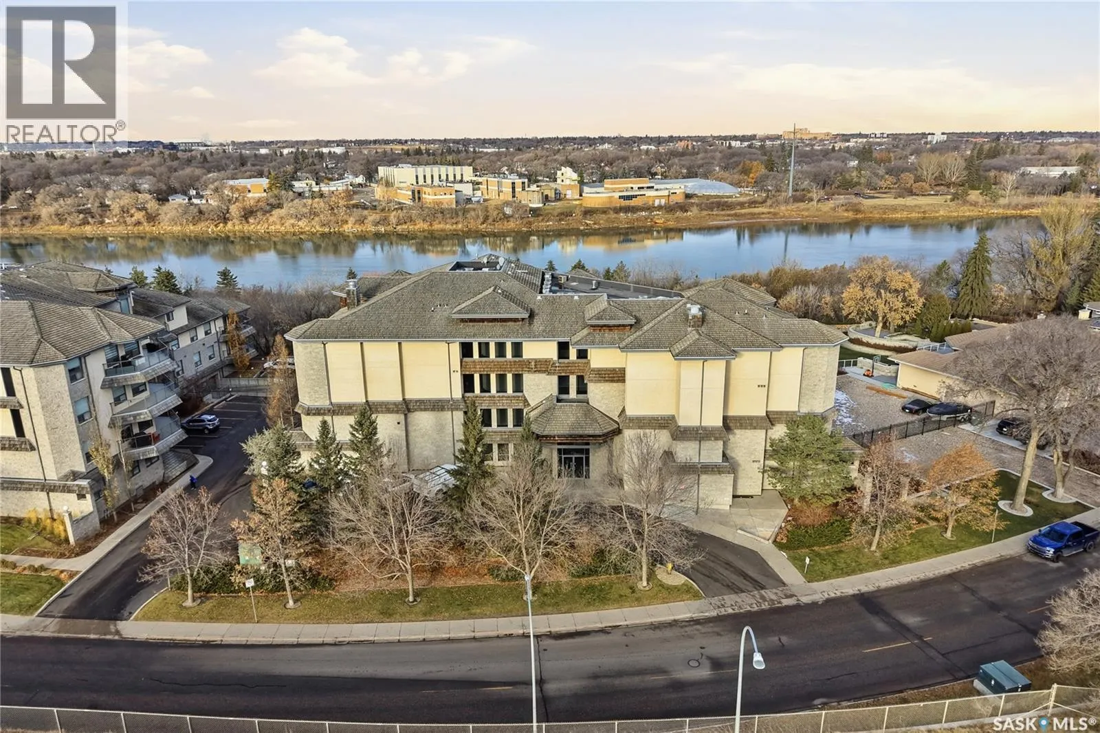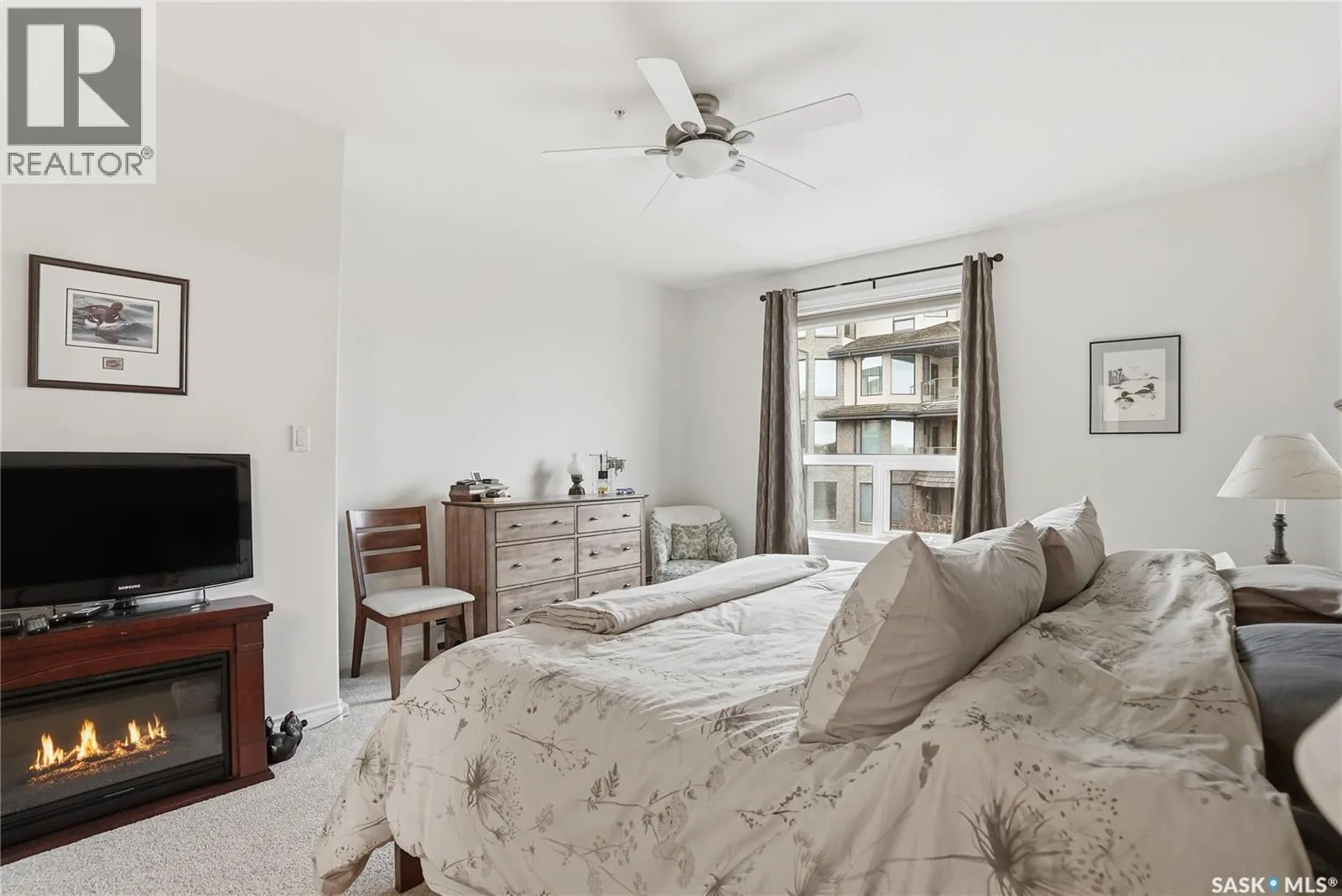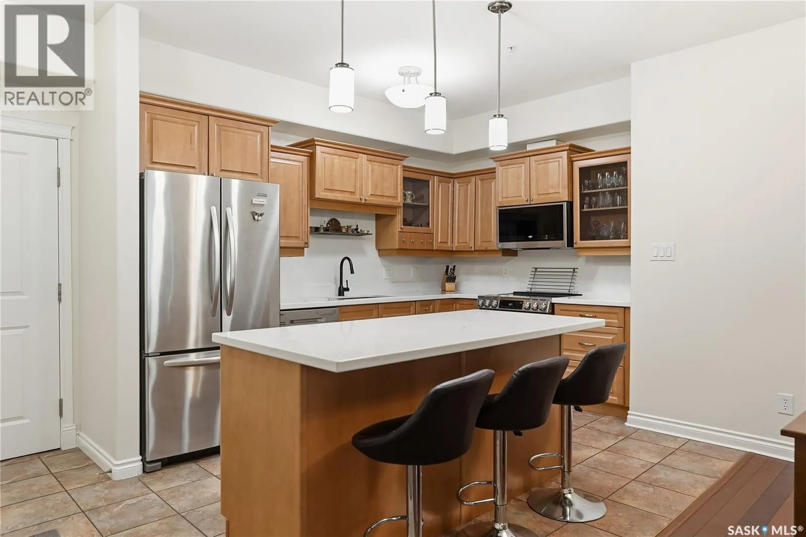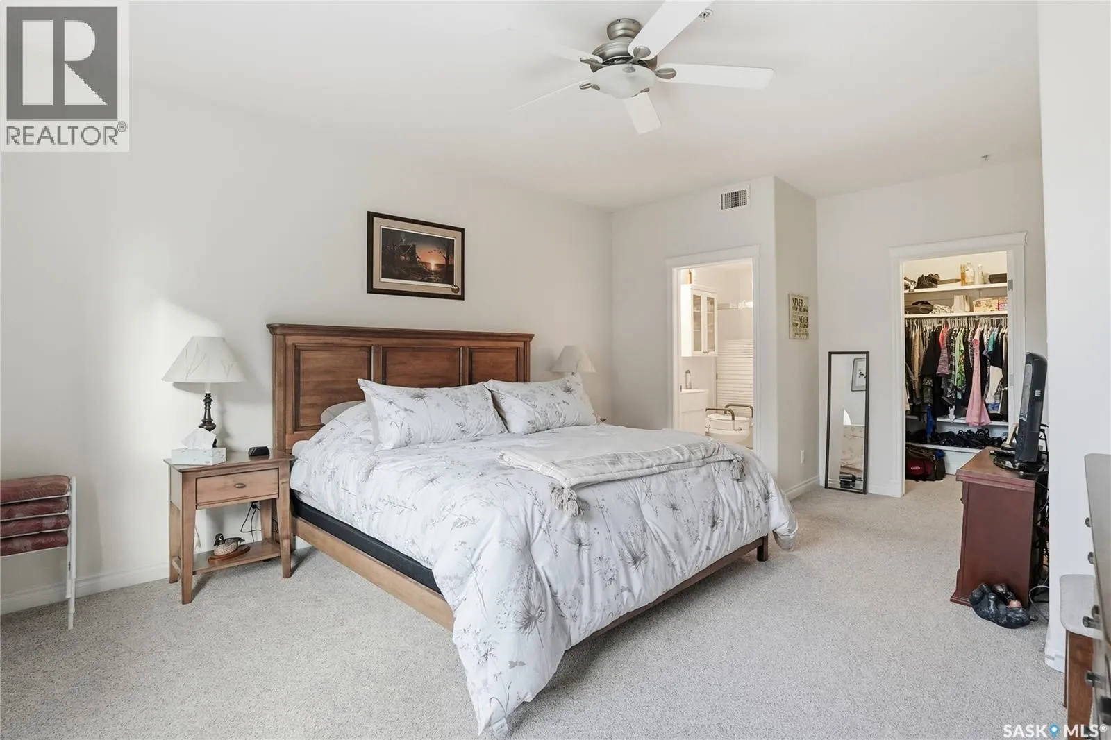 Welcome to The Landing and this well cared for, professionally managed condo, located on the river bank with a great river view, location for both quiet living and easy access to down town, shopping and freeways out of the city. The moment you walk in you are greeted by the clean and bright kitchen with white quartz countertops, light maple wood cabinets, stainless steel appliances including fridge, stove, dishwasher and microwave hood fan with direct vent to outside. It also has undercabinet accent lighting, pendant lights over the island with breakfast bar, a couple cabinet display doors and built in wine rack. Behind the kitchen is the dining area with rich hardwood floors that run into the living room and fill the condo with warmth. The off white walls in this living area add brightness and a lovely contrast to the flooring, there is plenty of space for your furniture and huge windows that fill the space with natural and healthy sunlight while giving you a fabulous view of the South Saskatchewan river side below. You can also access the back deck from here where you can relax and enjoy the suns warmth with your favorite bevy and prepare a meal on your barbeque that is connected to the natural gas outlet, and listen to the geese as they float by on the river. Down the hall you will find the spare bedroom with plush carpet across from the 4 piece bathroom. The master bedroom found at the end of the hall is huge, has cozy carpet flooring, a walkin closet and a 3 piece ensuite for your convenience. Across from the kitchen is a double wide coat closet and the laundry/storage room with stacked washer/dryer included. New to this unit is the stove, microwave, garburator, quartz countertops, sink and kitchen faucet. Enjoy the convenience of the heated underground parking and your own storage room, there is new clearcoat surface underground and new pavement outside. Close to the Meewasin Valley trail, Fred Mitchell and Gabriel dumont parks. Call today! (id:27476)