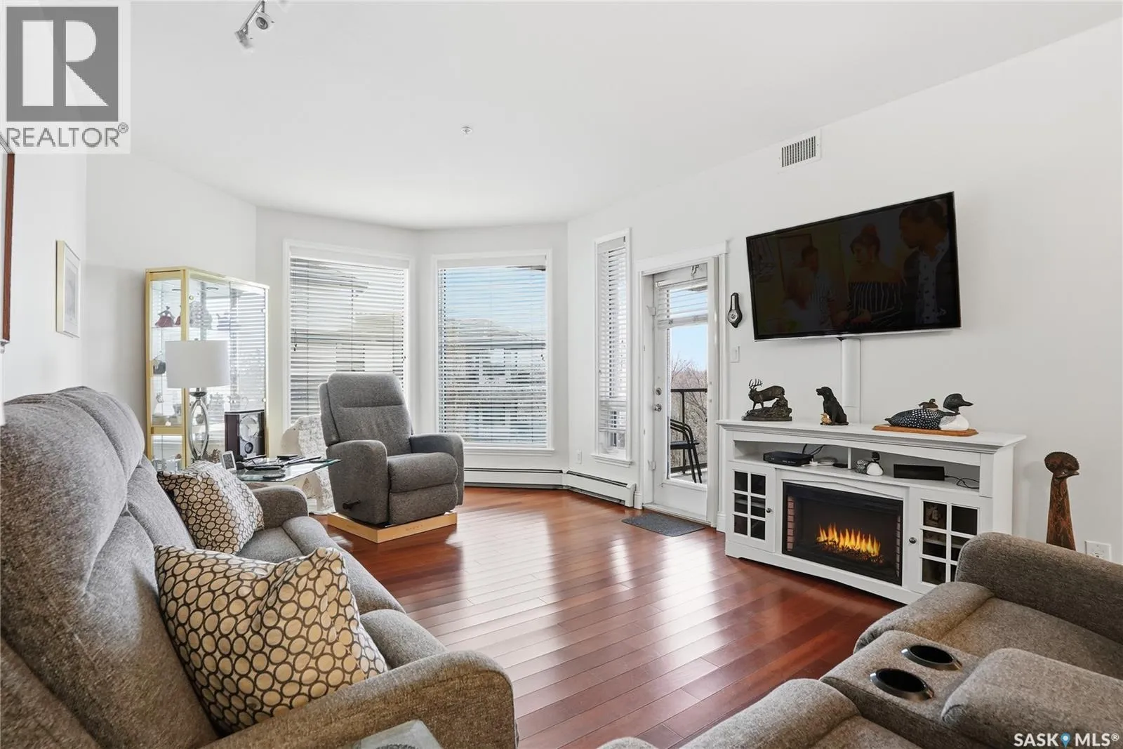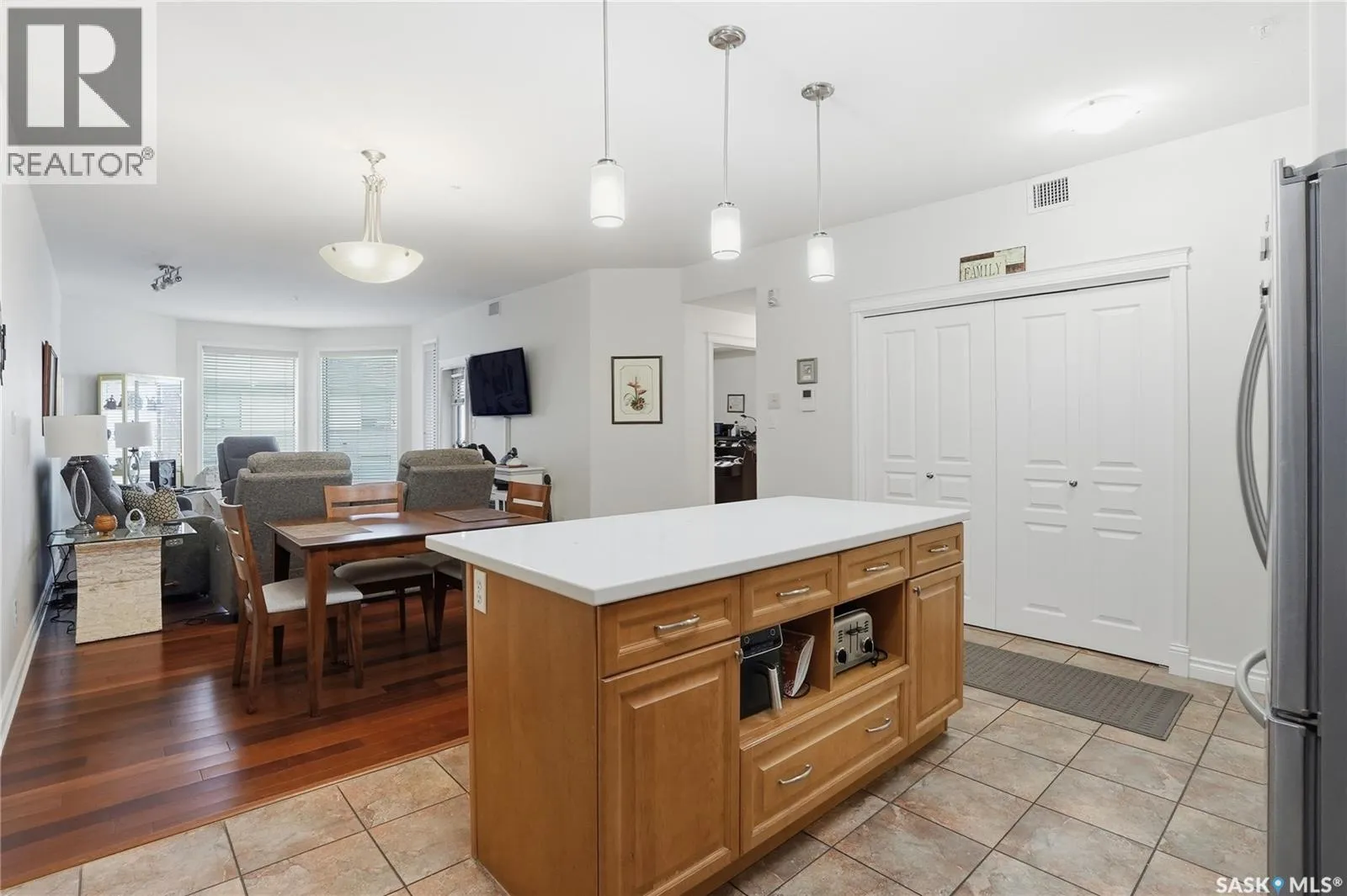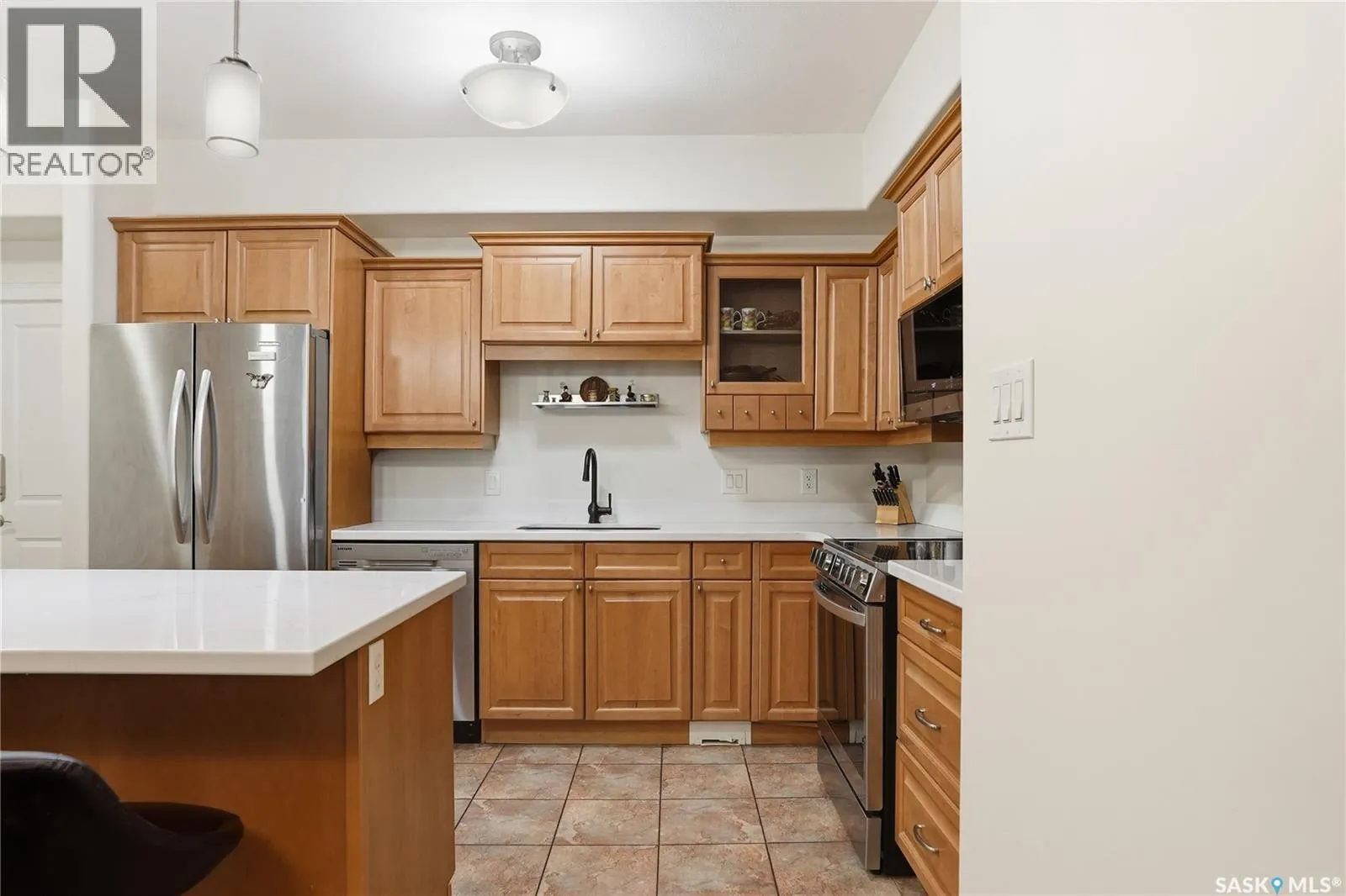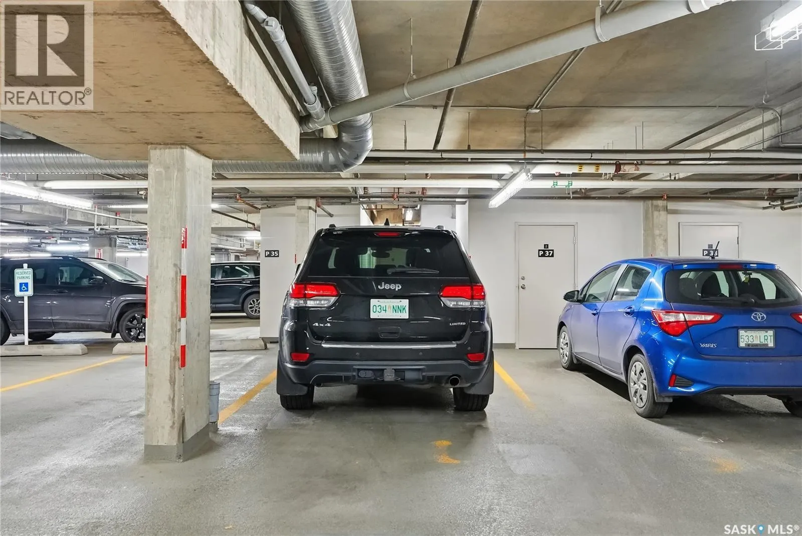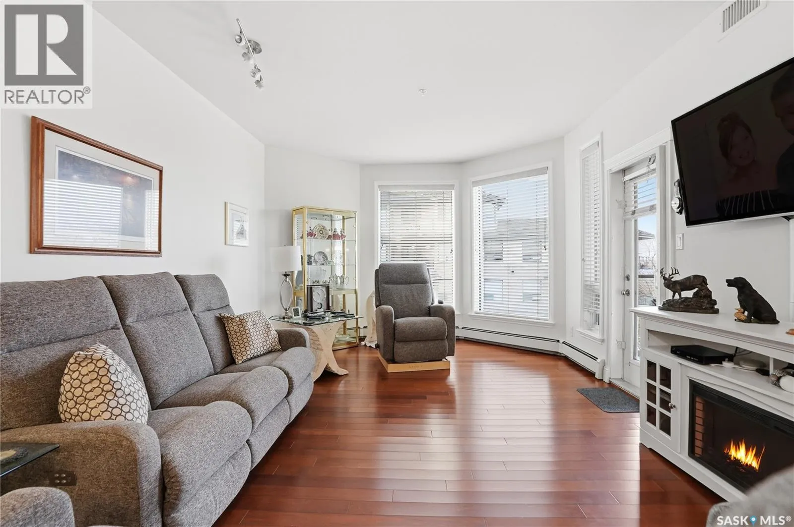 Welcome to The Landing and this well cared for, professionally managed condo, located on the river bank with a great river view, location for both quiet living and easy access to down town, shopping and freeways out of the city. The moment you walk in you are greeted by the clean and bright kitchen with white quartz countertops, light maple wood cabinets, stainless steel appliances including fridge, stove, dishwasher and microwave hood fan with direct vent to outside. It also has undercabinet accent lighting, pendant lights over the island with breakfast bar, a couple cabinet display doors and built in wine rack. Behind the kitchen is the dining area with rich hardwood floors that run into the living room and fill the condo with warmth. The off white walls in this living area add brightness and a lovely contrast to the flooring, there is plenty of space for your furniture and huge windows that fill the space with natural and healthy sunlight while giving you a fabulous view of the South Saskatchewan river side below. You can also access the back deck from here where you can relax and enjoy the suns warmth with your favorite bevy and prepare a meal on your barbeque that is connected to the natural gas outlet, and listen to the geese as they float by on the river. Down the hall you will find the spare bedroom with plush carpet across from the 4 piece bathroom. The master bedroom found at the end of the hall is huge, has cozy carpet flooring, a walkin closet and a 3 piece ensuite for your convenience. Across from the kitchen is a double wide coat closet and the laundry/storage room with stacked washer/dryer included. New to this unit is the stove, microwave, garburator, quartz countertops, sink and kitchen faucet. Enjoy the convenience of the heated underground parking and your own storage room, there is new clearcoat surface underground and new pavement outside. Close to the Meewasin Valley trail, Fred Mitchell and Gabriel dumont parks. Call today! (id:27476)