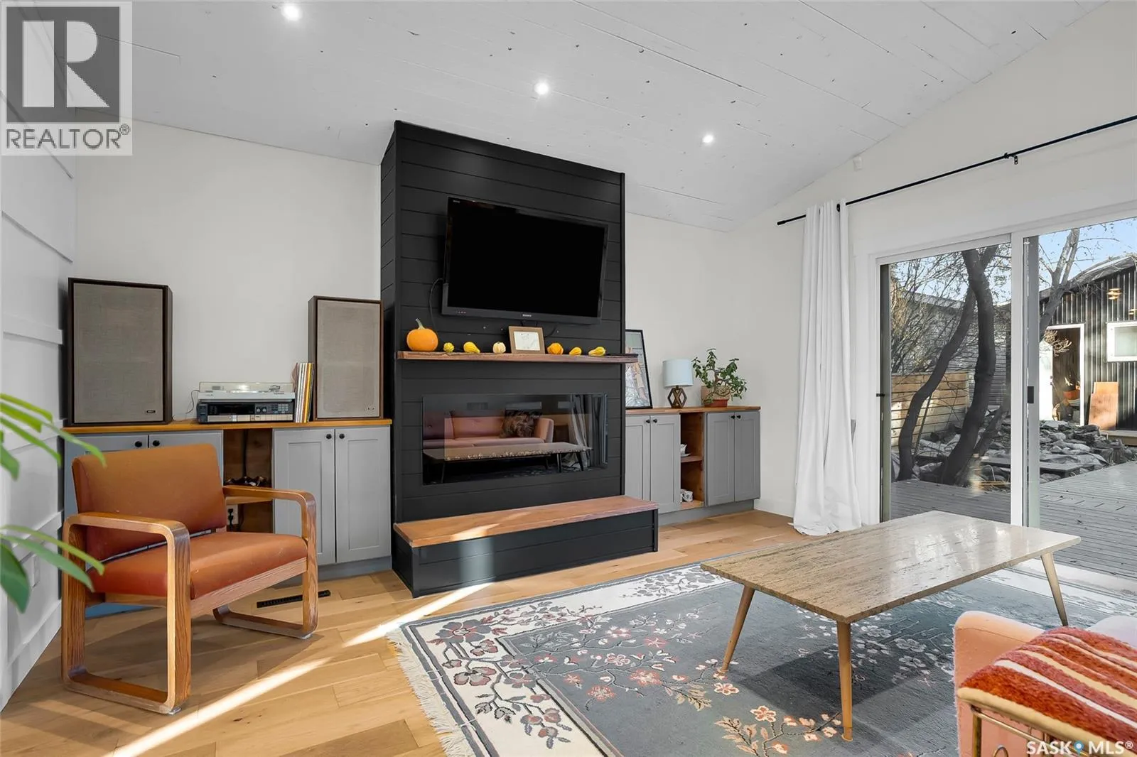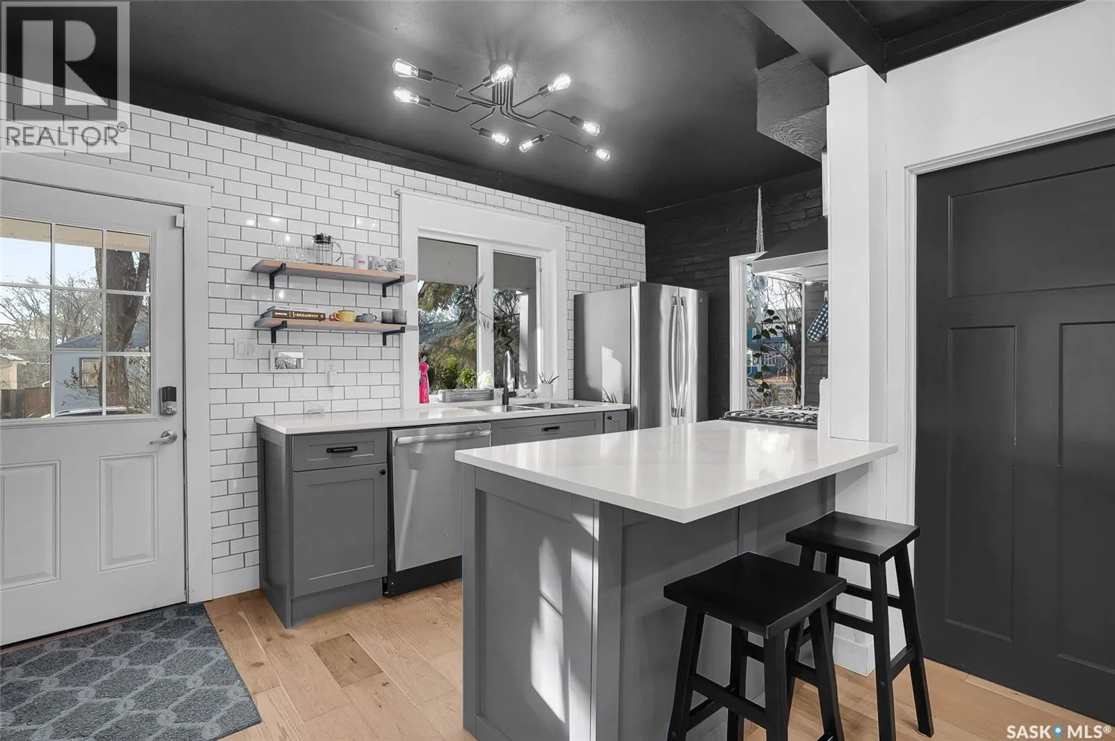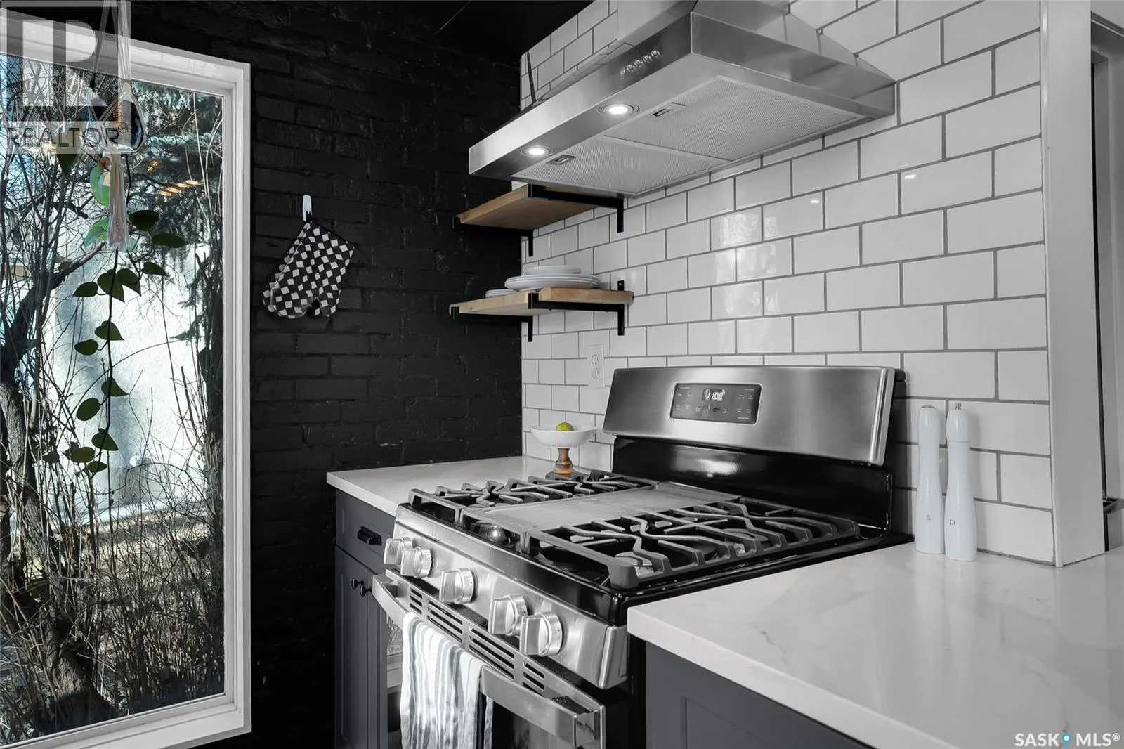 Welcome to this charming one-and-a-half-storey home in Caswell Hill. Start your day with coffee on the sunny, south-facing front porch. The renovated kitchen boasts quartz countertops, stainless steel appliances including a gas range, hood fan, and fridge with water/ice dispenser, plus an eat-up peninsula and brick feature wall. Gorgeous engineered hardwood floors flows from the dining room into the bright living room with its vaulted ceiling, fireplace, and sliding patio door to the yard. The main floor also features a unique 3-piece bathroom with copper penny flooring and backsplash, as well as side entry and laundry. Upstairs, youâll find two cozy bedrooms with brand-new skylights and another stylish 3-piece bathroom, with a slight view of the Bessborough Hotel from one bedroom window. Main bedroom holds a king size bed. Extras include a front concrete driveway, quality windows, updated doors, koi pond, new fence and deck, garden boxes, firepit, and gazebo for summer evenings. A spacious 24 x 24 garage built in 2020 is ready for your finishing touches, perfect for cars and storage. This little gem is not to be missed! (id:27476)