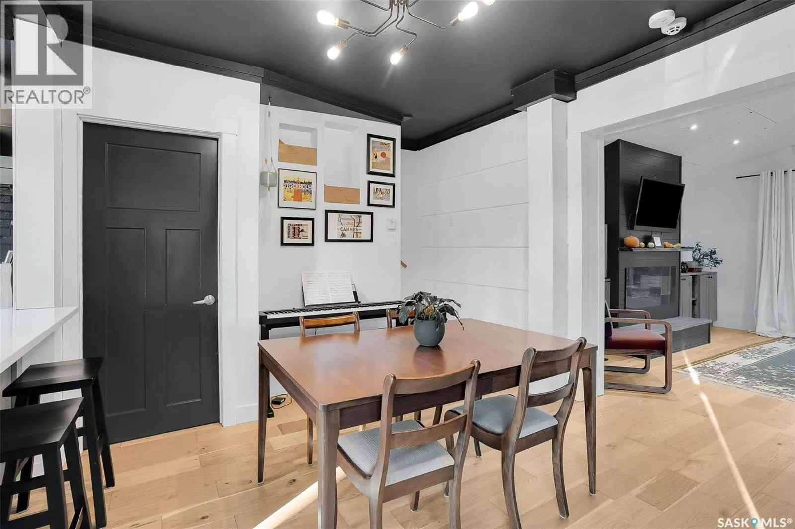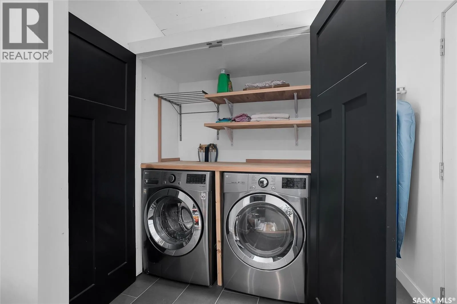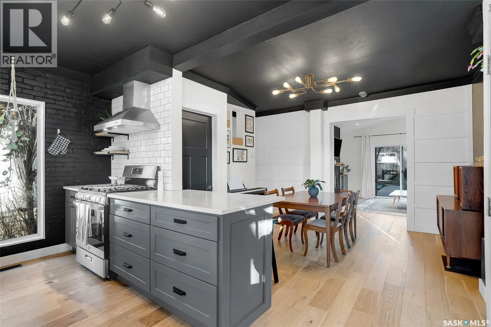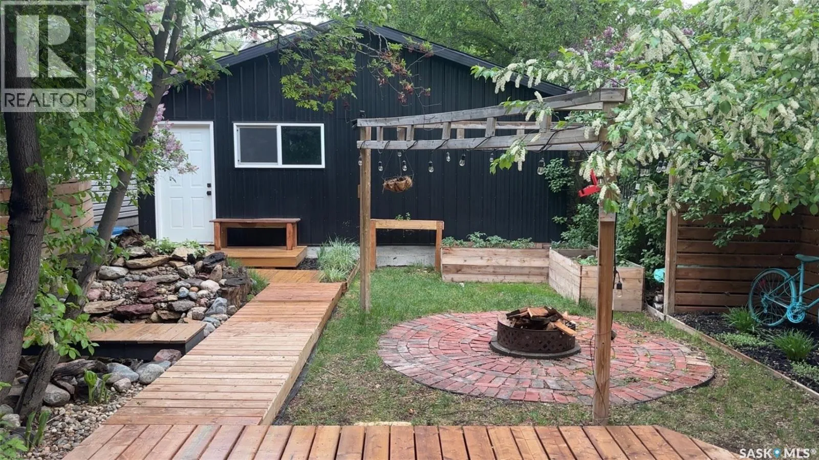 Welcome to this charming one-and-a-half-storey home in Caswell Hill. Start your day with coffee on the sunny, south-facing front porch. The renovated kitchen boasts quartz countertops, stainless steel appliances including a gas range, hood fan, and fridge with water/ice dispenser, plus an eat-up peninsula and brick feature wall. Gorgeous engineered hardwood floors flows from the dining room into the bright living room with its vaulted ceiling, fireplace, and sliding patio door to the yard. The main floor also features a unique 3-piece bathroom with copper penny flooring and backsplash, as well as side entry and laundry. Upstairs, youâll find two cozy bedrooms with brand-new skylights and another stylish 3-piece bathroom, with a slight view of the Bessborough Hotel from one bedroom window. Main bedroom holds a king size bed. Extras include a front concrete driveway, quality windows, updated doors, koi pond, new fence and deck, garden boxes, firepit, and gazebo for summer evenings. A spacious 24 x 24 garage built in 2020 is ready for your finishing touches, perfect for cars and storage. This little gem is not to be missed! (id:27476)