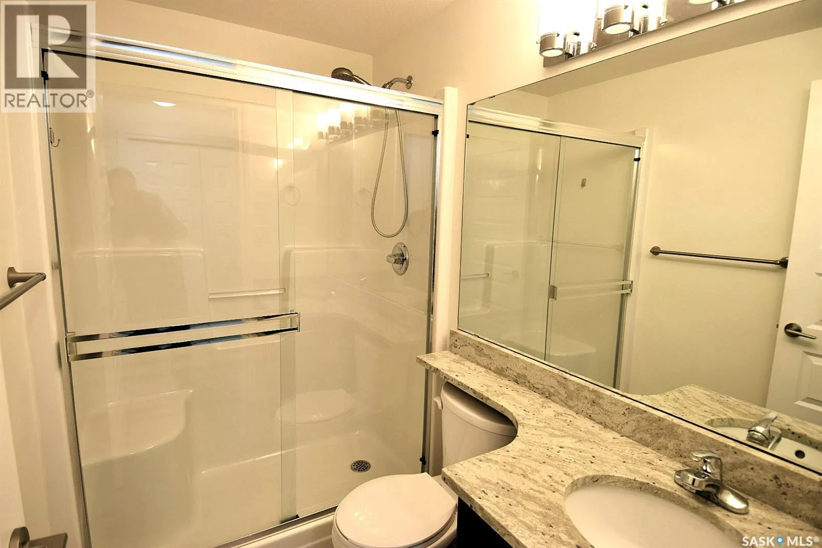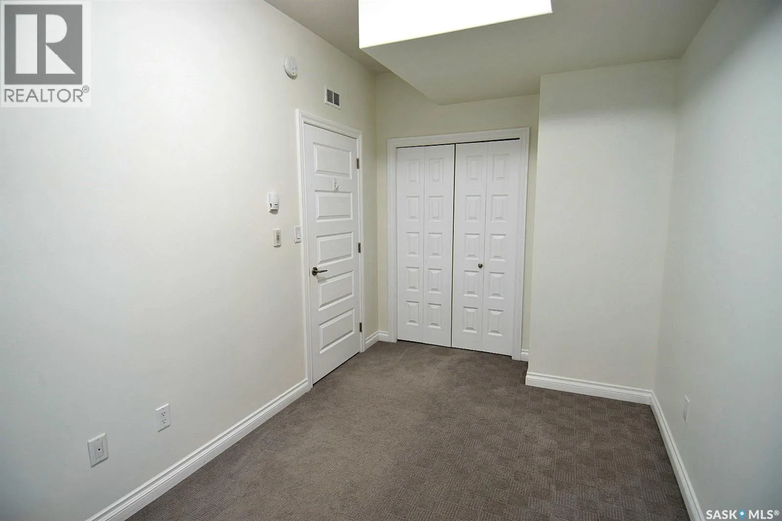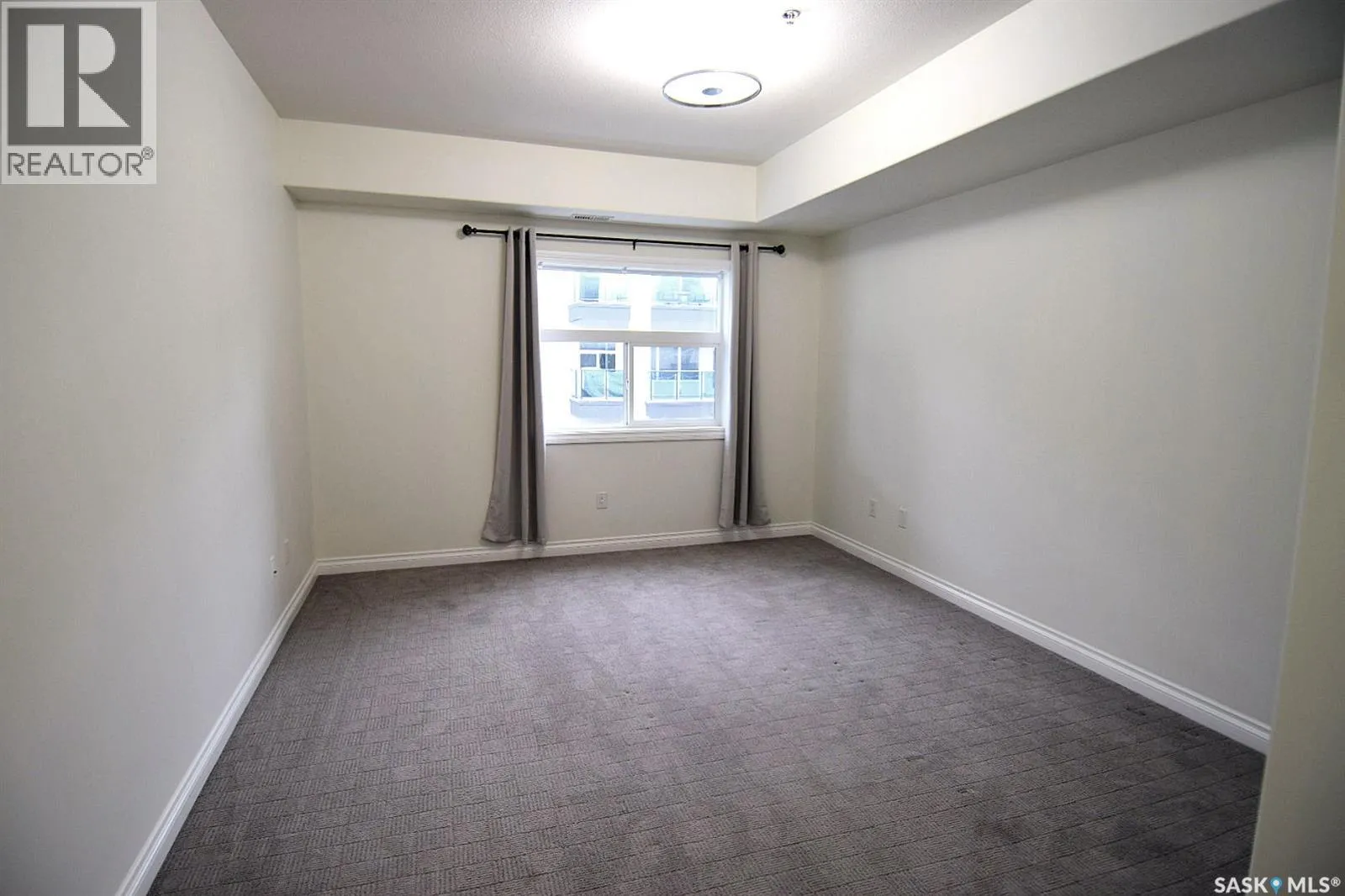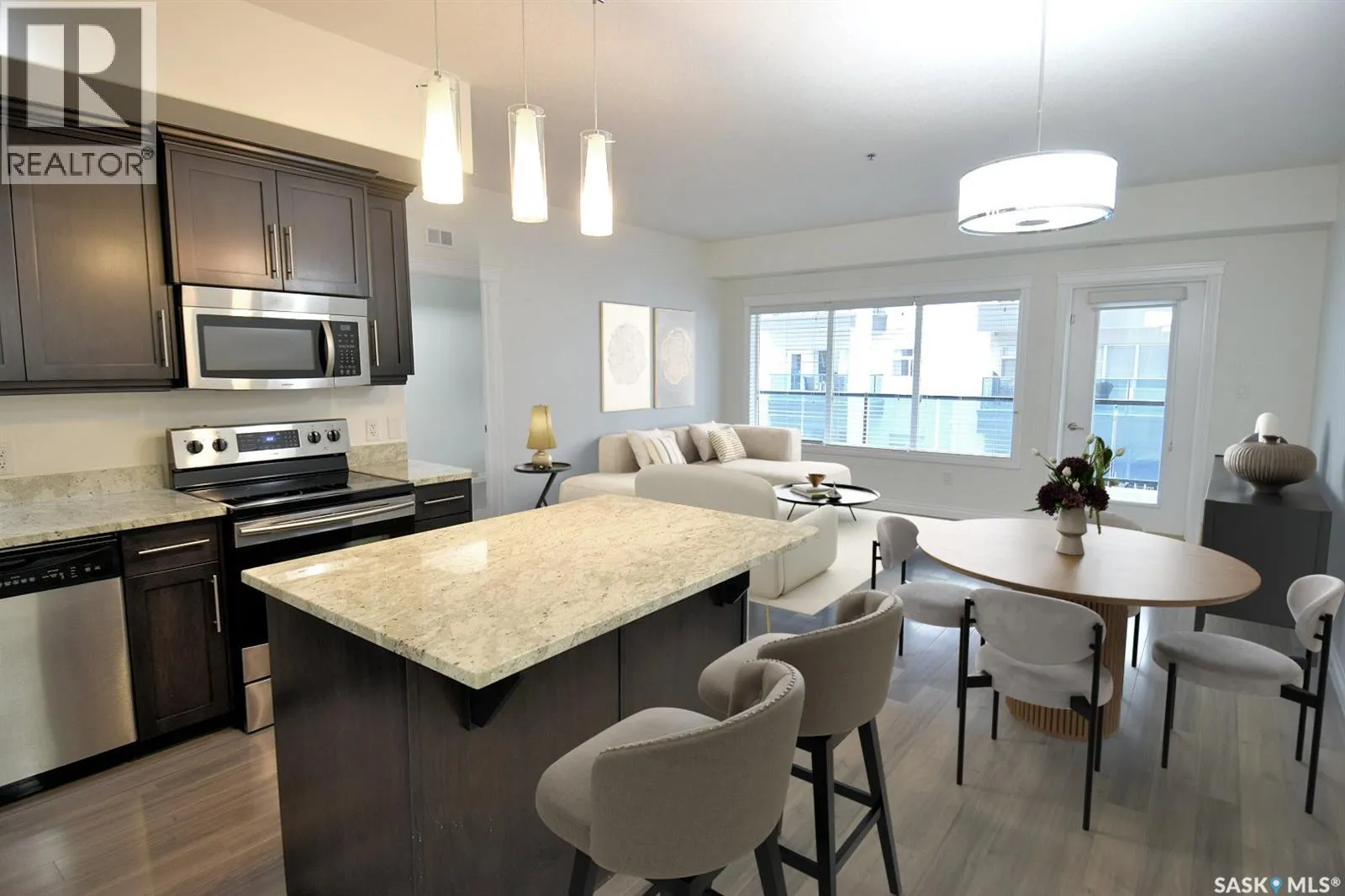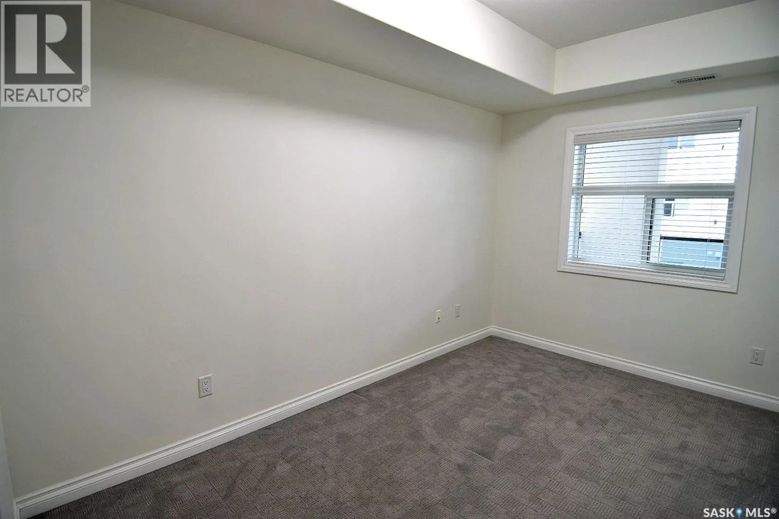 Welcome to sophisticated, hassle-free living in one of Saskatoonâs most desirable locations. This super-clean third-floor suite offers an unparalleled combination of space, style, and essential convenience in the highly coveted University Heights area. Here you can embrace true walkability; leave the car behind as groceries, restaurants, coffee shops, banks, medical, library, & transit are all just a short stroll away. Experience urban convenience without sacrificing comfort. Step inside this elegant suite where soaring 9-foot ceilings & windows immediately create a bright, spacious atmosphere. The thoughtful, open-concept design allows the kitchen, dining, & living areas to flow seamlessly together, all enhanced by fresh, designer paint. The kitchen features a full suite of modern S/S appliances, a functional island with breakfast bar, & beautiful modern light-colored granite countertops here & in both baths. Easy to clean luxury is further provided by gleaming laminate floors through the main area. The spacious primary suite easily accommodates large furniture & boasts 3 closets leading to a private 3-piece ensuite, complete with 5ft walk-in shower & glass doors. A full main bath with a deep bathtub, services the 2nd bedroom & guests. One of the most impressive features is the expansive outdoor space: a French patio door opens to a private covered terrace; a truly massive 200 sq ft space ready to be furnished & enjoyed. This impressive building is designed for year-round comfort and convenience, featuring an exclusive, private heated parking stall to keep your vehicle safe & warm. Owners appreciate the dedicated car wash bay. Wash your car then let it dry in your heated parking spot. Aqua Terra includes a well-equipped exercise room, workshop, a community meeting space, private storage, & ample visitor and street parking. Combining premium features, amenities, & genuine value, this executive condo truly checks every box for comfort, convenience, and lifestyle. (id:27476)