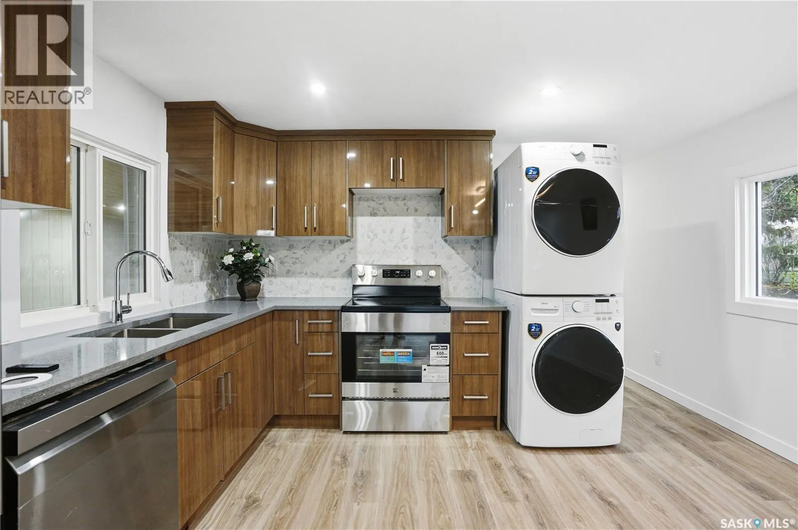 A backyard that feels like your own private park! This beautifully renovated mobile home sits on one of the best lots in the entire community, backing directly onto green space, ball diamonds, and a gorgeous park setting. Itâs rare to find this much space and privacy on Saskatoonâs east side, especially at this price point. Inside, youâll find over 1,200 sq. ft. of bright, modern living space thatâs been updated from top to bottom. Everythingâs been done from the newer furnace, air conditioner, and windows to the sleek kitchen with quartz counters, tile backsplash, soft-close cabinets, and stainless steel appliances. The open layout feels warm and welcoming with luxury vinyl plank flooring, pot lighting, and a cozy electric fireplace that ties it all together. Thereâs also an oversized family room, perfect for an office, playroom, or extra lounge space. The main bathroom features dual sinks and the primary bedroom has a stylish feature wall that adds character. Outside, enjoy two new decks, one for morning coffee, one for evening BBQs and a yard so big it honestly feels like your own park. Lot fees cover water, sewer, snow removal, garbage pick-up, and park maintenance, so you can just move in and enjoy. If youâre looking for something move-in ready with unbeatable space, style, and location, this is a must-see. Homes like this, especially with a yard like that, donât come around often! (id:27476)