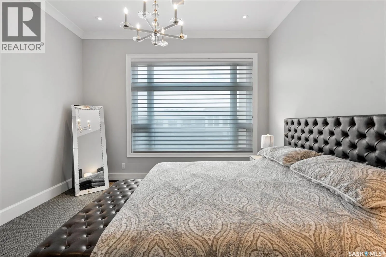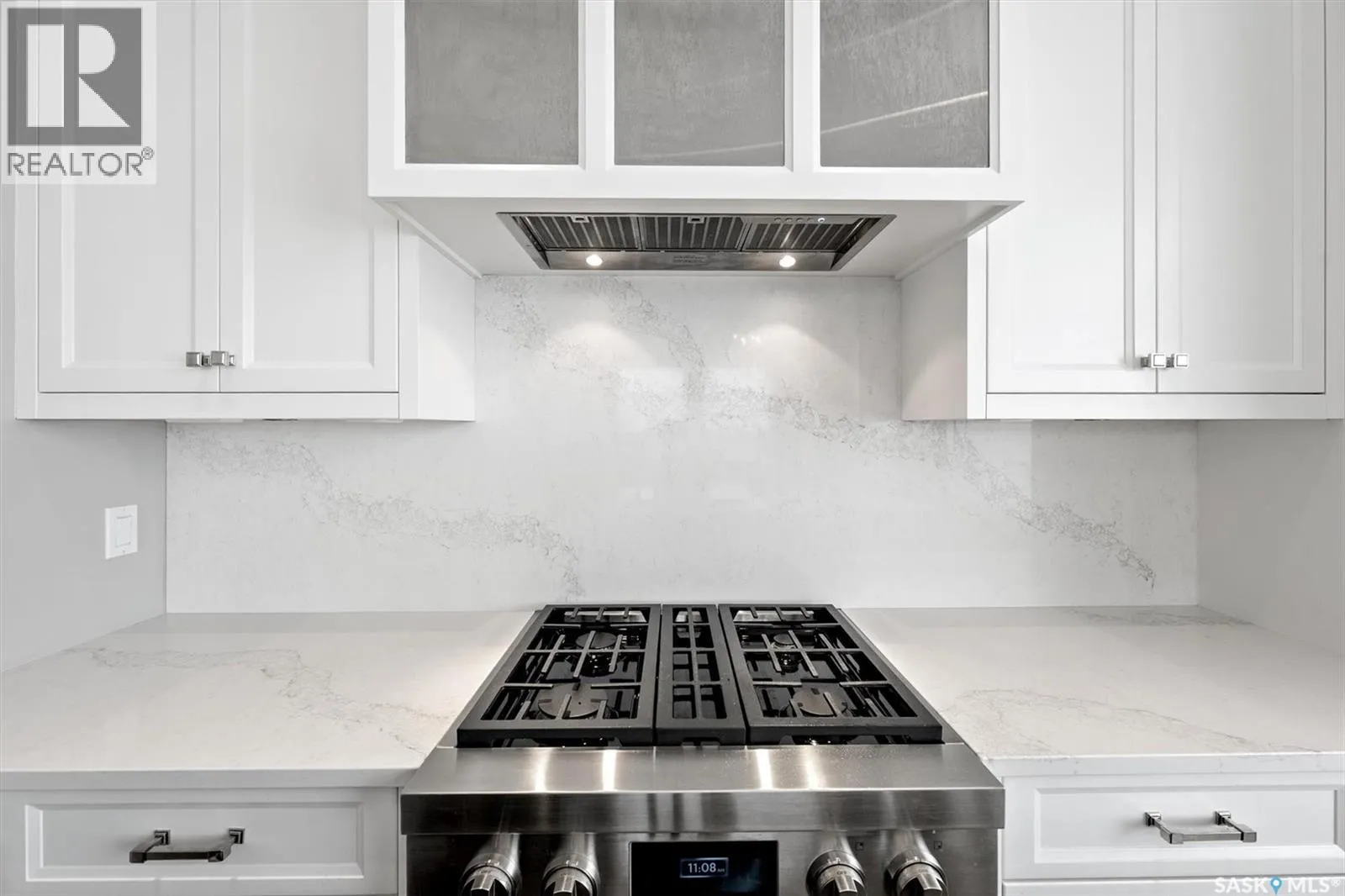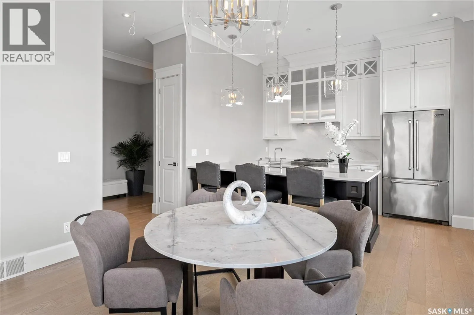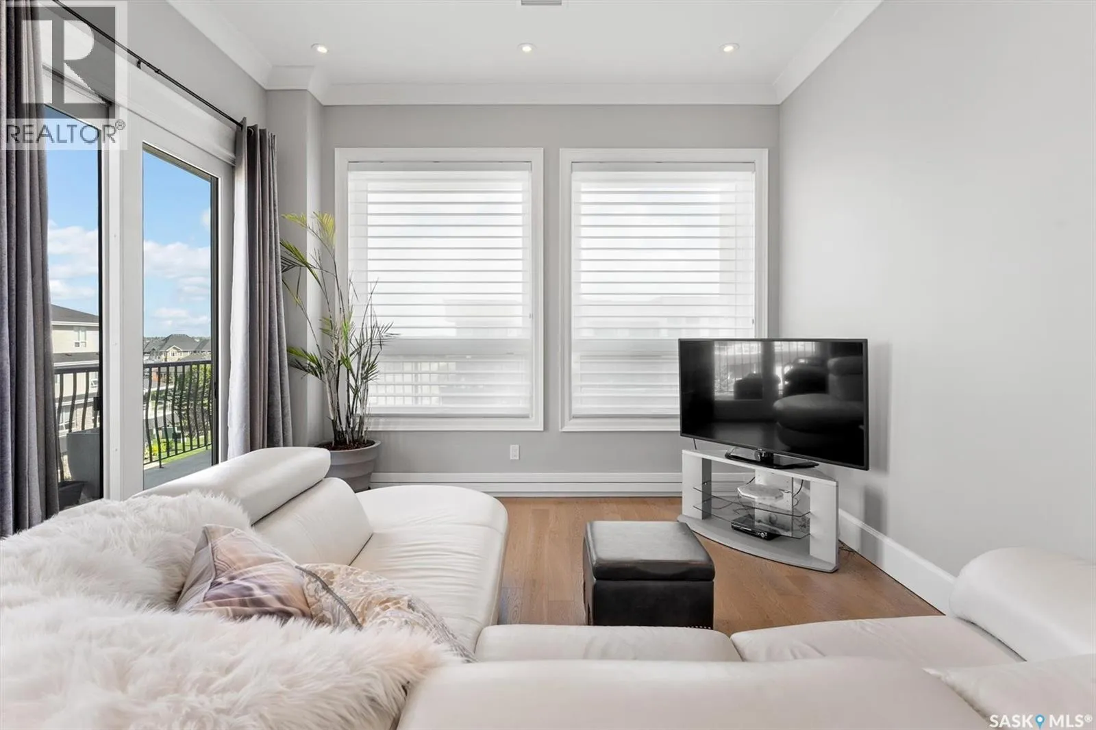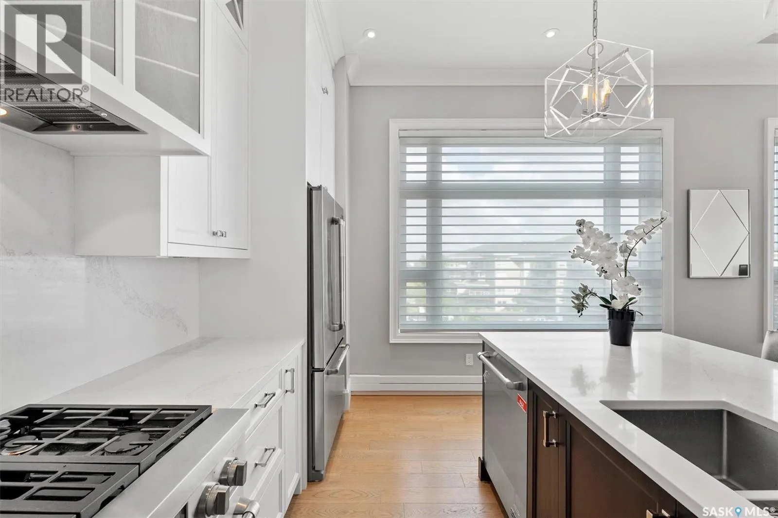 Luxurious 3rd Floor Corner Unit at The Willows Private Residences: Light-filled and like new, this 1,206 sq. ft. 2-bedroom, 2-bathroom condo offers elevated living in Saskatoonâs premier golf course community. Built by Valentino Homes and designed by Atmosphere Interior Design, this property features tall ceilings, wide plank white oak hardwood throughout, crown mouldings, and 8â interior doors. The open floor plan includes a showpiece white lacquer shaker kitchen with full-height cabinetry, glass panel detail, pantry storage, stainless steel appliances, and gorgeous designer lighting. Two exceptionally large bedrooms include a primary suite with a custom outfitted walk-in closet w/ built in dresser, and a porcelain marble-clad 4 piece spa ensuite, equipped with quartz counters and glass entry tiled shower. A second full bath with porcelain marble tile and quartz, plus a spacious storage/flex room with built-in cabinetry (could service as a craft room) complete the floor plan. This esteemed condominium offers an amenity room, fitness centre, and two titled parking stalls (one underground, one surface), exceptionally maintained grounds and common areas, a storage unit, wheel chair access and visitor parking. Situated directly on the golf course, this is your opportunity to enjoy a luxury lifestyle at The Willows. (id:27476)