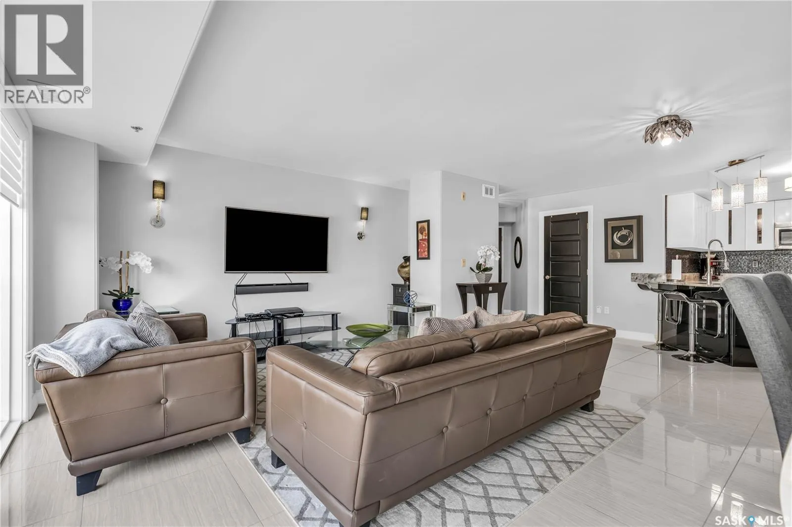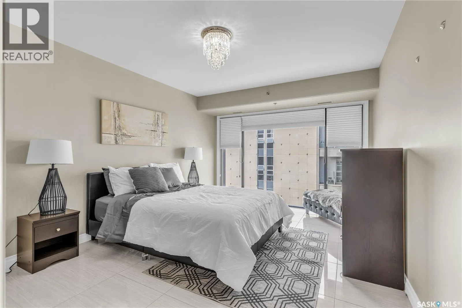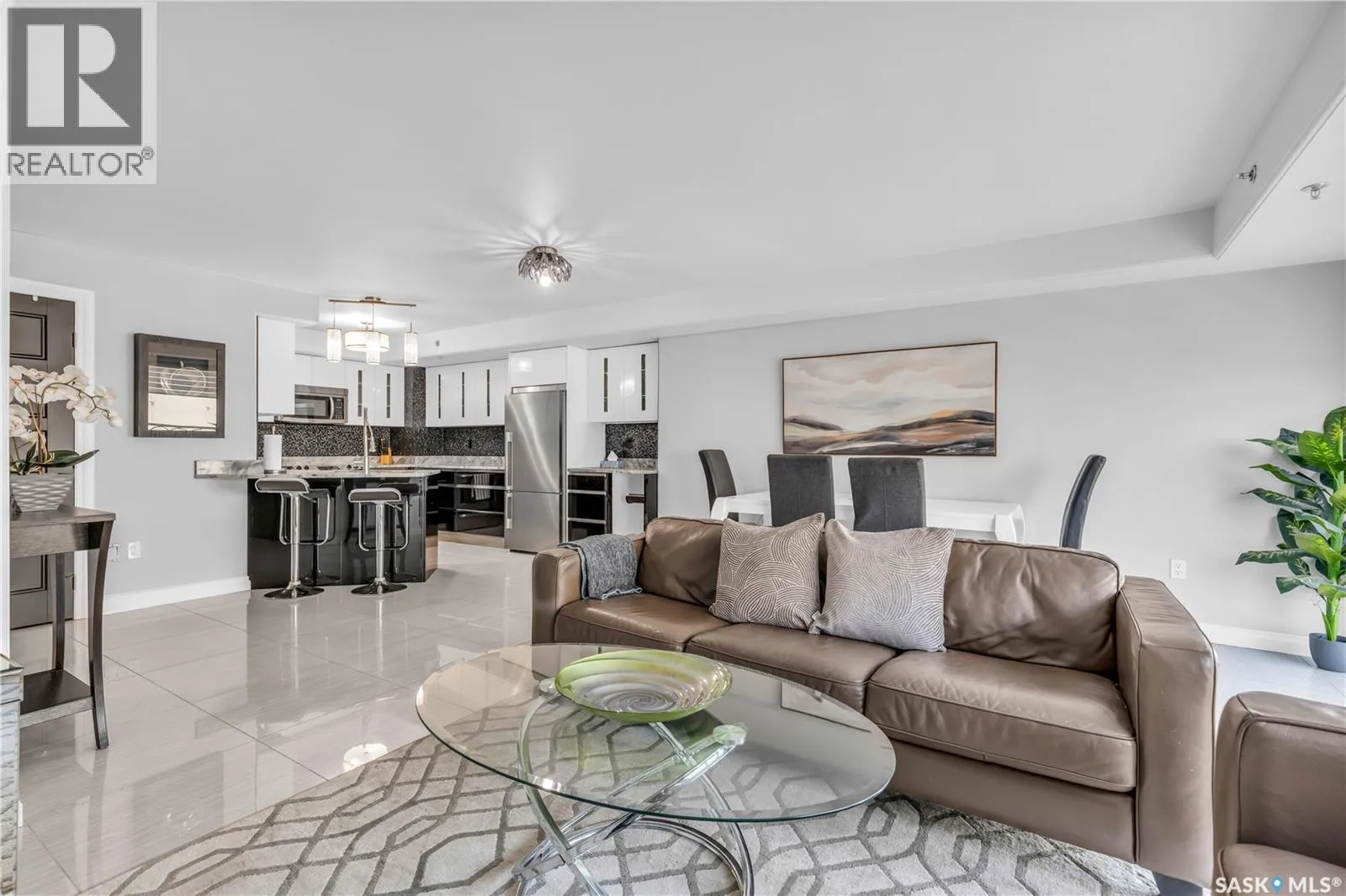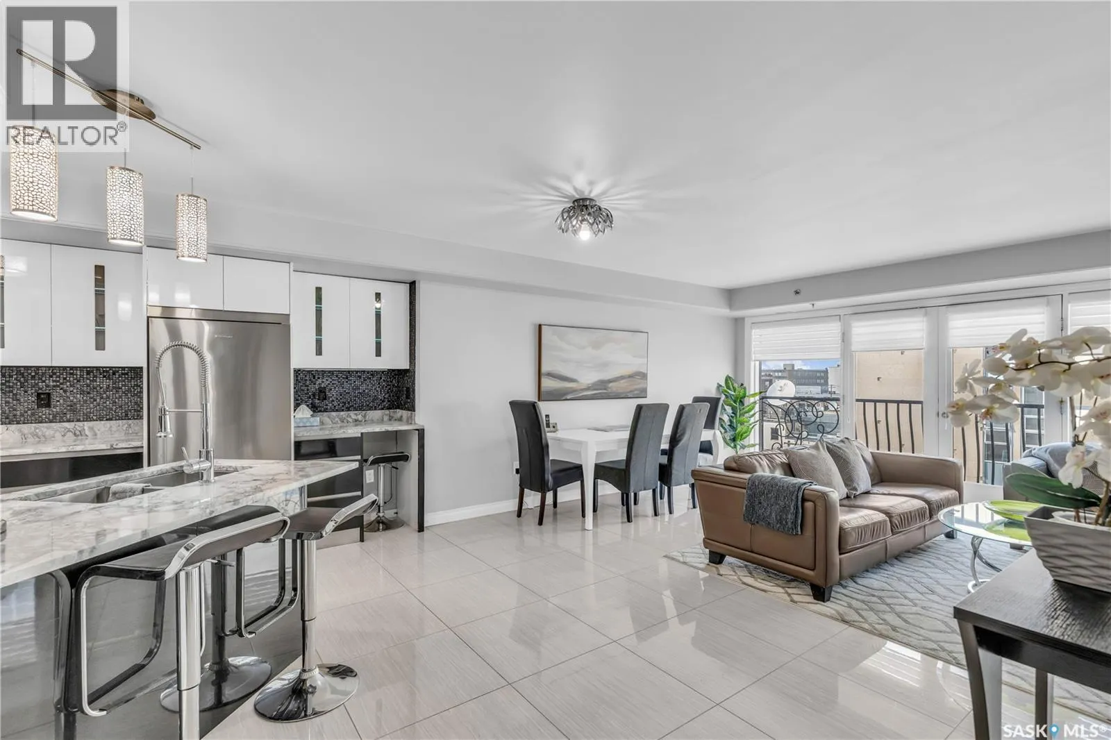 Fully-furnished top-floor executive suite with 2 bedrooms, 2 bathrooms and 2 Underground Parking Stalls! Historic elegance meets modern luxury at the Residences at King George. This iconic landmark is close to shops, dining and just a few blocks from the scenic riverfront. Luxurious limestone tile flows throughout, and floor to ceiling windows provide tons of natural light. The kitchen features sleek granite countertops and high-gloss white cabinetry with glass shelving and built-in accent lighting. A full stainless steel appliance package adds to the kitchenâs functionality and style. Two sizeable bedrooms provide plenty of room for rest and relaxation, with ample closet space. The primary bedroom includes a private ensuite bathroom, ensuring a touch of luxury and privacy. The second bedroom is equally spacious, with easy access to the main bathroom, making it perfect for guests or a home office. Enjoy the convenience of in-suite laundry, and two secure underground parking spaces, providing peace of mind and protection for your vehicle year-round. For those who love to entertain or simply relax outdoors, you'll have access to a stunning rooftop deck. Complete with fully equipped outdoor kitchen, this expansive space is perfect for hosting friends or unwinding while taking in panoramic views of Saskatoon. Don't miss this chance to experience the best of historic charm and contemporary luxury at the Residences at King George. (id:27476)