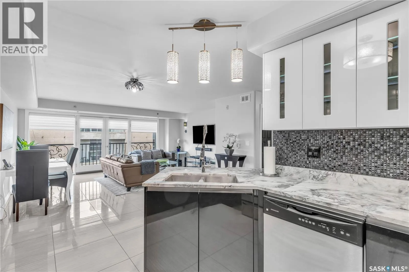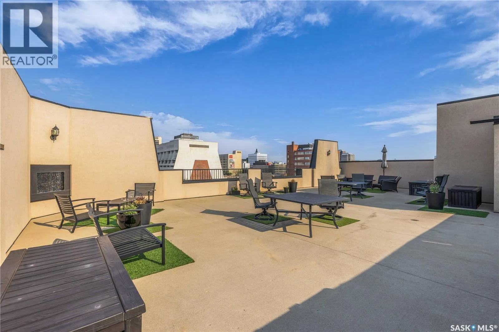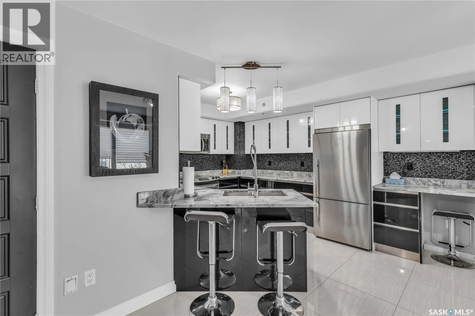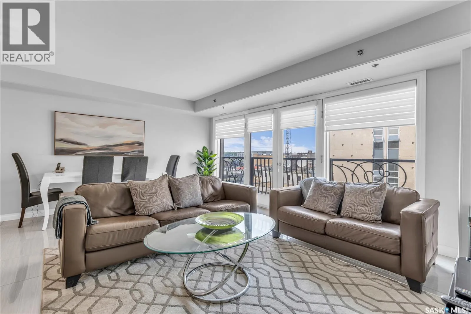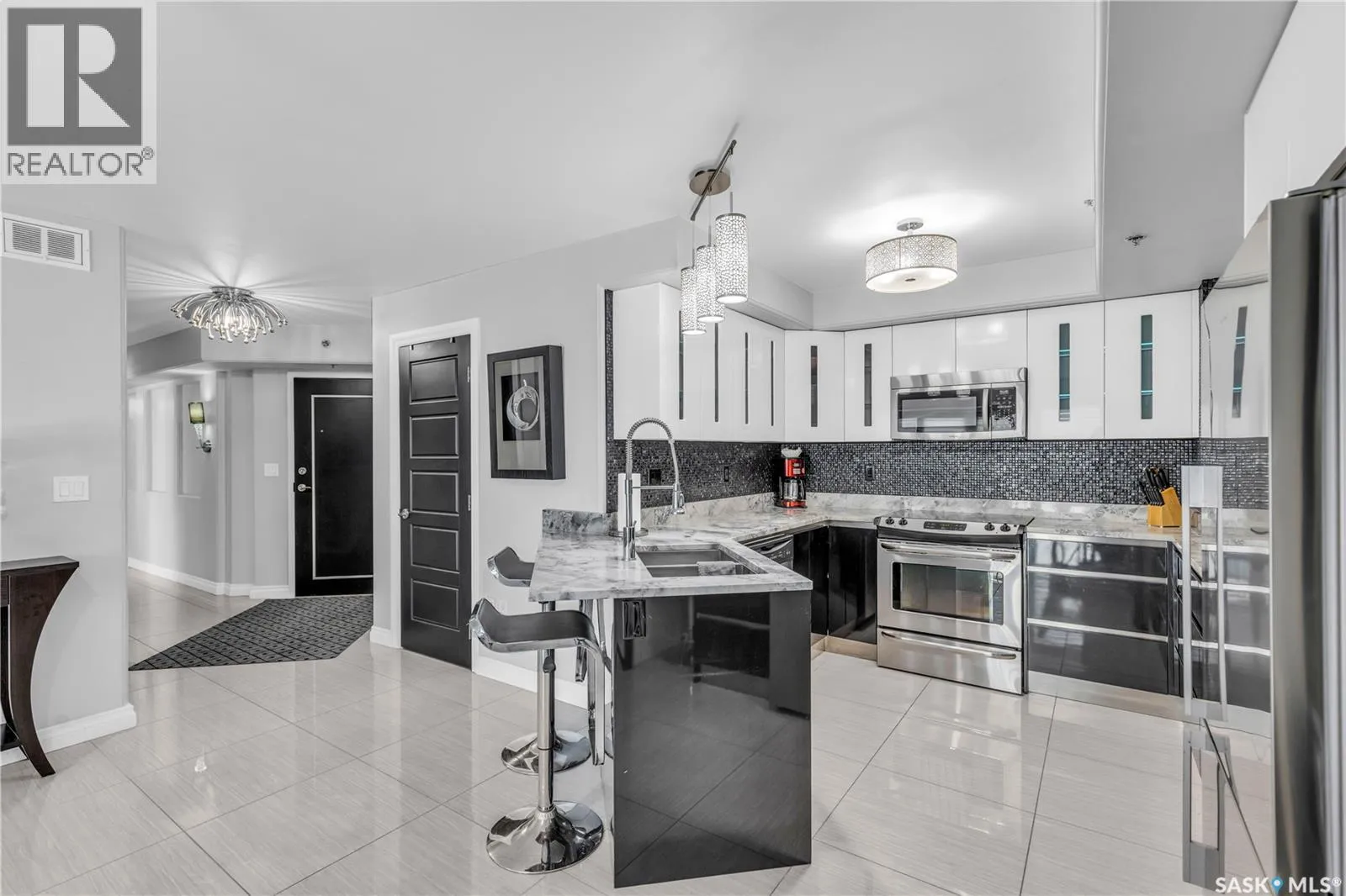 Fully-furnished top-floor executive suite with 2 bedrooms, 2 bathrooms and 2 Underground Parking Stalls! Historic elegance meets modern luxury at the Residences at King George. This iconic landmark is close to shops, dining and just a few blocks from the scenic riverfront. Luxurious limestone tile flows throughout, and floor to ceiling windows provide tons of natural light. The kitchen features sleek granite countertops and high-gloss white cabinetry with glass shelving and built-in accent lighting. A full stainless steel appliance package adds to the kitchenâs functionality and style. Two sizeable bedrooms provide plenty of room for rest and relaxation, with ample closet space. The primary bedroom includes a private ensuite bathroom, ensuring a touch of luxury and privacy. The second bedroom is equally spacious, with easy access to the main bathroom, making it perfect for guests or a home office. Enjoy the convenience of in-suite laundry, and two secure underground parking spaces, providing peace of mind and protection for your vehicle year-round. For those who love to entertain or simply relax outdoors, you'll have access to a stunning rooftop deck. Complete with fully equipped outdoor kitchen, this expansive space is perfect for hosting friends or unwinding while taking in panoramic views of Saskatoon. Don't miss this chance to experience the best of historic charm and contemporary luxury at the Residences at King George. (id:27476)