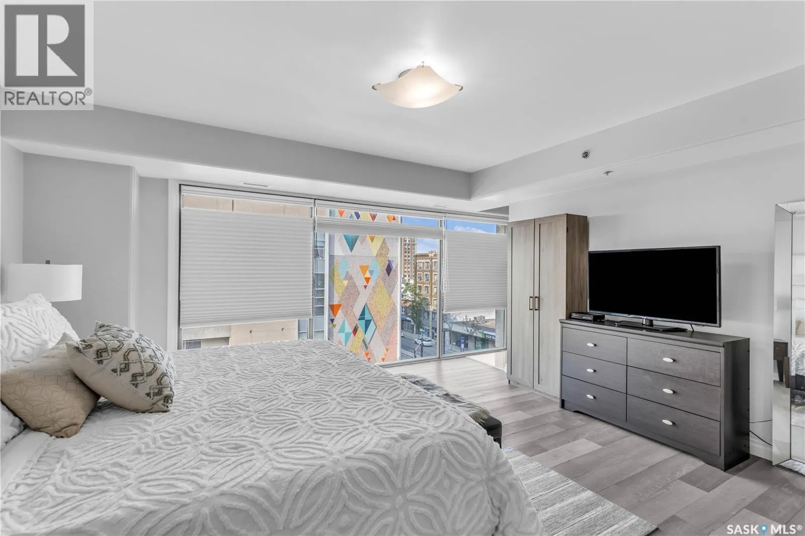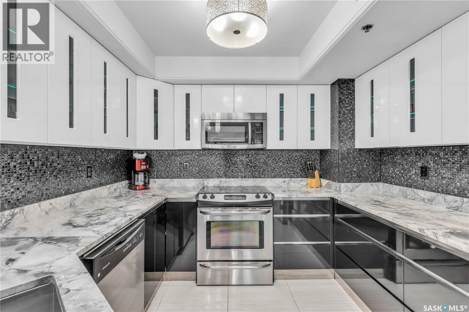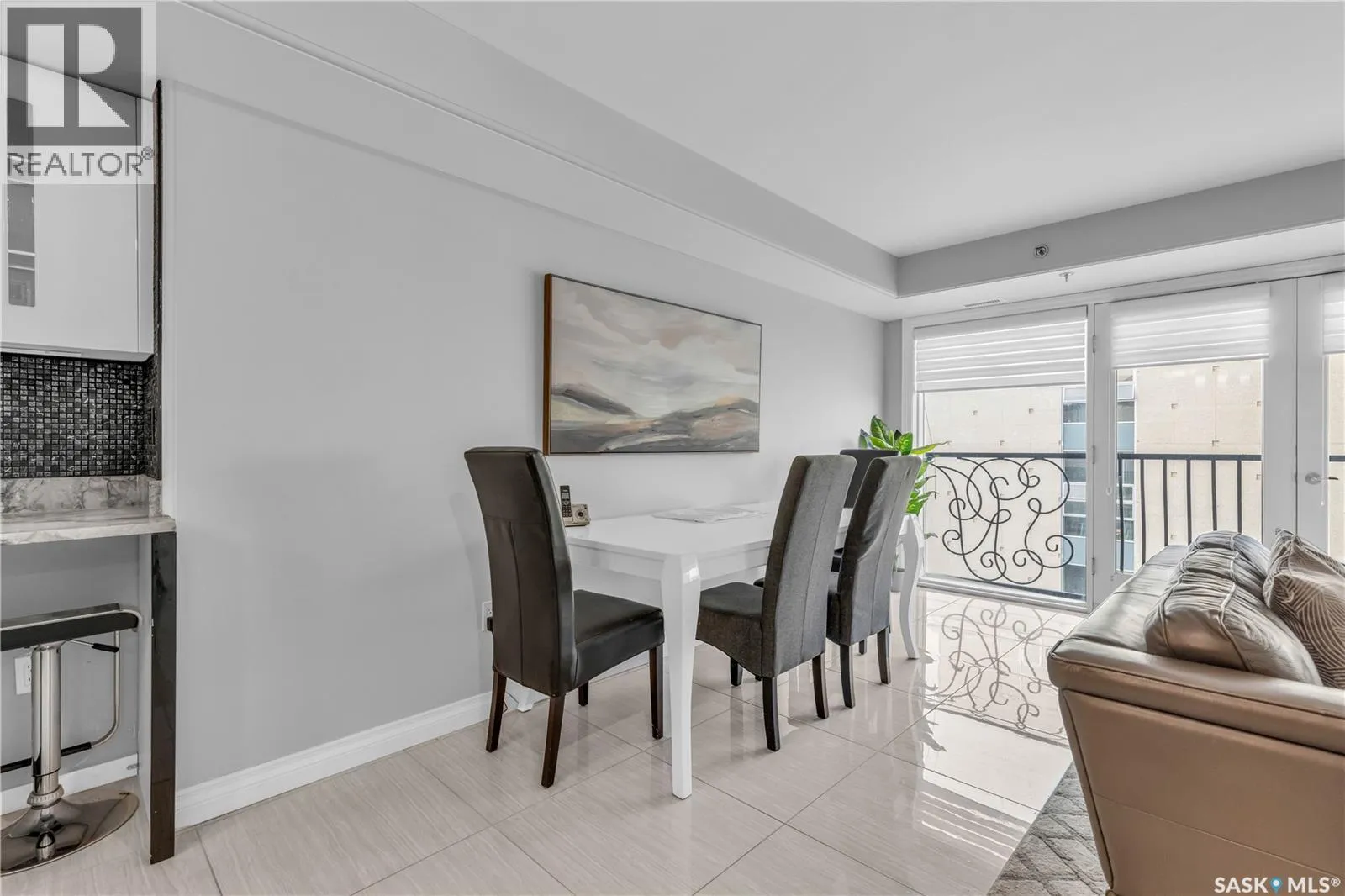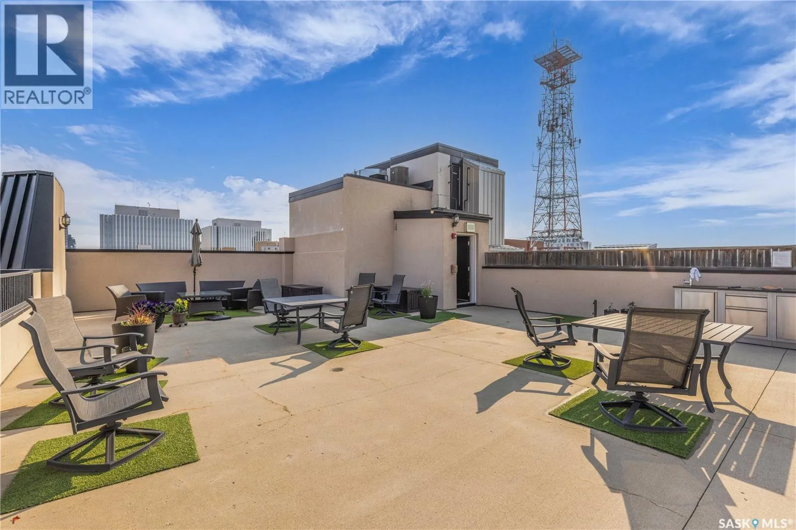 Fully-furnished top-floor executive suite with 2 bedrooms, 2 bathrooms and 2 Underground Parking Stalls! Historic elegance meets modern luxury at the Residences at King George. This iconic landmark is close to shops, dining and just a few blocks from the scenic riverfront. Luxurious limestone tile flows throughout, and floor to ceiling windows provide tons of natural light. The kitchen features sleek granite countertops and high-gloss white cabinetry with glass shelving and built-in accent lighting. A full stainless steel appliance package adds to the kitchenâs functionality and style. Two sizeable bedrooms provide plenty of room for rest and relaxation, with ample closet space. The primary bedroom includes a private ensuite bathroom, ensuring a touch of luxury and privacy. The second bedroom is equally spacious, with easy access to the main bathroom, making it perfect for guests or a home office. Enjoy the convenience of in-suite laundry, and two secure underground parking spaces, providing peace of mind and protection for your vehicle year-round. For those who love to entertain or simply relax outdoors, you'll have access to a stunning rooftop deck. Complete with fully equipped outdoor kitchen, this expansive space is perfect for hosting friends or unwinding while taking in panoramic views of Saskatoon. Don't miss this chance to experience the best of historic charm and contemporary luxury at the Residences at King George. (id:27476)