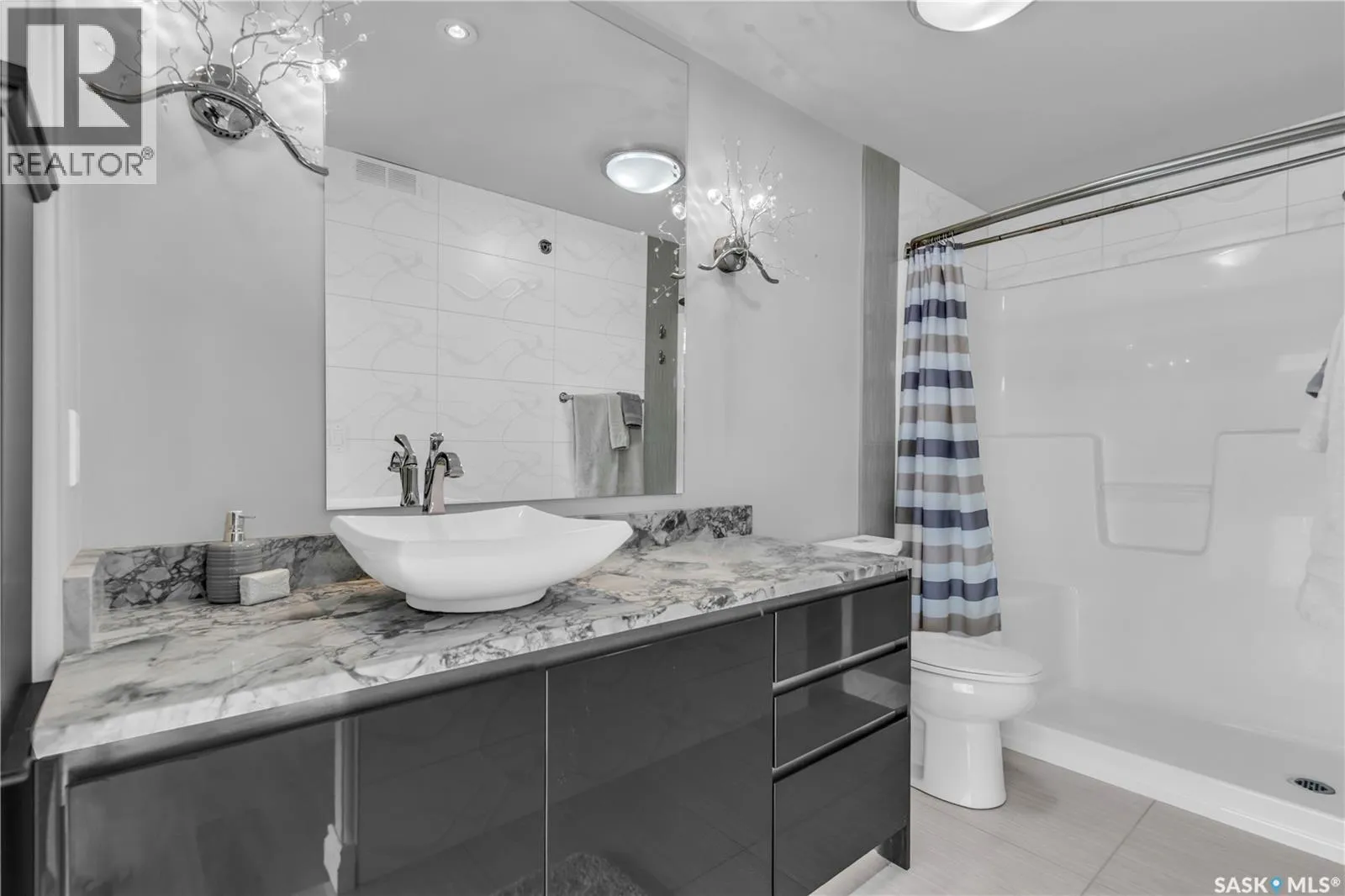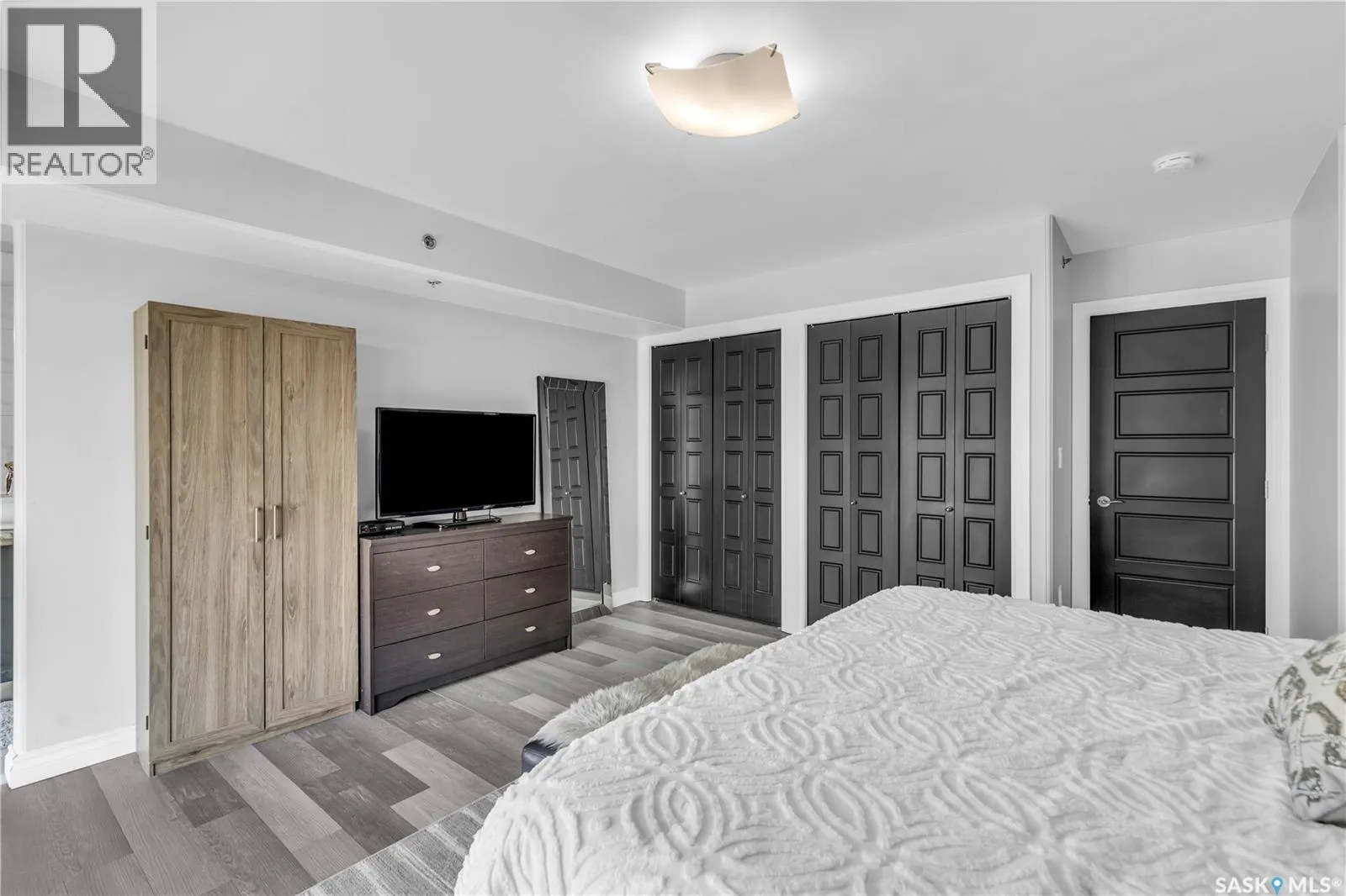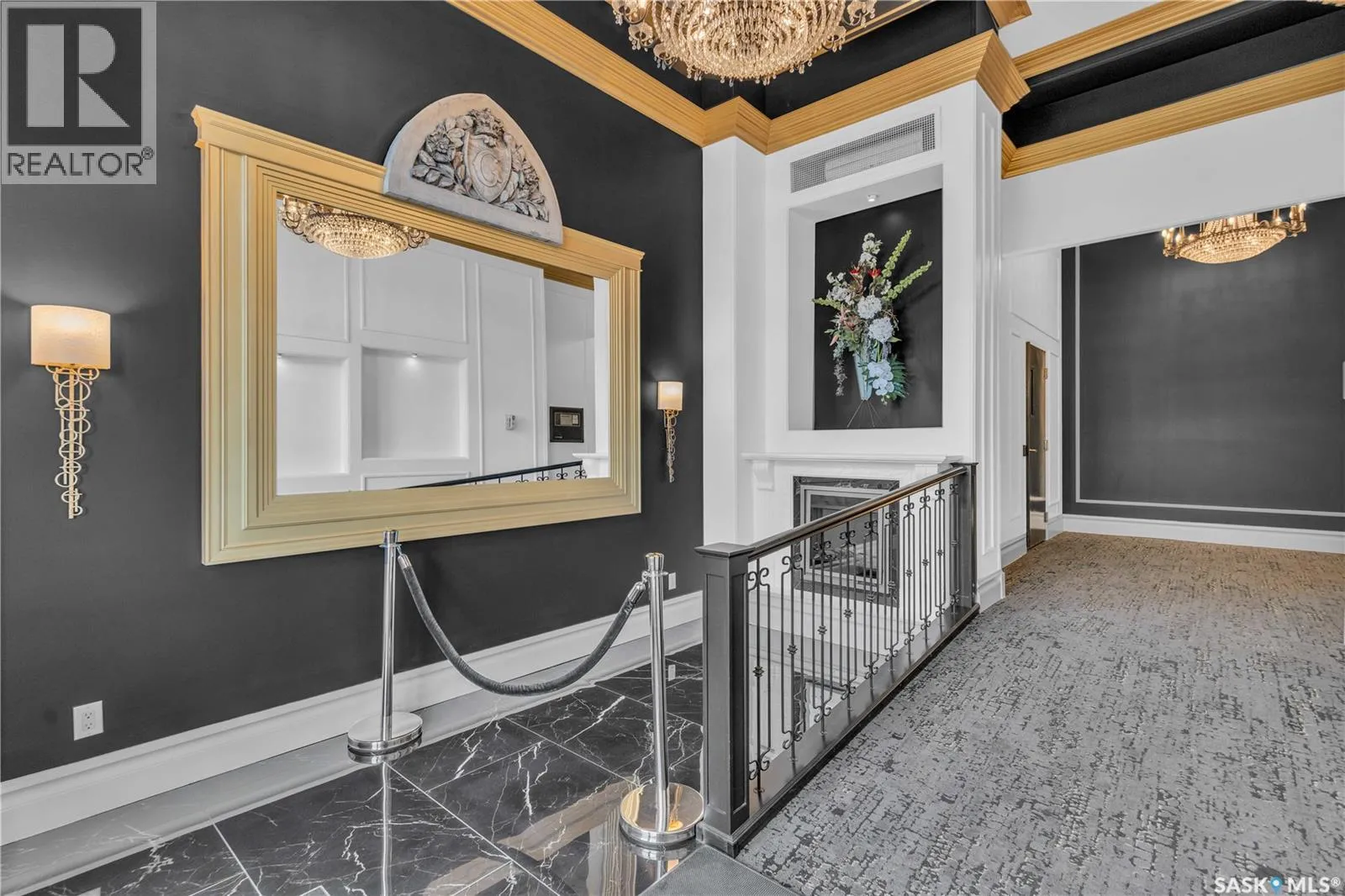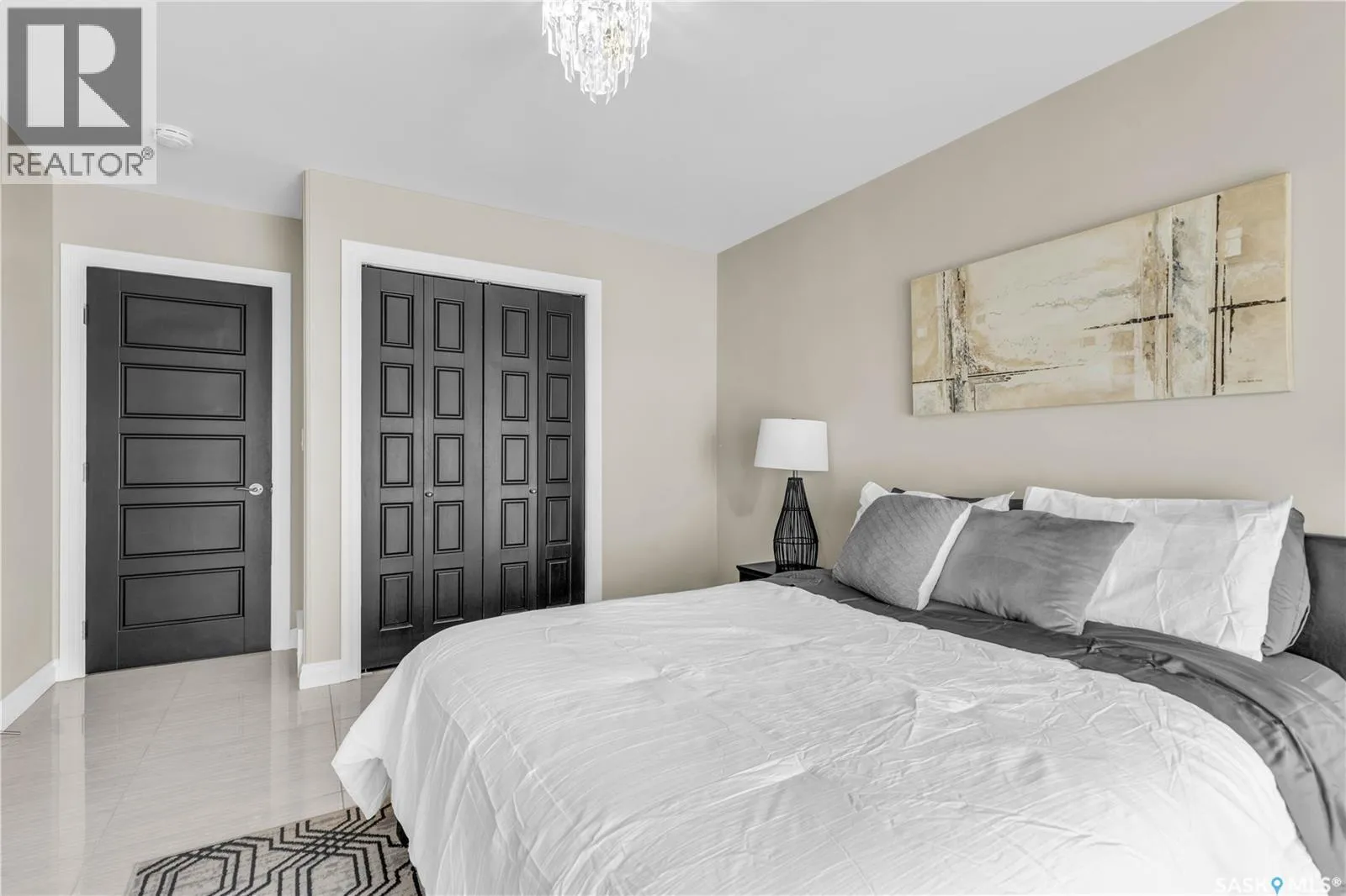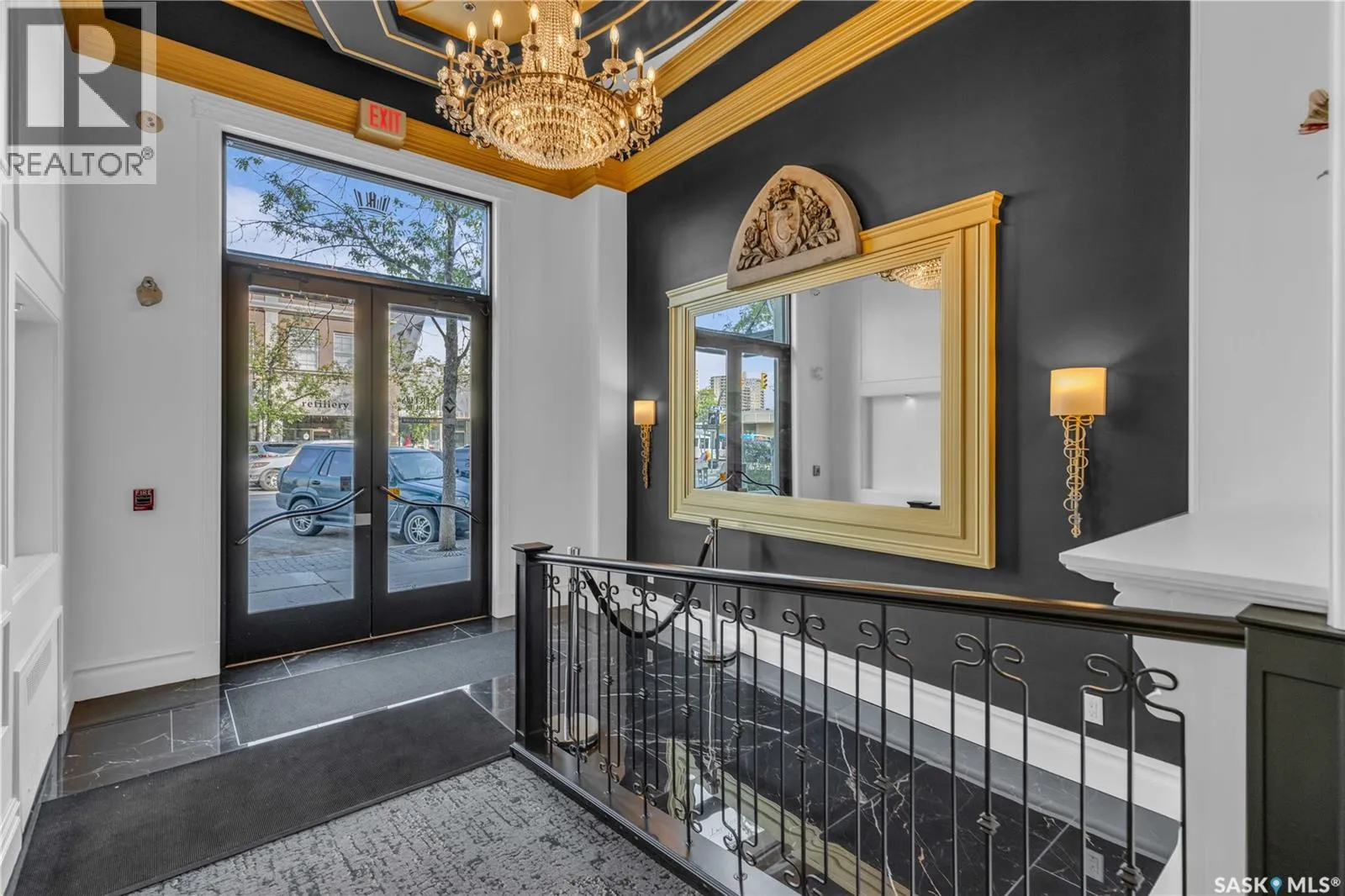 Fully-furnished top-floor executive suite with 2 bedrooms, 2 bathrooms and 2 Underground Parking Stalls! Historic elegance meets modern luxury at the Residences at King George. This iconic landmark is close to shops, dining and just a few blocks from the scenic riverfront. Luxurious limestone tile flows throughout, and floor to ceiling windows provide tons of natural light. The kitchen features sleek granite countertops and high-gloss white cabinetry with glass shelving and built-in accent lighting. A full stainless steel appliance package adds to the kitchenâs functionality and style. Two sizeable bedrooms provide plenty of room for rest and relaxation, with ample closet space. The primary bedroom includes a private ensuite bathroom, ensuring a touch of luxury and privacy. The second bedroom is equally spacious, with easy access to the main bathroom, making it perfect for guests or a home office. Enjoy the convenience of in-suite laundry, and two secure underground parking spaces, providing peace of mind and protection for your vehicle year-round. For those who love to entertain or simply relax outdoors, you'll have access to a stunning rooftop deck. Complete with fully equipped outdoor kitchen, this expansive space is perfect for hosting friends or unwinding while taking in panoramic views of Saskatoon. Don't miss this chance to experience the best of historic charm and contemporary luxury at the Residences at King George. (id:27476)