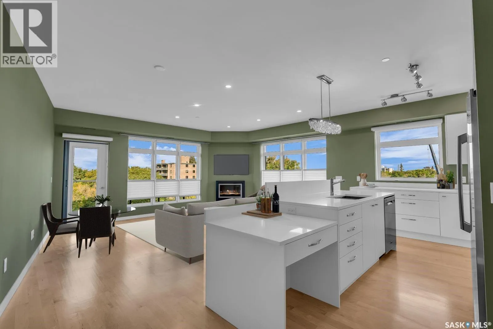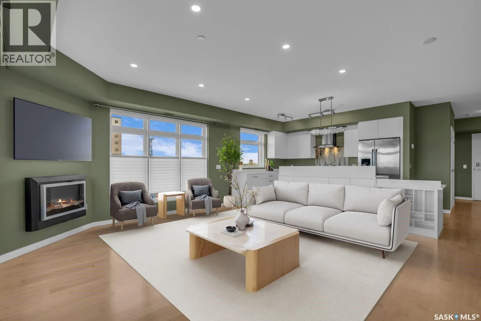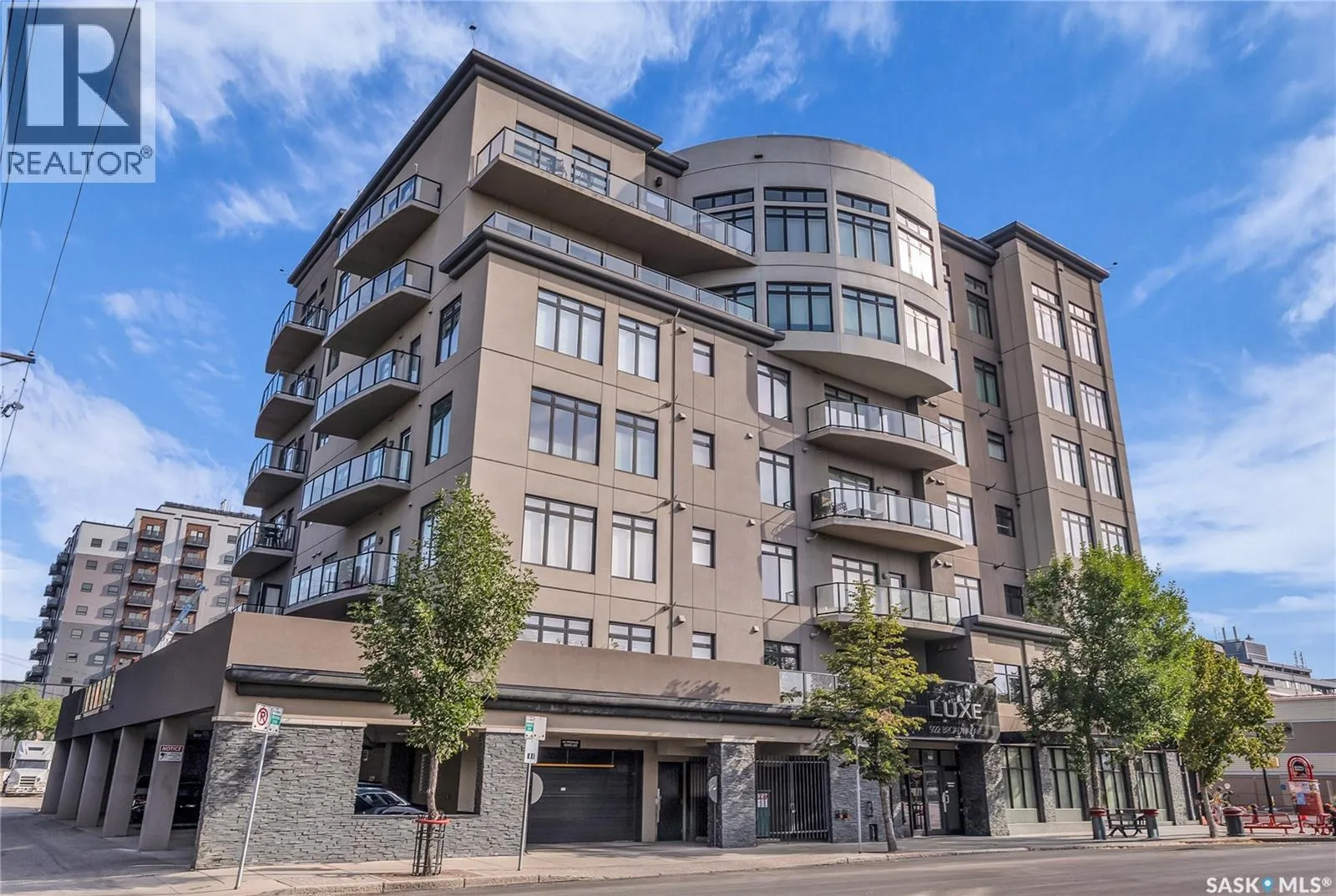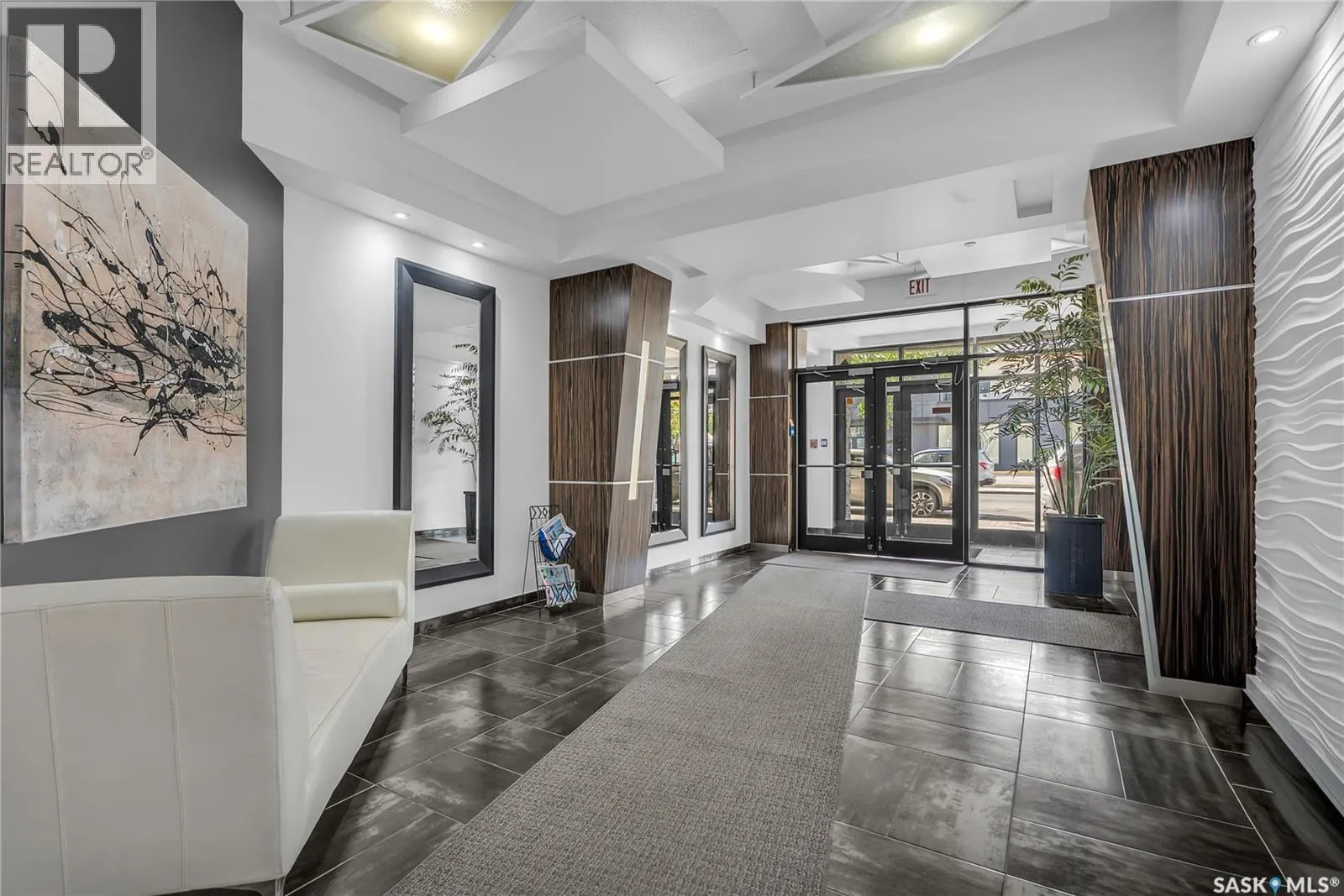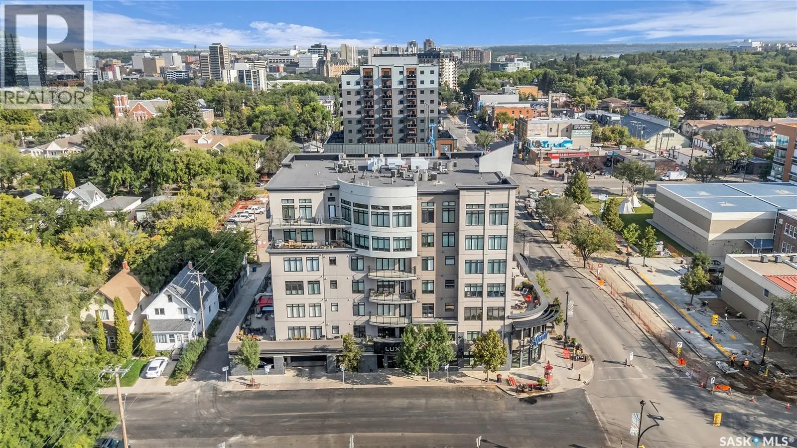 Welcome to the prestigious Luxe offering an exceptional combination of sophistication, comfort, and thoughtful upgrades. The suite features two spacious bedrooms, two beautifully appointed bathrooms, the rare luxury of two balconies, two underground parking stalls, and two external storage areas. The open concept main area is bright and inviting, with ceiling lighting added in 2018 to enhance the living and dining spaces. The kitchen is both stylish and functional, boasting a new dishwasher and smart renovations that introduced custom cabinets to the island, a built-in desk with wine storage, and striking display shelving. Additional upgrades include Hunter Douglas PowerView blinds on seven openings, triple-glazed balcony doors, and west-facing upgraded windows (2022). A true rarity in the condo market, the primary suite was redesigned with both elegance and accessibility in mind. It offers closet organizers and a spa-inspired ensuite that is perfectly suited for people with physical limitations. Features include heated non-glare tile floors, a Toto washlet, a double shower, an accessible sink unit, reinforced walls with integrated towel/assist rails, custom display shelving, thoughtful lighting and convenient laundry bins concealed within cabinetry. The second bathroom was also enhanced with new tile floors and freshly painted walls, while the laundry room was outfitted with cabinets and a collapsible folding table. Throughout the condo, hardwood floors were refinished, and every detail was carefully considered, from art and office storage solutions to built-in cabinetry that maximizes both form and function. Broadway offers an array of amenities within walking distance and is home to Saskatoonâs beloved Fringe Festival, Broadway Street Fair, and some of the cityâs finest pubs and restaurants, also you are just a short walk to the downtown core and the South Saskatchewan River. Note:Some photos have been virtually staged (id:27476)
