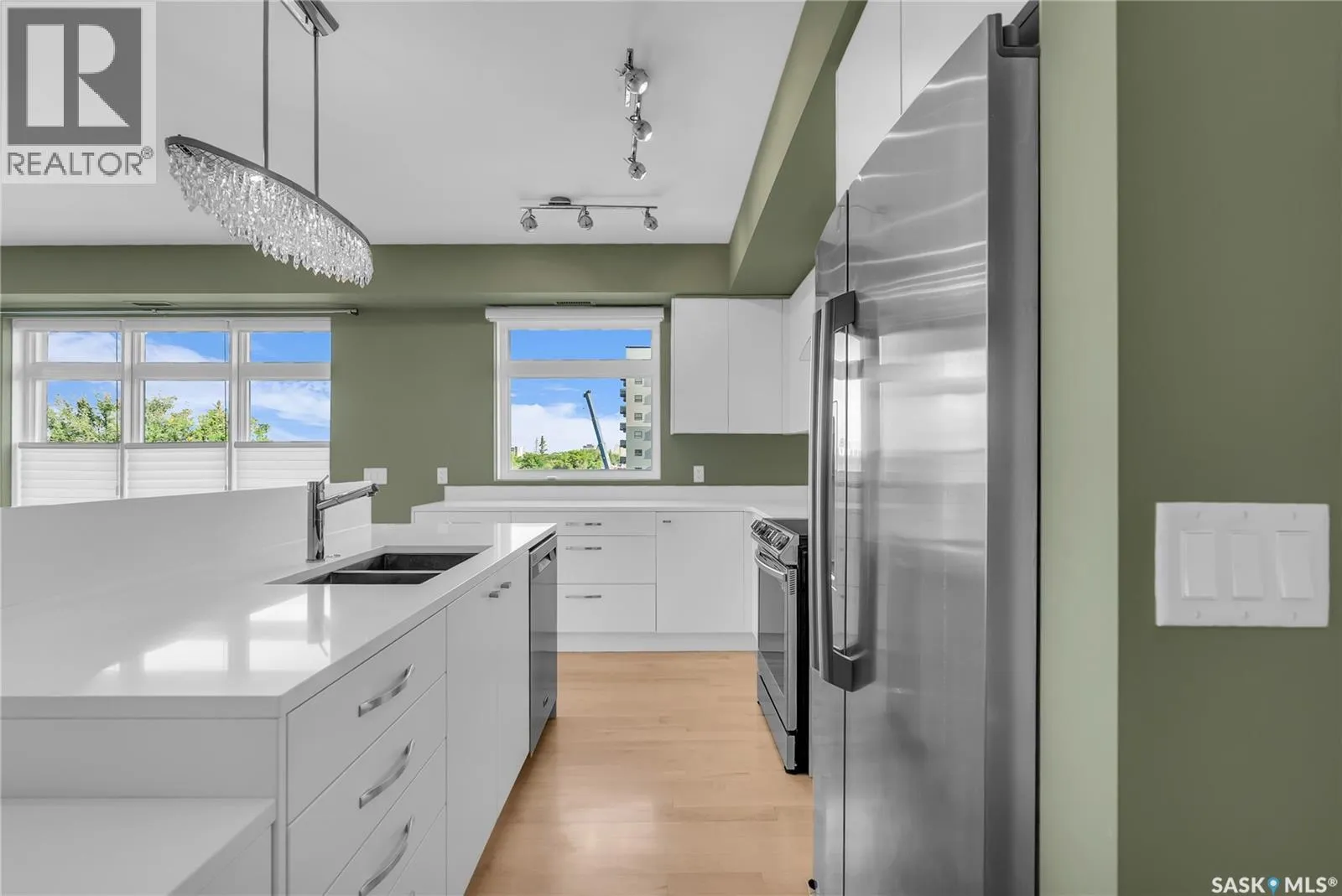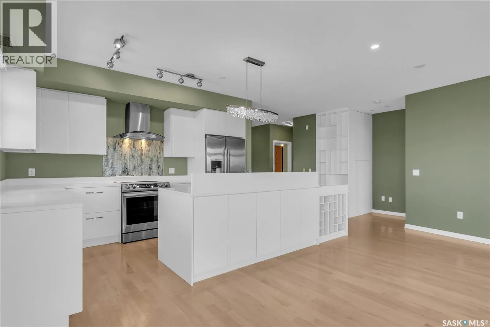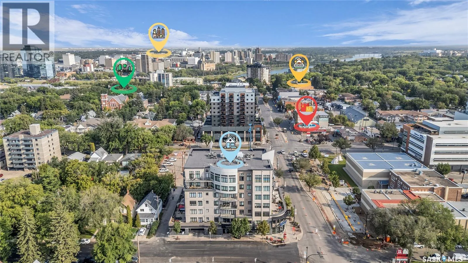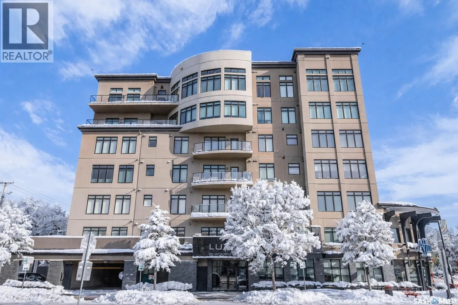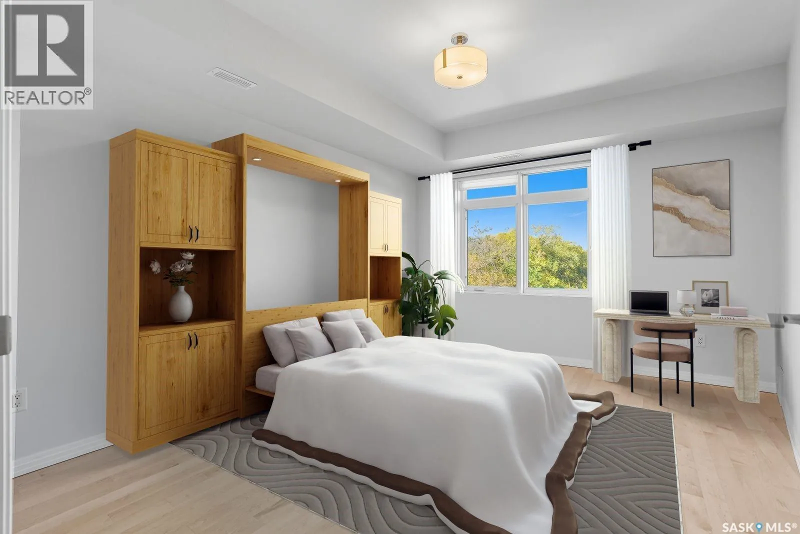 Welcome to the prestigious Luxe offering an exceptional combination of sophistication, comfort, and thoughtful upgrades. The suite features two spacious bedrooms, two beautifully appointed bathrooms, the rare luxury of two balconies, two underground parking stalls, and two external storage areas. The open concept main area is bright and inviting, with ceiling lighting added in 2018 to enhance the living and dining spaces. The kitchen is both stylish and functional, boasting a new dishwasher and smart renovations that introduced custom cabinets to the island, a built-in desk with wine storage, and striking display shelving. Additional upgrades include Hunter Douglas PowerView blinds on seven openings, triple-glazed balcony doors, and west-facing upgraded windows (2022). A true rarity in the condo market, the primary suite was redesigned with both elegance and accessibility in mind. It offers closet organizers and a spa-inspired ensuite that is perfectly suited for people with physical limitations. Features include heated non-glare tile floors, a Toto washlet, a double shower, an accessible sink unit, reinforced walls with integrated towel/assist rails, custom display shelving, thoughtful lighting and convenient laundry bins concealed within cabinetry. The second bathroom was also enhanced with new tile floors and freshly painted walls, while the laundry room was outfitted with cabinets and a collapsible folding table. Throughout the condo, hardwood floors were refinished, and every detail was carefully considered, from art and office storage solutions to built-in cabinetry that maximizes both form and function. Broadway offers an array of amenities within walking distance and is home to Saskatoonâs beloved Fringe Festival, Broadway Street Fair, and some of the cityâs finest pubs and restaurants, also you are just a short walk to the downtown core and the South Saskatchewan River. Note:Some photos have been virtually staged (id:27476)