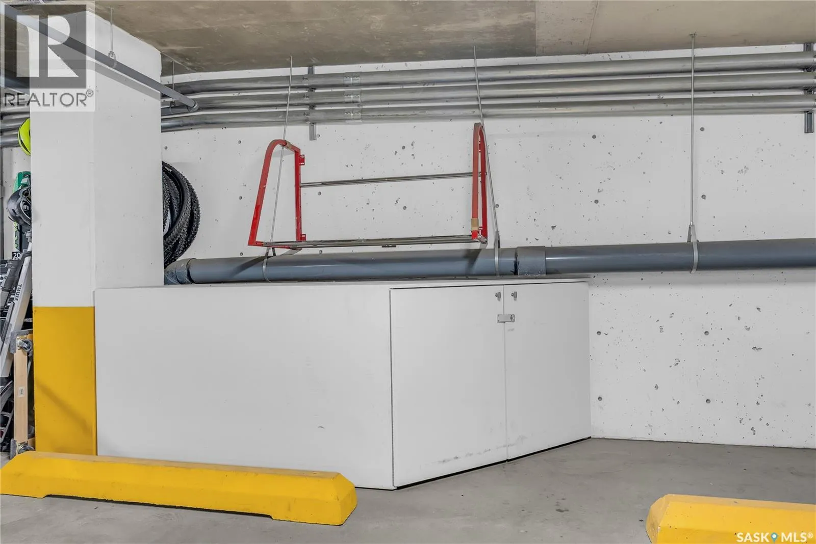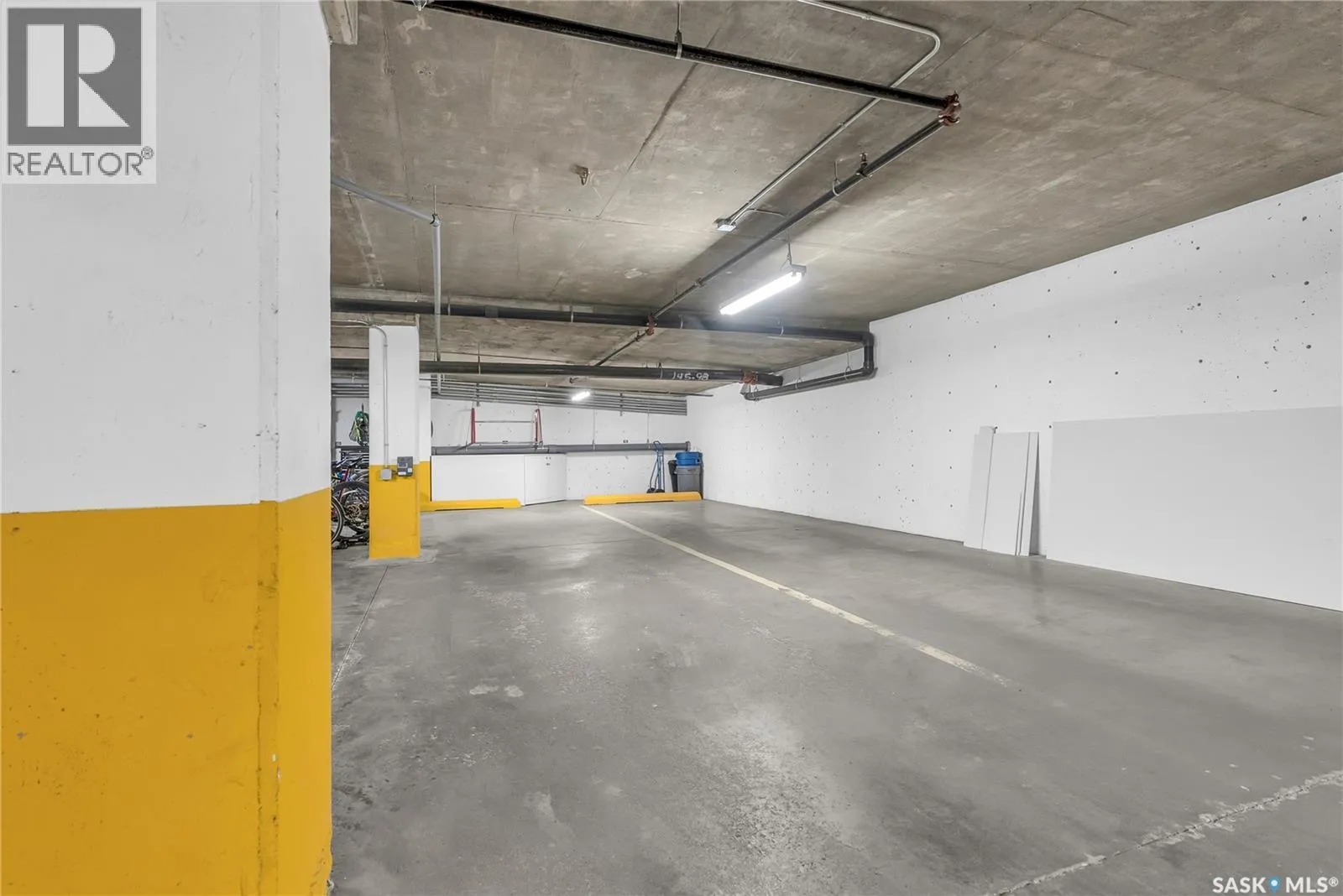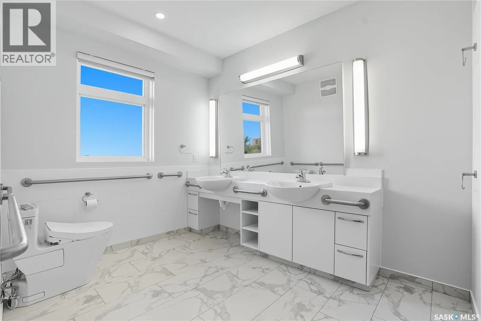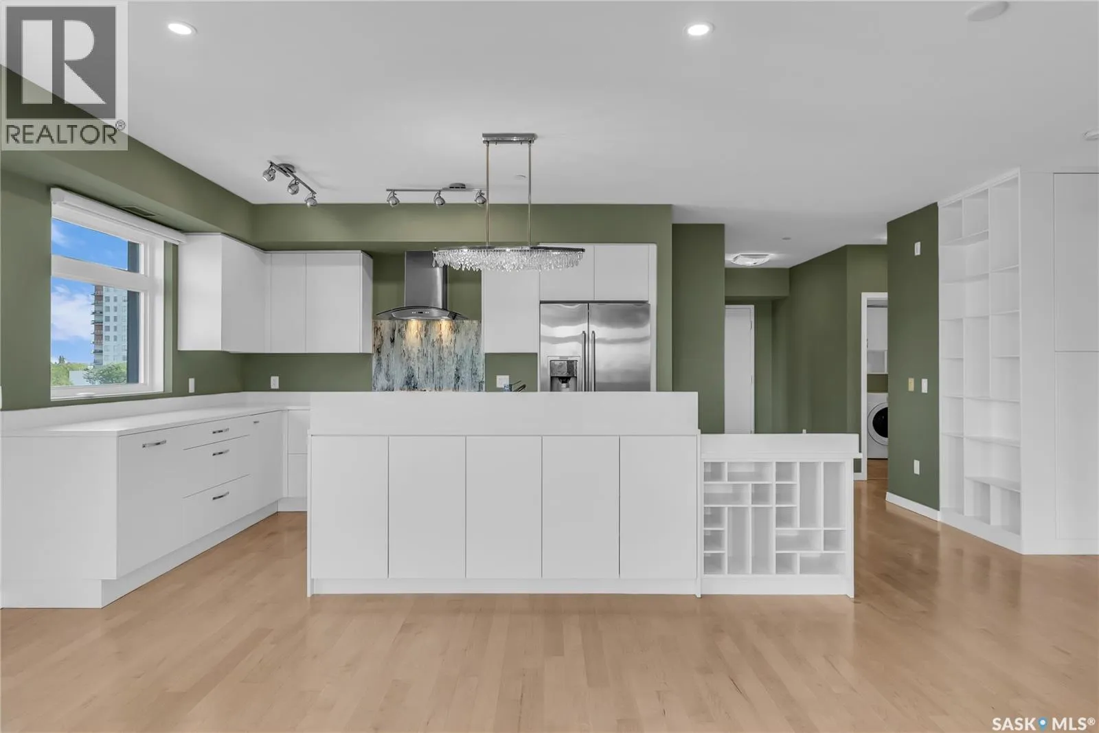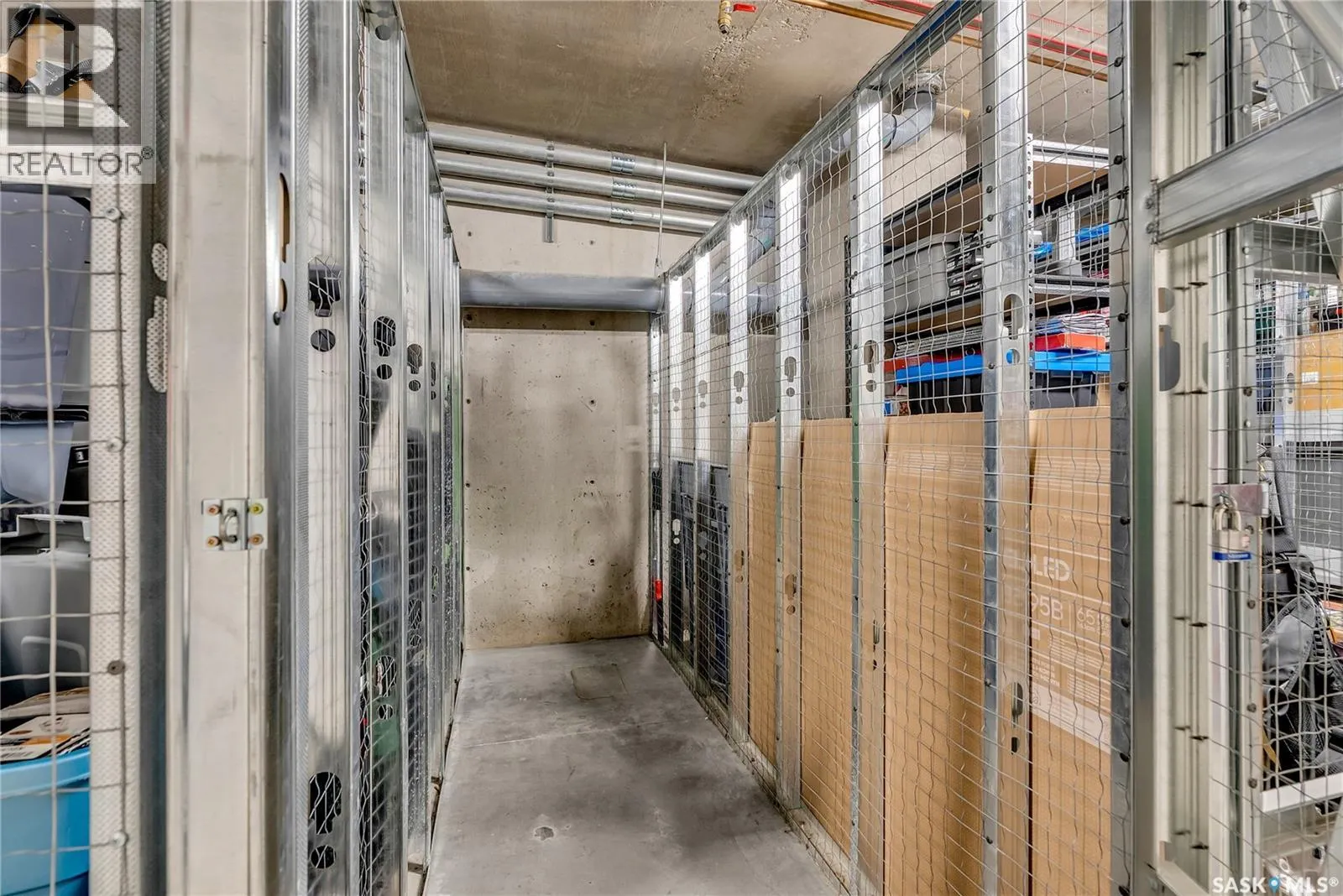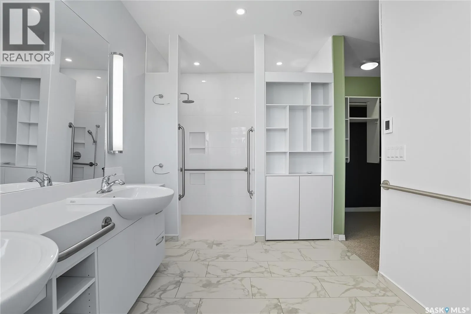 Welcome to the prestigious Luxe offering an exceptional combination of sophistication, comfort, and thoughtful upgrades. The suite features two spacious bedrooms, two beautifully appointed bathrooms, the rare luxury of two balconies, two underground parking stalls, and two external storage areas. The open concept main area is bright and inviting, with ceiling lighting added in 2018 to enhance the living and dining spaces. The kitchen is both stylish and functional, boasting a new dishwasher and smart renovations that introduced custom cabinets to the island, a built-in desk with wine storage, and striking display shelving. Additional upgrades include Hunter Douglas PowerView blinds on seven openings, triple-glazed balcony doors, and west-facing upgraded windows (2022). A true rarity in the condo market, the primary suite was redesigned with both elegance and accessibility in mind. It offers closet organizers and a spa-inspired ensuite that is perfectly suited for people with physical limitations. Features include heated non-glare tile floors, a Toto washlet, a double shower, an accessible sink unit, reinforced walls with integrated towel/assist rails, custom display shelving, thoughtful lighting and convenient laundry bins concealed within cabinetry. The second bathroom was also enhanced with new tile floors and freshly painted walls, while the laundry room was outfitted with cabinets and a collapsible folding table. Throughout the condo, hardwood floors were refinished, and every detail was carefully considered, from art and office storage solutions to built-in cabinetry that maximizes both form and function. Broadway offers an array of amenities within walking distance and is home to Saskatoonâs beloved Fringe Festival, Broadway Street Fair, and some of the cityâs finest pubs and restaurants, also you are just a short walk to the downtown core and the South Saskatchewan River. Note:Some photos have been virtually staged (id:27476)