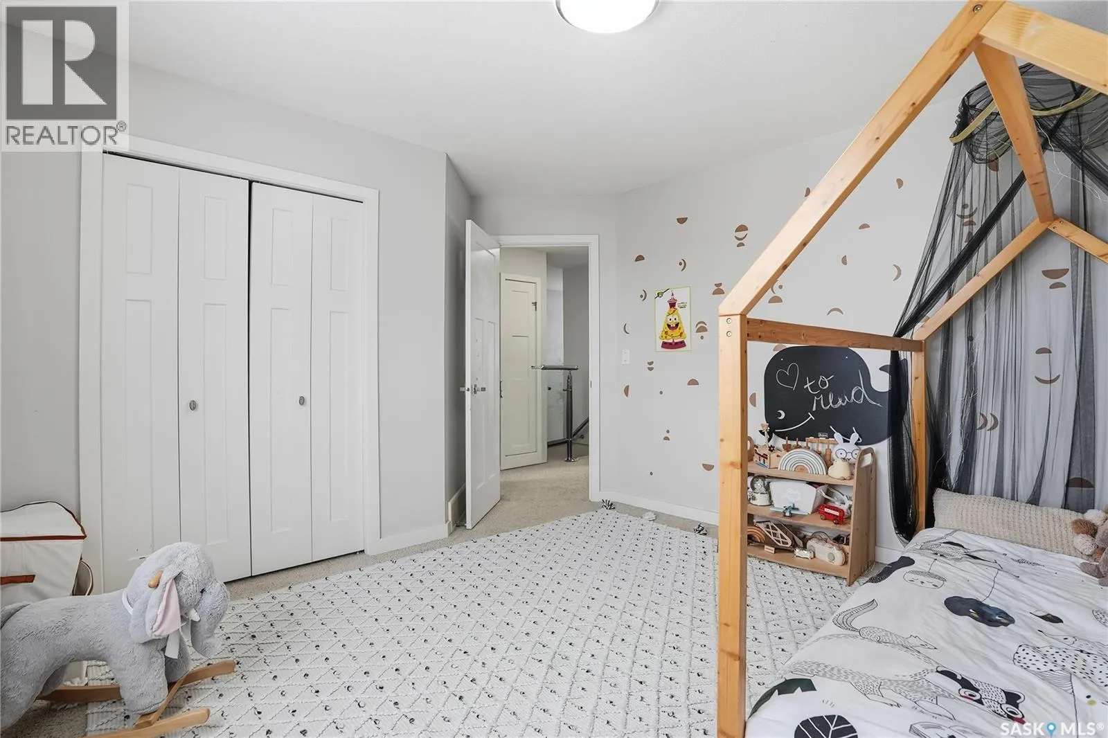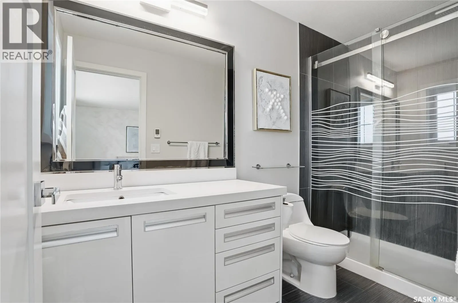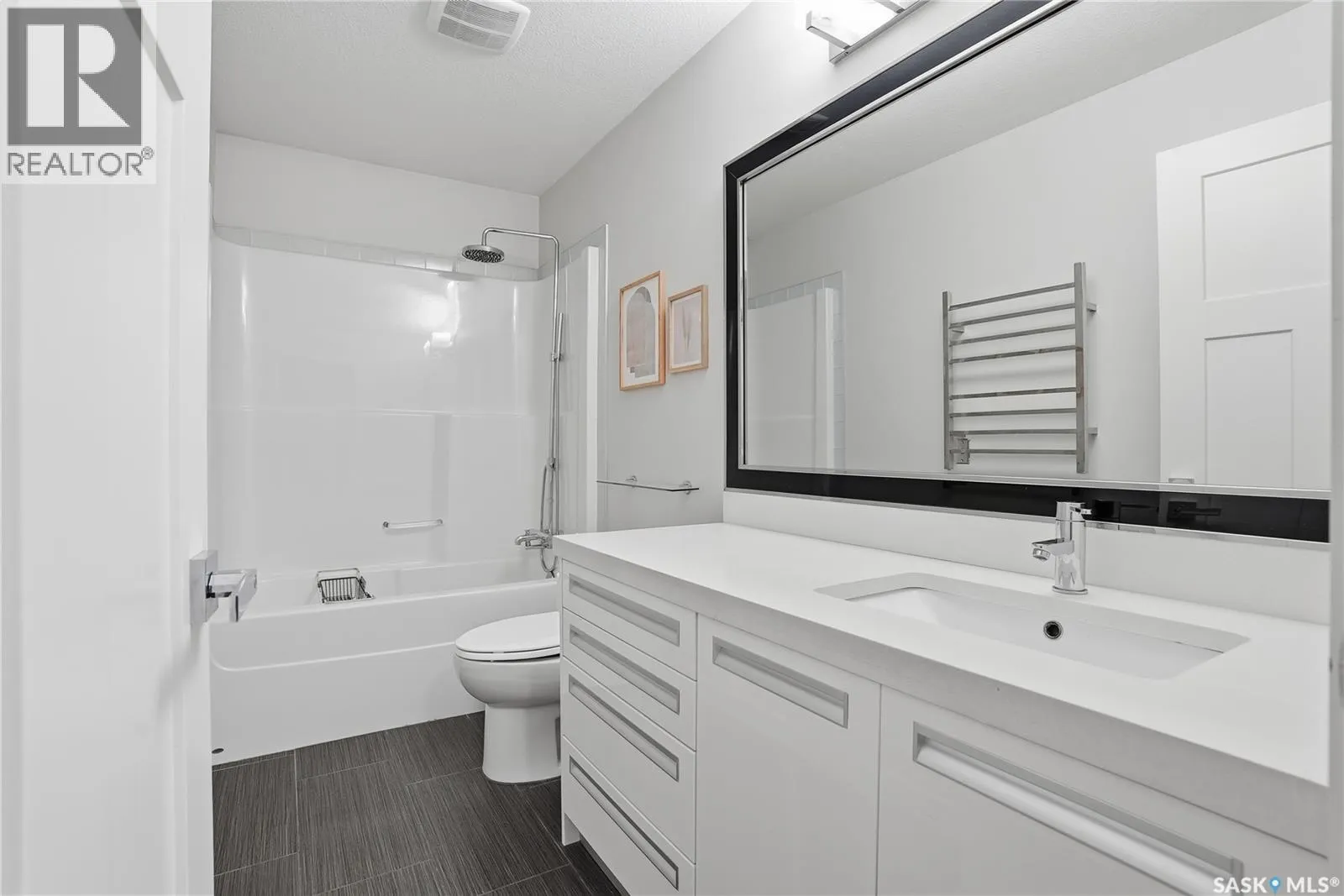 Great family home in the heart of Hampton Village with quick access to shopping, restaurants or Circle Drive to get you to the rest of the city quickly. You'll be impressed the minute you walk thru the ornate front door, greeted by gleaming hardwood floors in the front entry, there is a double wide coat closet and a wide hall that leads you to the attached garage door, the laundry closet and the 2pce bathroom with heated tile floor. The front entry hardwood flows across the main floor into the kitchen, dining room and living room. The kitchen is gorgeous with dark wood grain cabinets with a couple gull-wing glass doors, glass tile backsplash, quartz countertops and island top, stainless steel appliances and pendant lighting. The dining room is adjacent with double doors to the deck and backyard, and this level is open concept to the spacious living room with a grid paneling design feature wall all finished in contemporary white. Upstairs you find the master bedroom with cozy carpet flooring, a walkin closet that is organized with open shelving, drawers, shoe racks and hanger rods, built into the corner of this bedroom is a makeup center with more storage drawers on the bottom and glass gull-wing door cabinets above. The ensuite has a quartz vanity, ceramic tile heated floor and double wide shower with tiled walls and rain down shower head and a heated towel rack. This level also has 2 more spare bedrooms, linen closet and a 4pce bath also with quartz vanity and heated tiled floor and bathtub. The basement is unfinished but is plumbed for another bathroom, could have 2 more bedrooms, family room. The back yard is completely fenced, has a deck with aluminum rails and pergola frame, lawn, trees and shrubs. The double attached garage is insulated and boarded on the inside and the front driveway is double wide stamped and colored concrete. This house has very durable Hardy concrete board siding, Hi efficient furnace and water heater, a/c. (id:27476)