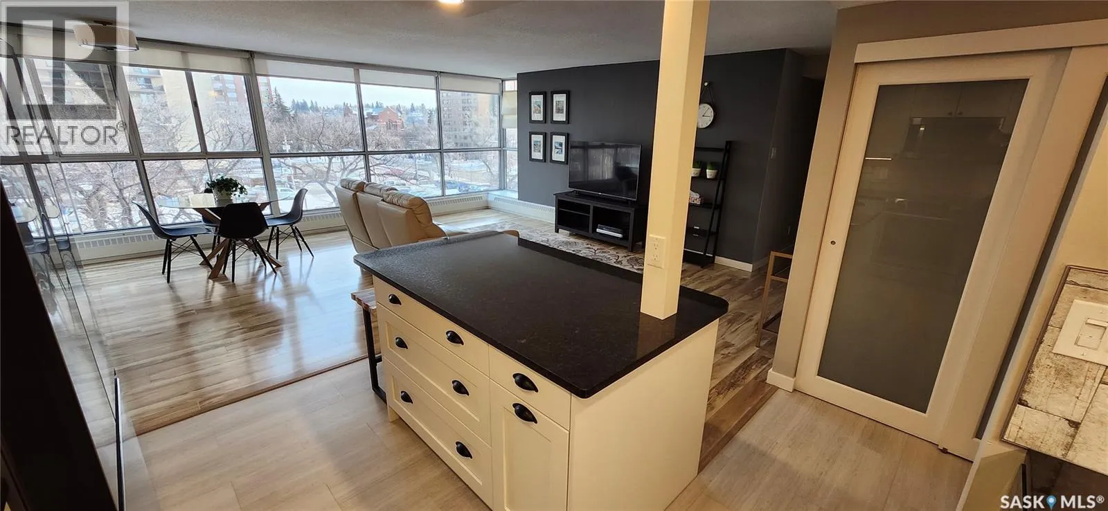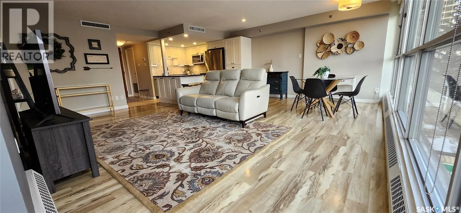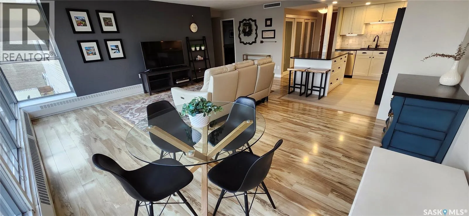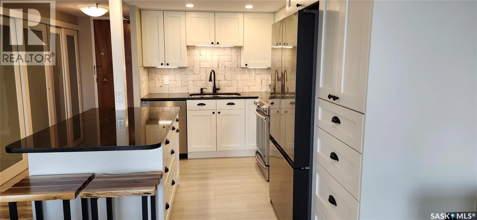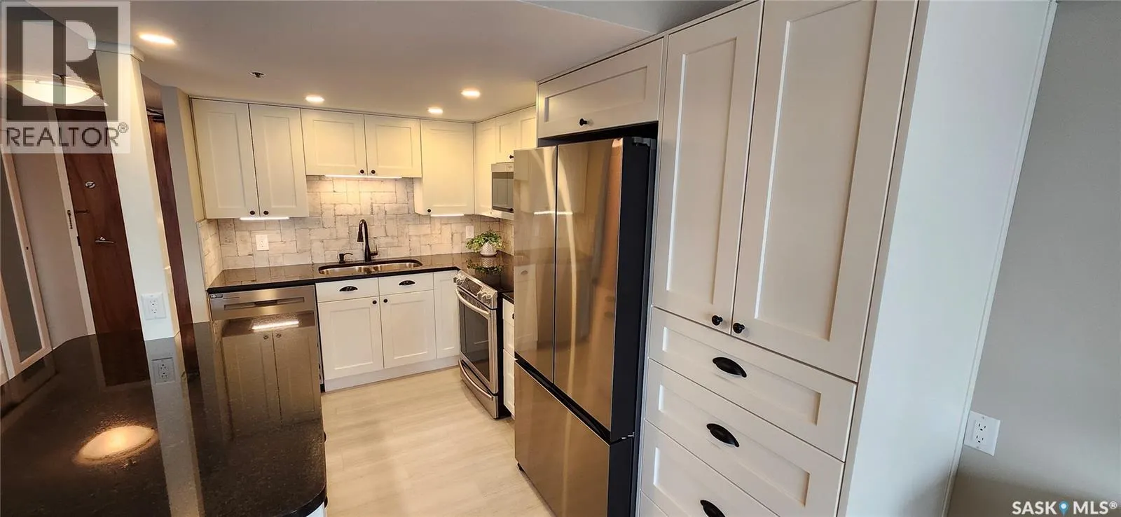Convenient, luxurious downtown living in The Terrace condo building. Walk to the river, the U of S, & downtown amenities. This immaculate 2 bedroom / 2 bath 1076 sq ft condo is light and bright with a wall of floor to ceiling east facing windows. The new kitchen is sure to impress with quality white cabinetry, granite countertops, undermount double sinks, stainless steel appliances, updated lighting, and a huge island for food prep or entertaining. Attention paid throughout with customized closets, pantry, and storage room to maximize storage space. Boiler & forced air heat & central air conditioning keep you comfortable. Indoor heated parking. The Terrace building amenities include a swimming pool, hot tub, sauna, 4th floor community room & outdoor patio/BBQ area, a guest suite + a roof top patio for 22nd floor panoramic views. This unit and building are definitely worth a look! (id:27476)