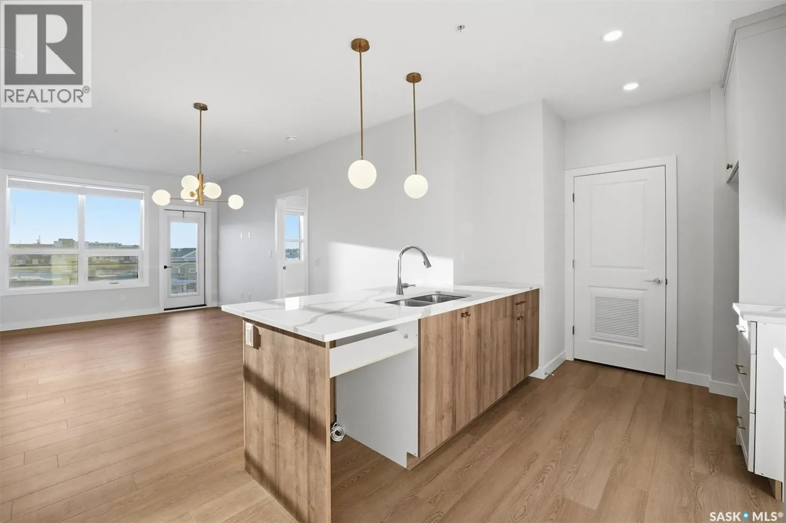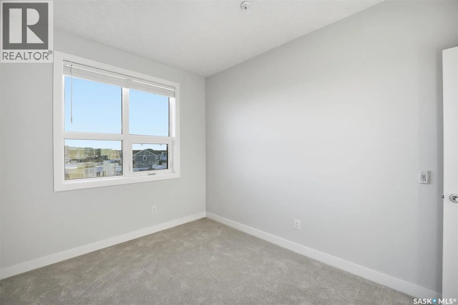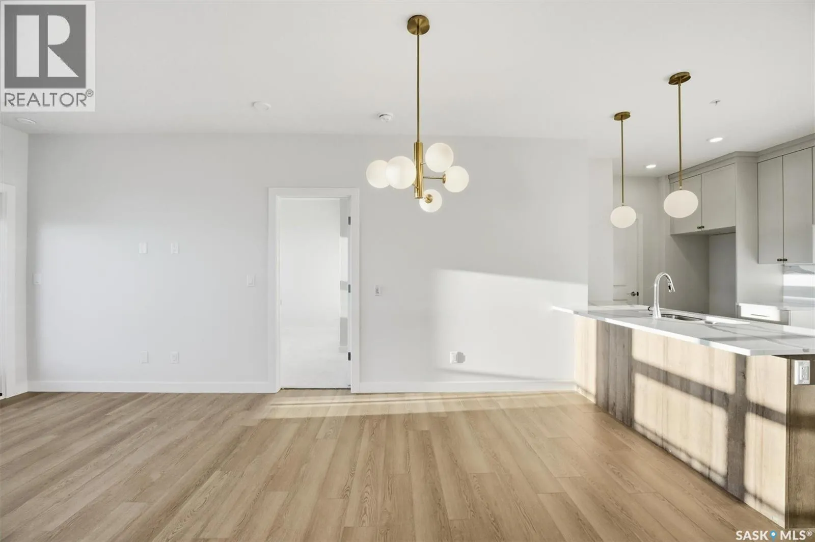 Welcome to âRYSE by North Ridge' located in Saskatoonâs growing community of Brighton! RYSE is a modernized apartment style condominium complex offering 1 bedroom, 2 bedroom, and 2 bedroom + den options. You will immediately notice the welcoming nature of RYSE the moment you step into the warm and inviting front entrance. Unit 1303 (Skyline layout) is a south east facing 964 sq ft condo with 2 bedrooms, 2 bathrooms, a den, separate laundry room, galley style kitchen, and dining/living areas. The interior features high end designer finishes, fixtures, countertops, and flooring, all with quality built craftsmanship. A private partially covered balcony awaits complete with duradeck, glass railing, natural gas bbq outlet, and electrical outlet. Each condo unit comes with a parking stall located in the heated parkade as well as a convenient storage room. Exterior parking stalls may be available to purchase. Each unit also includes a kitchen and laundry appliance package and air conditioning. RYSE has an amenity room for you to visit and relax featuring a bar area, comfortable seating, pool table, bathroom, and an outdoor patio lounge. GST and PST included in purchase price with any rebates to builder. Sask Home Warranty Premium Coverage Plan. This prime location is within a few minute walk to grocery/shopping/restaurants/bus and several other amenities. Show home hours are Mon thru Thurs 5-8PM and Weekends 12-5PM. Call to view! (id:27476)