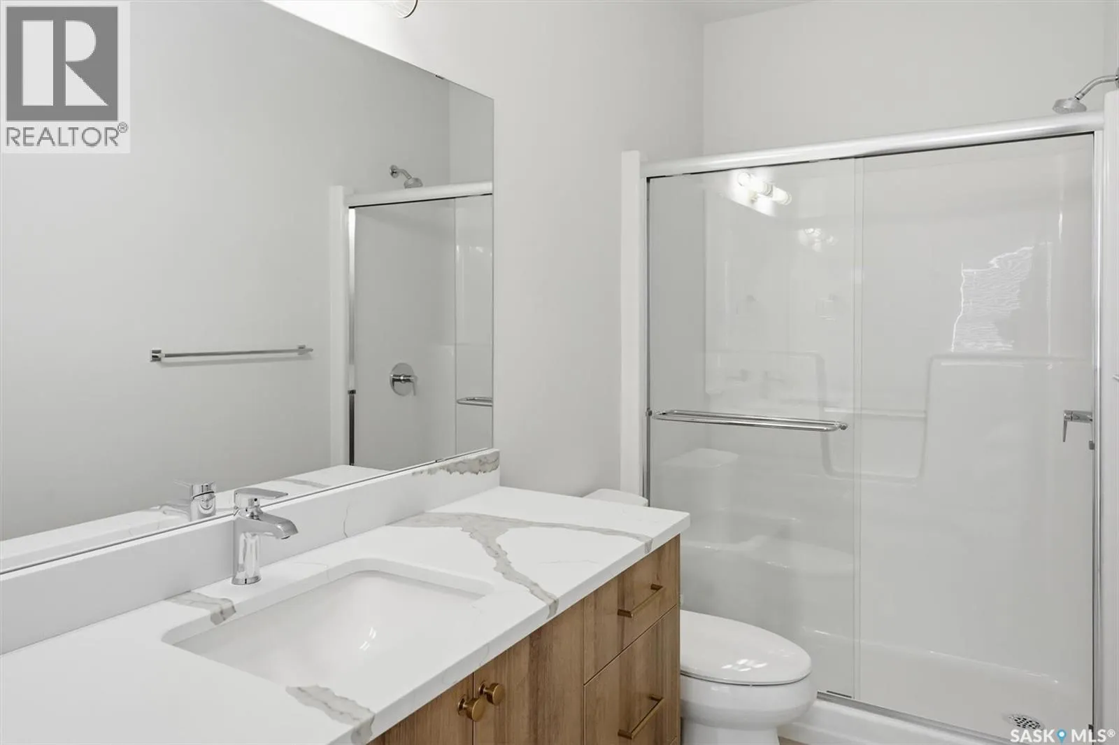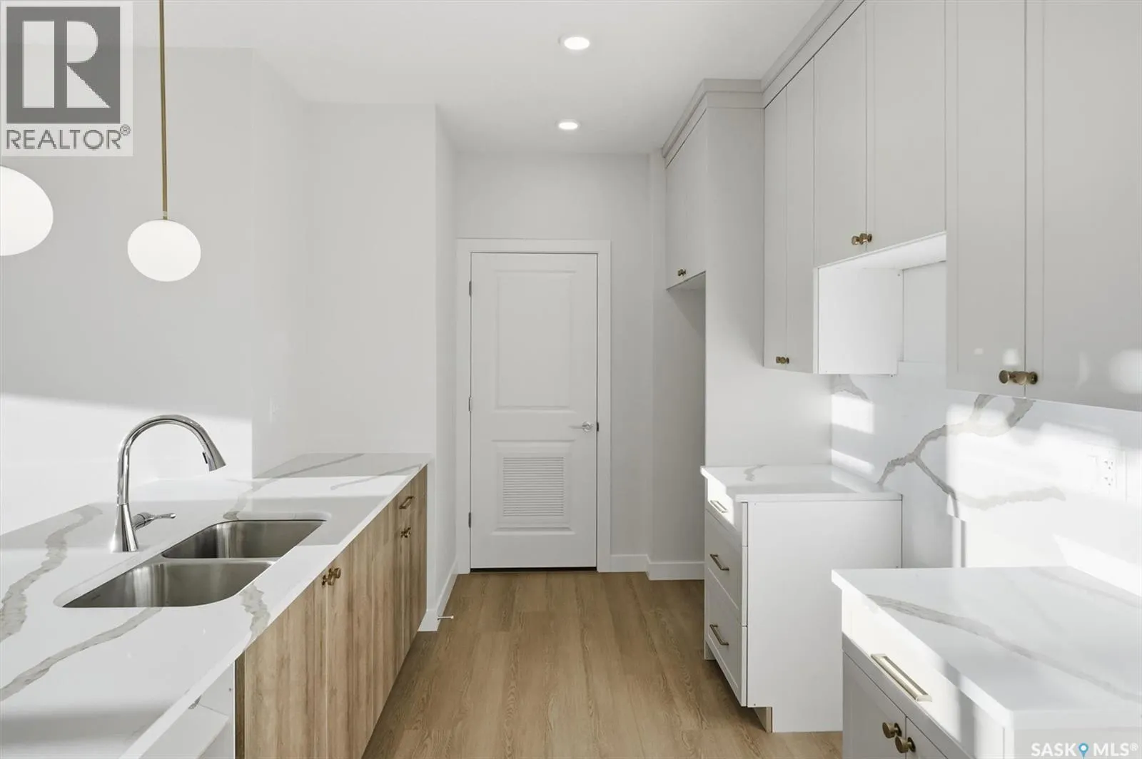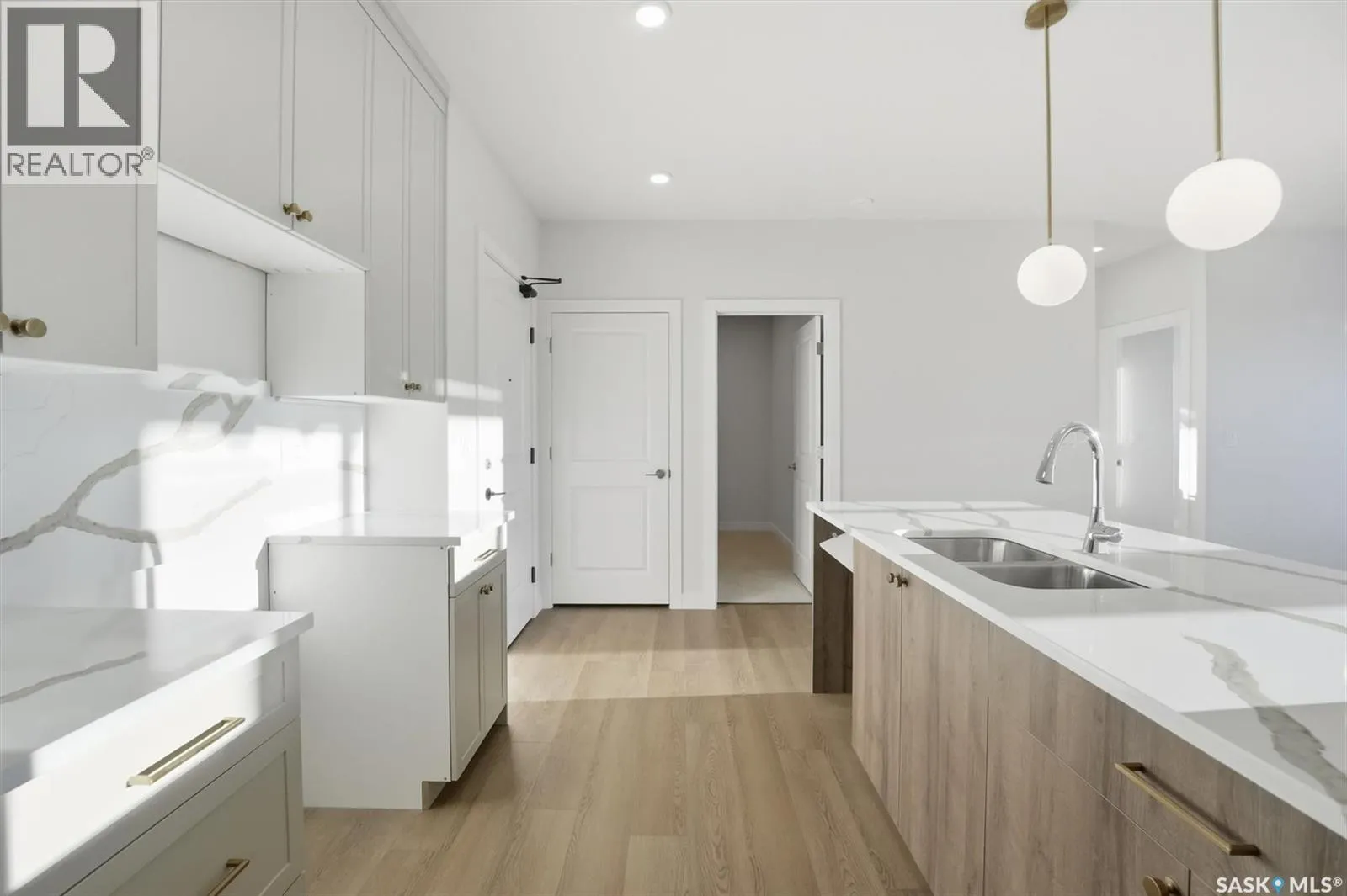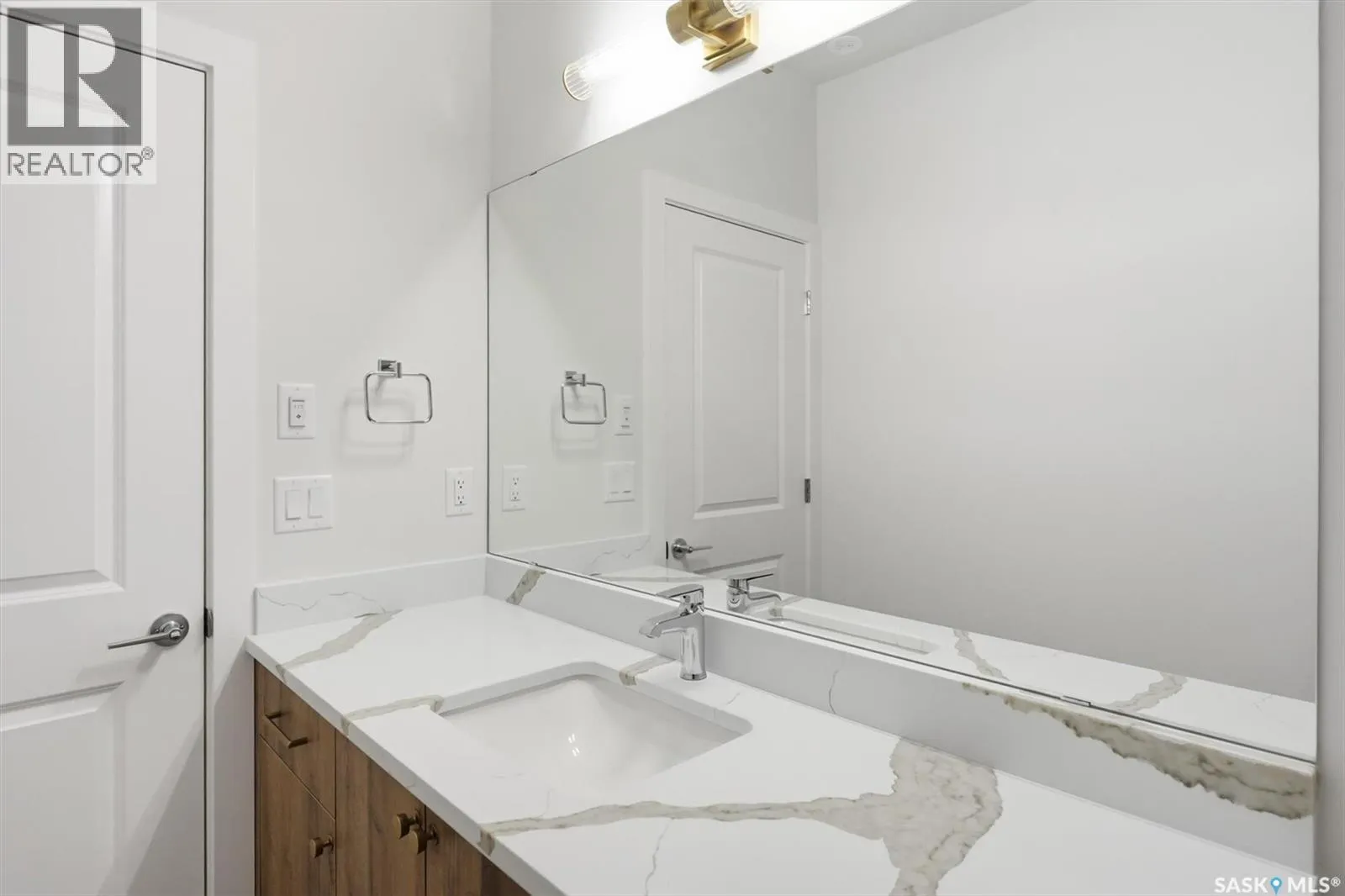 Welcome to âRYSE by North Ridge' located in Saskatoonâs growing community of Brighton! RYSE is a modernized apartment style condominium complex offering 1 bedroom, 2 bedroom, and 2 bedroom + den options. You will immediately notice the welcoming nature of RYSE the moment you step into the warm and inviting front entrance. Unit 1303 (Skyline layout) is a south east facing 964 sq ft condo with 2 bedrooms, 2 bathrooms, a den, separate laundry room, galley style kitchen, and dining/living areas. The interior features high end designer finishes, fixtures, countertops, and flooring, all with quality built craftsmanship. A private partially covered balcony awaits complete with duradeck, glass railing, natural gas bbq outlet, and electrical outlet. Each condo unit comes with a parking stall located in the heated parkade as well as a convenient storage room. Exterior parking stalls may be available to purchase. Each unit also includes a kitchen and laundry appliance package and air conditioning. RYSE has an amenity room for you to visit and relax featuring a bar area, comfortable seating, pool table, bathroom, and an outdoor patio lounge. GST and PST included in purchase price with any rebates to builder. Sask Home Warranty Premium Coverage Plan. This prime location is within a few minute walk to grocery/shopping/restaurants/bus and several other amenities. Show home hours are Mon thru Thurs 5-8PM and Weekends 12-5PM. Call to view! (id:27476)