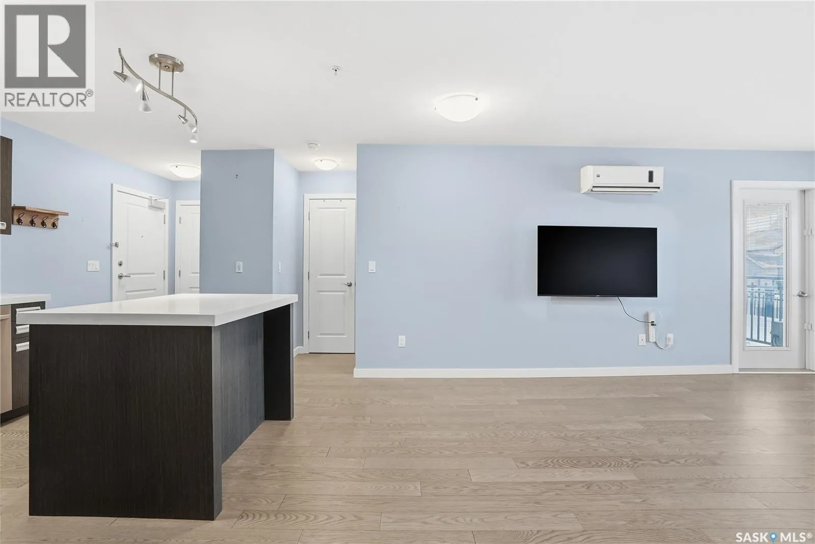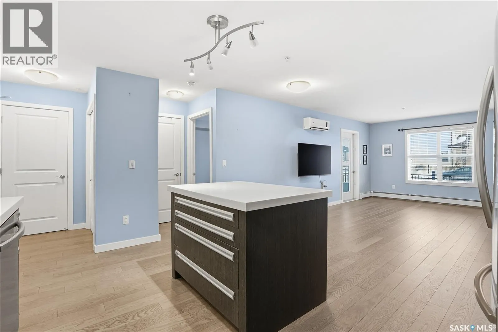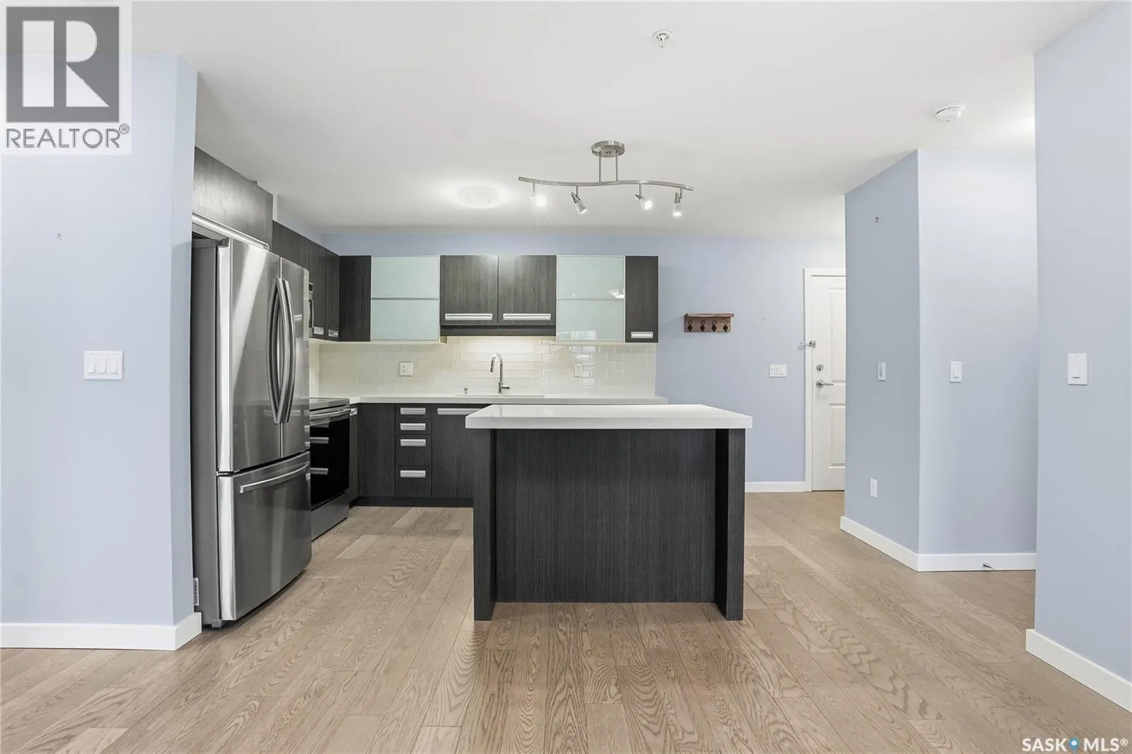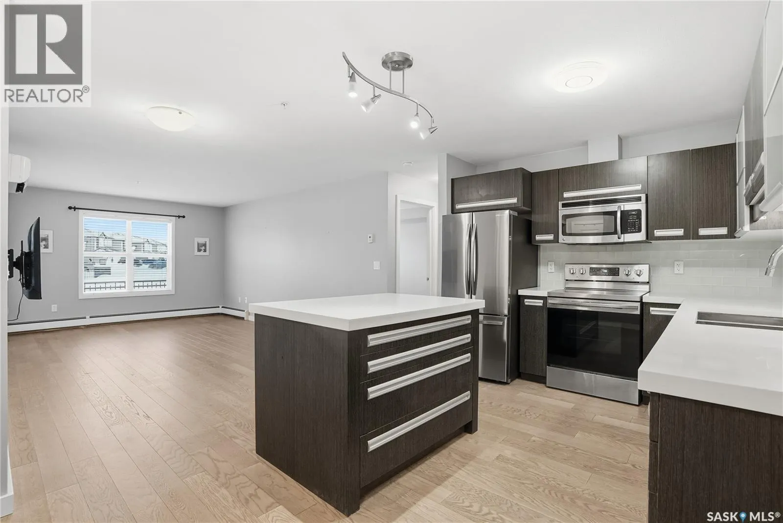 Welcome to this bright, east-facing 915 sq ft condo located in the highly sought-after Rosewood neighbourhood of Saskatoon. Perfectly positioned within walking distance to medical offices, Tim Hortons, and an excellent selection of shops and restaurants. The open-concept living area showcases brand new hardwood flooring and a kitchen featuring quartz countertops, a large island with pot drawers, stainless steel appliances, and glass tile backsplash. The thoughtful floor plan includes a spacious primary bedroom with a walk-in closet, a second bedroom with its own walk-in closet, and a convenient in-suite laundry/storage room with stacked washer and dryer. Additional features include air conditioning, a private balcony off the living room, and TWO electrified parking stalls. Stylish, modern, meticulously maintained and available for a quick possession! This move-in-ready condo is an outstanding opportunity in one of the cityâs most desirable communities! (id:27476)