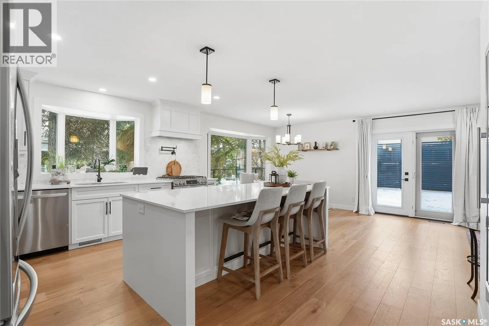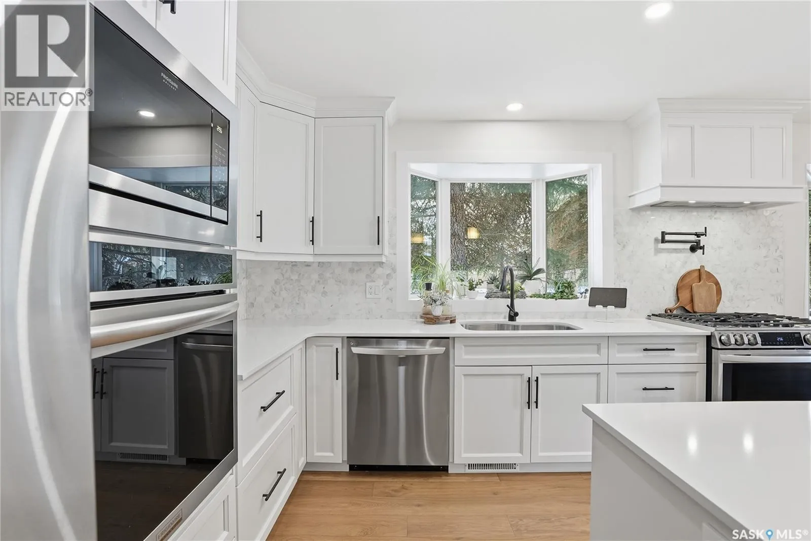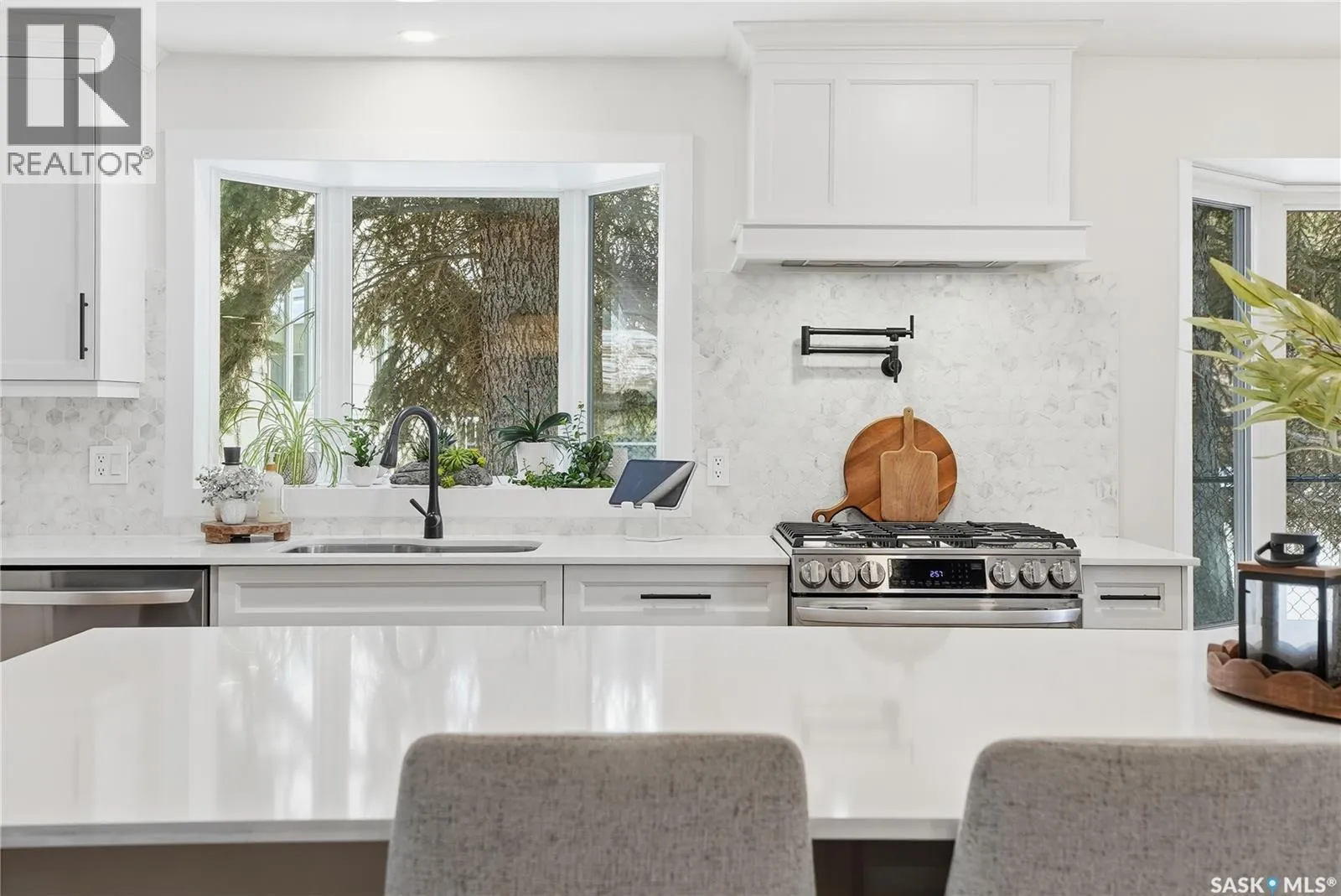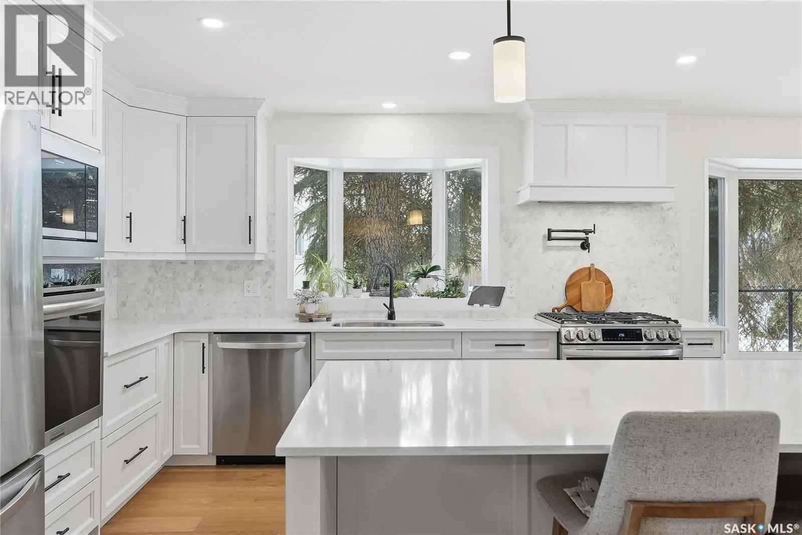 CHECK ON THE VIDEO ABOVE! Timeless style and exceptional craftsmanship define this stunning 2,691 sq. ft. bungalow in prestigious Lawson Heights, offering river views and overlooking Meewasin Trail. Welcome to 115 Whiteswan Drive, where a grand foyer with soaring ceilings creates an inviting first impression. Sun-filled living and dining areas showcase breathtaking views and feature a striking custom warm-toned wood feature wall with a sleek linear gas fireplace, ideal for both everyday living and entertaining. Beautiful new warm-coloured hardwood flooring flows throughout the main floor, enhancing the homeâs elegant, cohesive design. A private main-floor office with glass doors is perfect for working from home. The executive kitchen impresses with white cabinetry, an expansive island, quartz countertops, and a fully equipped butlerâs pantry with all new stainless steel appliances, including double refrigerators, double ovens, gas stove, beverage fridges, tall wine cooler, and warming ovenâdesigned for hosting and convenience. The breakfast nook features a south-facing window seat, while the adjoining family room opens to outdoor living. The spacious primary bedroom (19â x 13â) offers a large walk-in closet and a spa-like 5-piece ensuite. Two additional well-proportioned bedrooms share a 5-piece bath, along with rare main-floor storage and extra cabinetry. The newly fully developed lower level provides a wet bar, extra bedroom, bright 3-piece bathroom, gym/exercise space, and generous storage. Mechanical upgrades include a high-efficiency furnace and on-demand water heater. Enjoy breathtaking sunrise views from the front of the home, then unwind in a sun-filled, private backyard retreat featuring a privacy wall, stamped concrete patio, stunning brick fireplace, tranquil water fountain, lush landscaping, brand new fencing, and a shedâa truly secluded oasis. (id:27476)