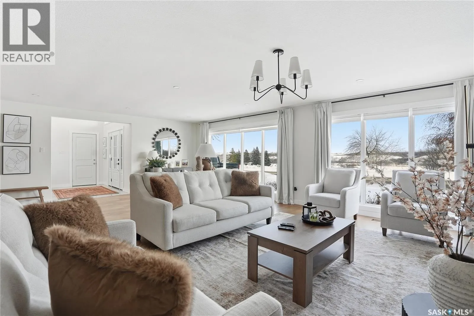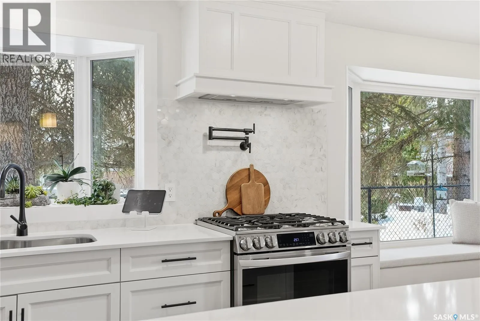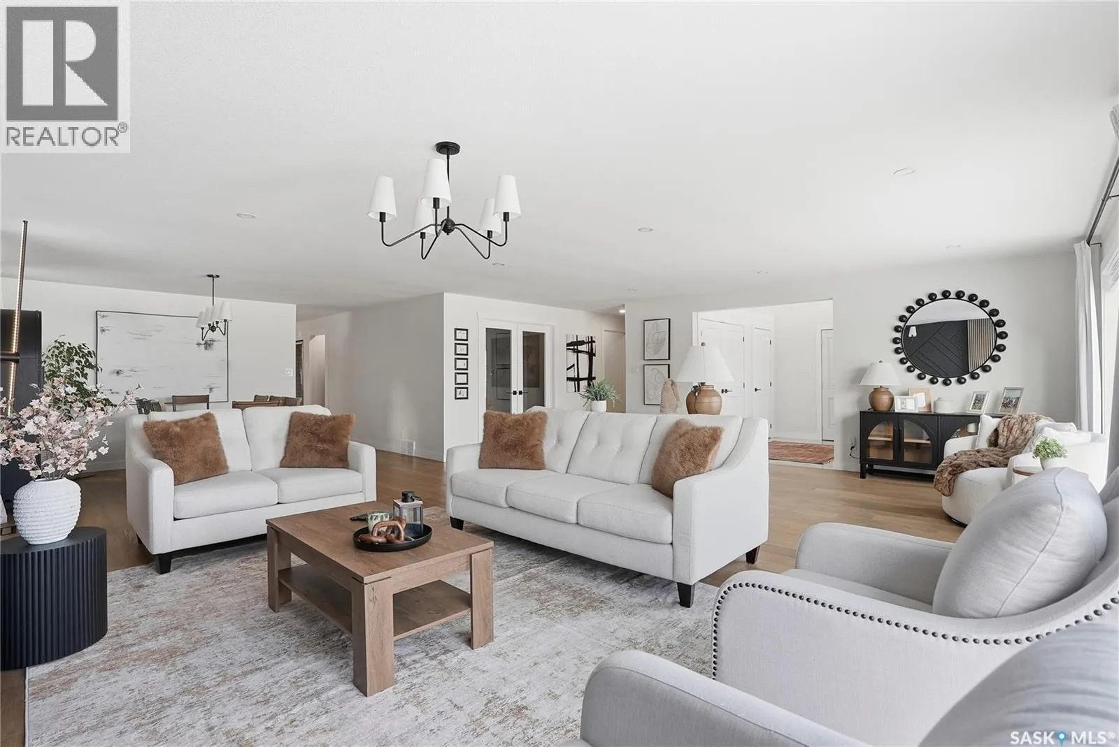 CHECK ON THE VIDEO ABOVE! Timeless style and exceptional craftsmanship define this stunning 2,691 sq. ft. bungalow in prestigious Lawson Heights, offering river views and overlooking Meewasin Trail. Welcome to 115 Whiteswan Drive, where a grand foyer with soaring ceilings creates an inviting first impression. Sun-filled living and dining areas showcase breathtaking views and feature a striking custom warm-toned wood feature wall with a sleek linear gas fireplace, ideal for both everyday living and entertaining. Beautiful new warm-coloured hardwood flooring flows throughout the main floor, enhancing the homeâs elegant, cohesive design. A private main-floor office with glass doors is perfect for working from home. The executive kitchen impresses with white cabinetry, an expansive island, quartz countertops, and a fully equipped butlerâs pantry with all new stainless steel appliances, including double refrigerators, double ovens, gas stove, beverage fridges, tall wine cooler, and warming ovenâdesigned for hosting and convenience. The breakfast nook features a south-facing window seat, while the adjoining family room opens to outdoor living. The spacious primary bedroom (19â x 13â) offers a large walk-in closet and a spa-like 5-piece ensuite. Two additional well-proportioned bedrooms share a 5-piece bath, along with rare main-floor storage and extra cabinetry. The newly fully developed lower level provides a wet bar, extra bedroom, bright 3-piece bathroom, gym/exercise space, and generous storage. Mechanical upgrades include a high-efficiency furnace and on-demand water heater. Enjoy breathtaking sunrise views from the front of the home, then unwind in a sun-filled, private backyard retreat featuring a privacy wall, stamped concrete patio, stunning brick fireplace, tranquil water fountain, lush landscaping, brand new fencing, and a shedâa truly secluded oasis. (id:27476)
