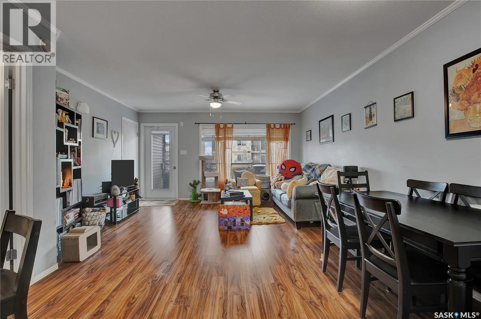 This upper-level two-storey townhouse offers 1,252 sq ft of well-designed living space with a bright, open layout. The maple kitchen features plenty of cabinets and drawers, durable linoleum flooring, and a practical peninsula that provides added storage, counter space, and a casual dining option. The living and dining areas flow seamlessly together, finished with modern laminate flooring that enhances the sense of space. A garden door off the living room opens to a rear deck complete with a storage room and enough space for patio furniture and a BBQ. The main level is finished with a convenient two-piece bathroom. Upstairs, youâll find three generously sized bedrooms, each equipped with custom closet organizers. A four-piece bathroom is thoughtfully positioned near the laundry area. The spacious front verandah offers another enjoyable outdoor area. This unit includes a single detached garage, an additional electrified surface parking stall, and ample visitor parking. Ideally situated near high schools, the Shaw Centre, shopping, and parks. (id:27476)