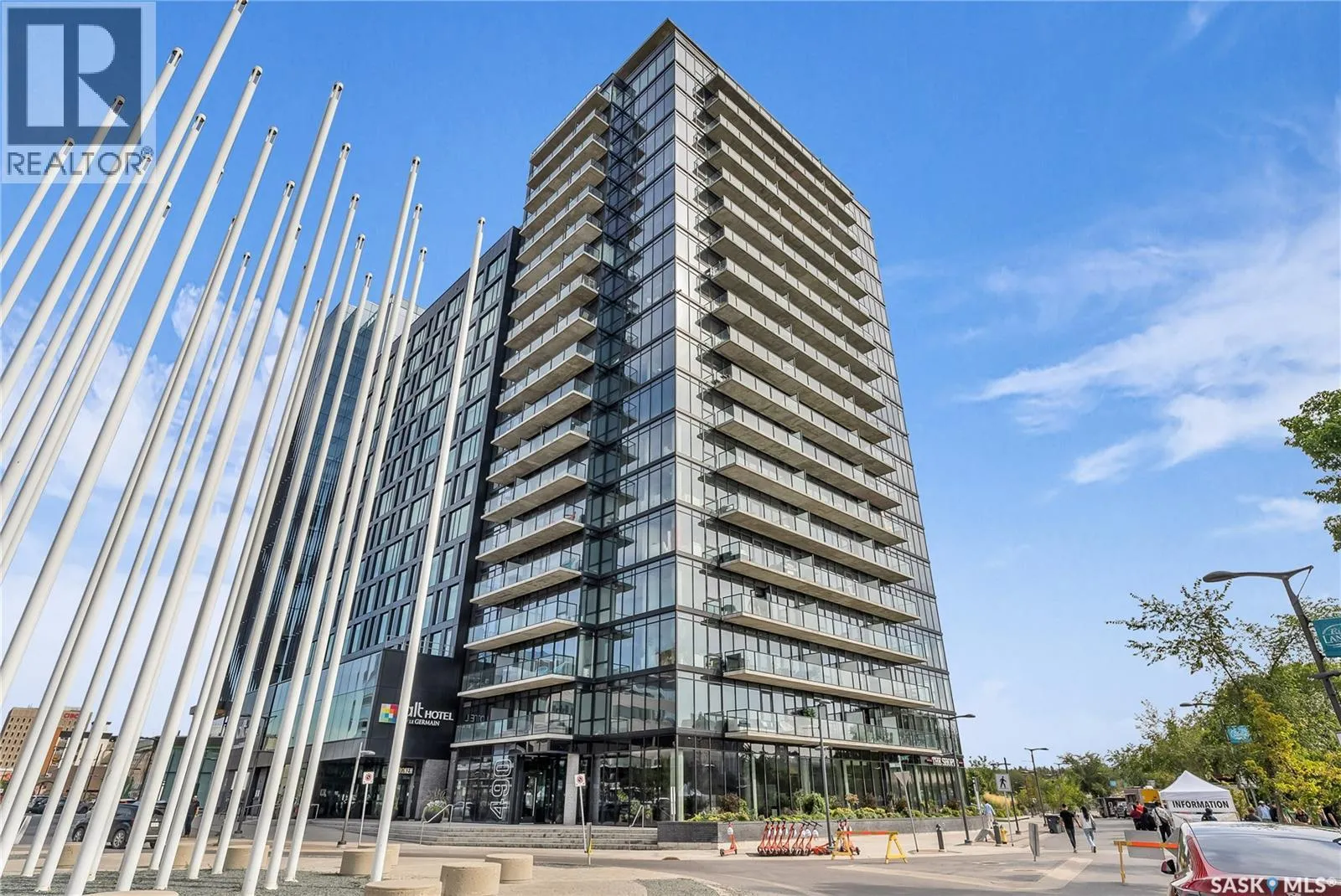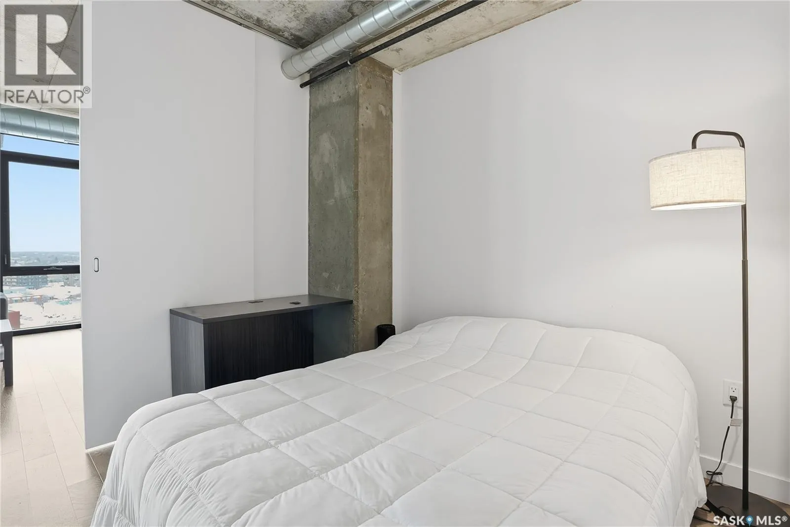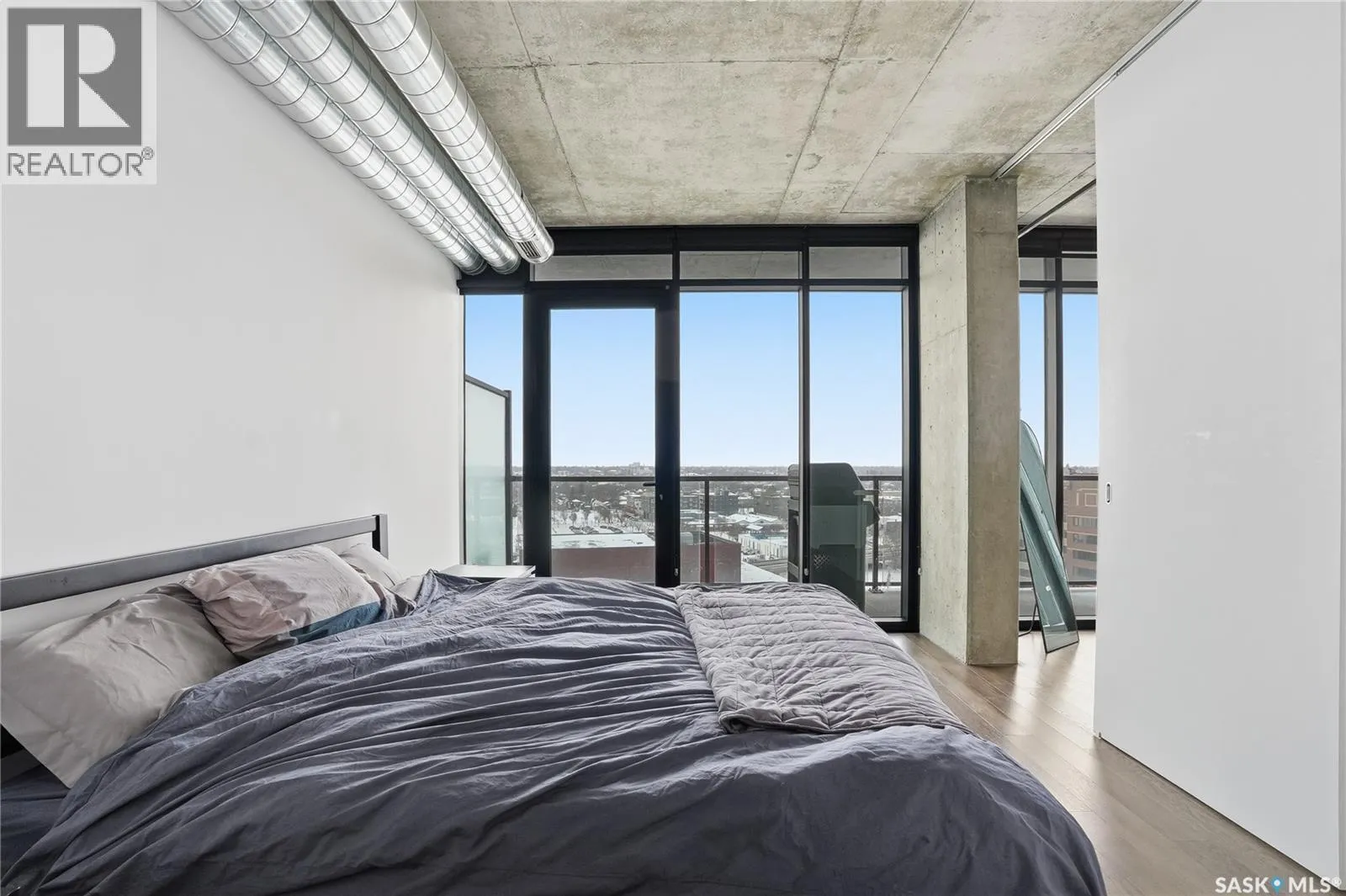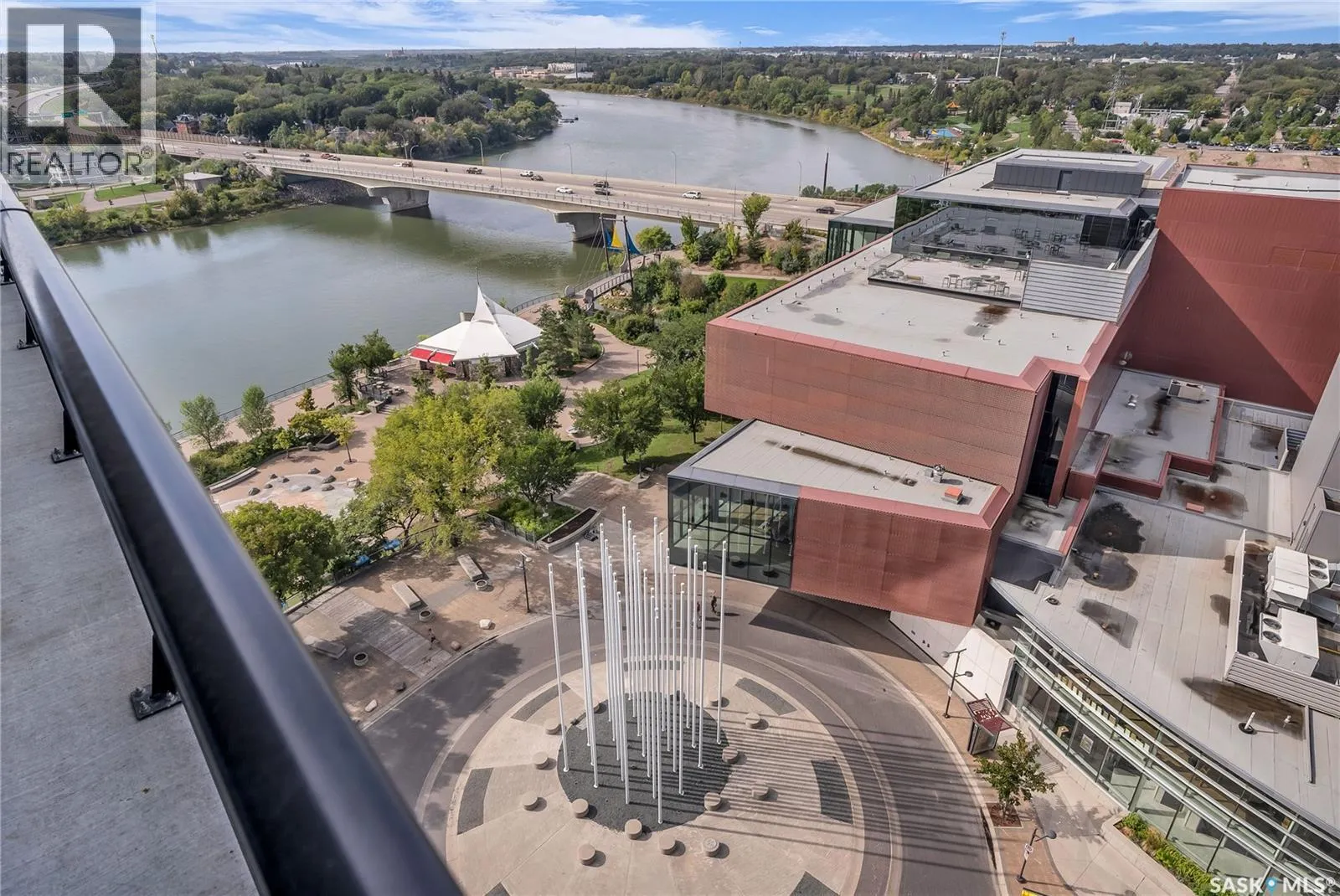 Stunning 13th floor unit at No. 1 River Landing, featuring an expansive view of Saskatoon's downtown, River Landing Park and the South Saskatchewan River. Great layout with 9 ft concrete ceilings, kitchen with quartz counters and stainless steel appliances, 2 bedrooms + den and two bathrooms. Primary bedroom has direct access to the balcony and features a walk-thru closet open to your ensuite with a tiled shower. Second bedroom has a large closet and sliding door entry. Laundry (new washer & dryer!) and additional bathroom are tucked away from the main living space. The floor to ceiling windows run along the whole west side of the unit in the primary Bedroom and spacious living room. This home has central air conditioning, underground parking, storage space, gym and amenities room with pool table and kitchenette. Located just steps away from the river, Remai Modern, many local restaurants, the movie theatre and Midtown Mall. Easily access all downtown amenities and Circle Drive ensuring you're well-connected. (id:27476)